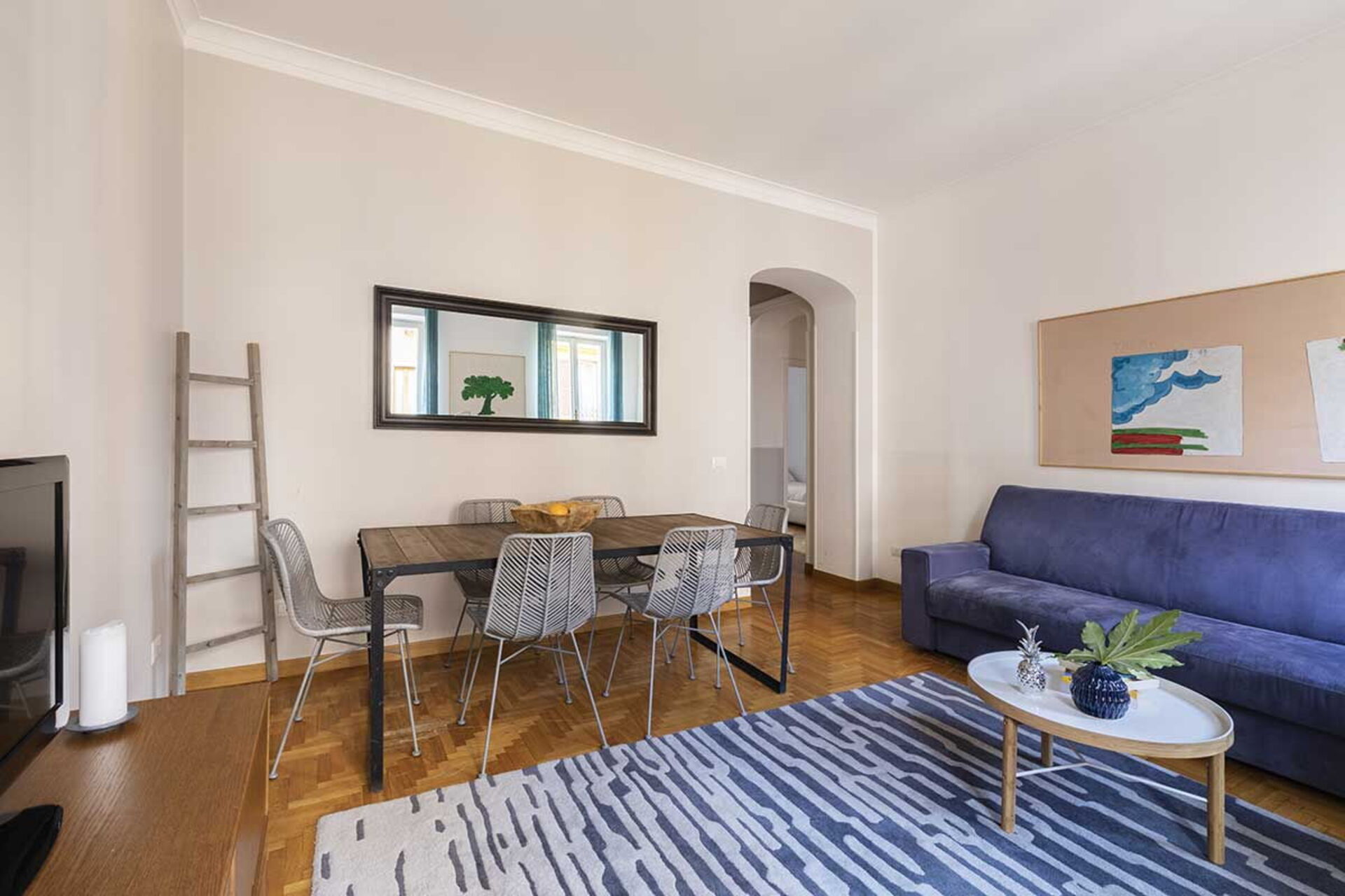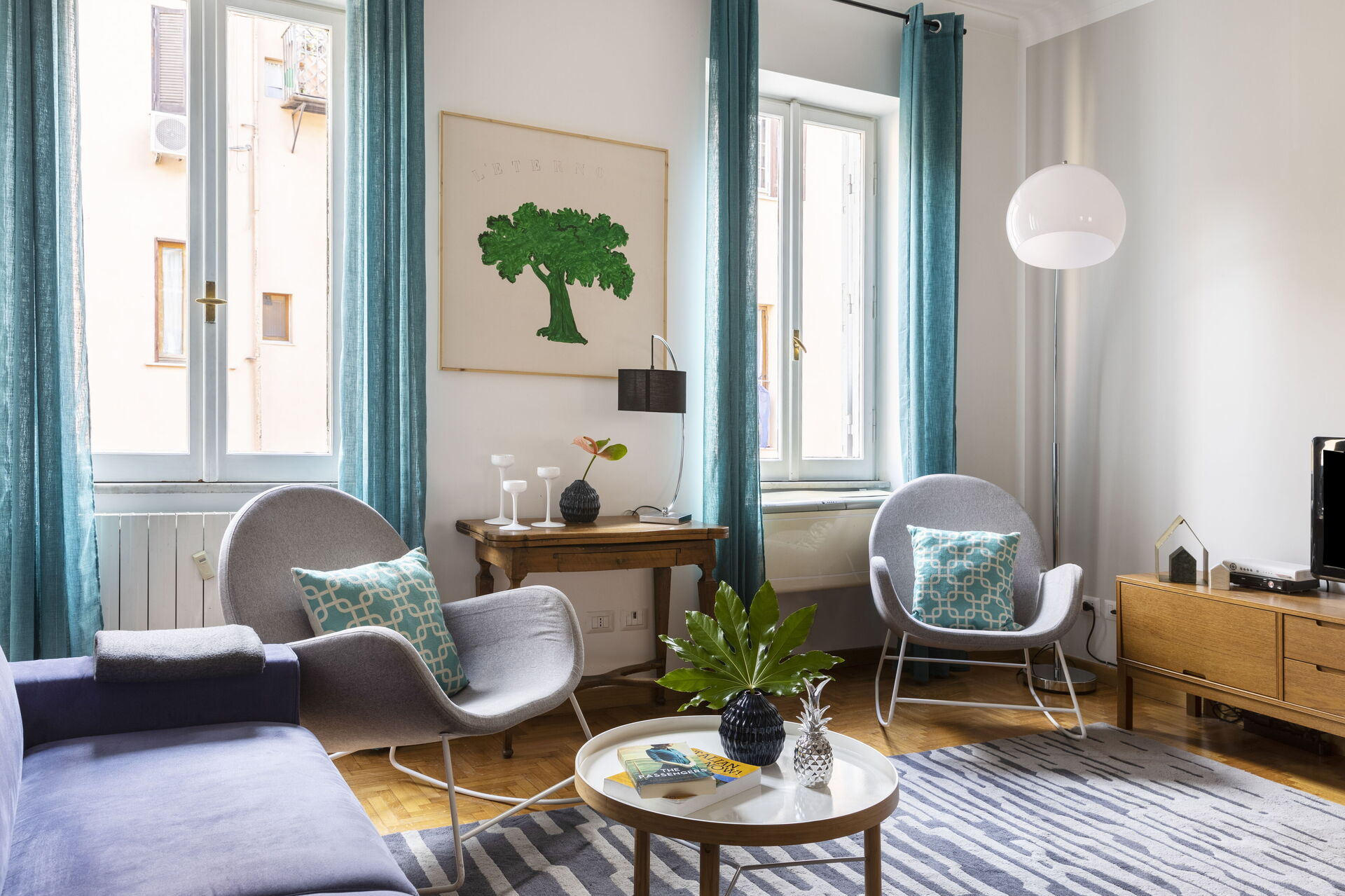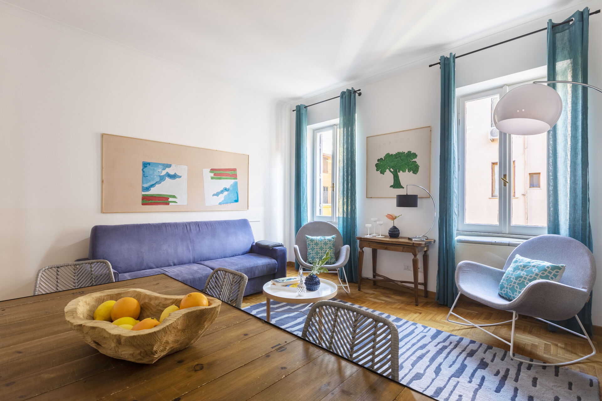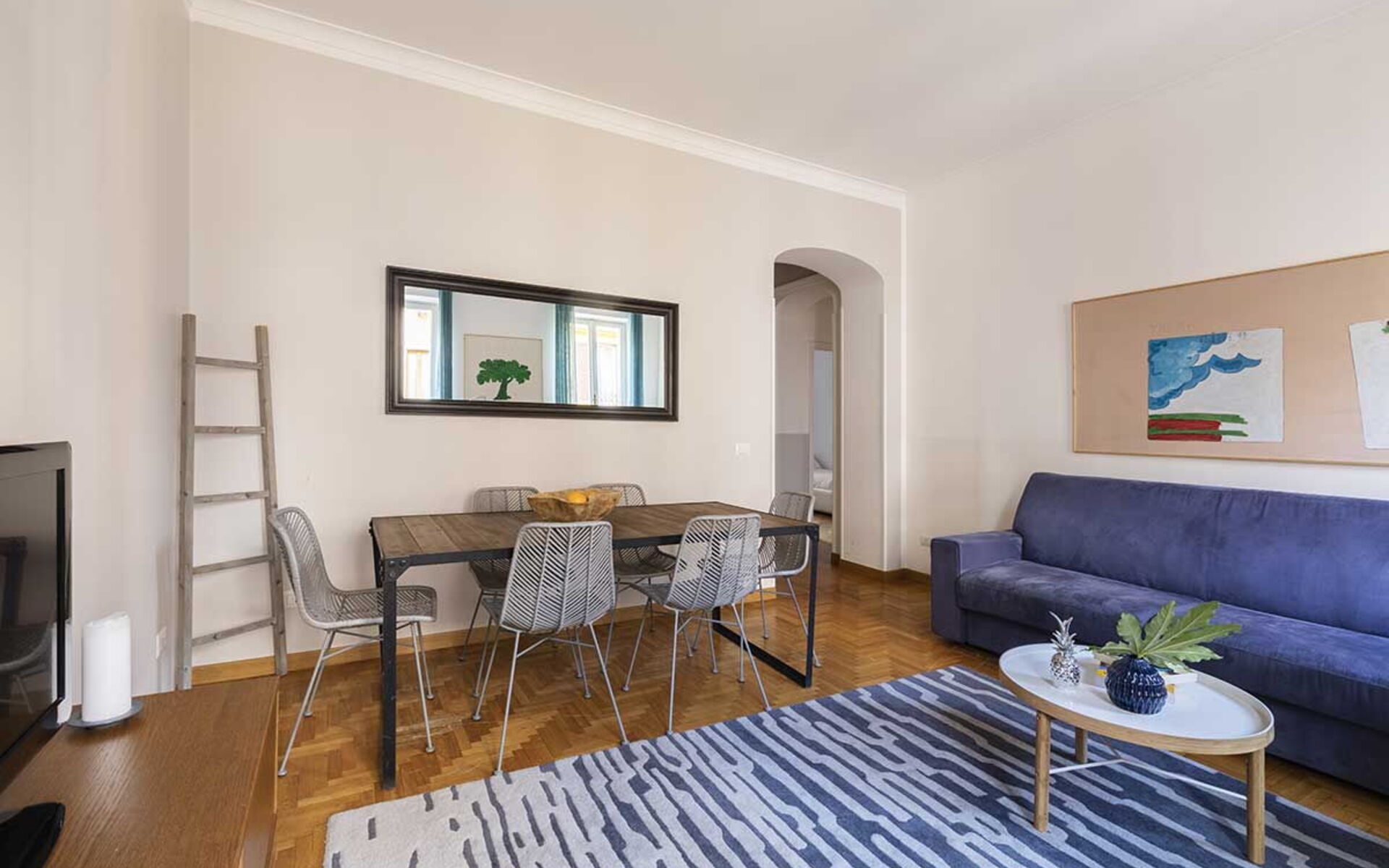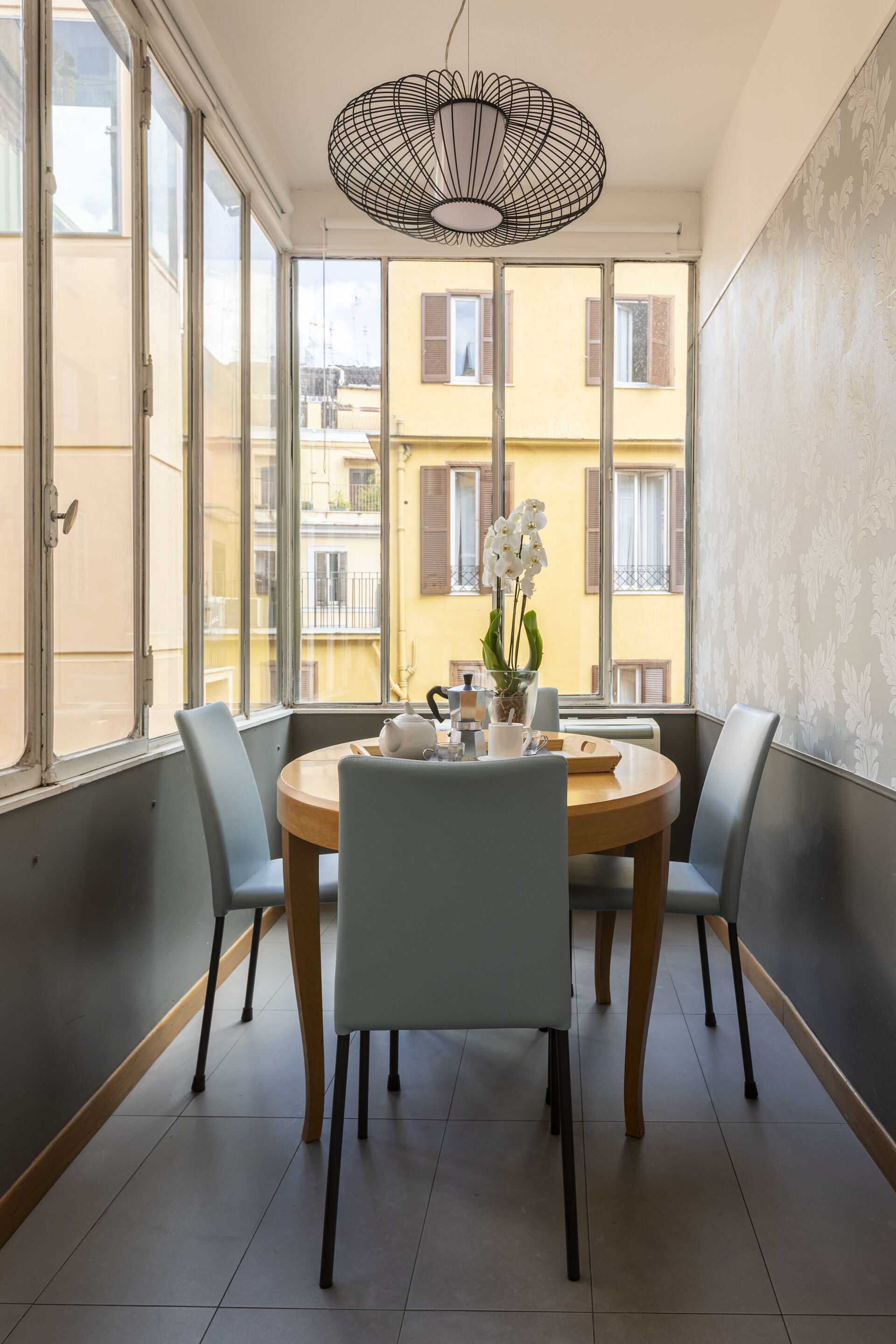 bietet diese Wohnung die Möglichkeit, das authentische italienische Dolcevita zu erleben, mit dem Vorteil, dass mehrere Restaurants, Konditoreien und Promenaden zu Fuß erreichbar sind. Die Gegend gilt als das zentrale Einkaufsviertel Roms, in dem sich Designerboutiquen und exklusive Geschäfte befinden. Das Design des Hauses, das auf der Erforschung des historischen Kontextes basiert, führt zu einem zeitgenössischen Stil mit weißen Wänden und hohen, hellen Fenstern, die zur ruhigen Seite des Gebäudes zeigen. Elemente der klassischen italienischen Wohnarchitektur, wie die verglaste Veranda und der kleine Innenhof, werden mit zeitgenössischen, skandinavisch inspirierten Akzenten kombiniert, wie der gut ausgestatteten Küche, den Holzböden und Möbeln, die Vintage, Modernität und Eleganz miteinander verbinden. Ein schicker Rückzugsort voller gemütlicher Atmosphäre, der traditionelle und moderne Architektur miteinander verbindet. Das Innere des Anwesens misst 110 Quadratmeter und bietet Platz für 2 weitere Personen auf einem Schlafsofa im Wohnzimmer.
