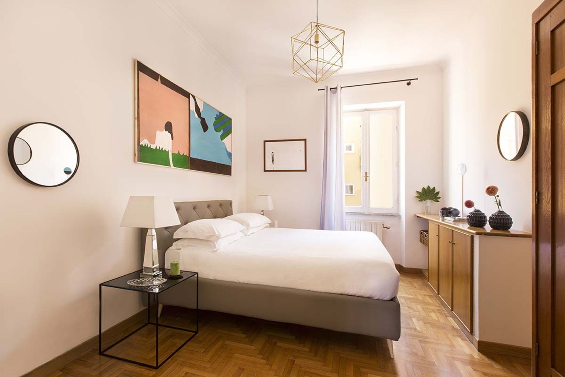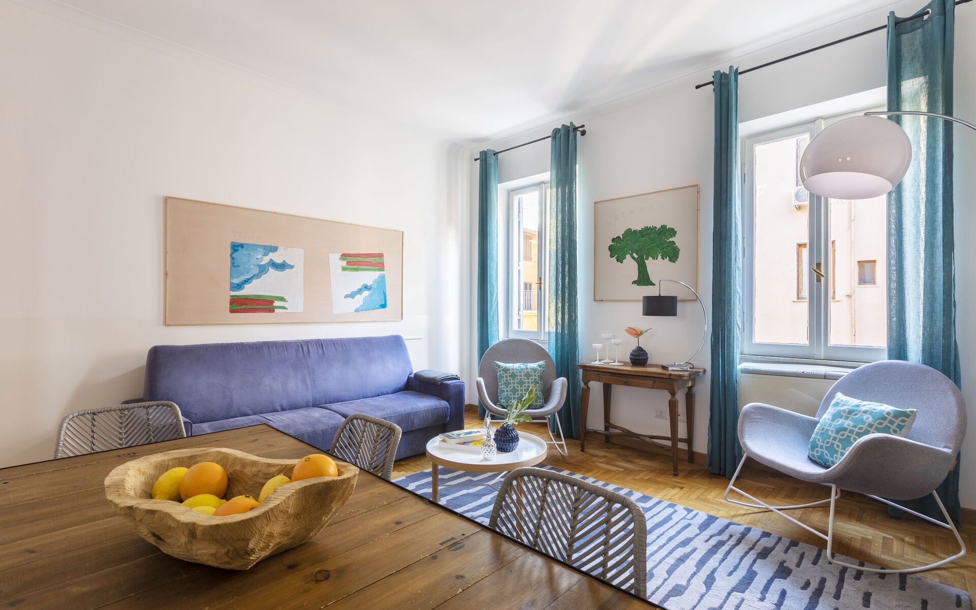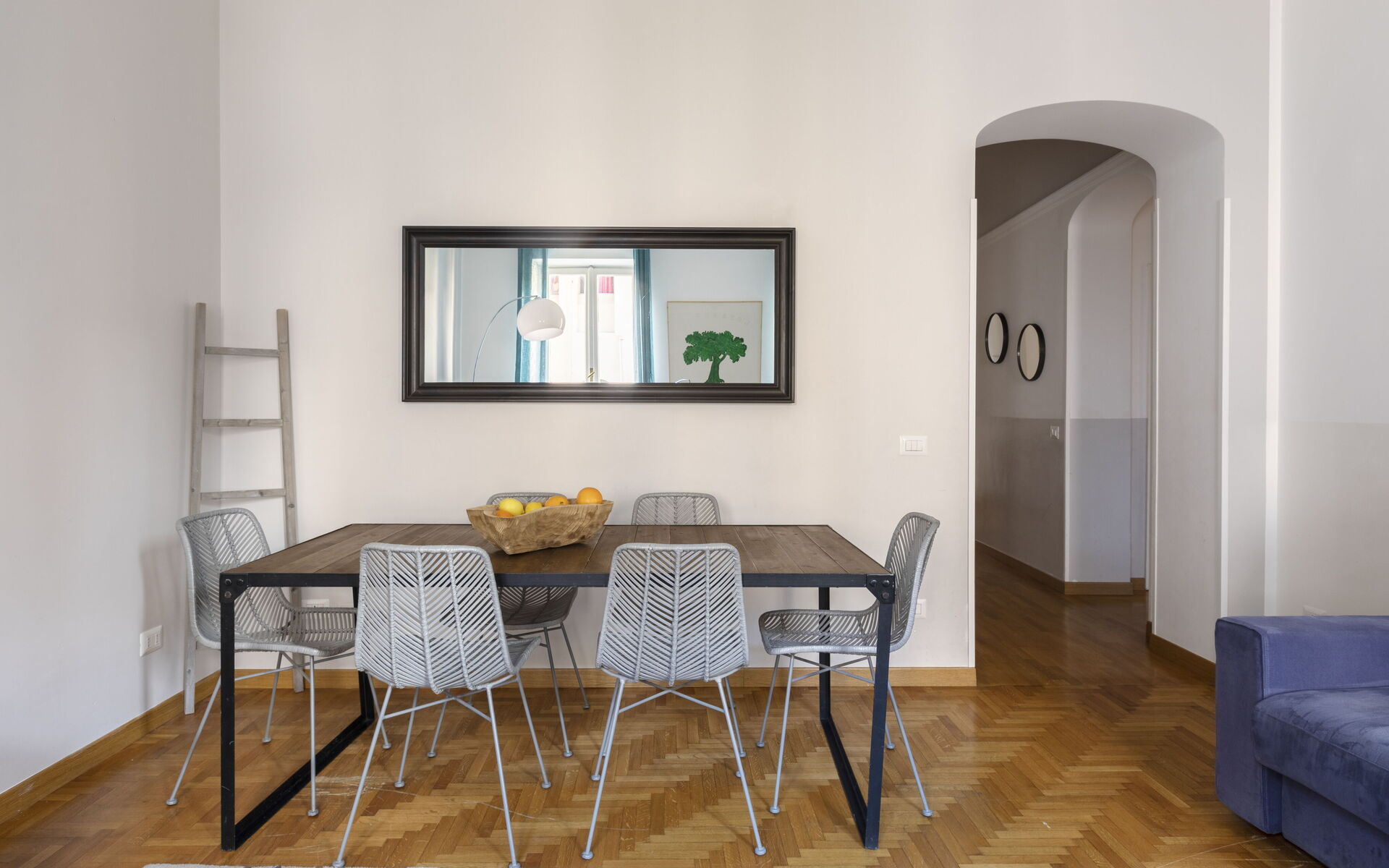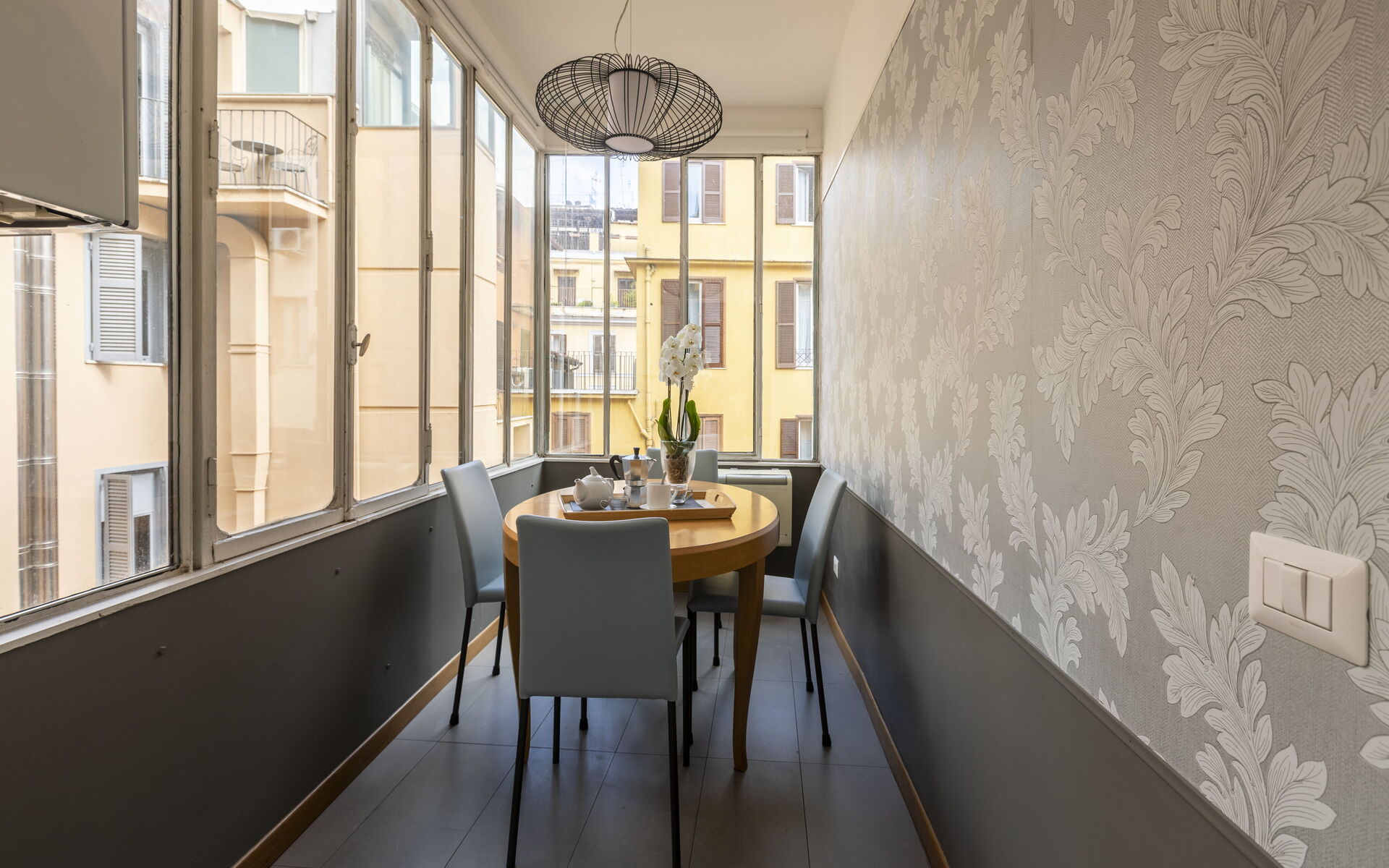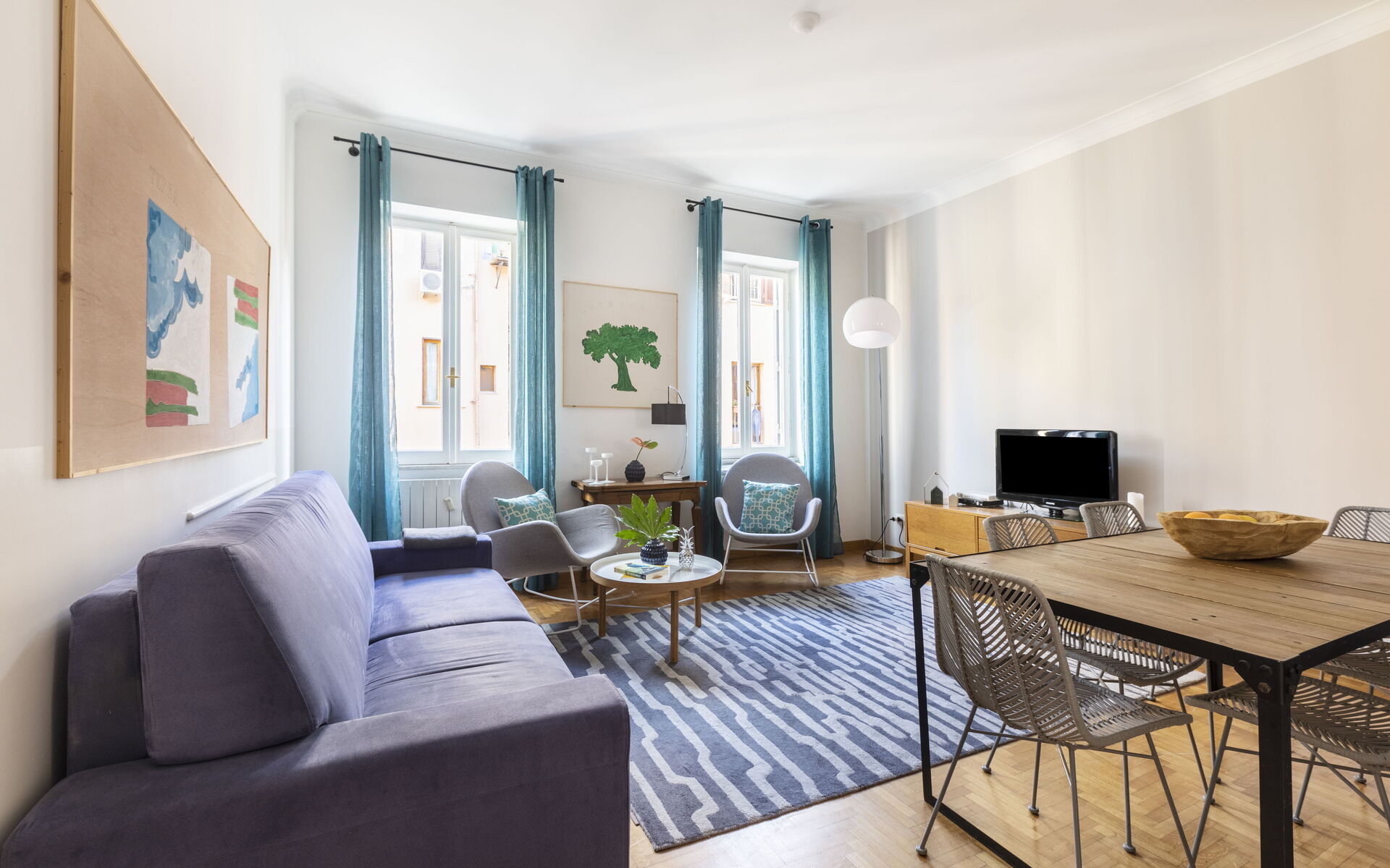 bietet diese Wohnung die Möglichkeit, das authentische italienische Dolcevita zu erleben, mit dem Vorteil, dass mehrere Restaurants, Konditoreien und Promenaden zu Fuß erreichbar sind. Die Gegend gilt als das zentrale Einkaufsviertel Roms, in dem sich Designerboutiquen und exklusive Geschäfte befinden. Das Design des Hauses, das auf der Erforschung des historischen Kontextes basiert, führt zu einem zeitgenössischen Stil mit weißen Wänden und hohen, hellen Fenstern, die zur ruhigen Seite des Gebäudes zeigen. Elemente der klassischen italienischen Wohnarchitektur, wie die verglaste Veranda und der kleine Innenhof, werden mit zeitgenössischen, skandinavisch inspirierten Akzenten kombiniert, wie der gut ausgestatteten Küche, den Holzböden und Möbeln, die Vintage, Modernität und Eleganz miteinander verbinden. Ein schicker Rückzugsort voller gemütlicher Atmosphäre, der traditionelle und moderne Architektur miteinander verbindet. Das Innere des Anwesens misst 110 Quadratmeter und bietet Platz für 2 weitere Personen auf einem Schlafsofa im Wohnzimmer.