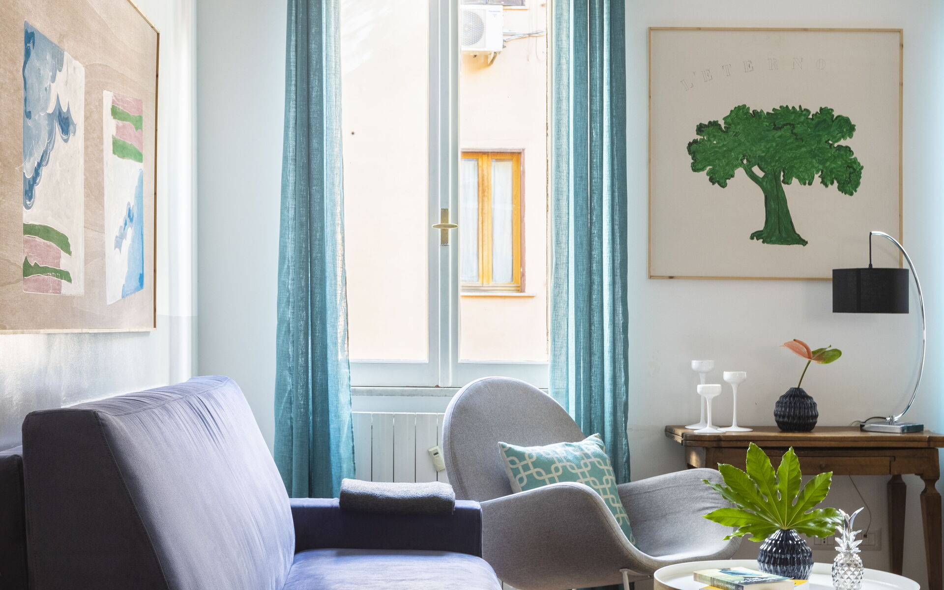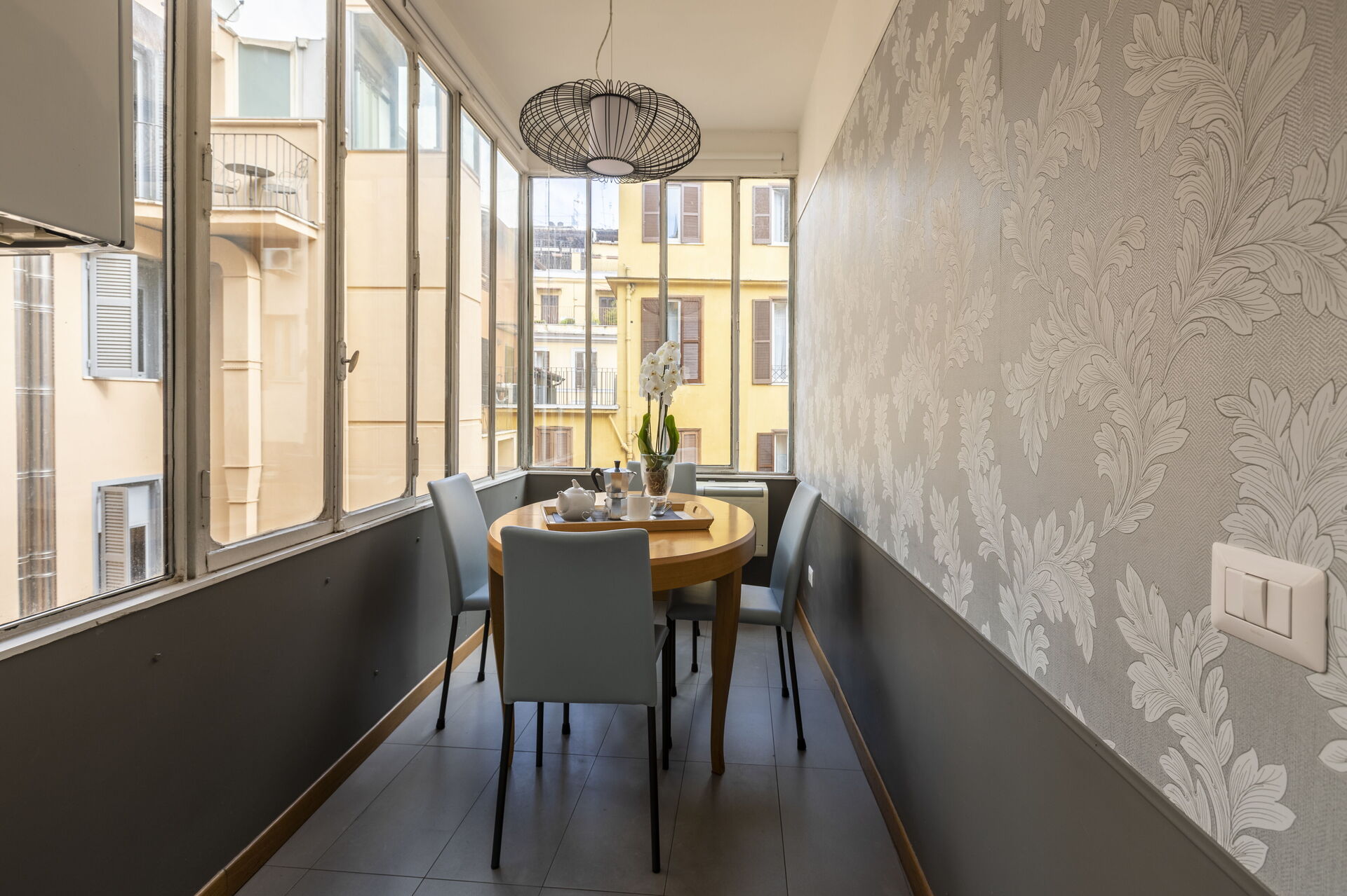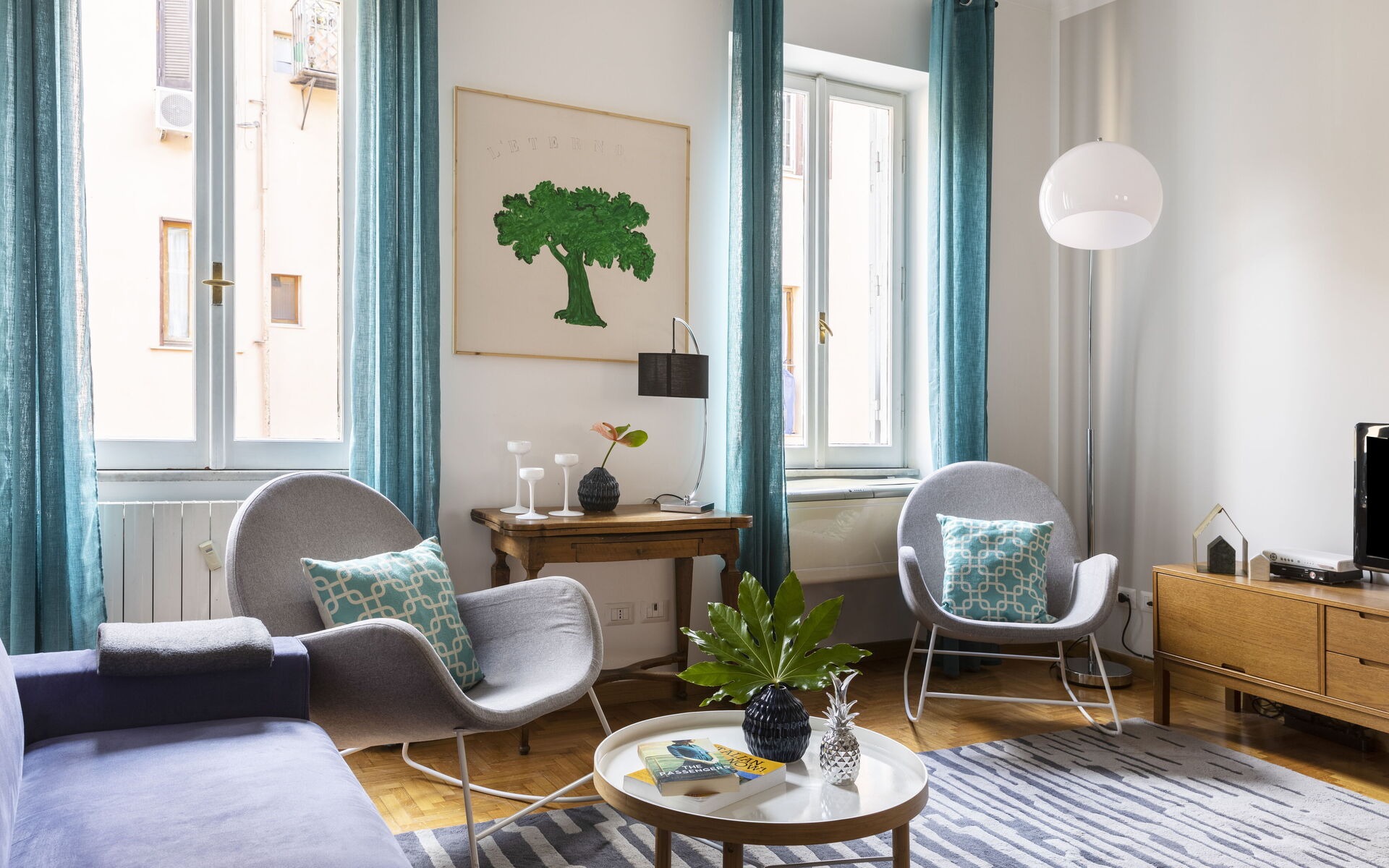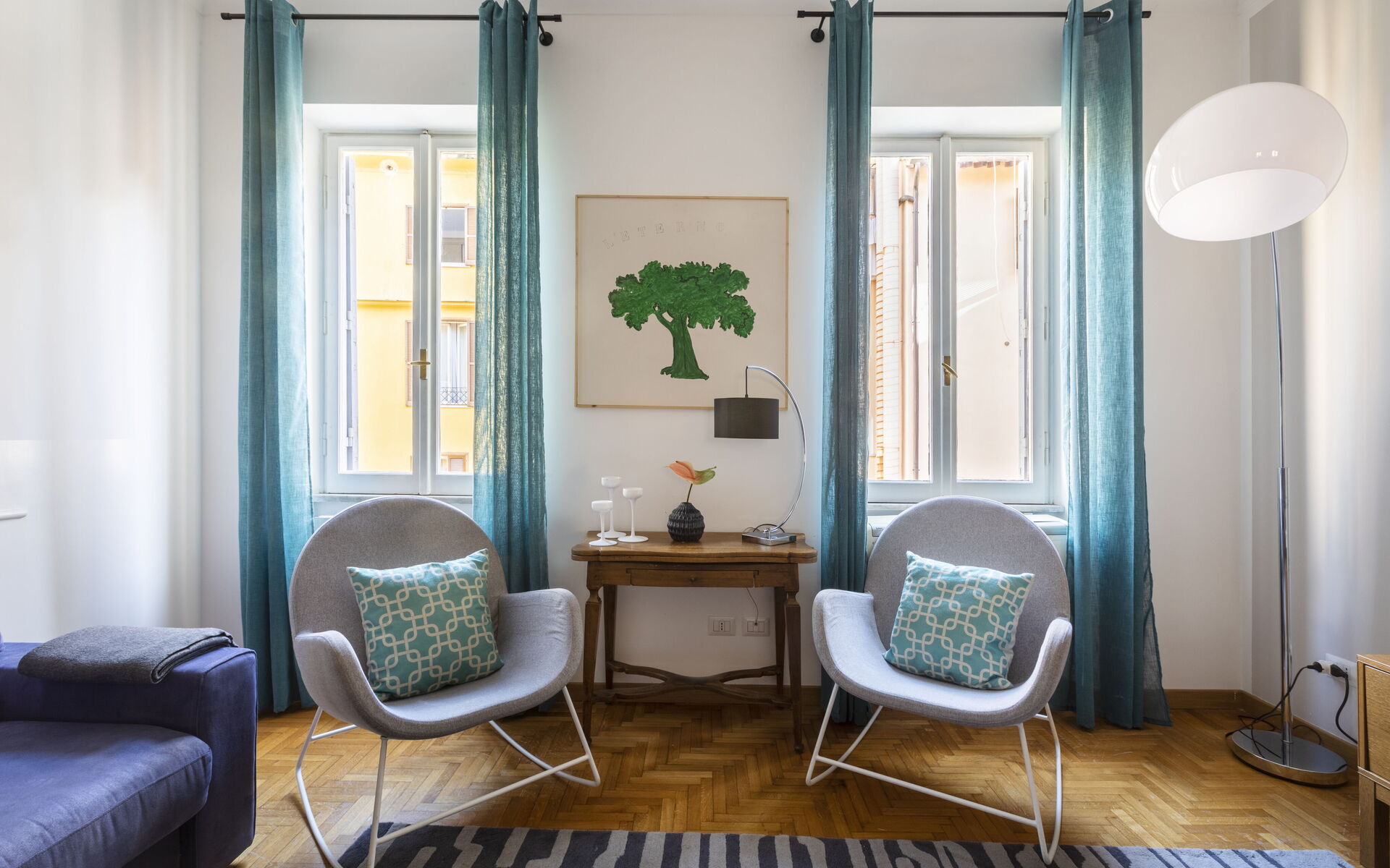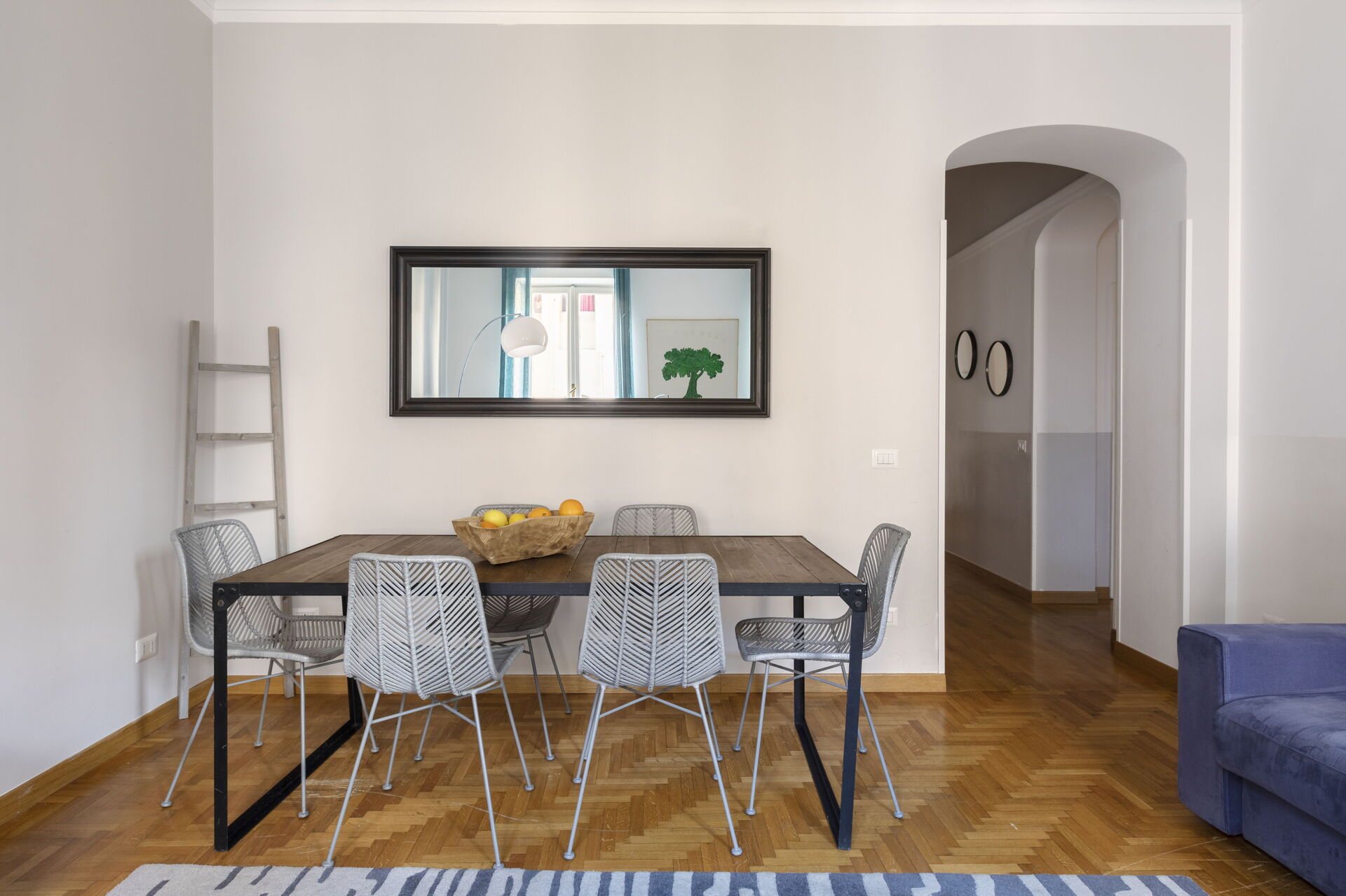 bietet diese Wohnung die Möglichkeit, das authentische italienische Dolcevita zu erleben, mit dem Vorteil, dass mehrere Restaurants, Konditoreien und Promenaden zu Fuß erreichbar sind. Die Gegend gilt als das zentrale Einkaufsviertel Roms, in dem sich Designerboutiquen und exklusive Geschäfte befinden. Das Design des Hauses, das auf der Erforschung des historischen Kontextes basiert, führt zu einem zeitgenössischen Stil mit weißen Wänden und hohen, hellen Fenstern, die zur ruhigen Seite des Gebäudes zeigen. Elemente der klassischen italienischen Wohnarchitektur, wie die verglaste Veranda und der kleine Innenhof, werden mit zeitgenössischen, skandinavisch inspirierten Akzenten kombiniert, wie der gut ausgestatteten Küche, den Holzböden und Möbeln, die Vintage, Modernität und Eleganz miteinander verbinden. Ein schicker Rückzugsort voller gemütlicher Atmosphäre, der traditionelle und moderne Architektur miteinander verbindet. Das Innere des Anwesens misst 110 Quadratmeter und bietet Platz für 2 weitere Personen auf einem Schlafsofa im Wohnzimmer.