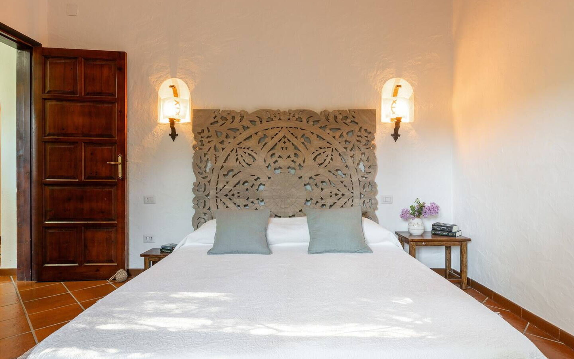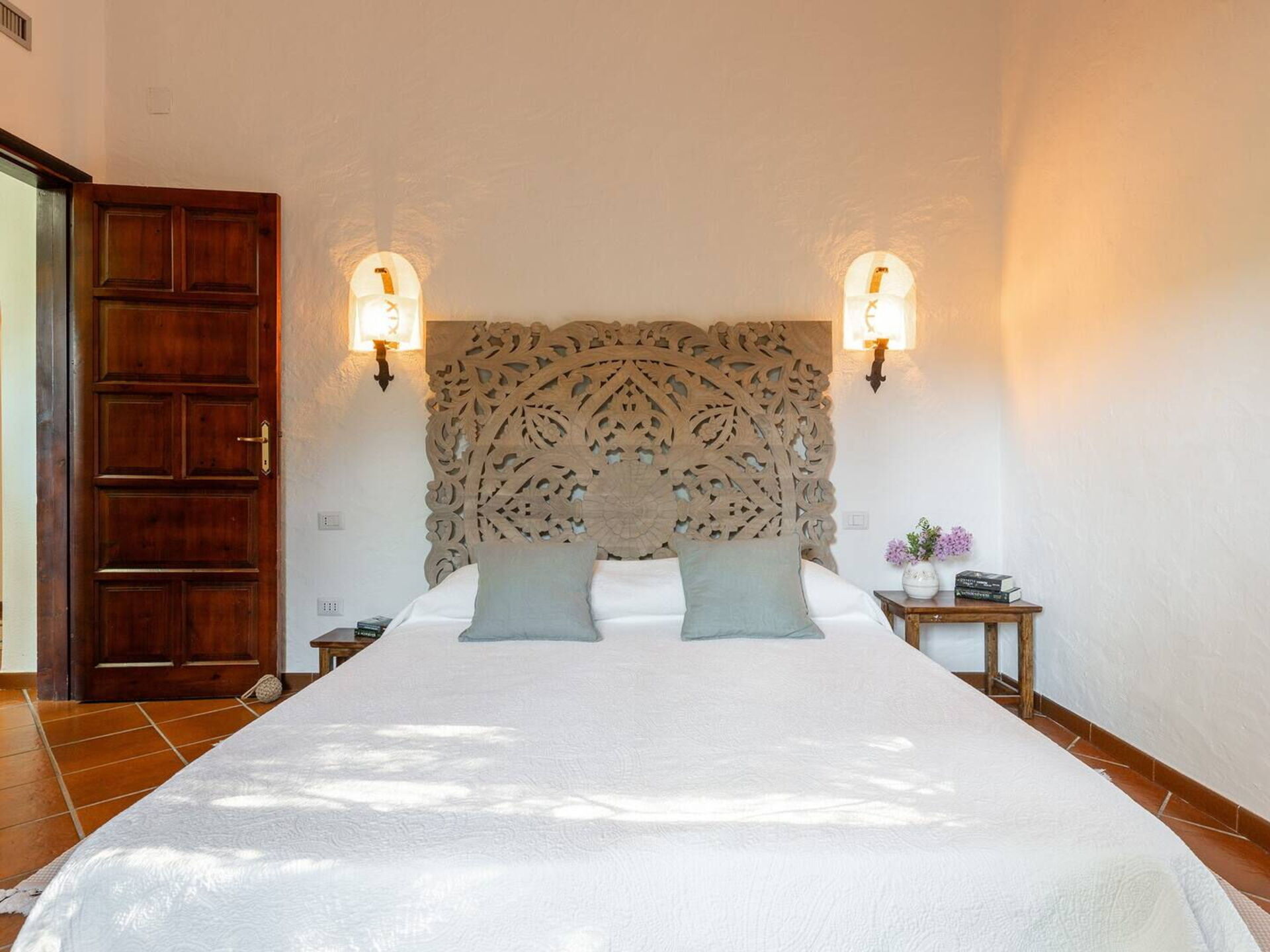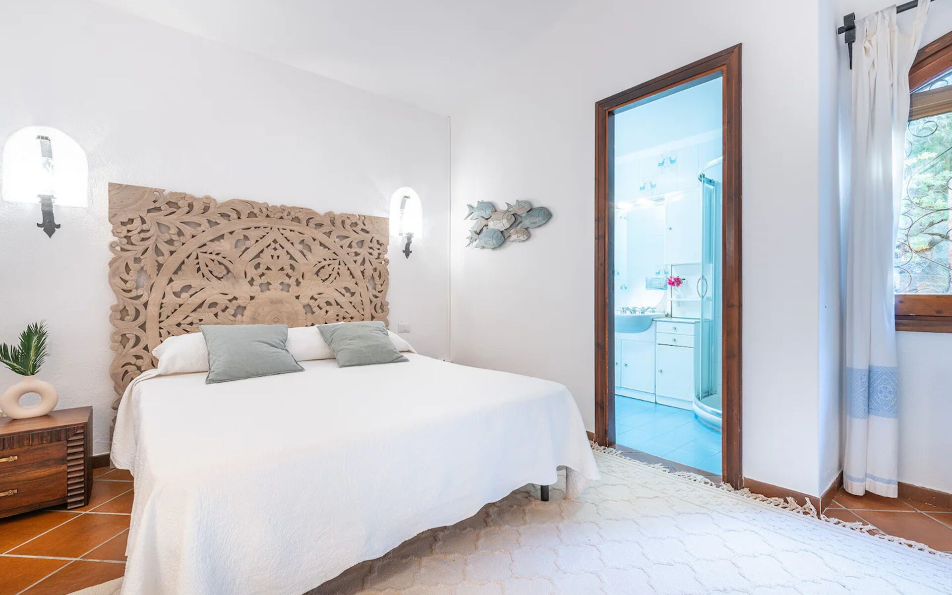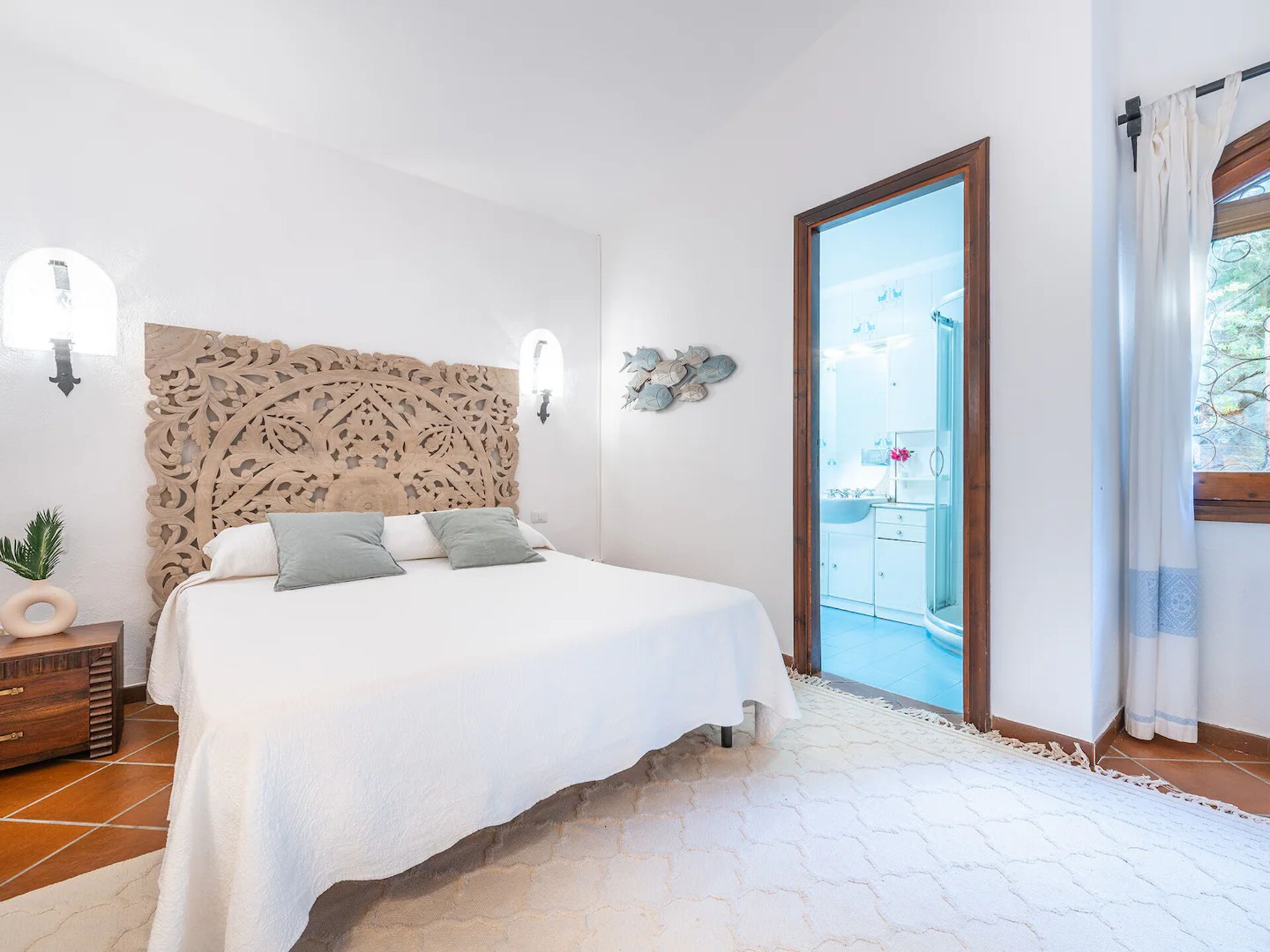 Das Hauptschlafzimmer bietet Platz für zwei Personen und verfügt über ein bequemes Kingsize-Bett. Es hat auch ein Badezimmer mit Dusche, Badewanne und zwei Waschbecken. Das Zimmer mit Blick auf das Meer, den Strand und den Pool ist Teil des ursprünglichen Hauses und verfügt über einen eleganten Kamin.