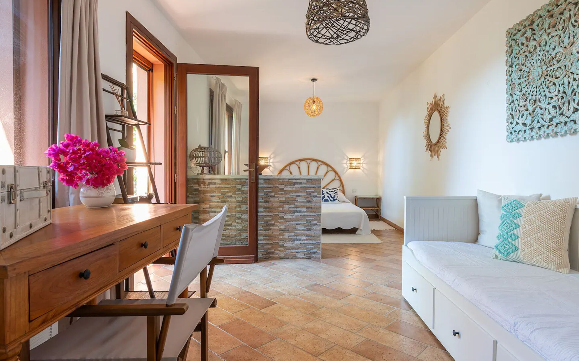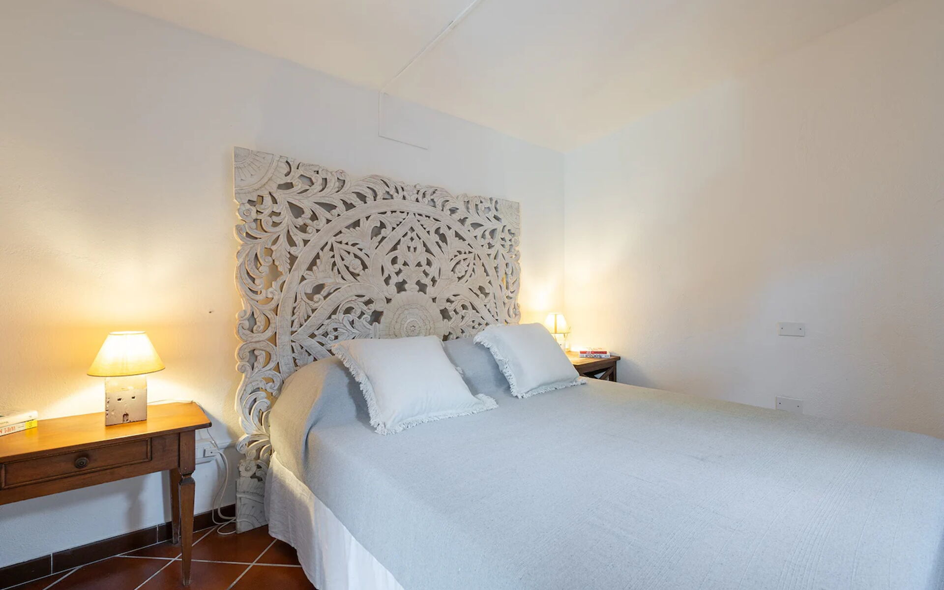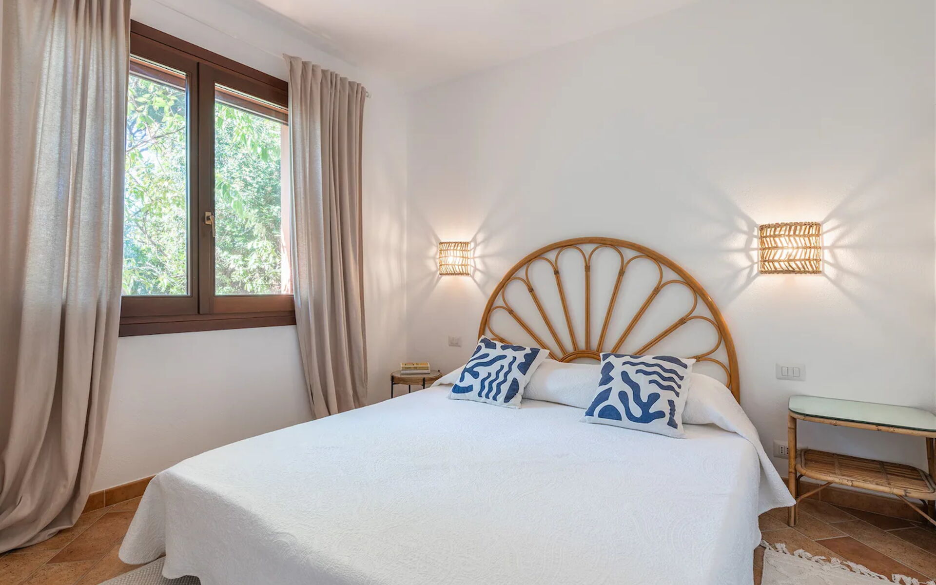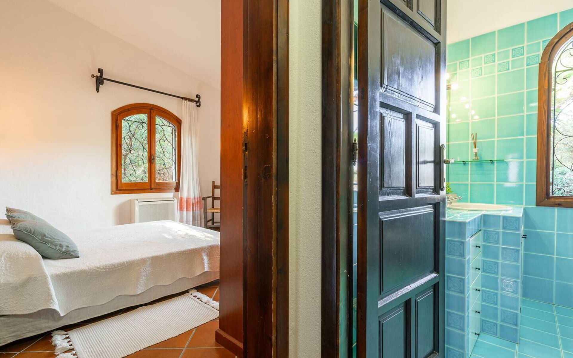 Das Hauptschlafzimmer bietet Platz für zwei Personen und verfügt über ein bequemes Kingsize-Bett. Es hat auch ein Badezimmer mit Dusche, Badewanne und zwei Waschbecken. Das Zimmer mit Blick auf das Meer, den Strand und den Pool ist Teil des ursprünglichen Hauses und verfügt über einen eleganten Kamin.