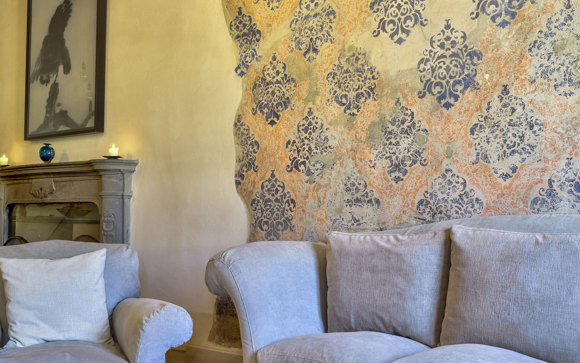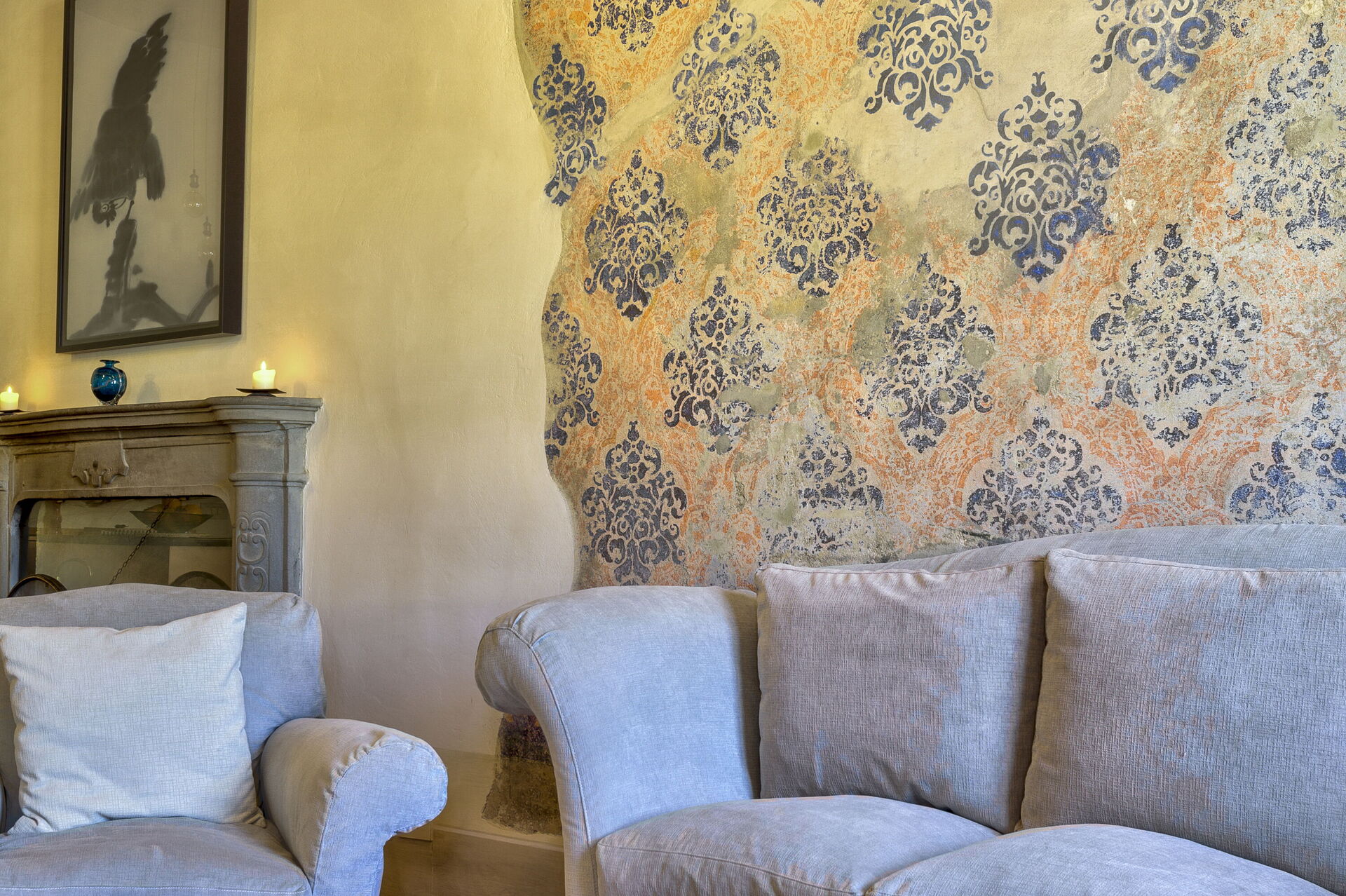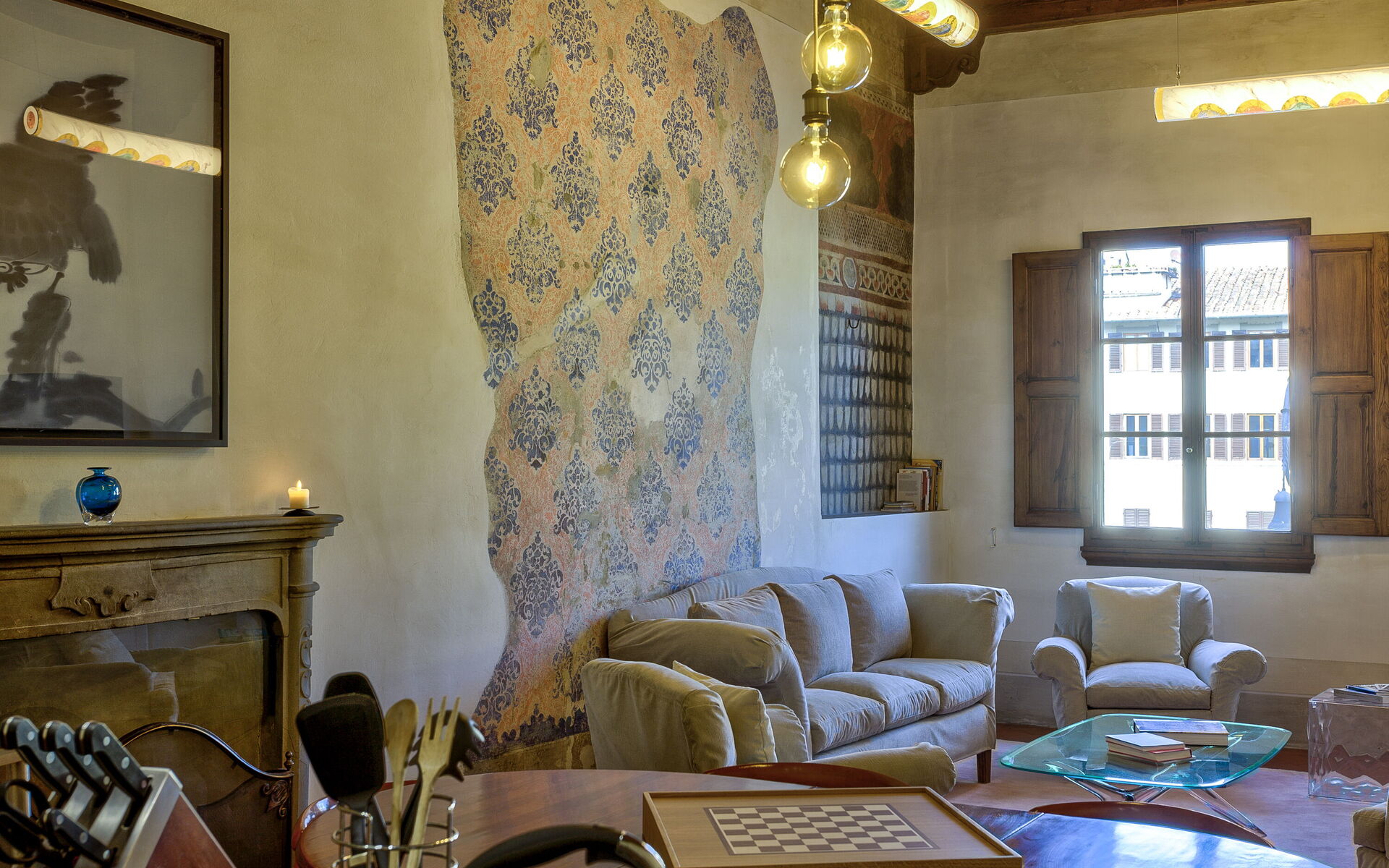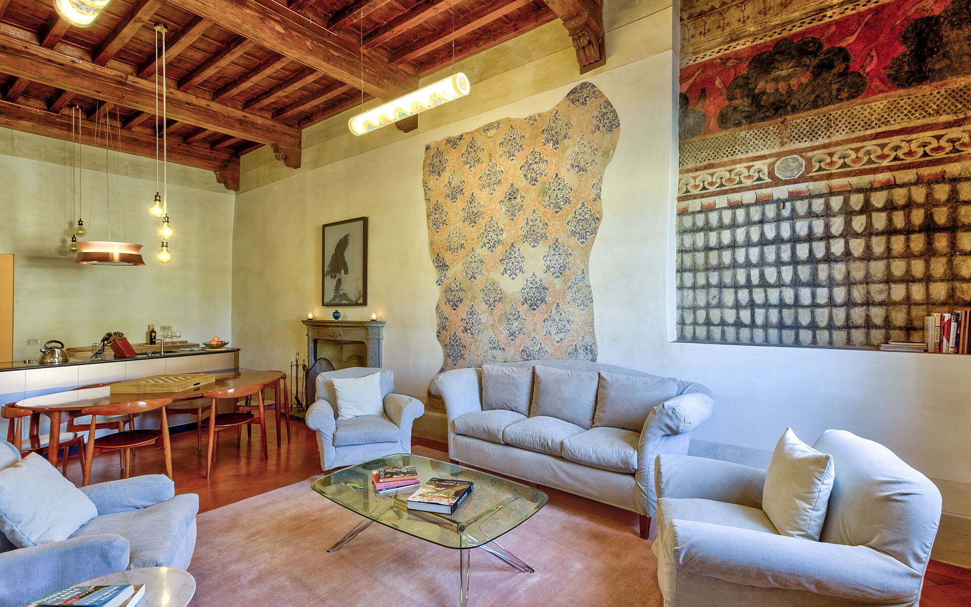 Following, there is the large modern living area, but at the same time embellished with wonderful original antique frescoes.