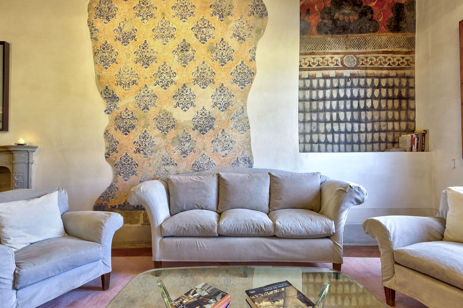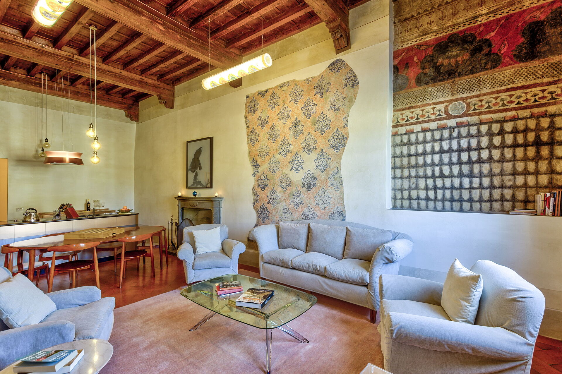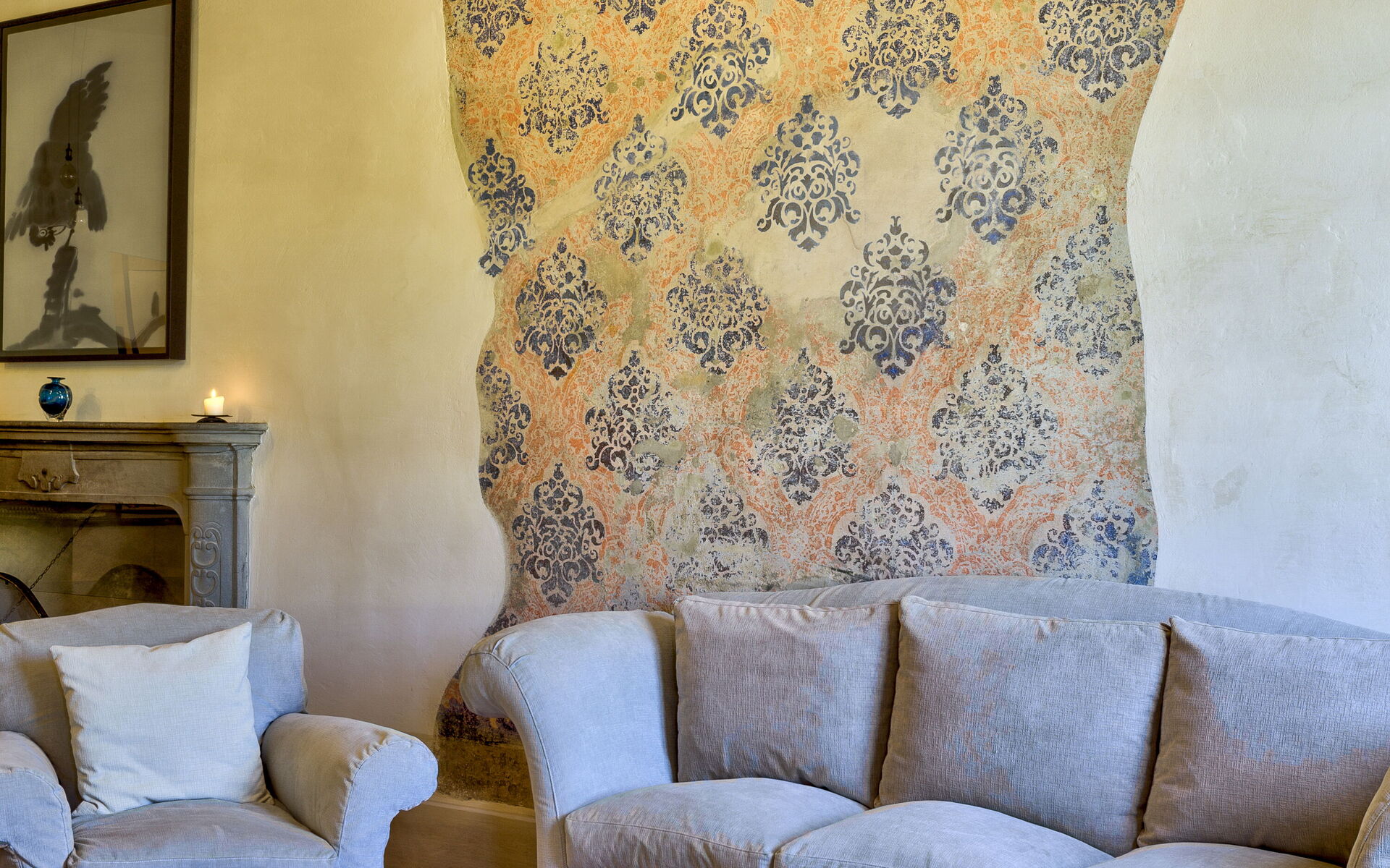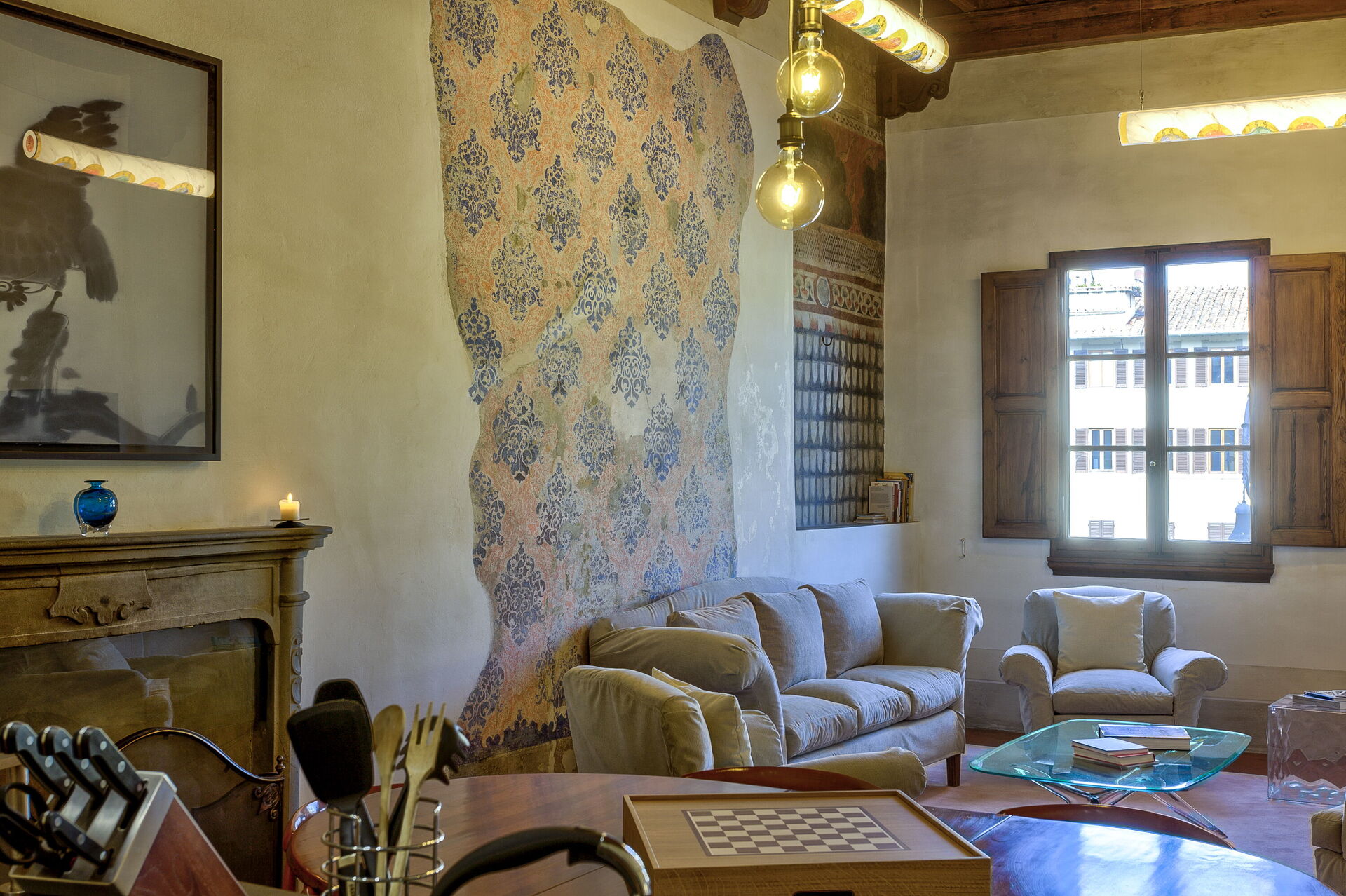 Following, there is the large modern living area, but at the same time embellished with wonderful original antique frescoes.