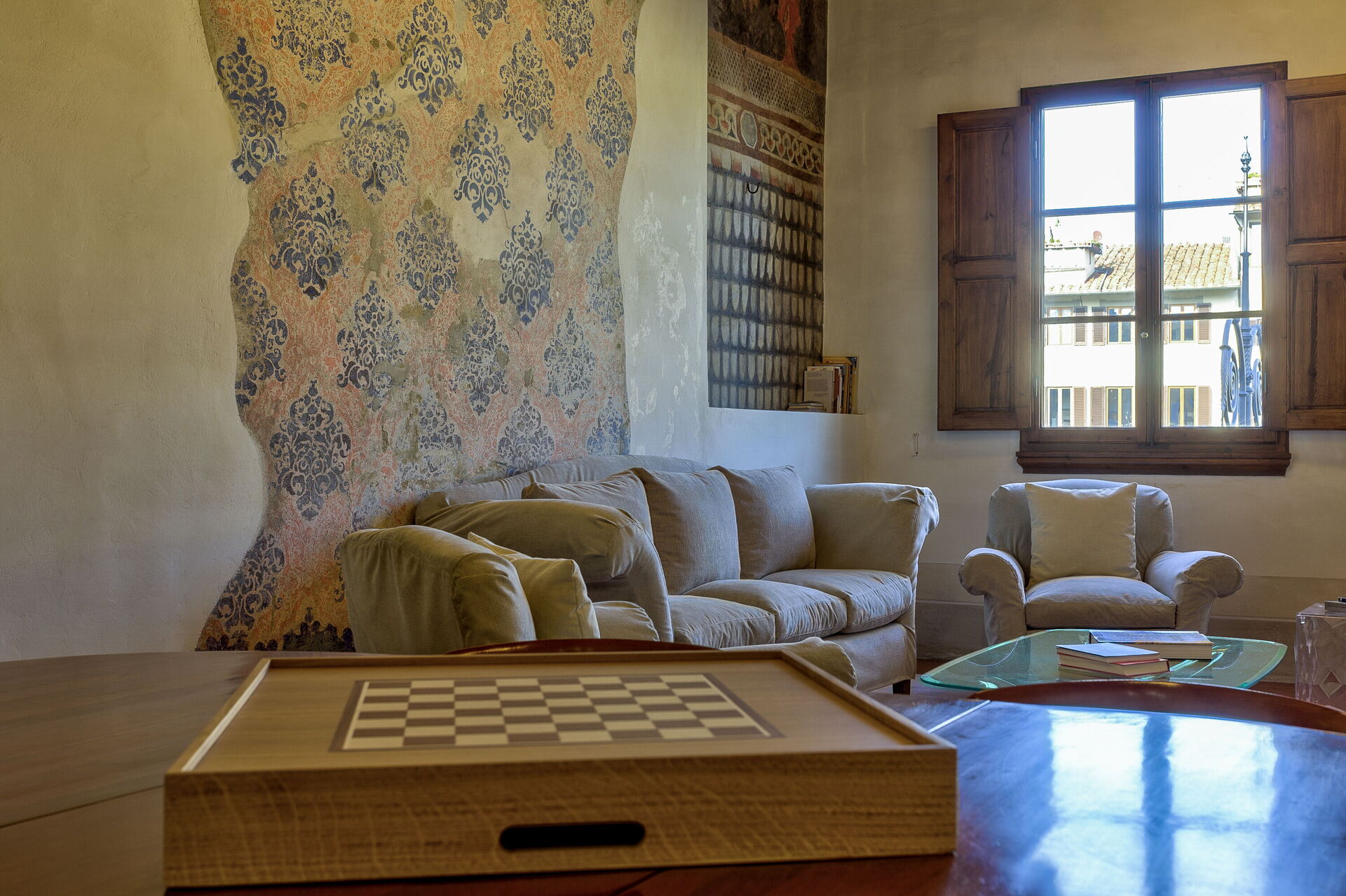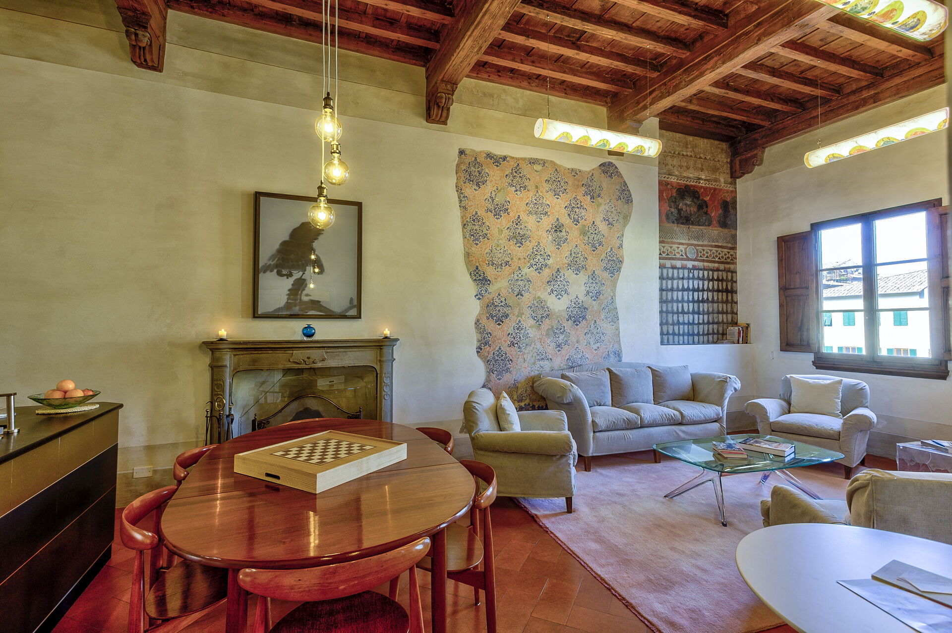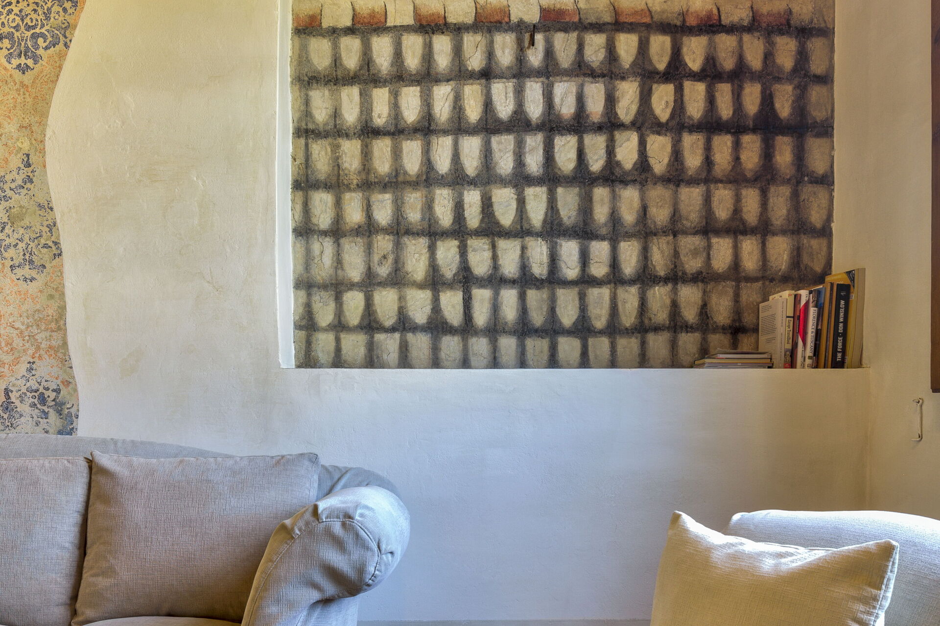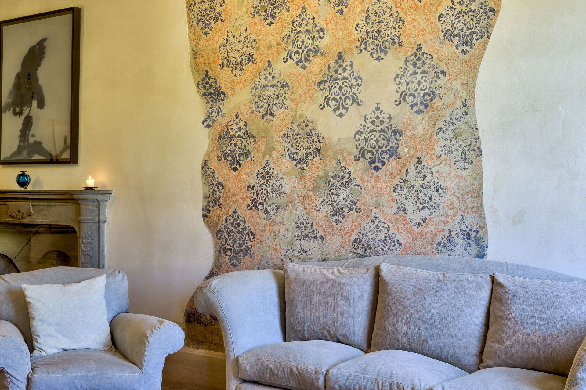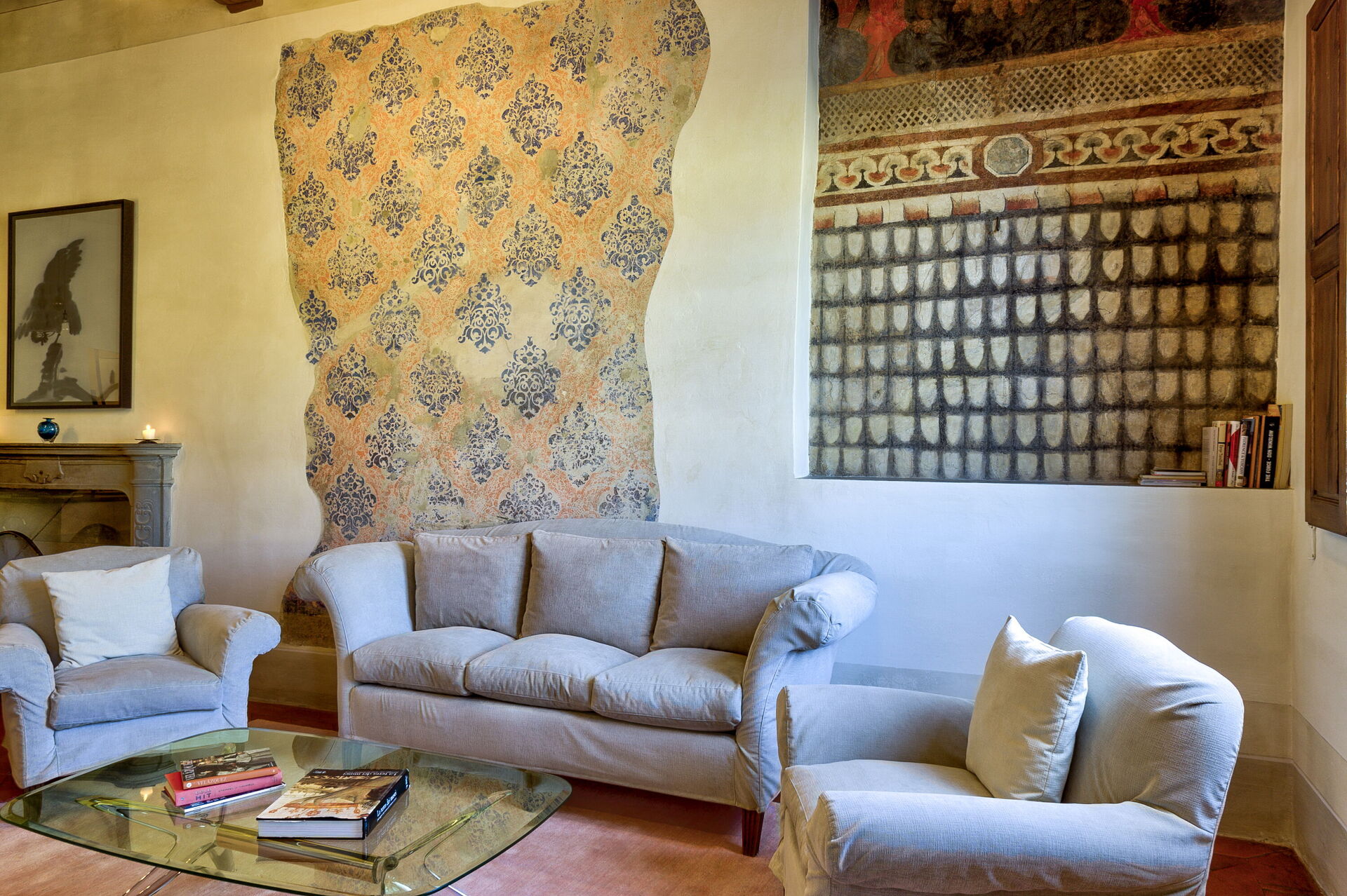 Following, there is the large modern living area, but at the same time embellished with wonderful original antique frescoes.