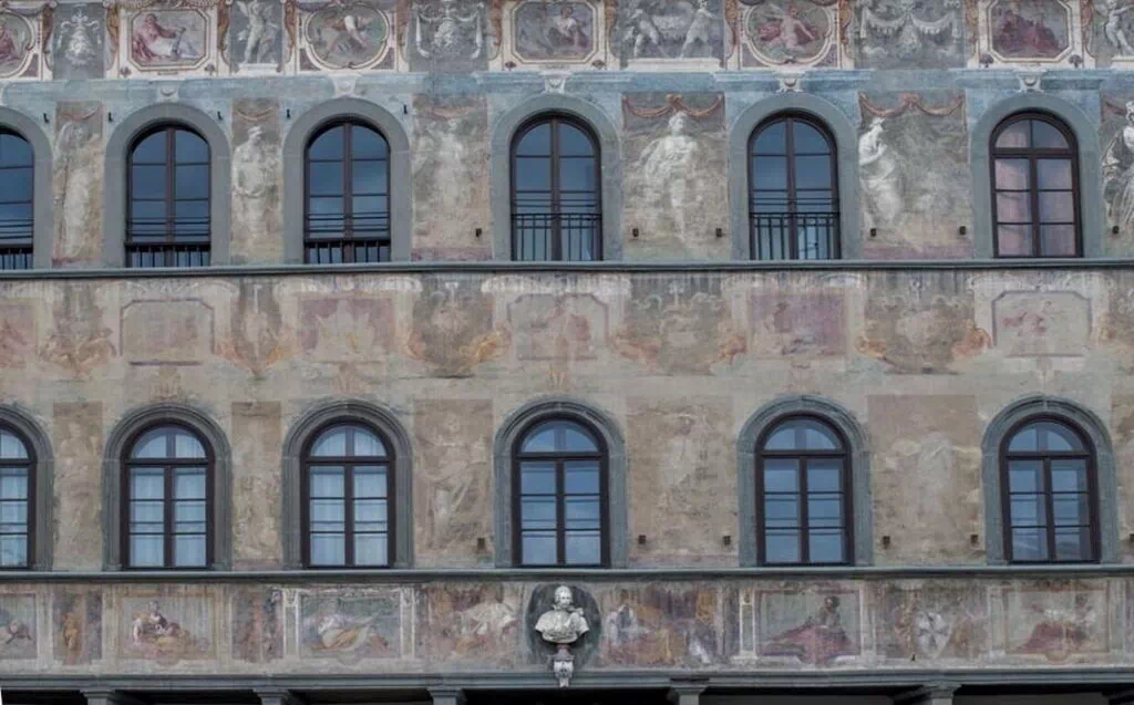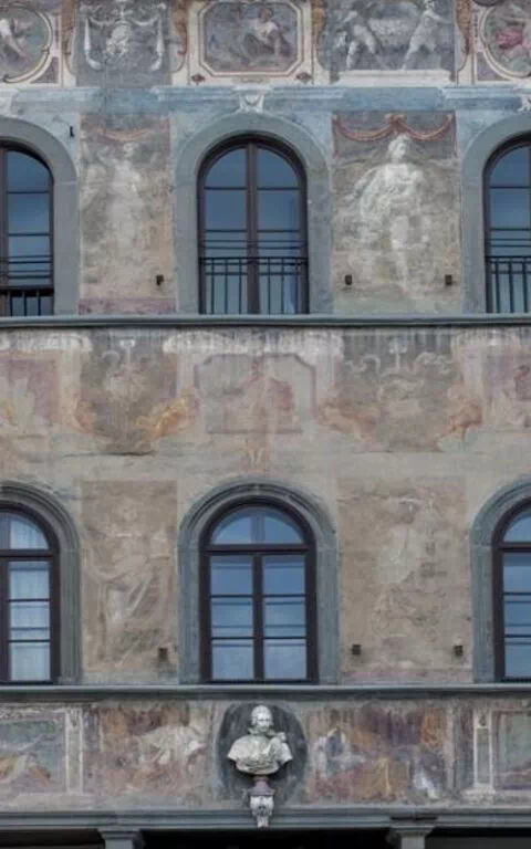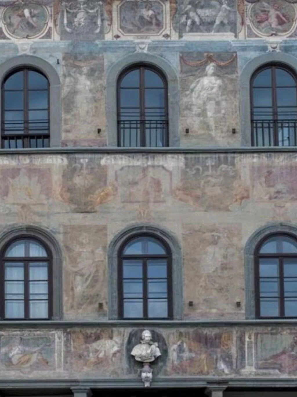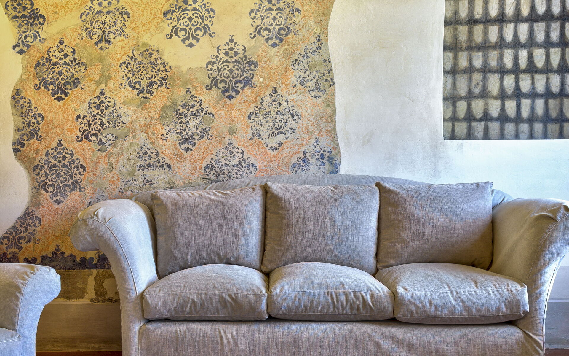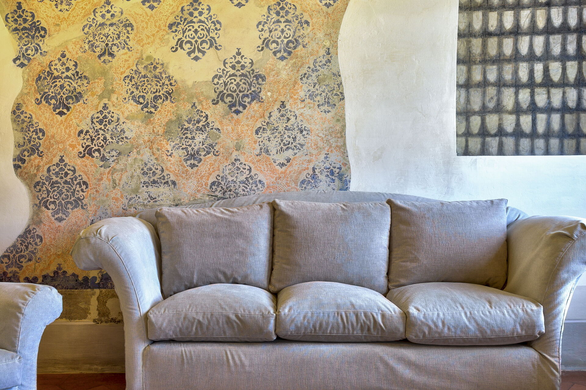 Following, there is the large modern living area, but at the same time embellished with wonderful original antique frescoes.