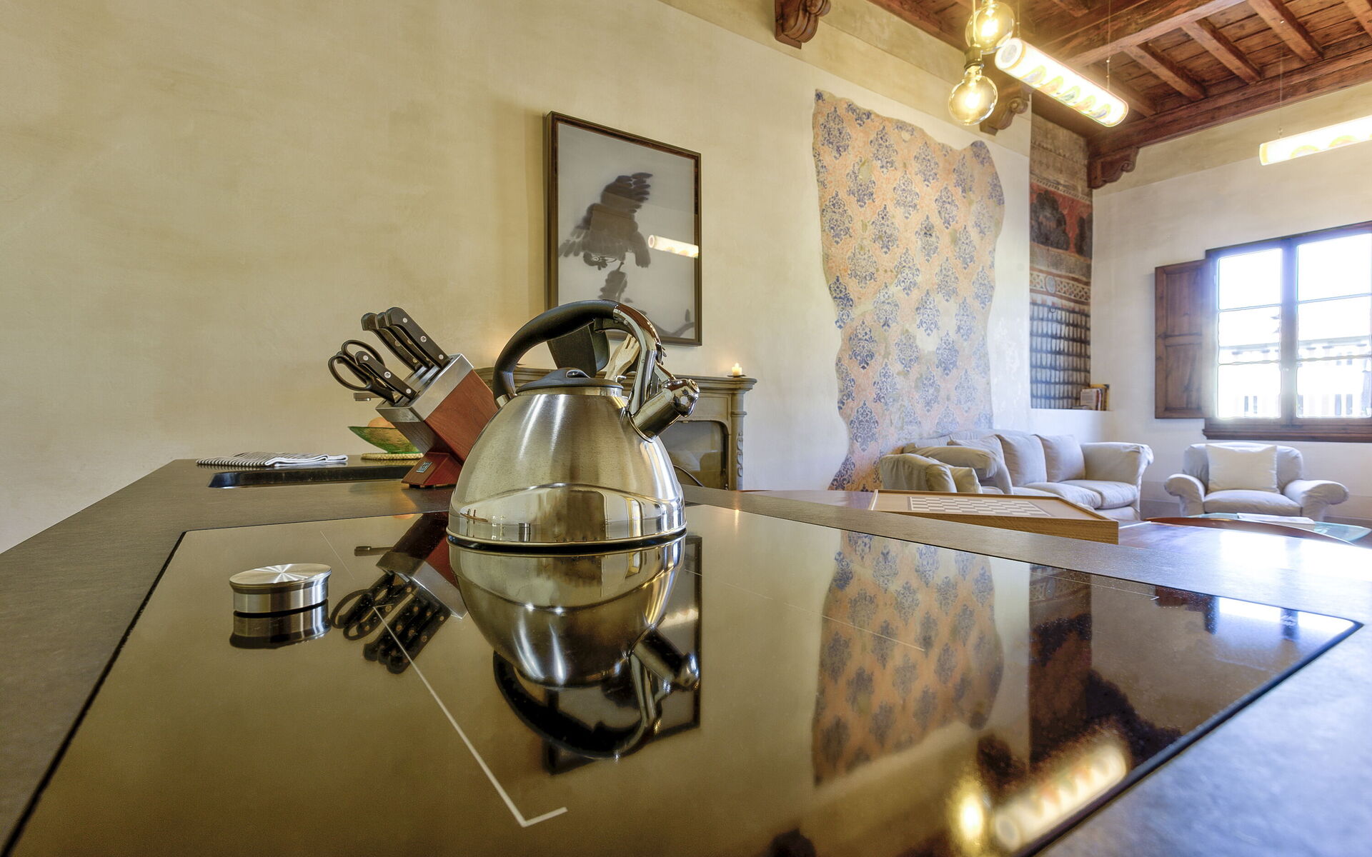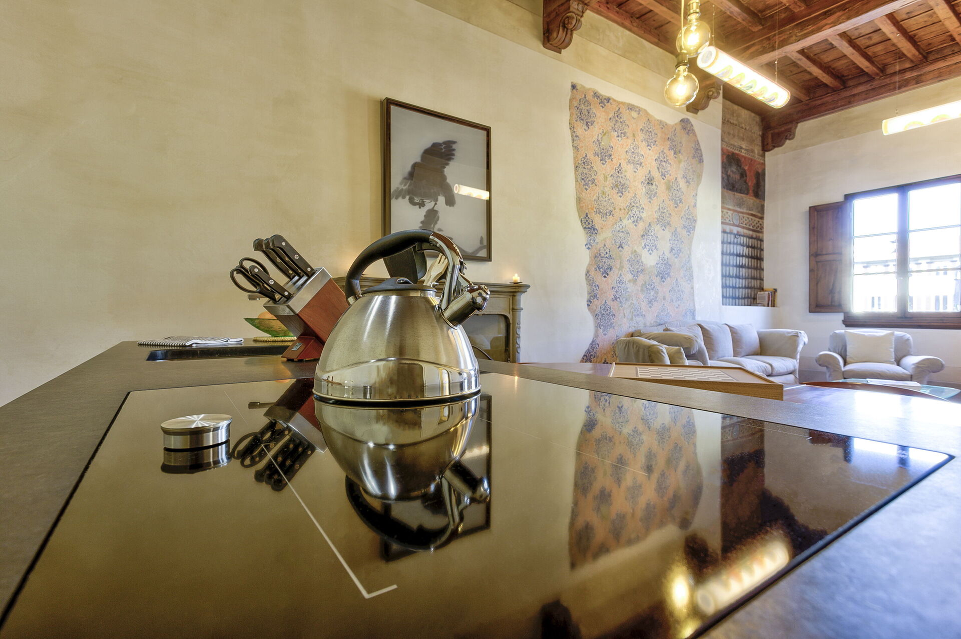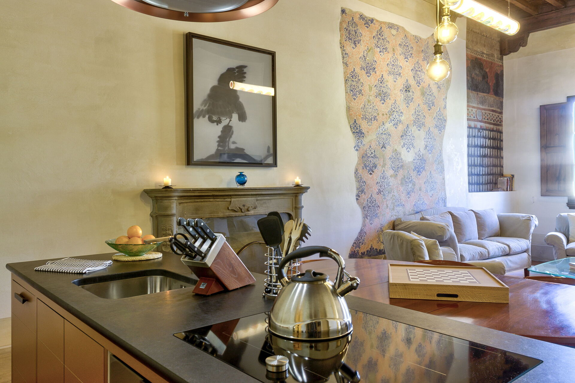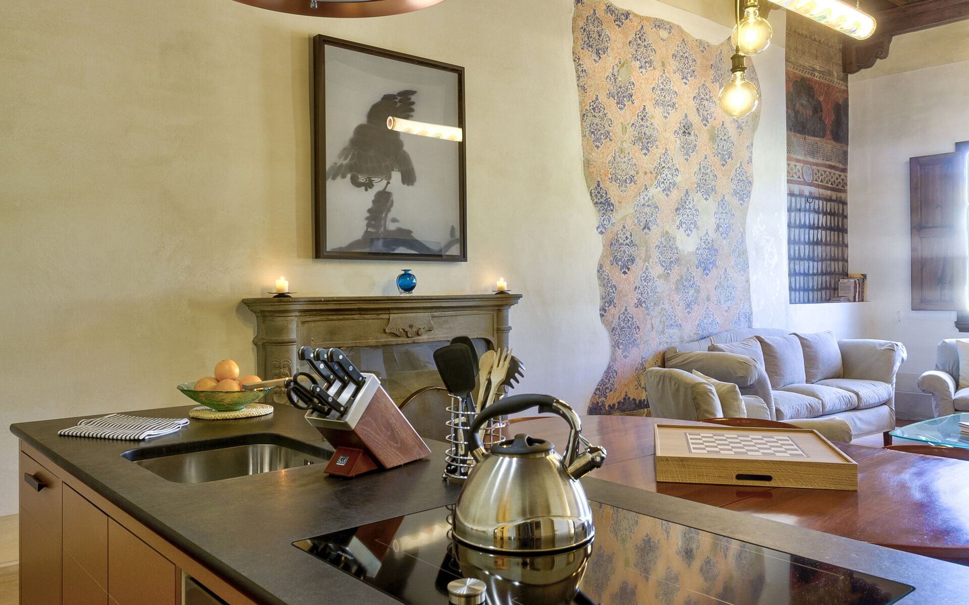 There is the large modern living area, but at the same time embellished with wonderful original antique frescoes. Here is a very well-equipped kitchen area with central island.