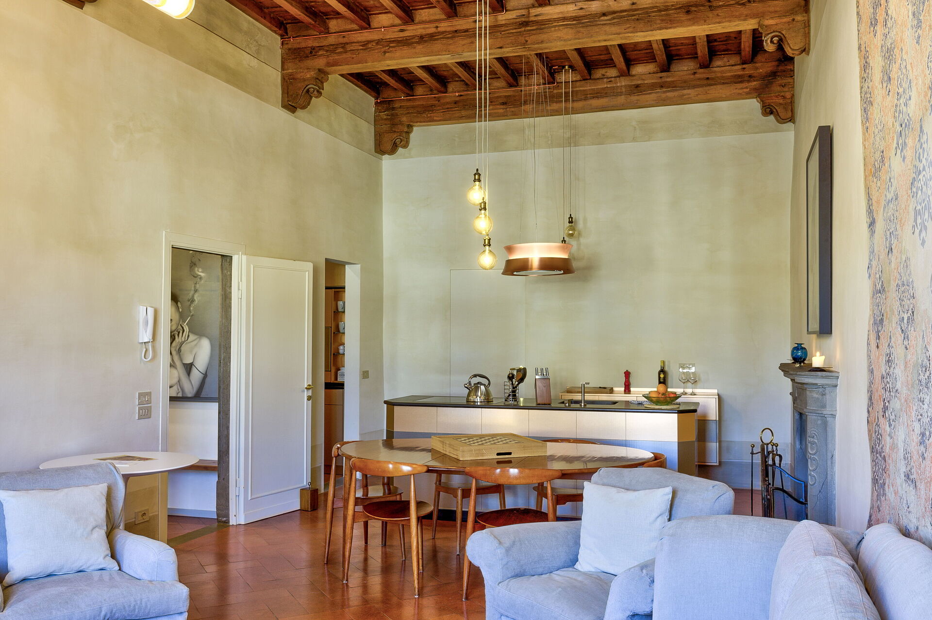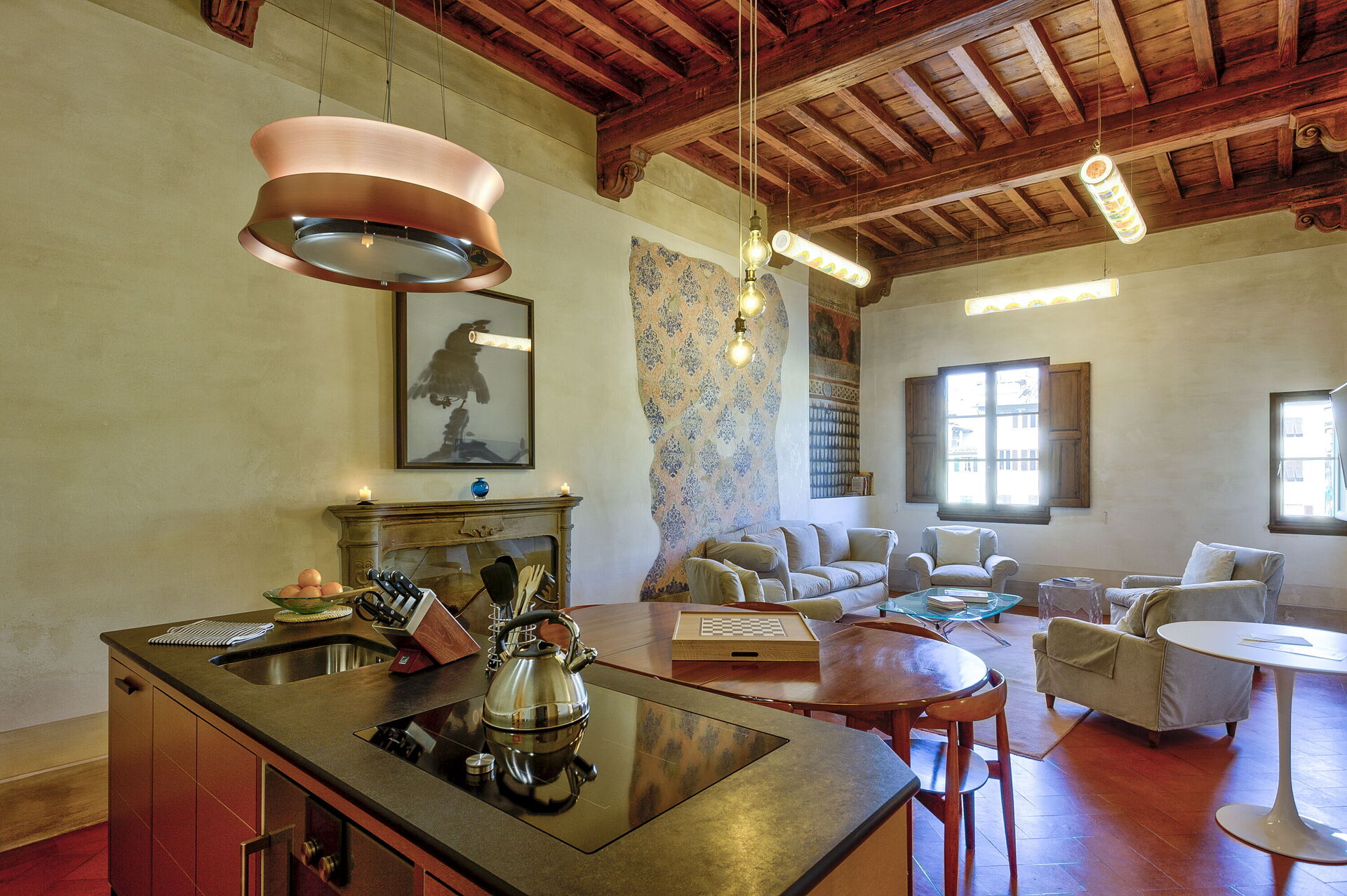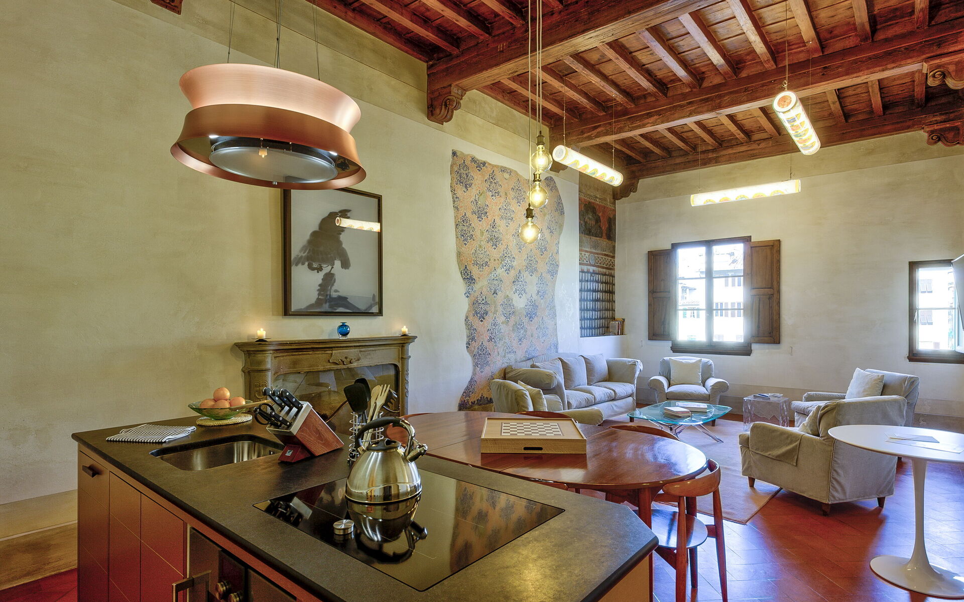 There is the large modern living area, but at the same time embellished with wonderful original antique frescoes. Here is a very well-equipped kitchen area with central island.