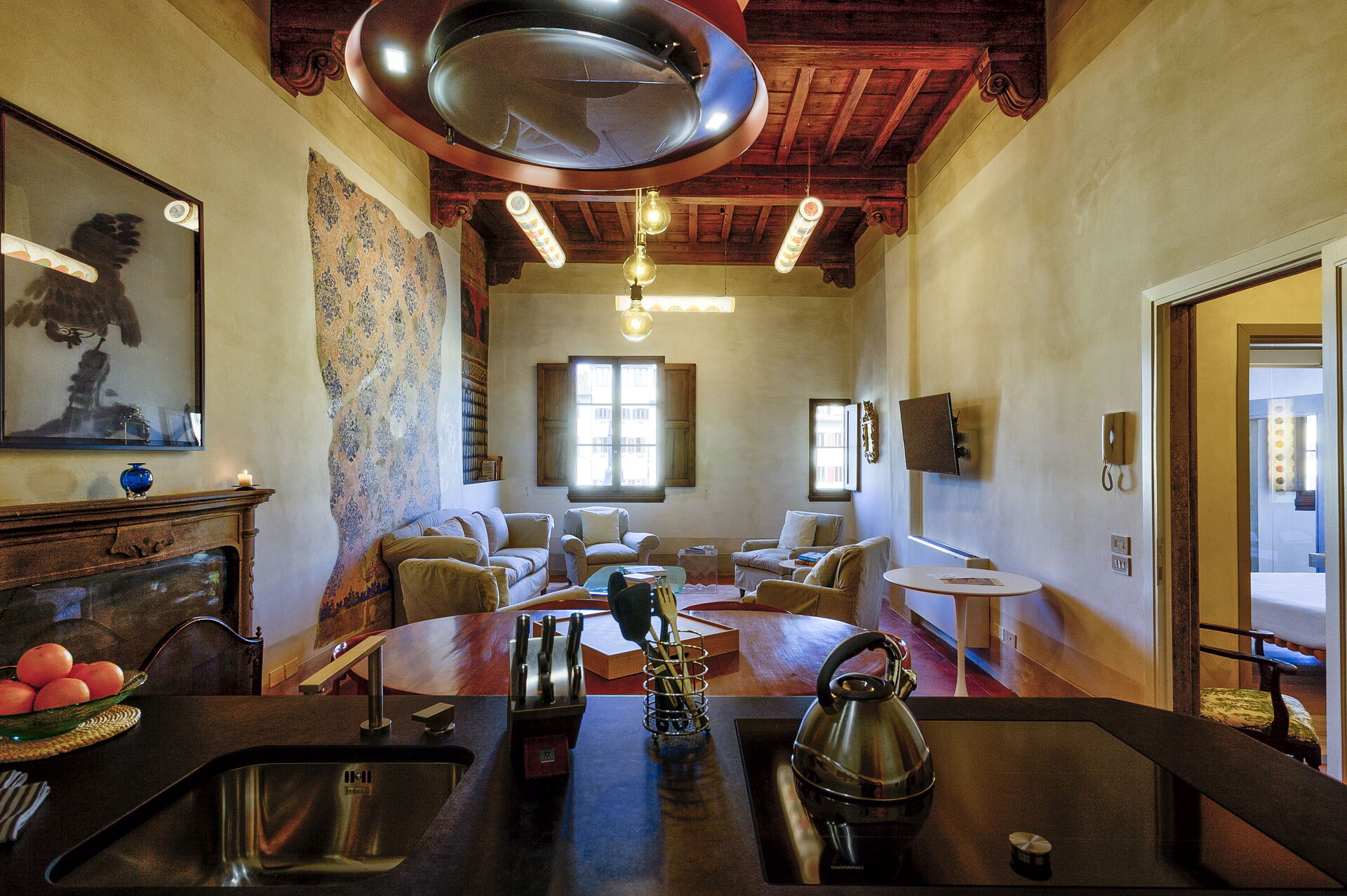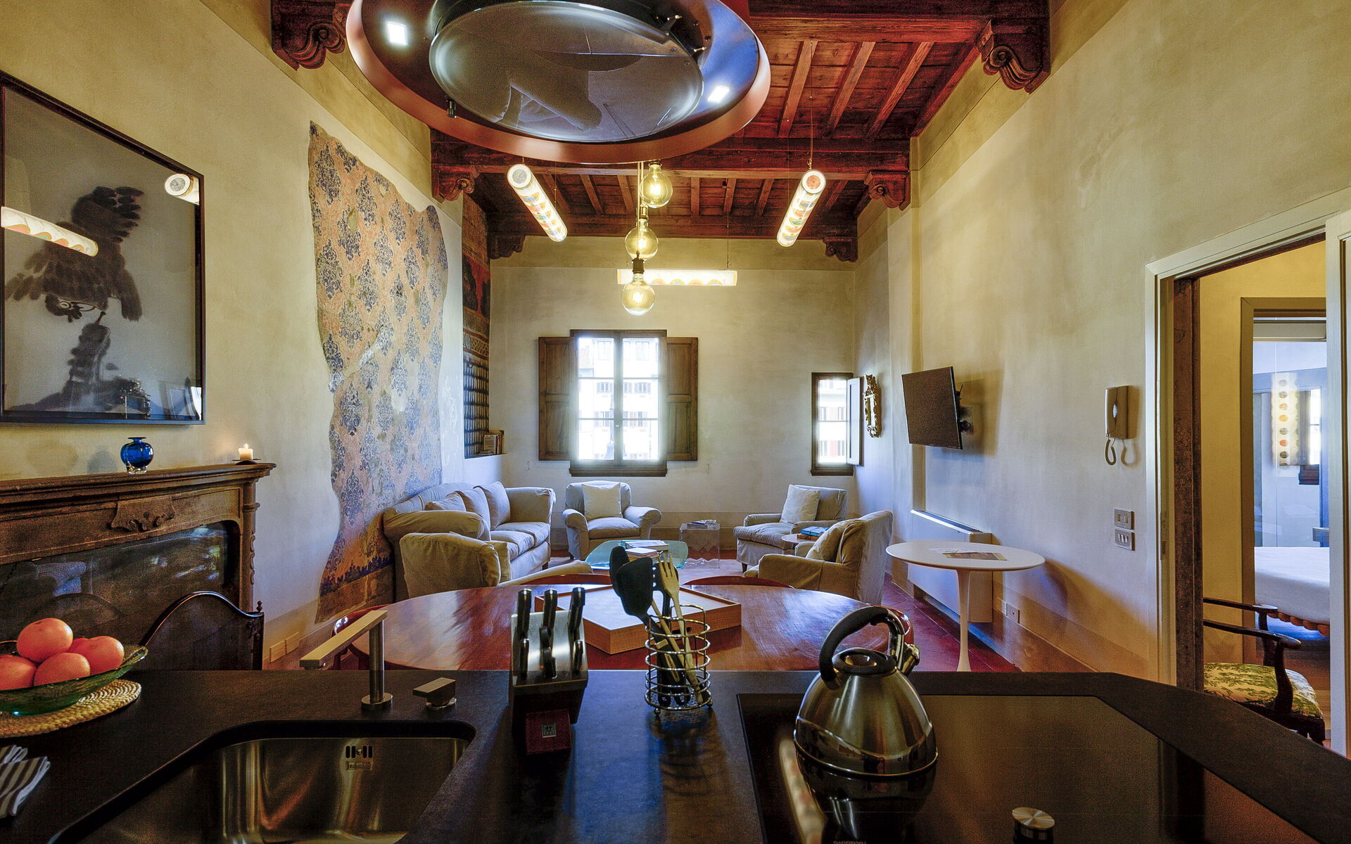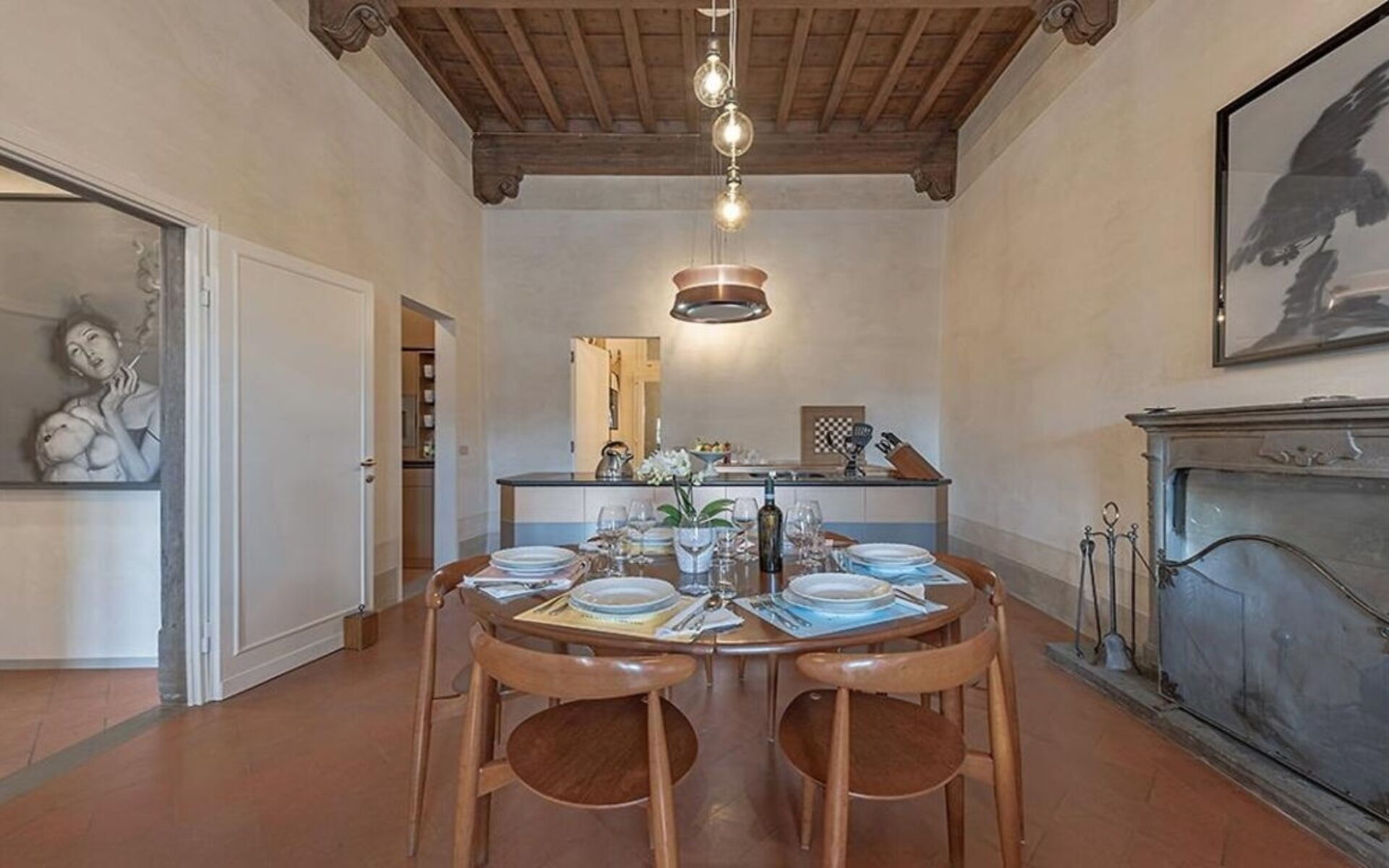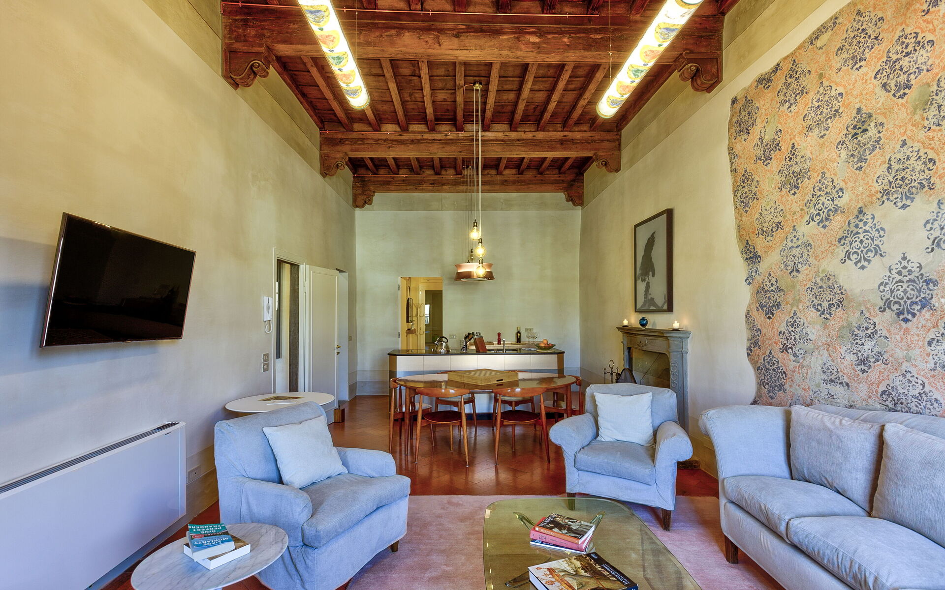 There is the large modern living area, but at the same time embellished with wonderful original antique frescoes. Here is a very well-equipped kitchen area with central island.