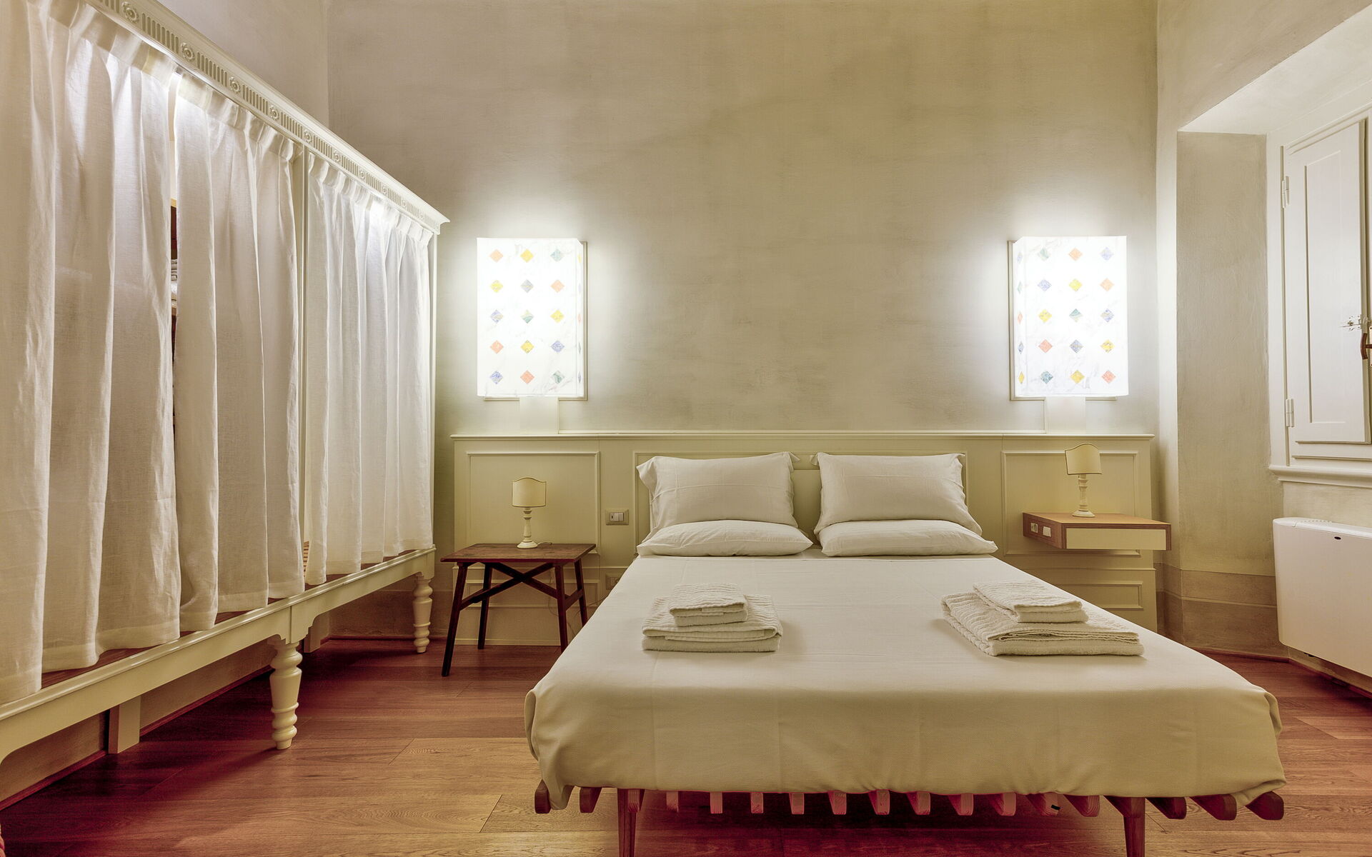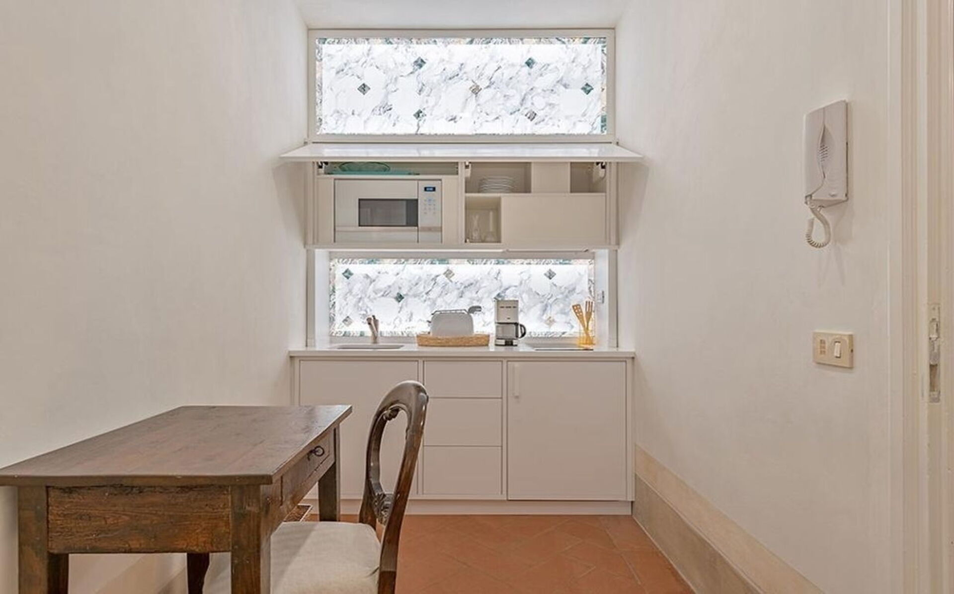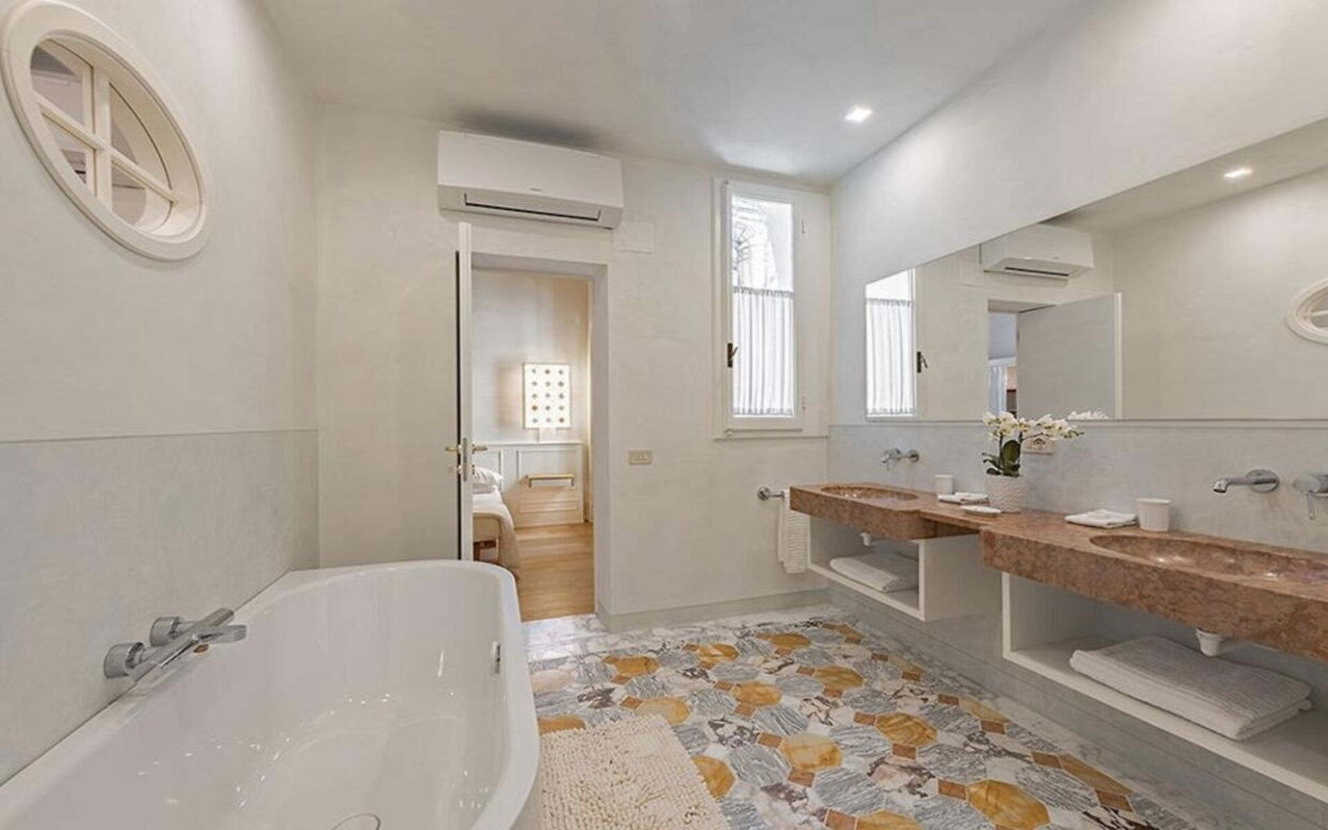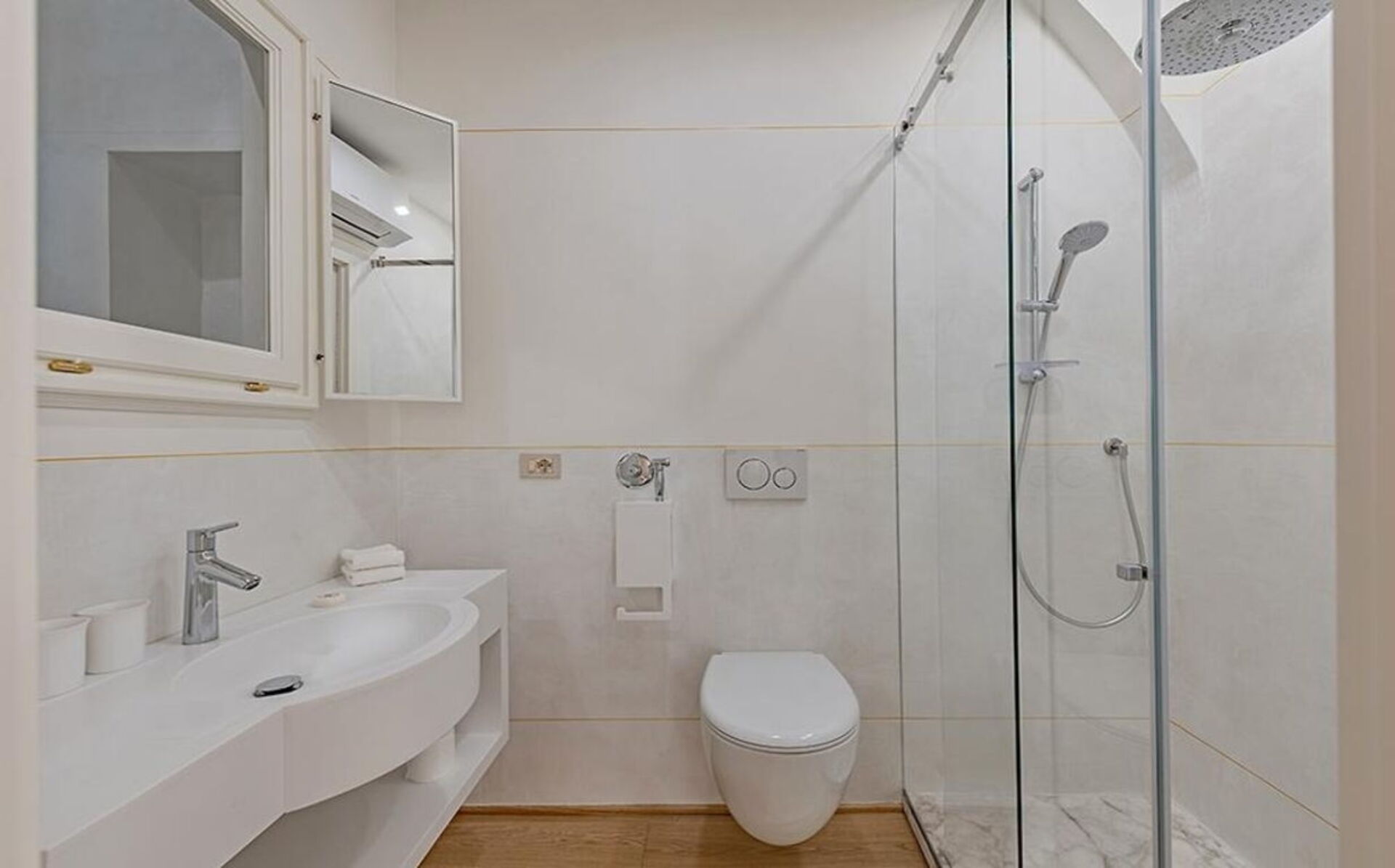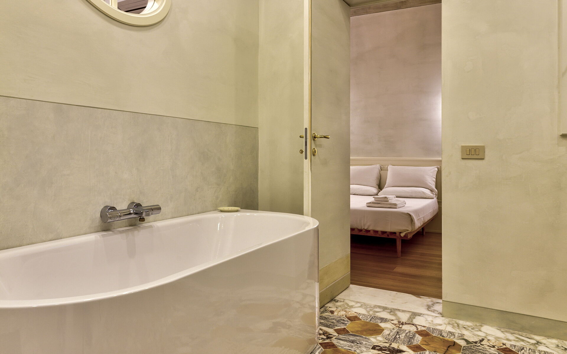 Apartment on a classic modern style level (136 sq.mt/ 1463 sq.ft). It can accommodate up to 6 people with 3 bedrooms and has 3 full bathrooms. As soon as you enter you will find the first entrance. On the left there is a small kitchen, with a dining table, a bedroom (160cm wide, not divisible) with TV and a large ensuite bathroom with ocher marble floor. Continuing from the first entrance, there is a second entrance which leads to the second part of the apartment. On the right is the first bedroom (160cm wide, not divisible), overlooking Piazza Santa Croce with double glazing glass wall to ensure a quiet environment at night. This room also has a walk-in closet and has its own bathroom with double sinks.