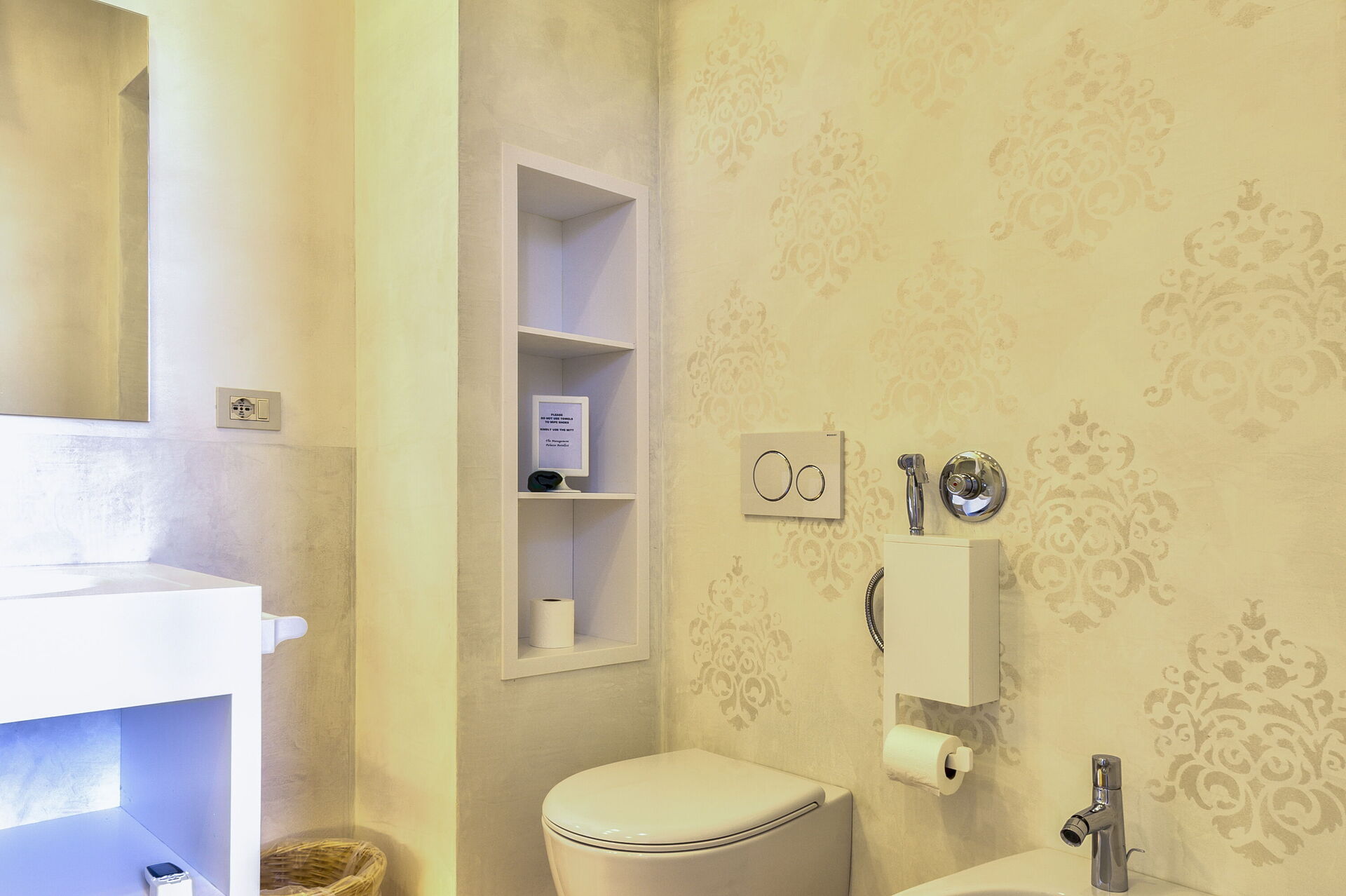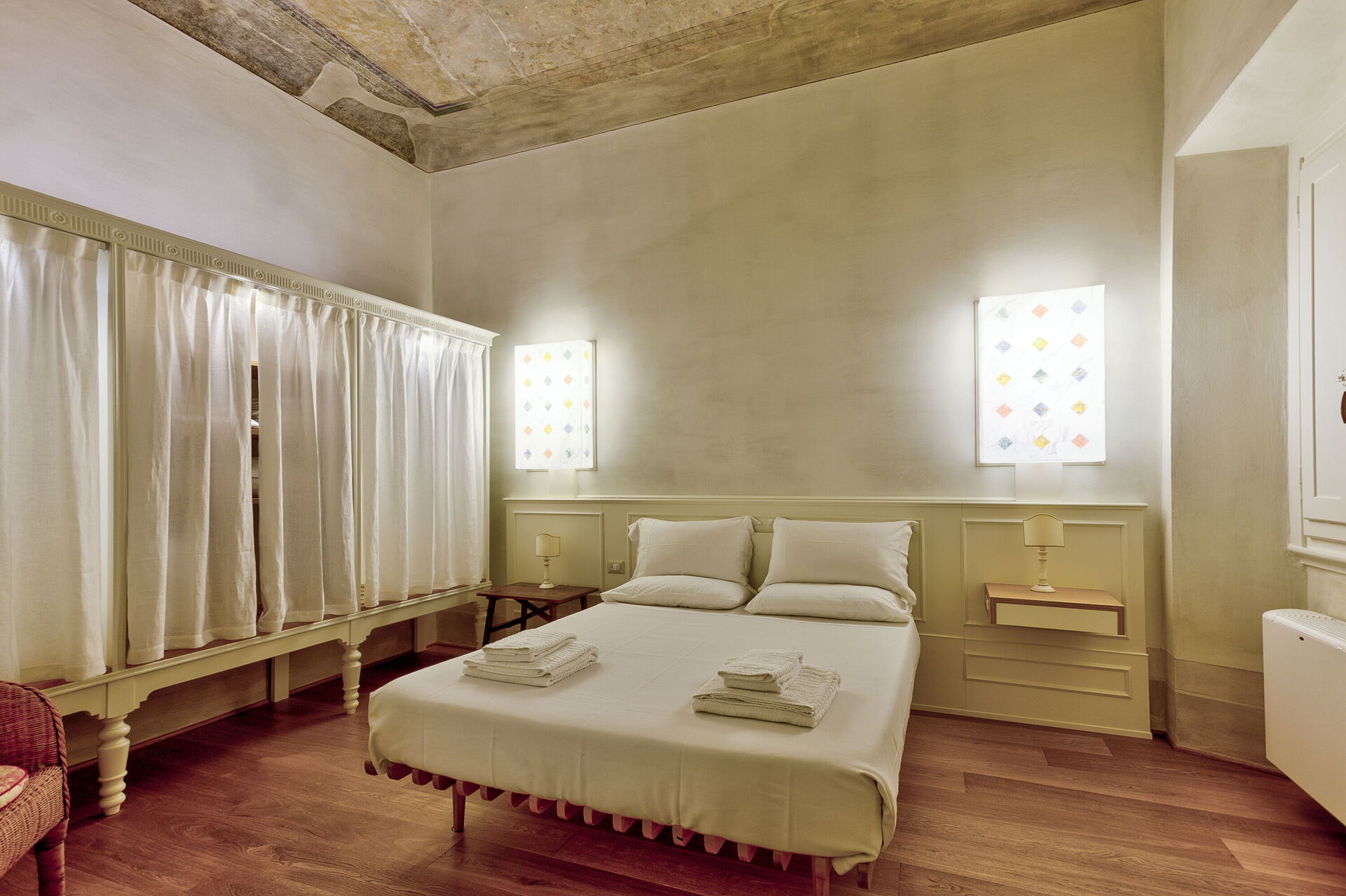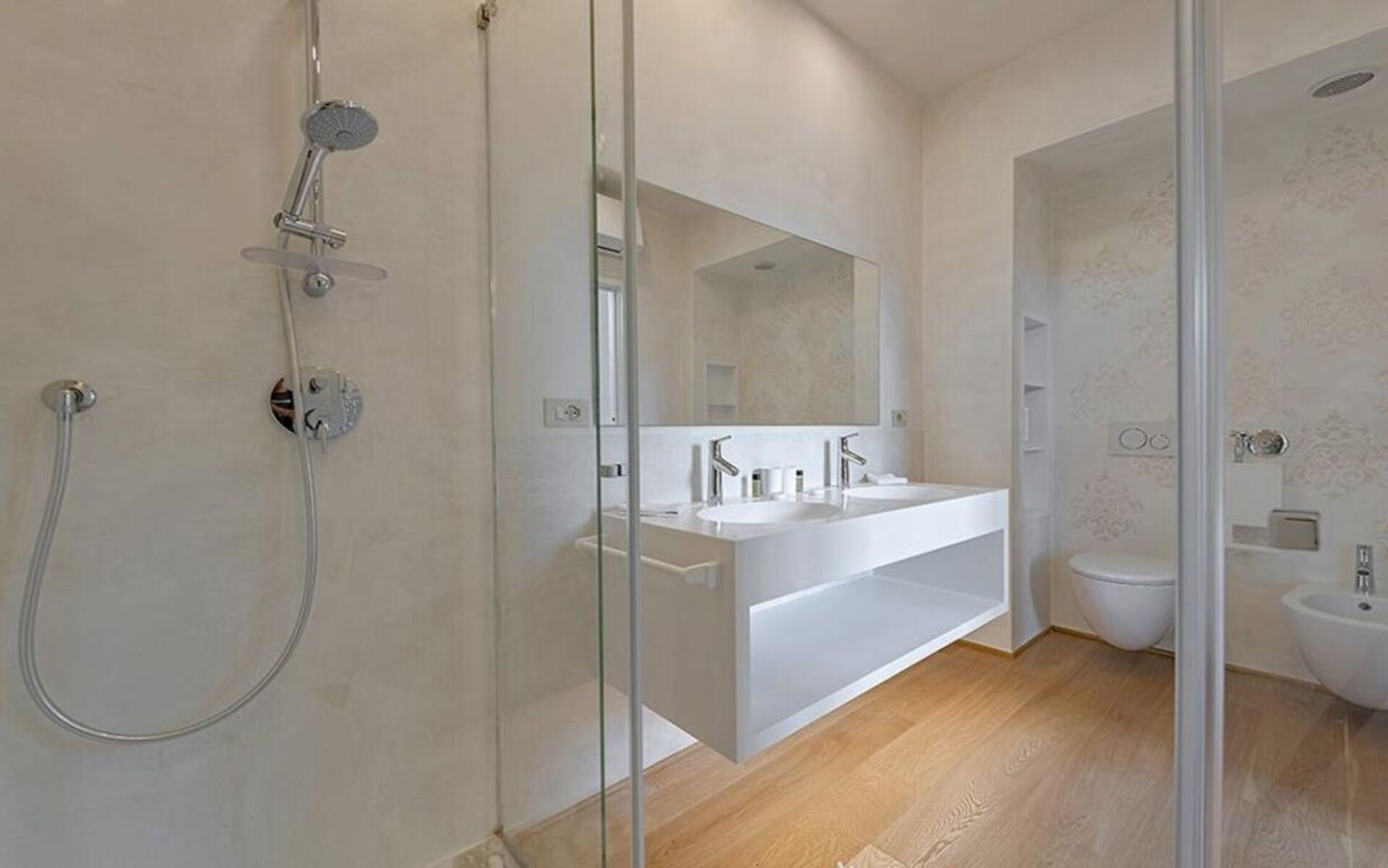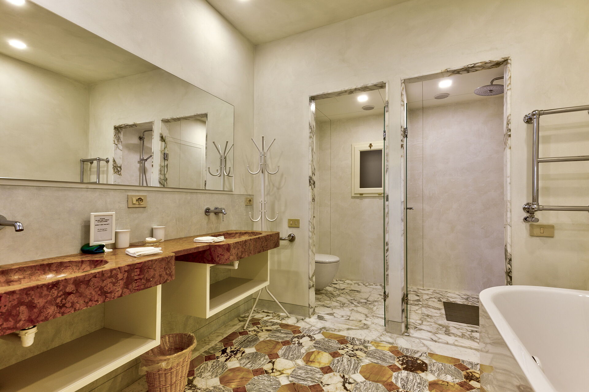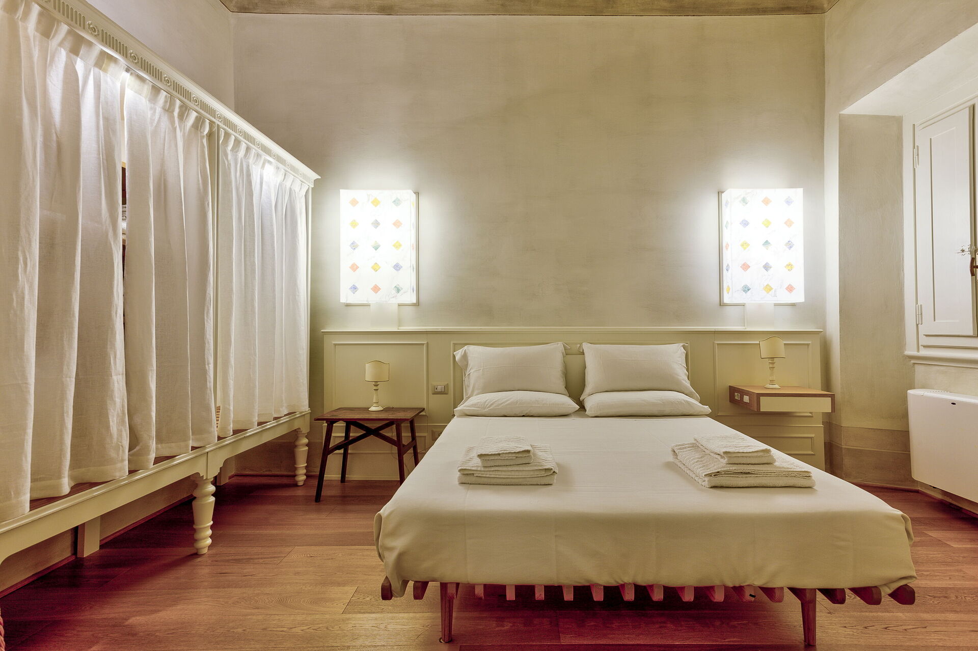 Apartment on a classic modern style level (136 sq.mt/ 1463 sq.ft). It can accommodate up to 6 people with 3 bedrooms and has 3 full bathrooms. As soon as you enter you will find the first entrance. On the left there is a small kitchen, with a dining table, a bedroom (160cm wide, not divisible) with TV and a large ensuite bathroom with ocher marble floor. Continuing from the first entrance, there is a second entrance which leads to the second part of the apartment. On the right is the first bedroom (160cm wide, not divisible), overlooking Piazza Santa Croce with double glazing glass wall to ensure a quiet environment at night. This room also has a walk-in closet and has its own bathroom with double sinks.