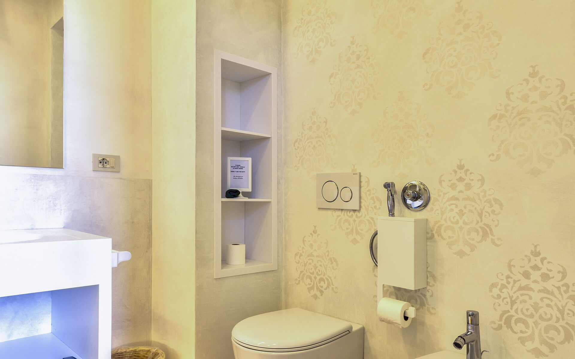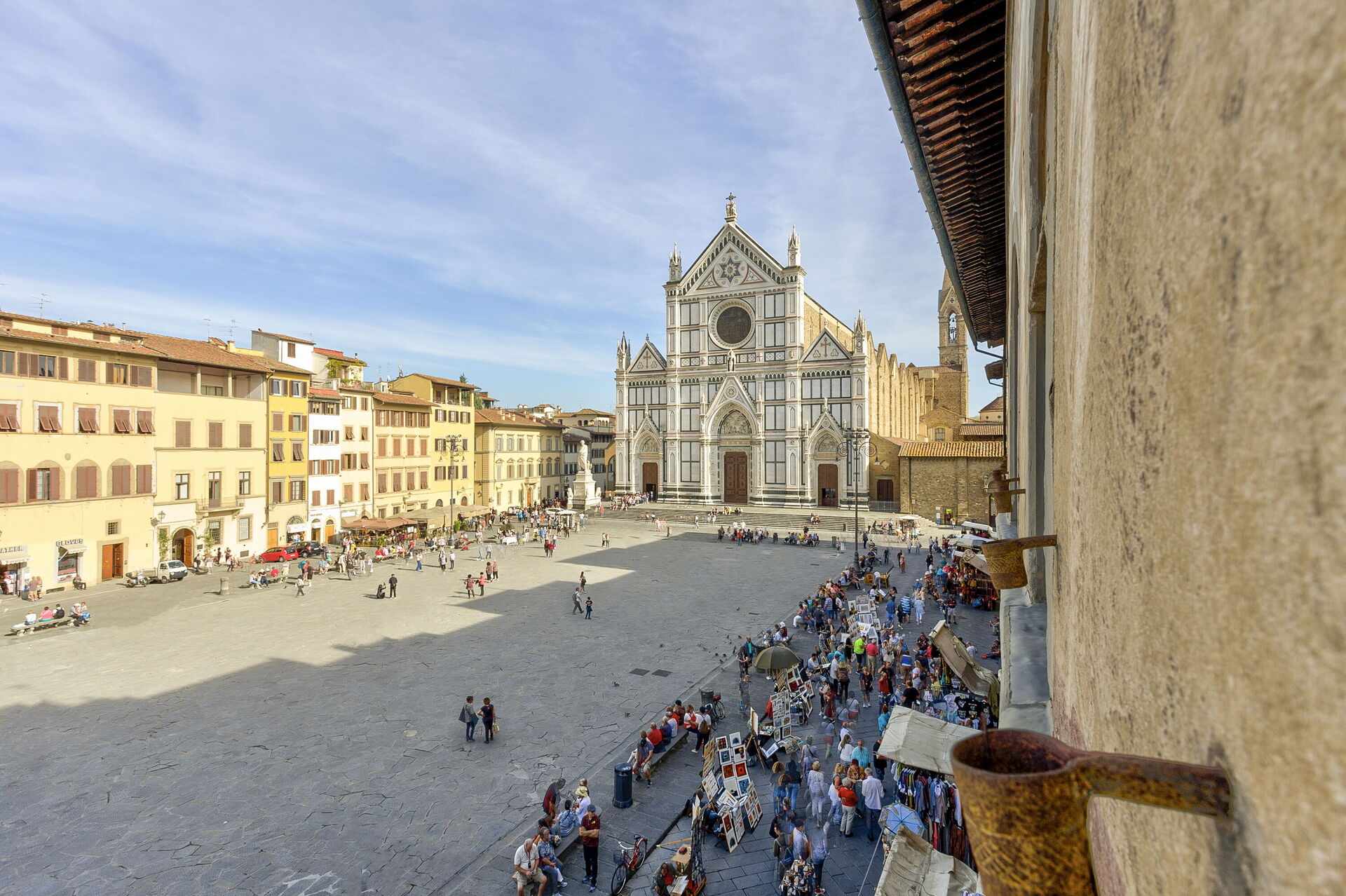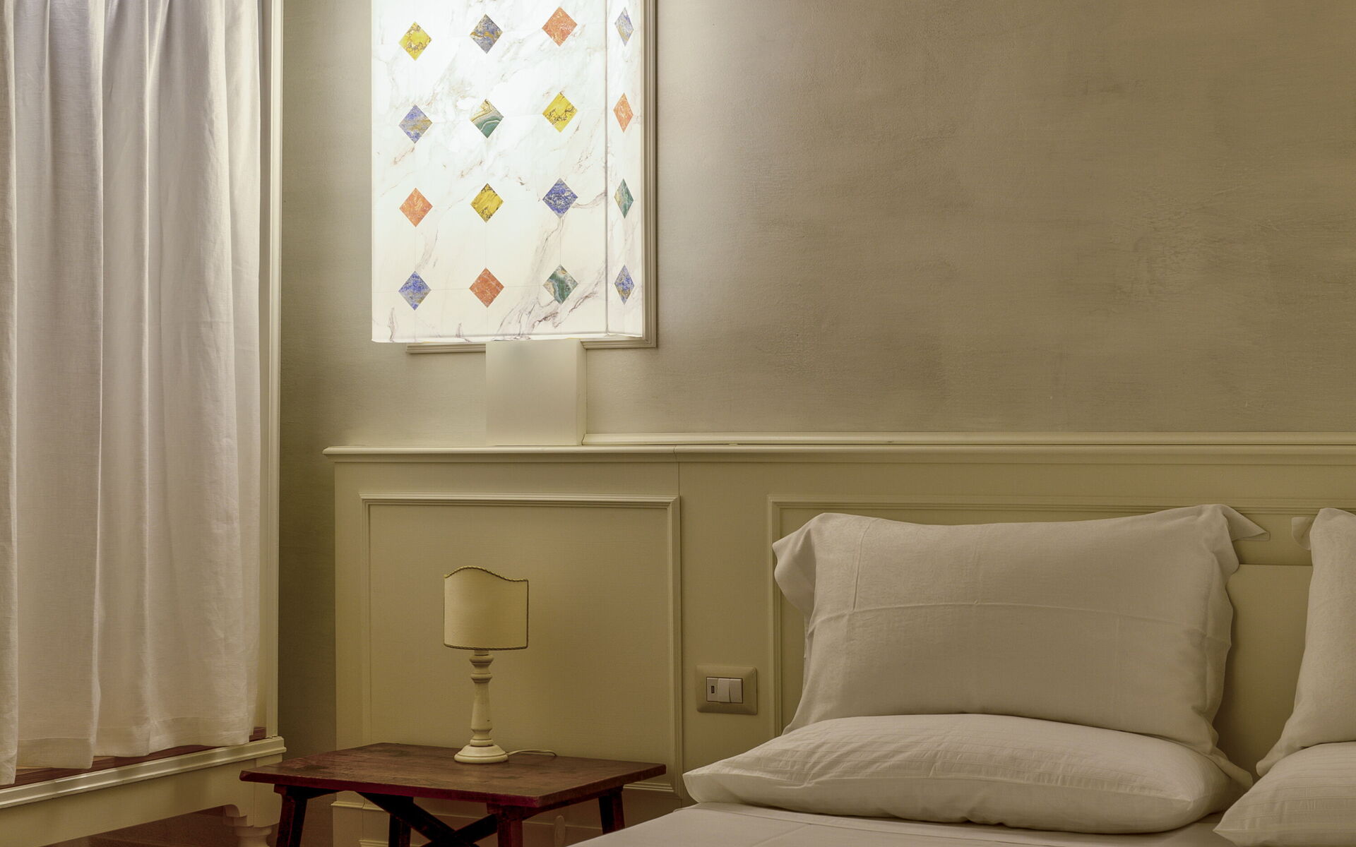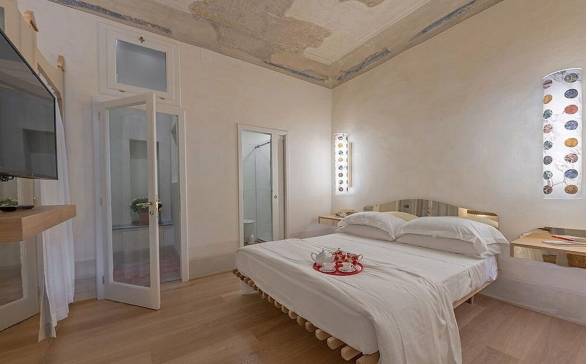 Apartment on a classic modern style level (136 sq.mt/ 1463 sq.ft). It can accommodate up to 6 people with 3 bedrooms and has 3 full bathrooms. As soon as you enter you will find the first entrance. On the left there is a small kitchen, with a dining table, a bedroom (160cm wide, not divisible) with TV and a large ensuite bathroom with ocher marble floor. Continuing from the first entrance, there is a second entrance which leads to the second part of the apartment. On the right is the first bedroom (160cm wide, not divisible), overlooking Piazza Santa Croce with double glazing glass wall to ensure a quiet environment at night. This room also has a walk-in closet and has its own bathroom with double sinks.