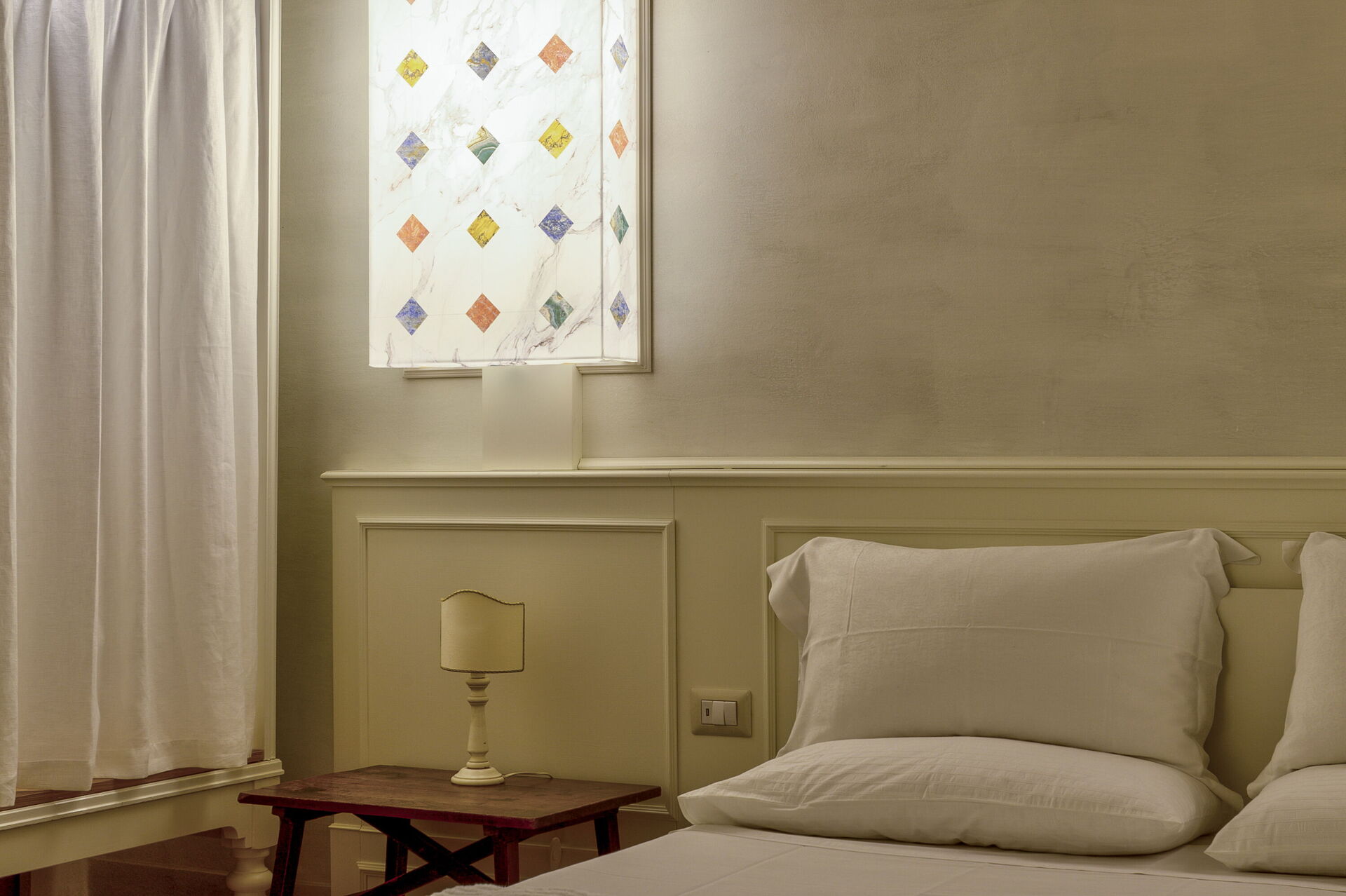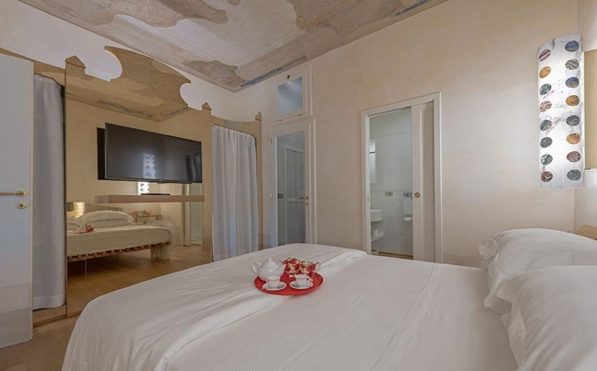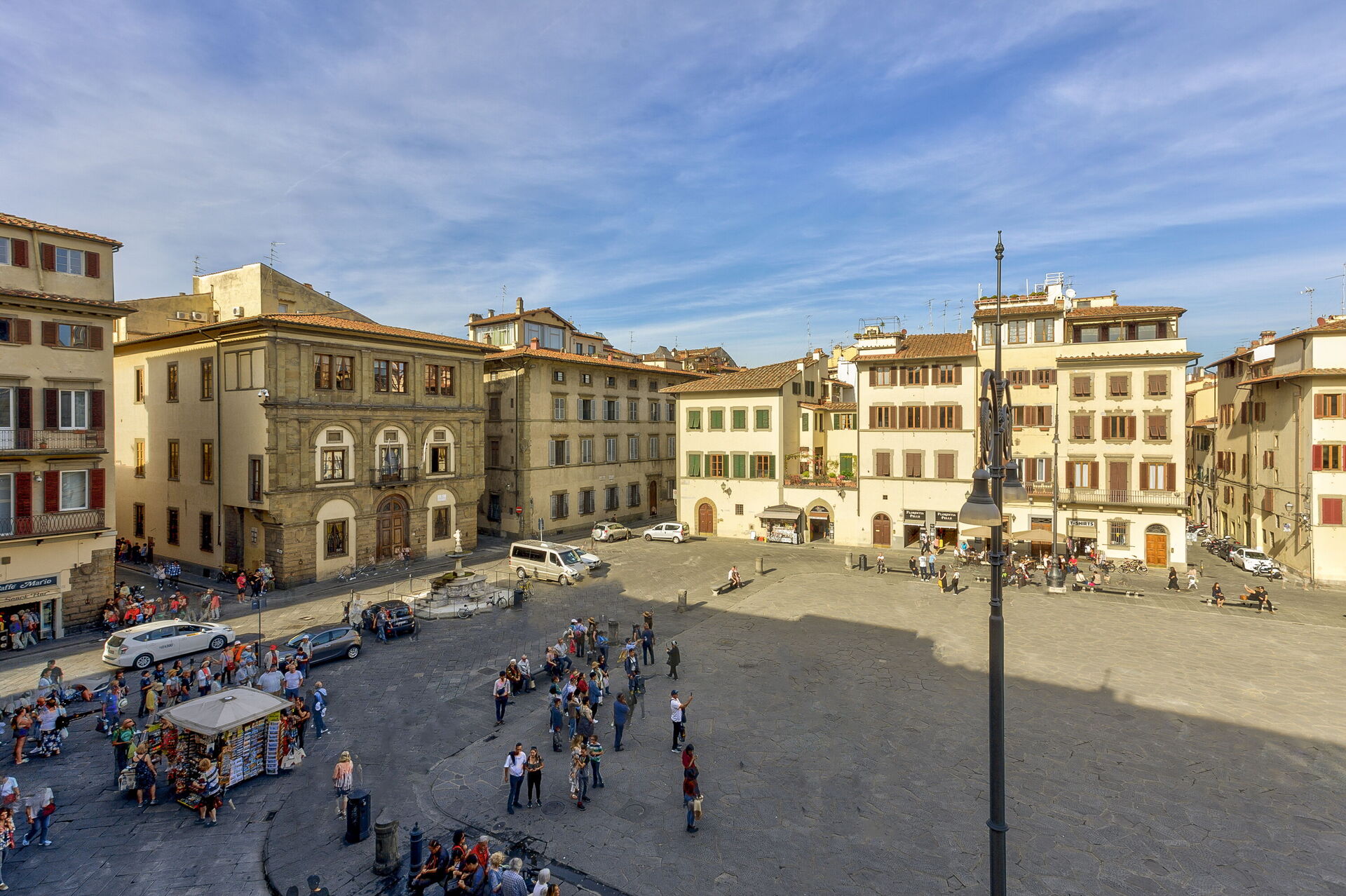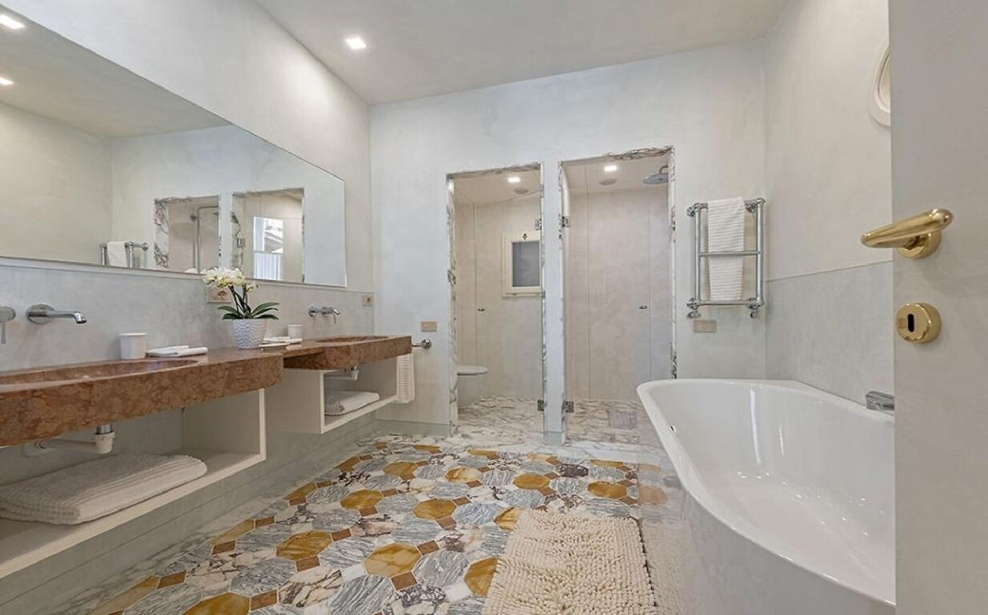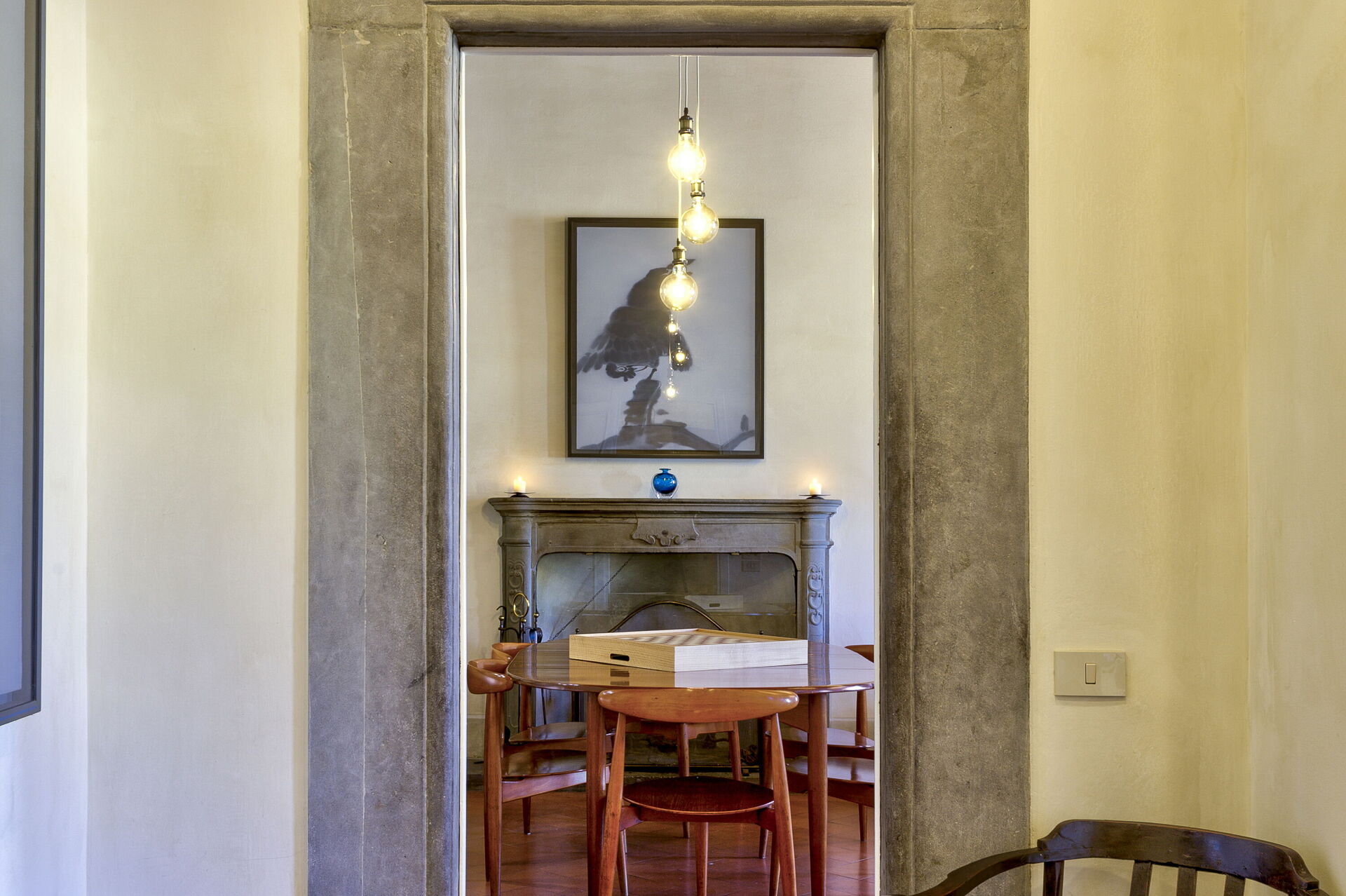 Apartment on a classic modern style level (136 sq.mt/ 1463 sq.ft). It can accommodate up to 6 people with 3 bedrooms and has 3 full bathrooms. As soon as you enter you will find the first entrance. On the left there is a small kitchen, with a dining table, a bedroom (160cm wide, not divisible) with TV and a large ensuite bathroom with ocher marble floor. Continuing from the first entrance, there is a second entrance which leads to the second part of the apartment. On the right is the first bedroom (160cm wide, not divisible), overlooking Piazza Santa Croce with double glazing glass wall to ensure a quiet environment at night. This room also has a walk-in closet and has its own bathroom with double sinks.