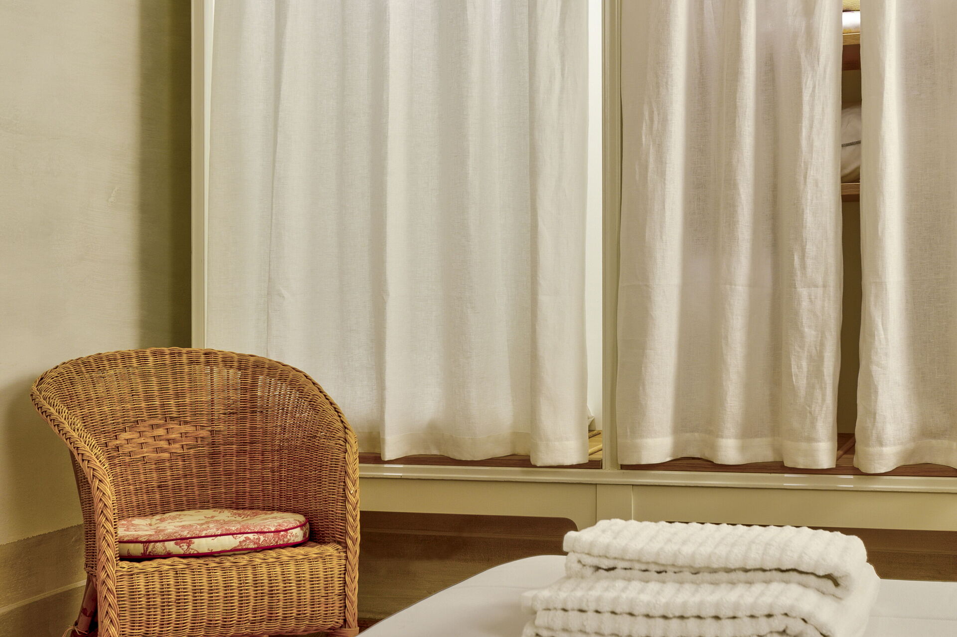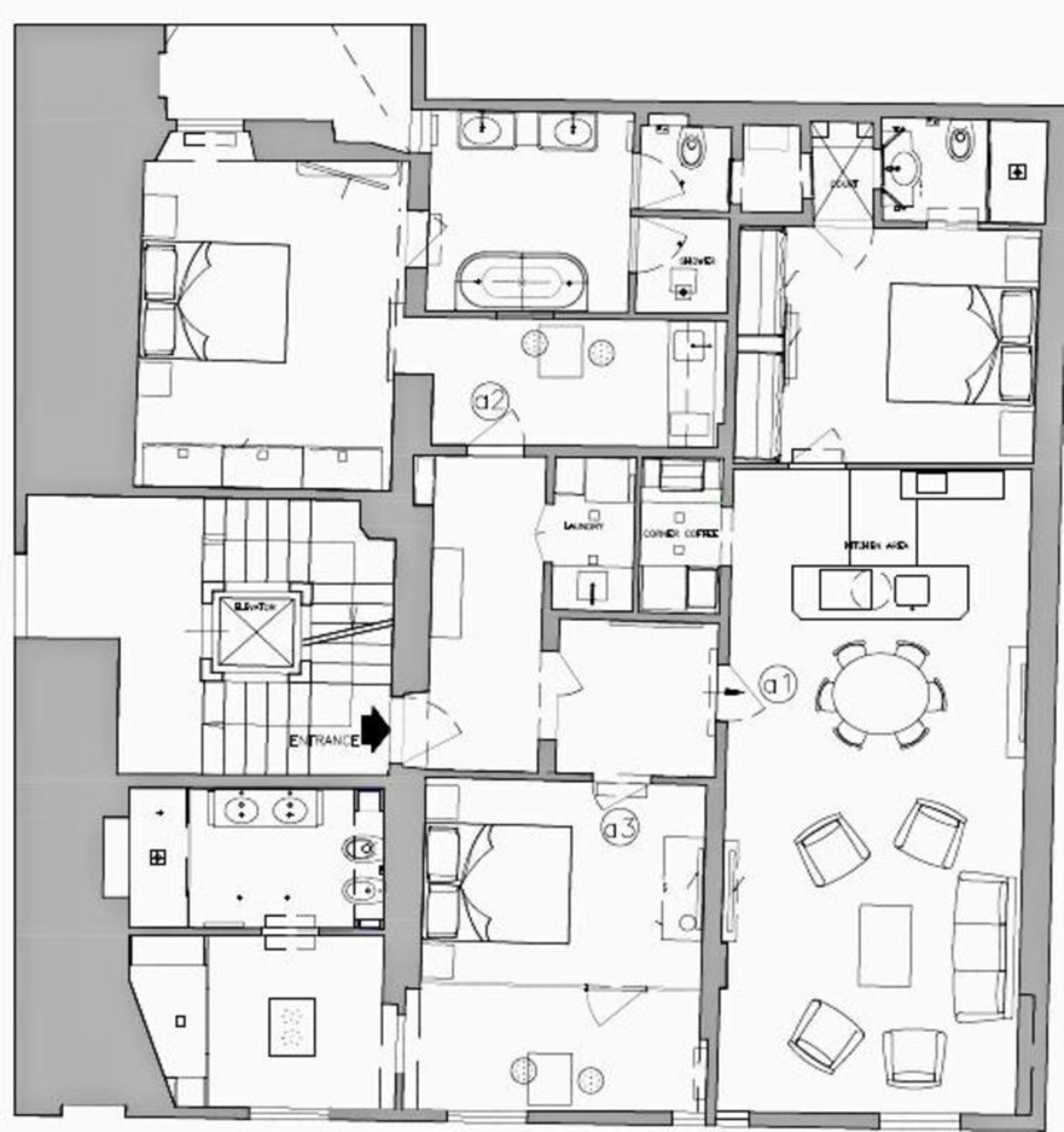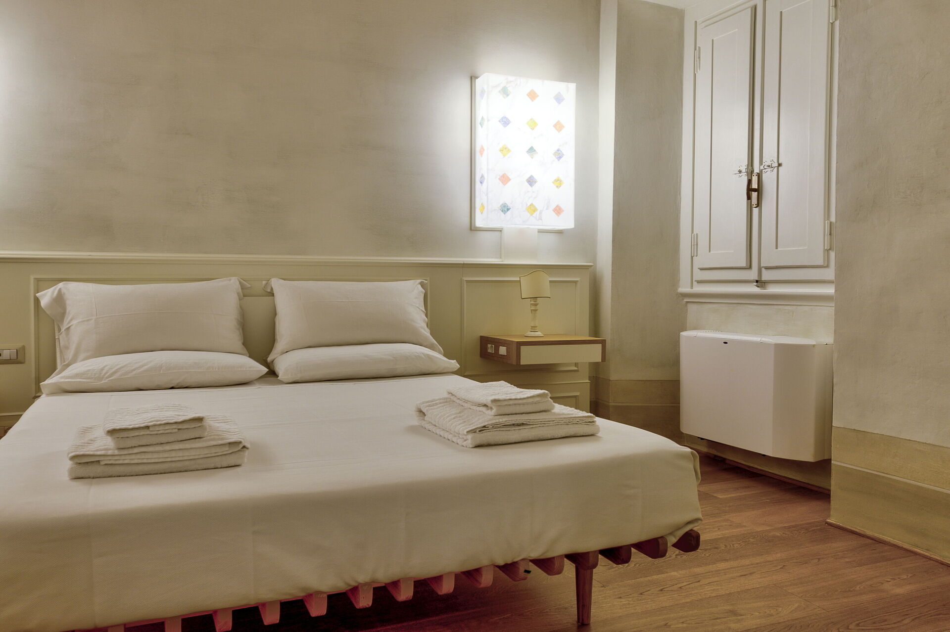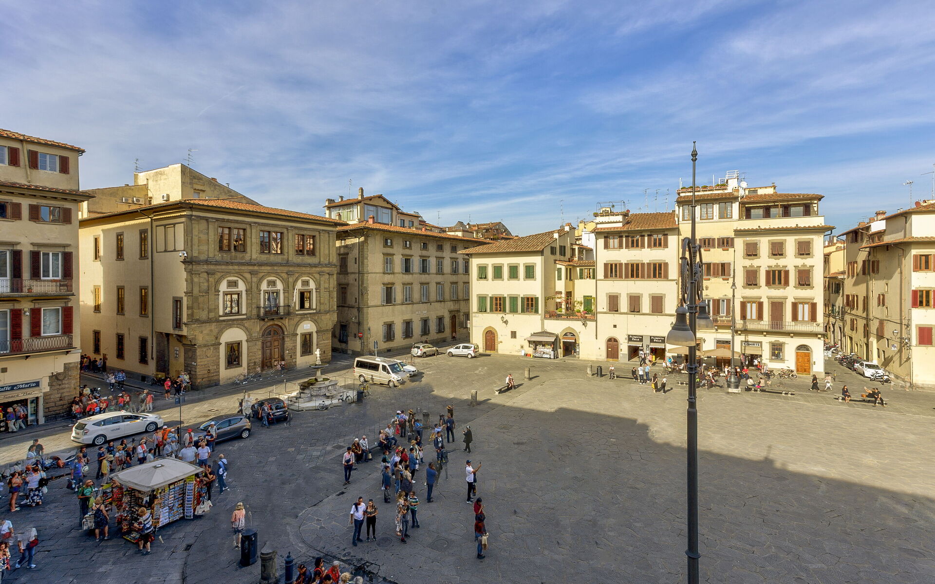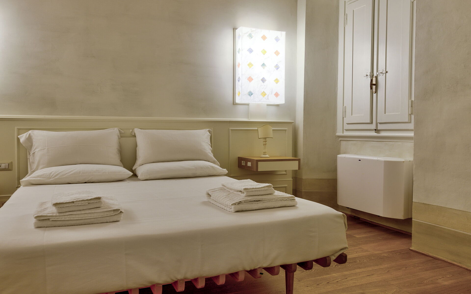 Apartment on a classic modern style level (136 sq.mt/ 1463 sq.ft). It can accommodate up to 6 people with 3 bedrooms and has 3 full bathrooms. As soon as you enter you will find the first entrance. On the left there is a small kitchen, with a dining table, a bedroom (160cm wide, not divisible) with TV and a large ensuite bathroom with ocher marble floor. Continuing from the first entrance, there is a second entrance which leads to the second part of the apartment. On the right is the first bedroom (160cm wide, not divisible), overlooking Piazza Santa Croce with double glazing glass wall to ensure a quiet environment at night. This room also has a walk-in closet and has its own bathroom with double sinks.