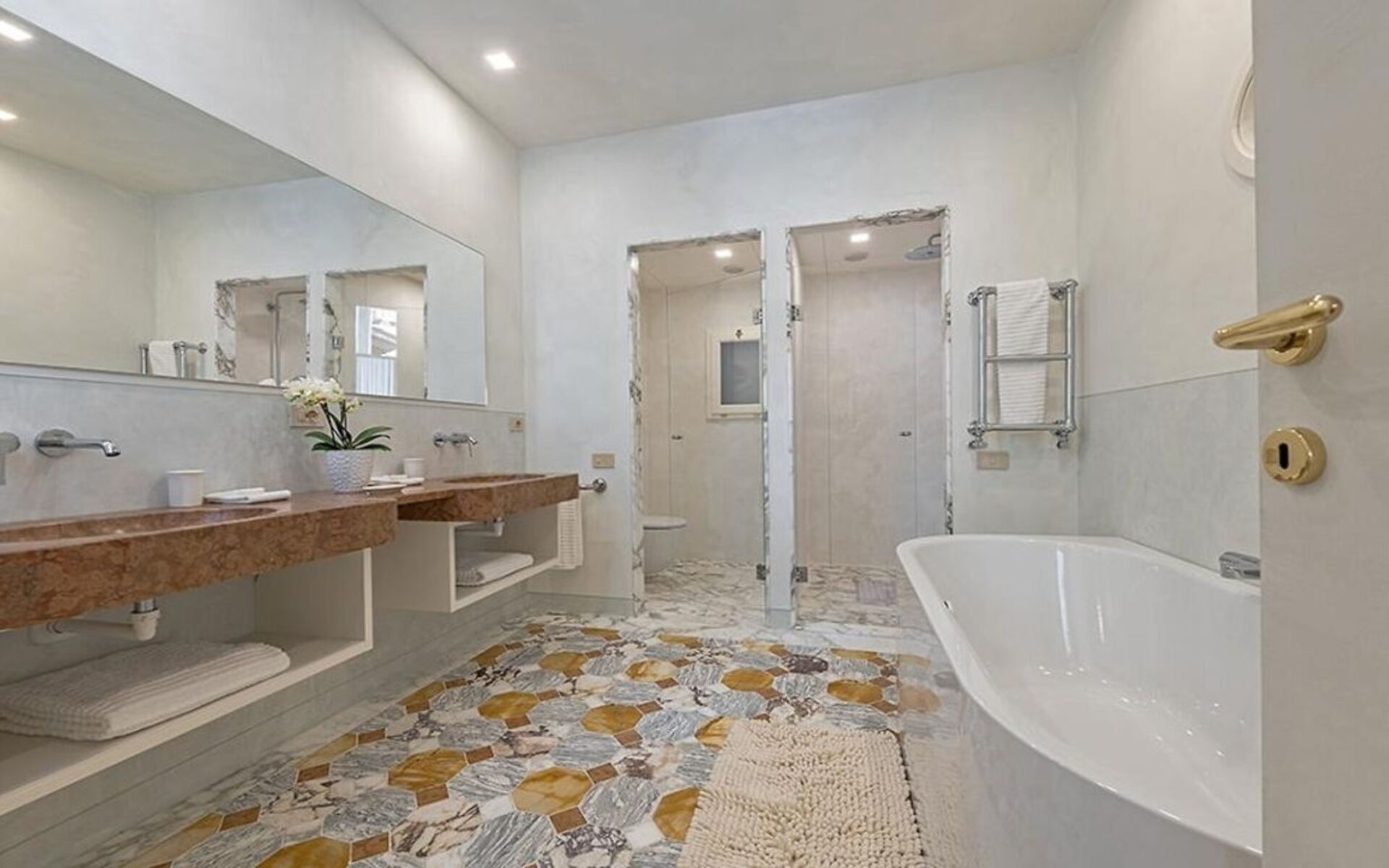Going back to the second entrance, if you go ahead, there is the large modern living area, but at the same time embellished with wonderful original antique frescoes. Here is a very well-equipped kitchen area with central island. Finally, the living room leads to the third bedroom (160cm wide, not divisible) also with its own ensuite bathroom.