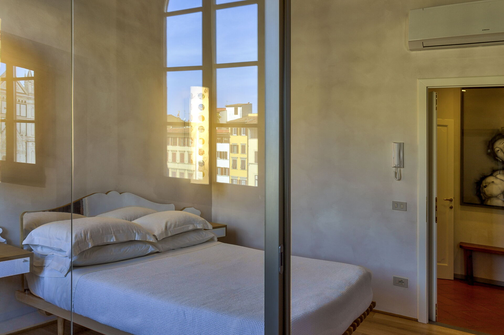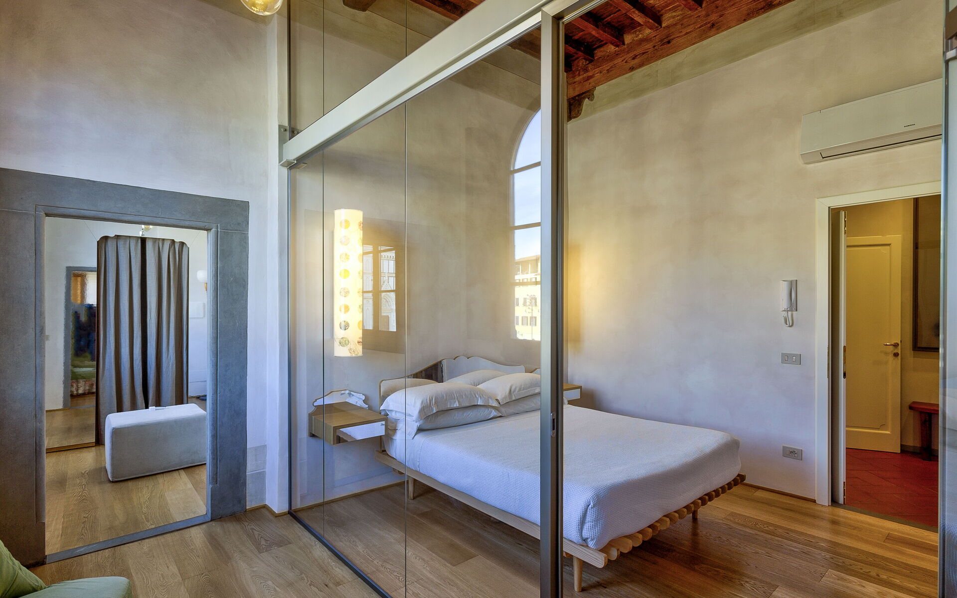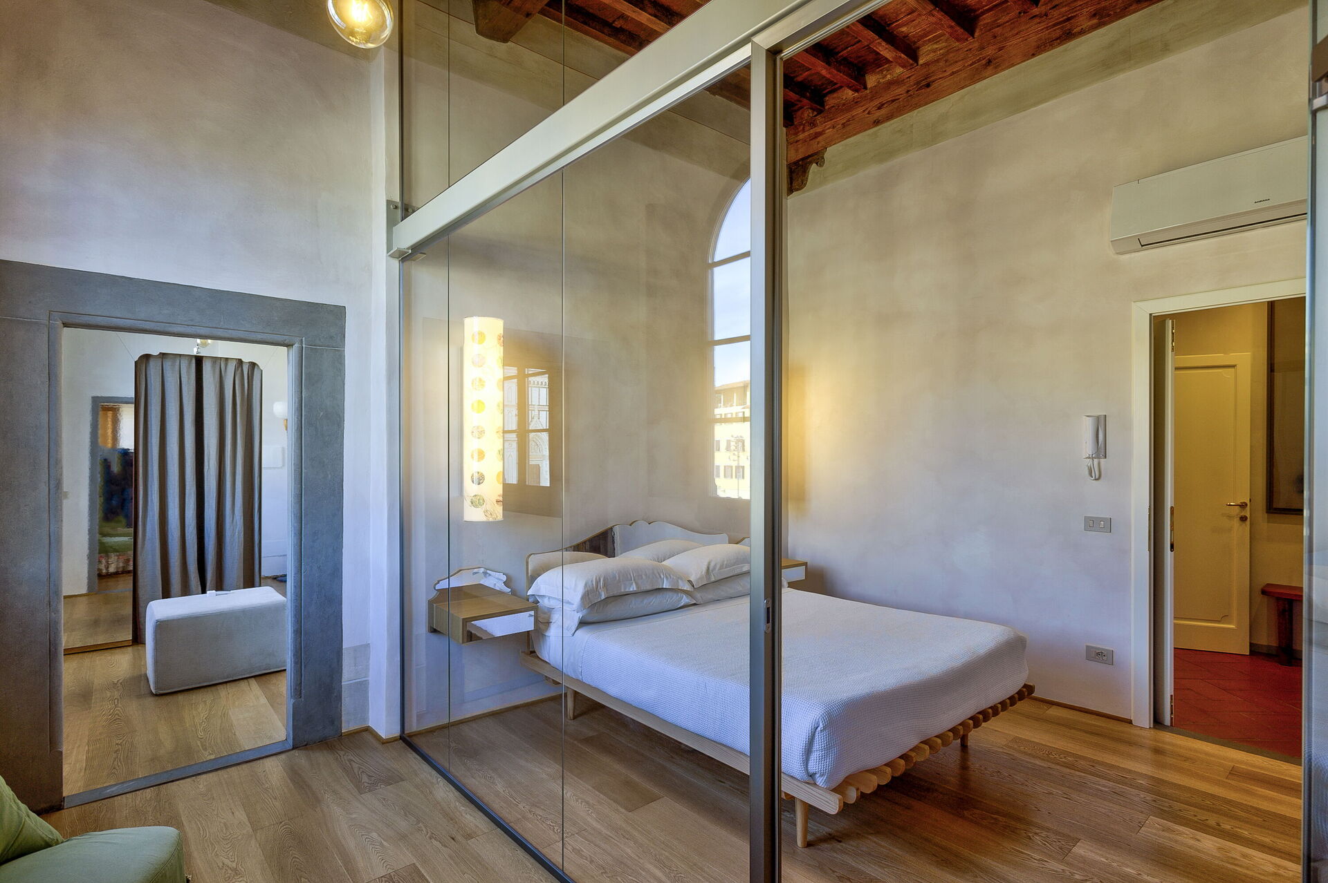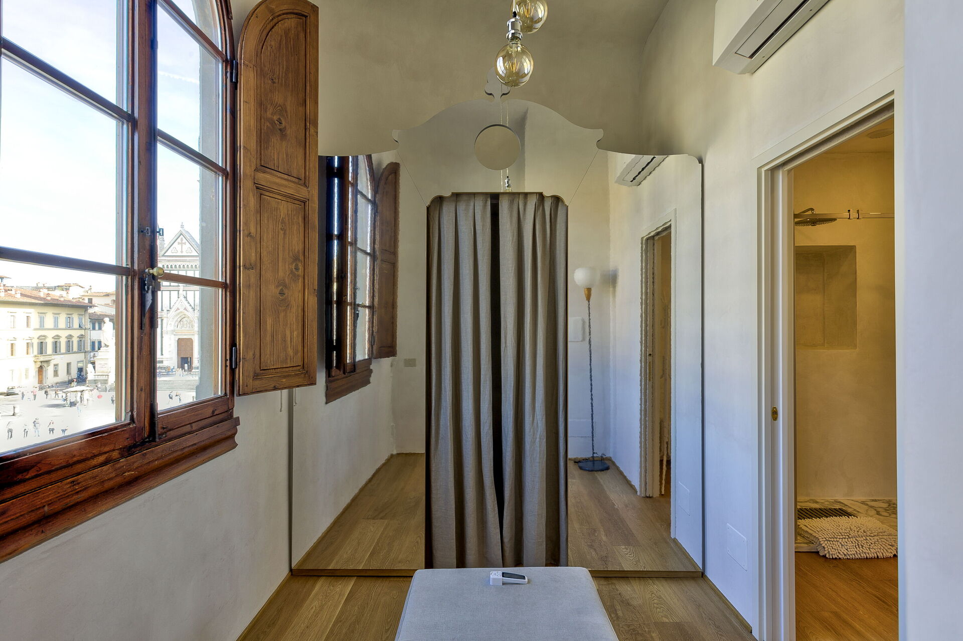Following, is one bedroom (160cm wide, not divisible), overlooking Piazza Santa Croce with double glazing glass wall to ensure a quiet environment at night. This room also has a walk-in closet and has its own bathroom with double sinks.