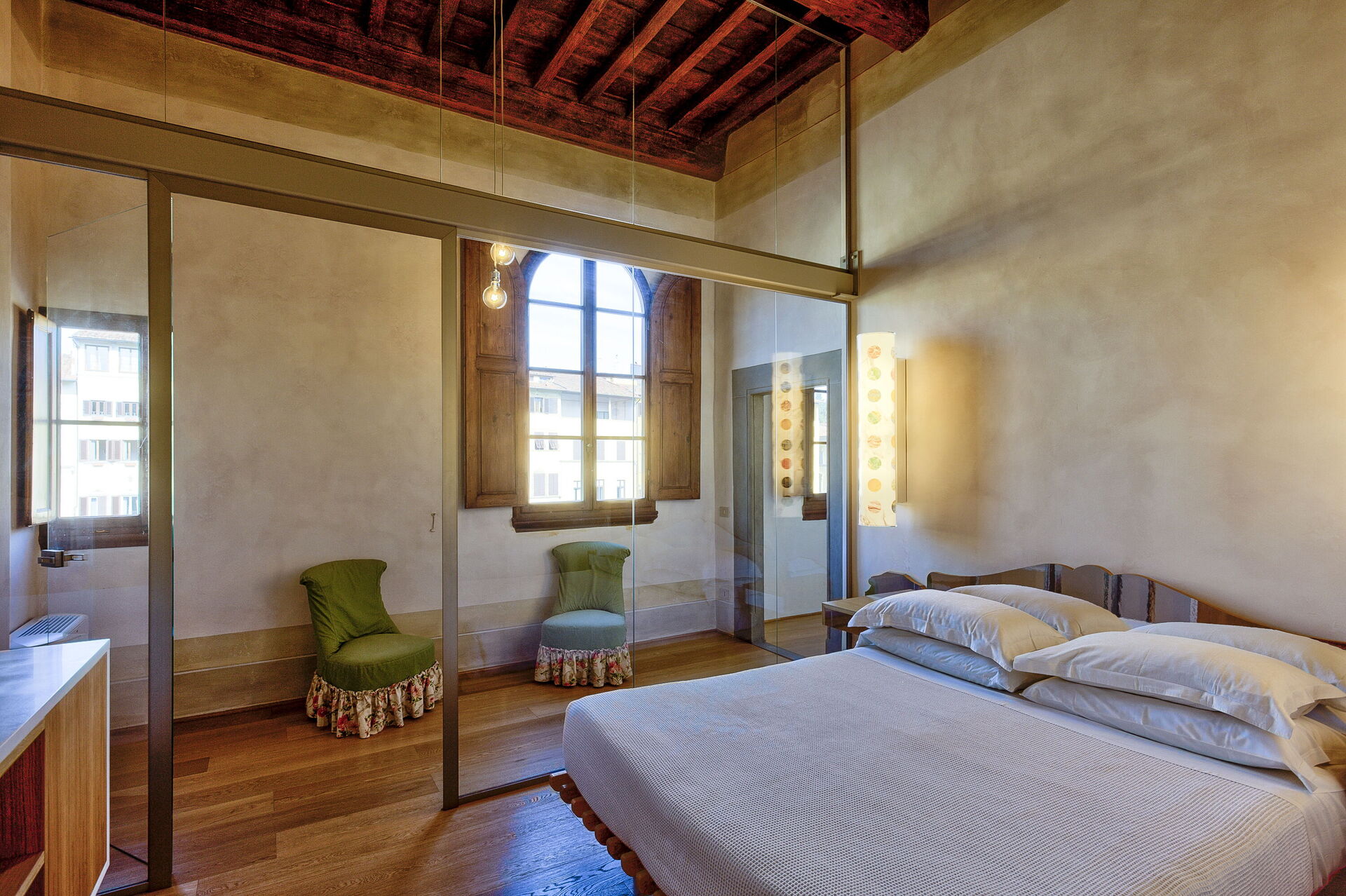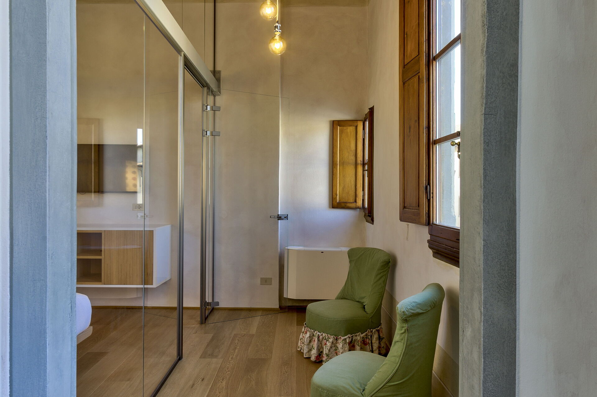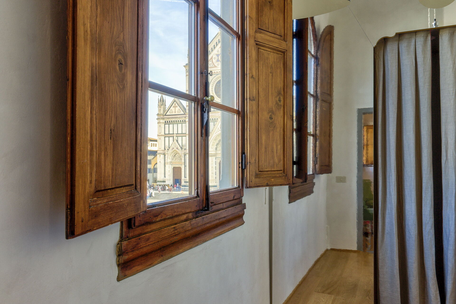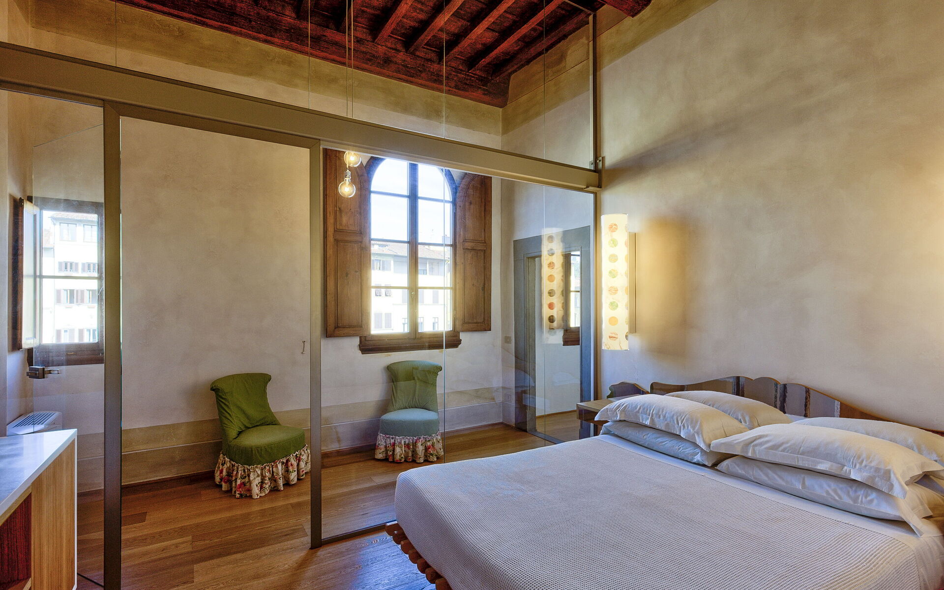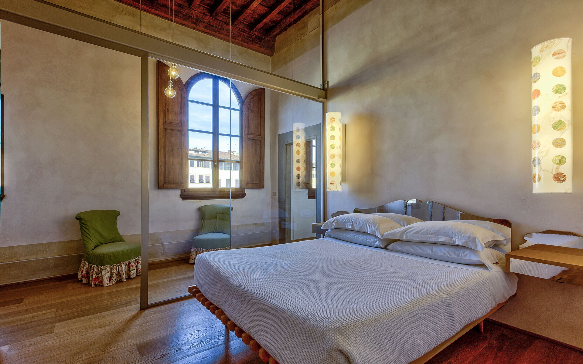 Following, is one bedroom (160cm wide, not divisible), overlooking Piazza Santa Croce with double glazing glass wall to ensure a quiet environment at night. This room also has a walk-in closet and has its own bathroom with double sinks.