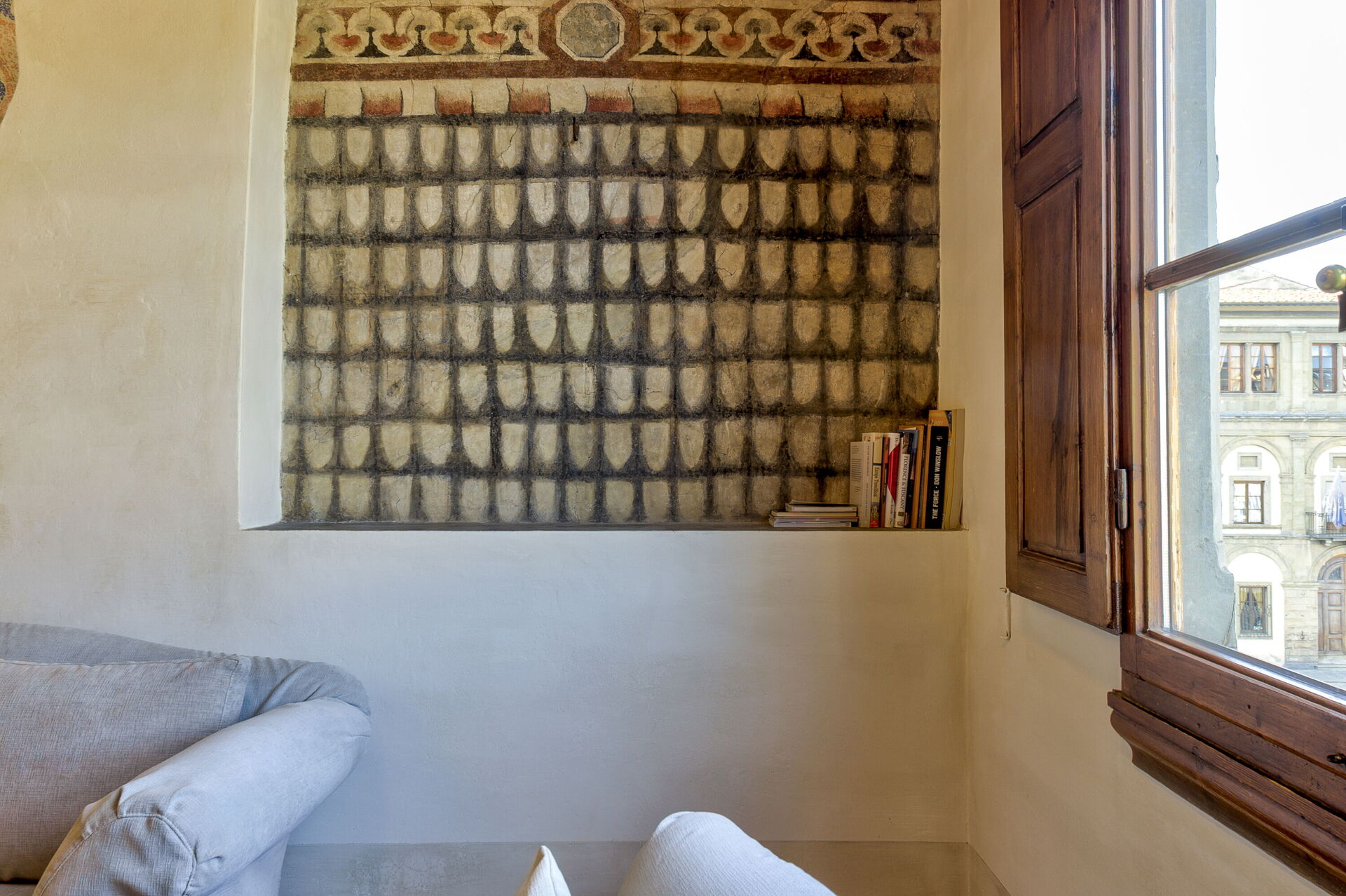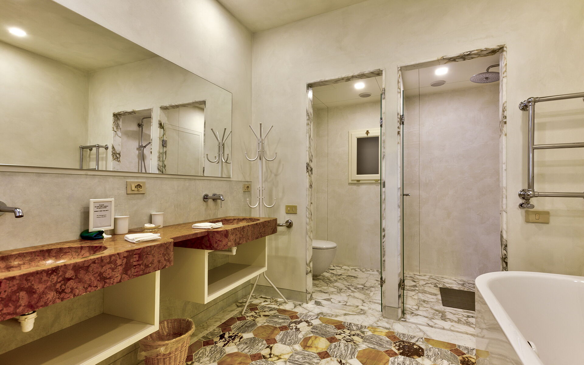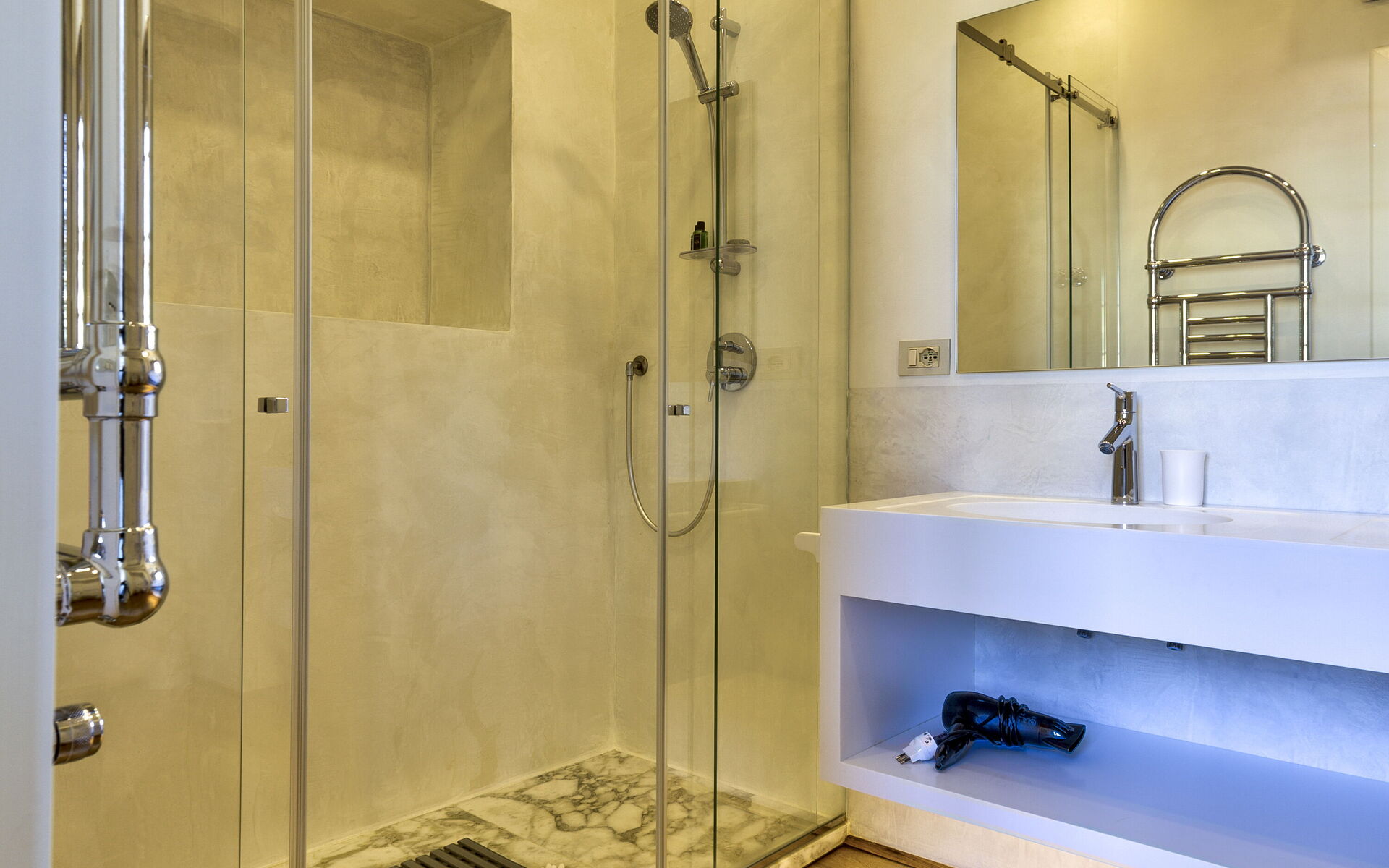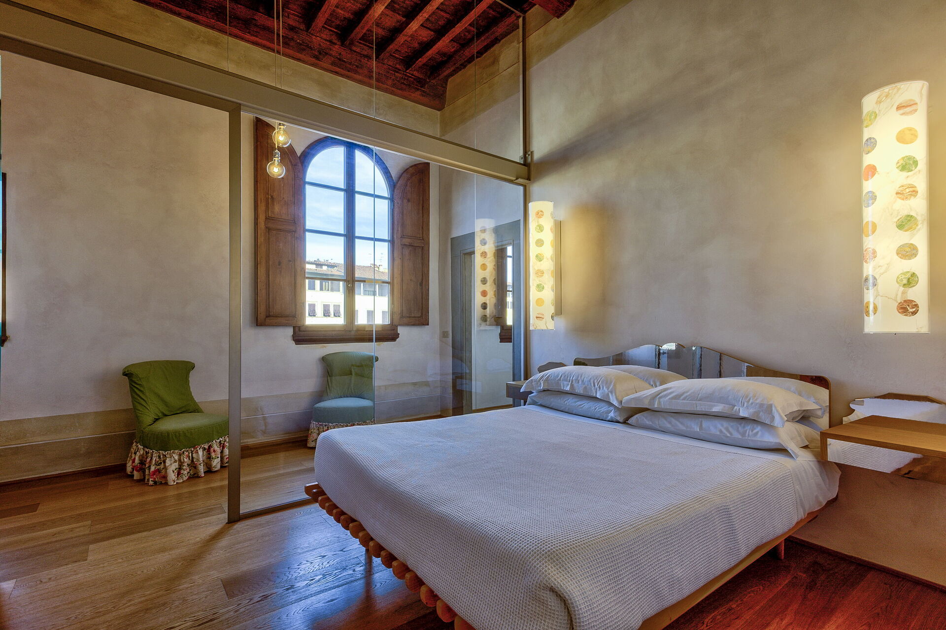 Following, is one bedroom (160cm wide, not divisible), overlooking Piazza Santa Croce with double glazing glass wall to ensure a quiet environment at night. This room also has a walk-in closet and has its own bathroom with double sinks.