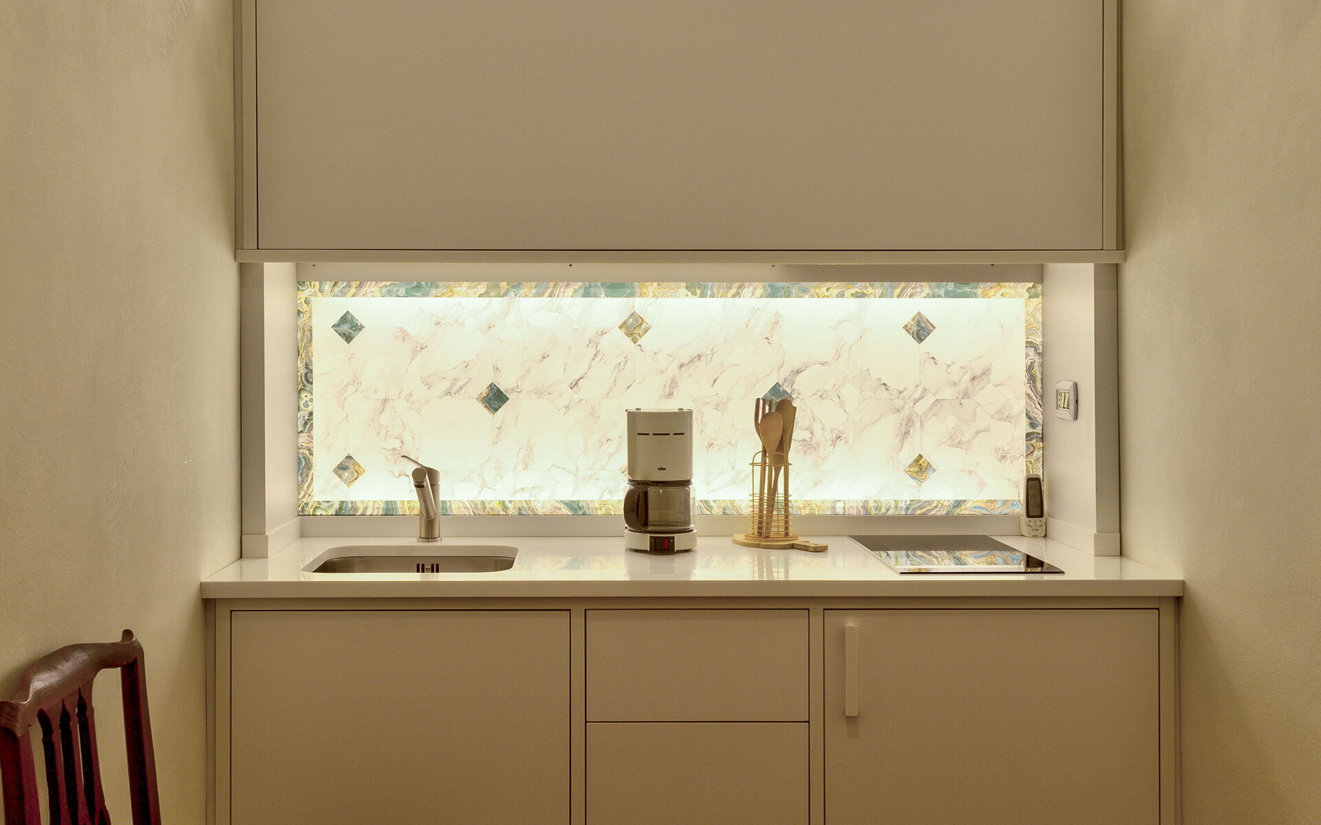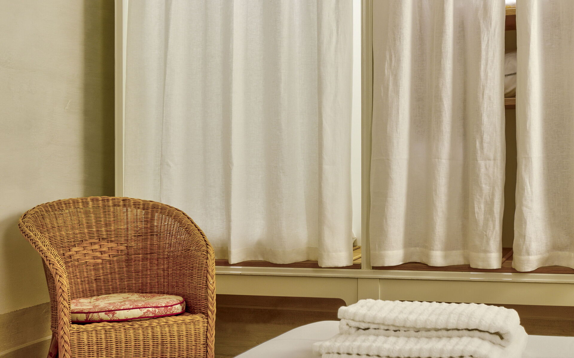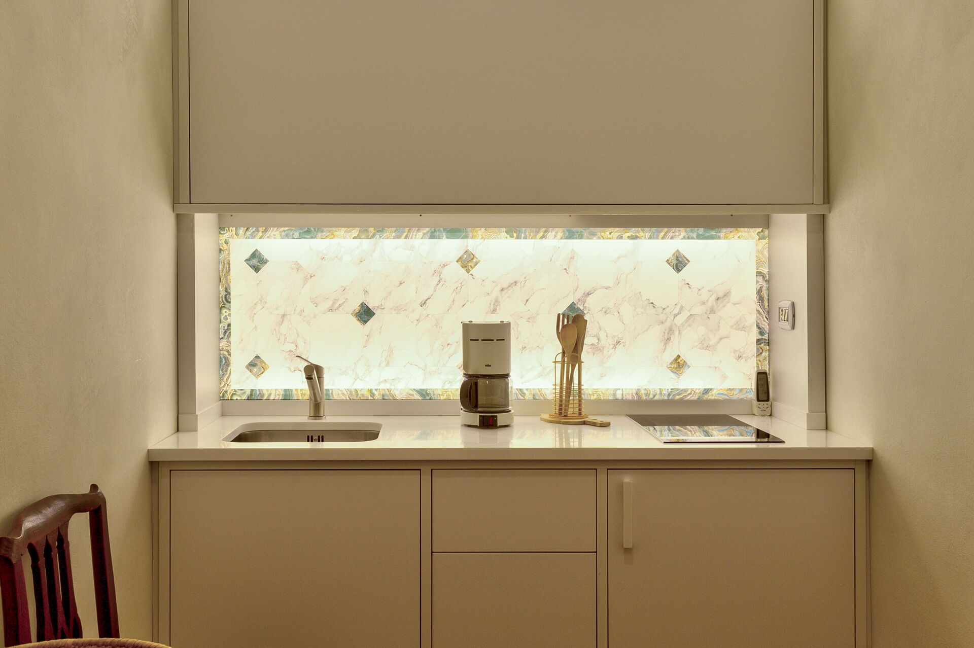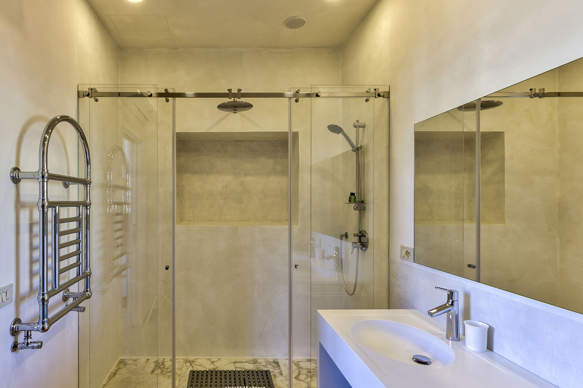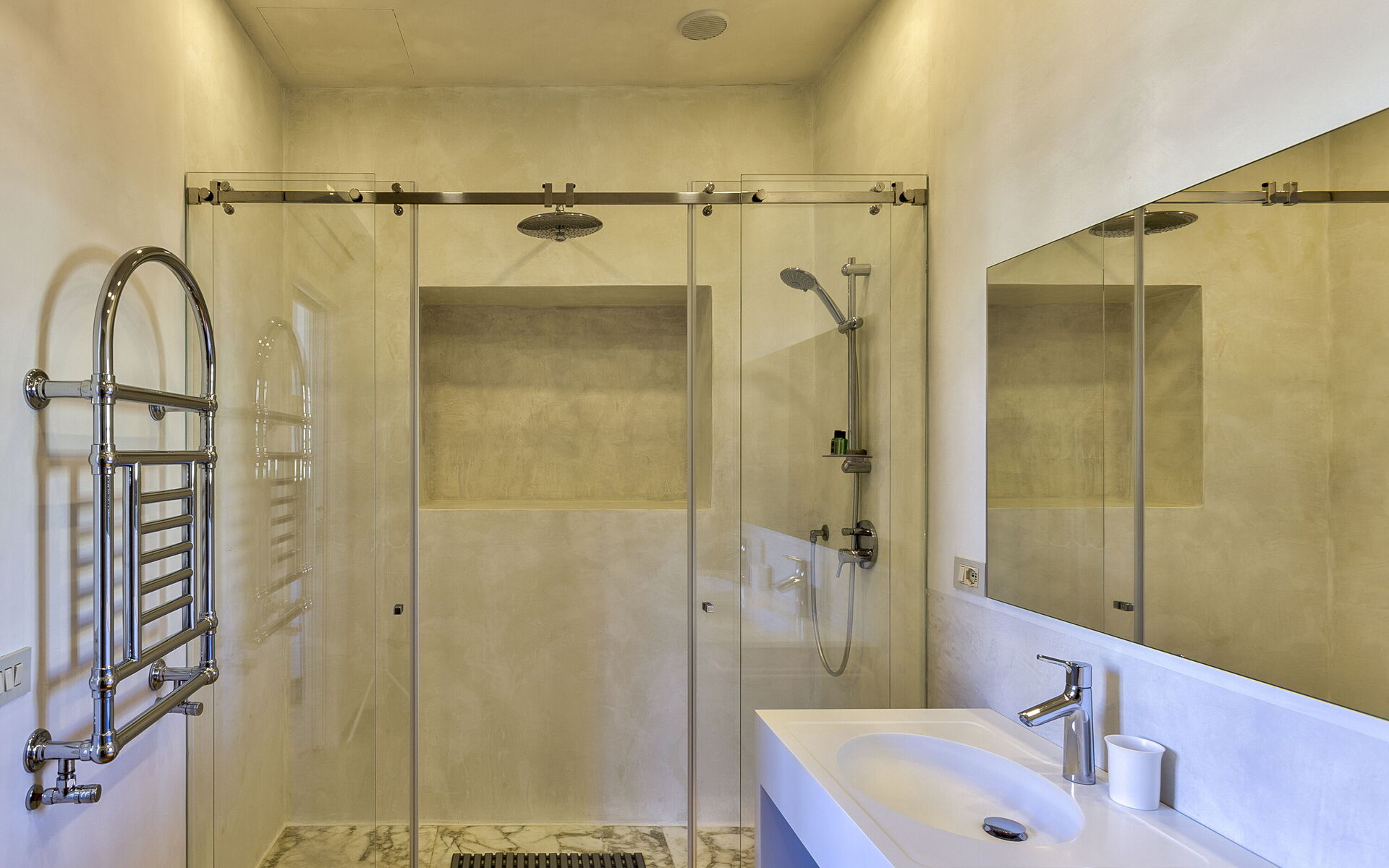Following, is one bedroom (160cm wide, not divisible), overlooking Piazza Santa Croce with double glazing glass wall to ensure a quiet environment at night. This room also has a walk-in closet and has its own bathroom with double sinks.