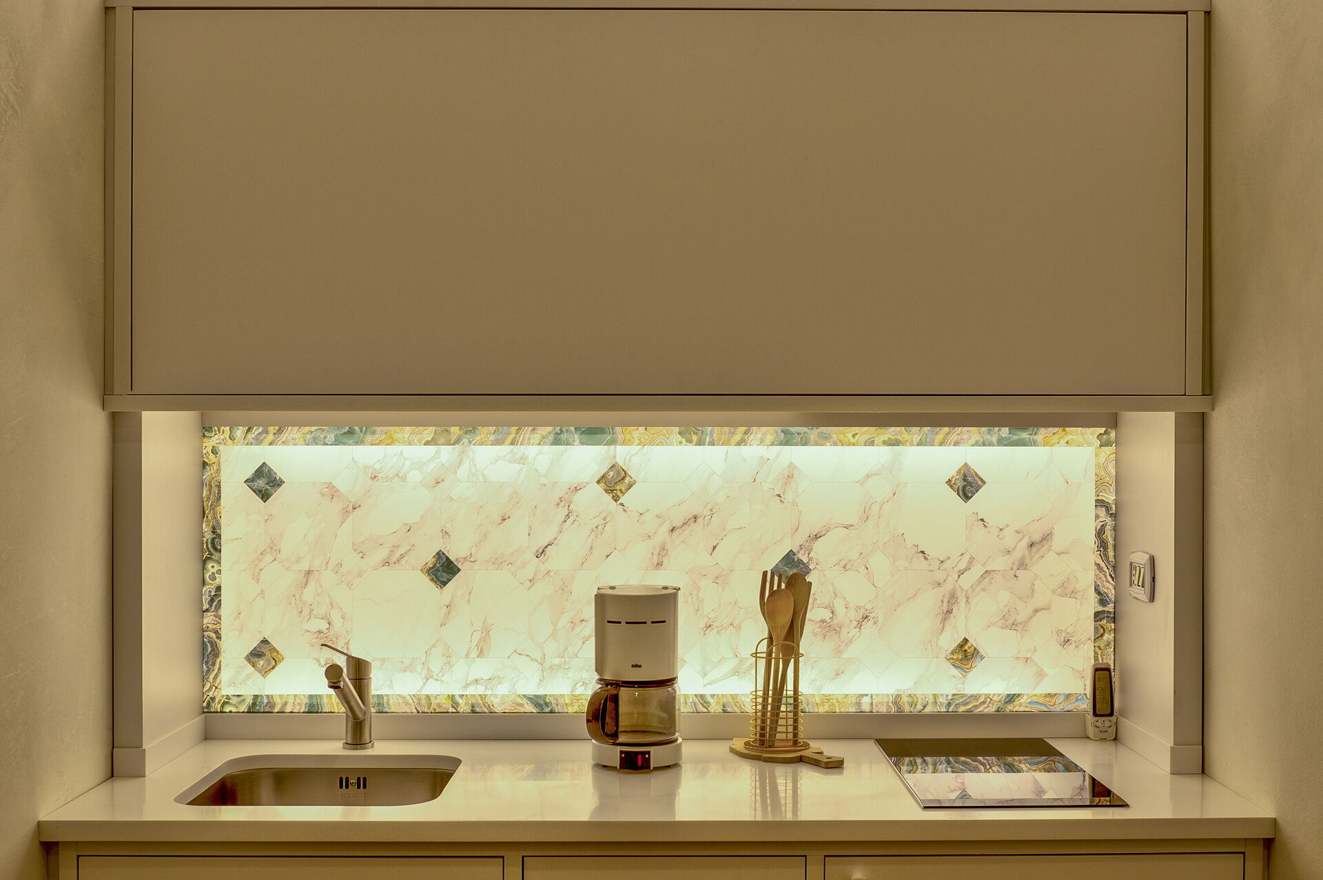 As soon as you enter you will find the first entrance. On the left there is a small kitchen, with a dining table. Continuing from the first entrance, there is a second entrance which leads to the second part of the apartment.