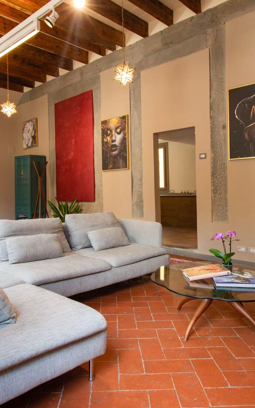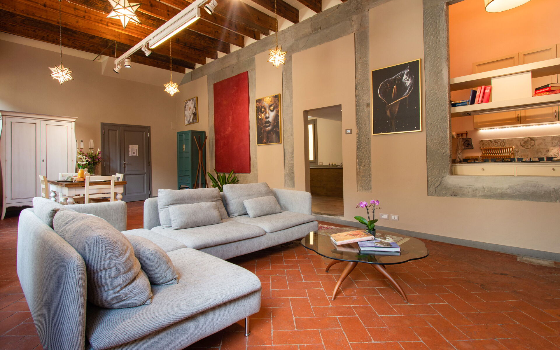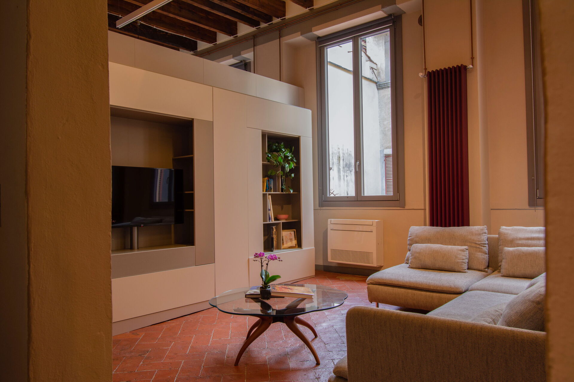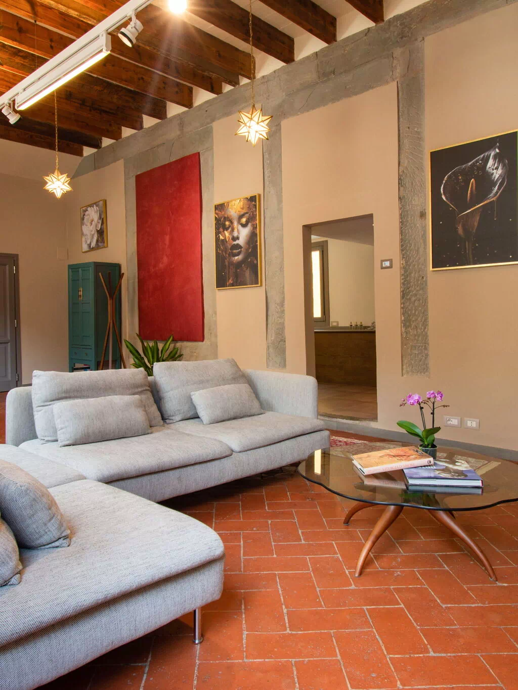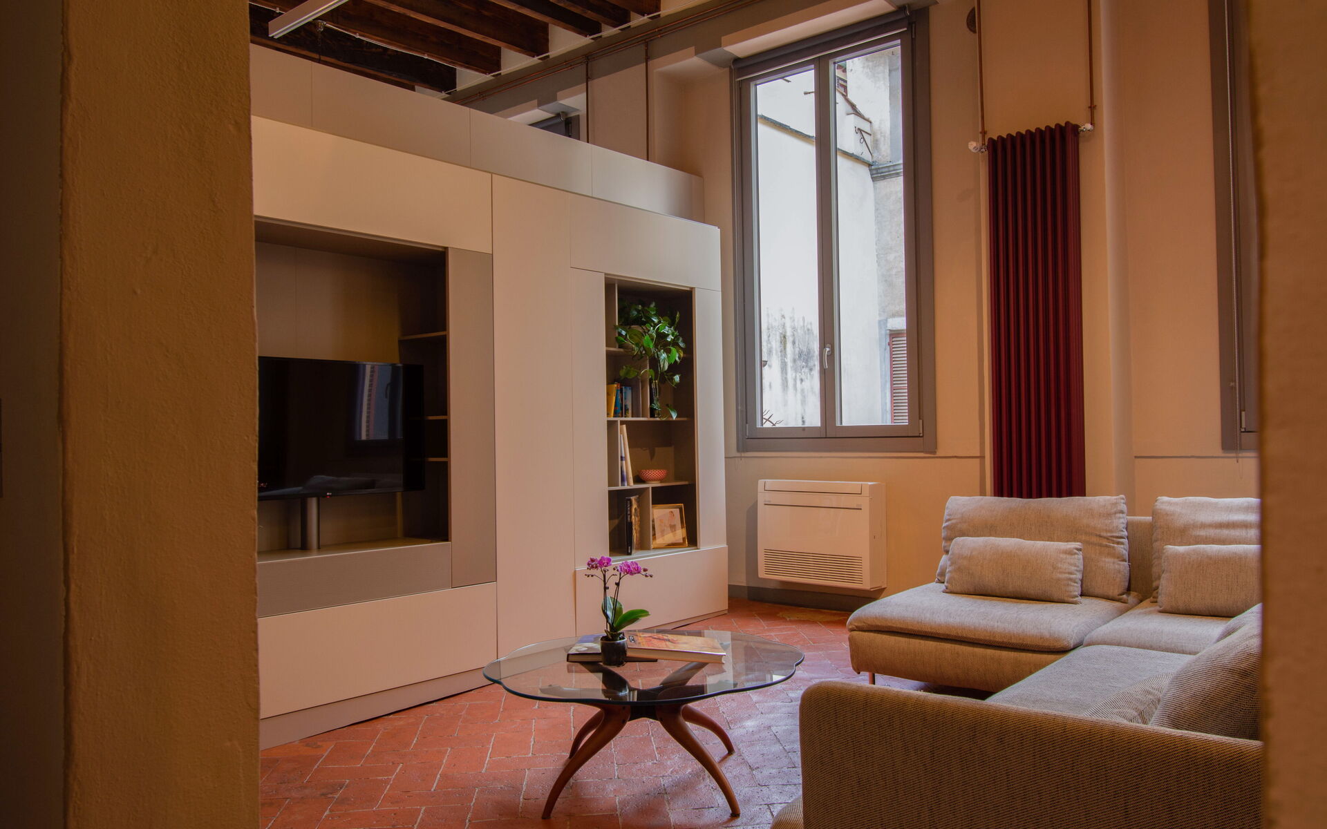 Når man træder ind, bliver gæsterne budt velkommen i en lys stue indrettet med raffinerede, moderne møbler, bløde sofaer og et stort fladskærms-tv – perfekt til at slappe af efter en dag blandt Firenzes tidløse vidundere.