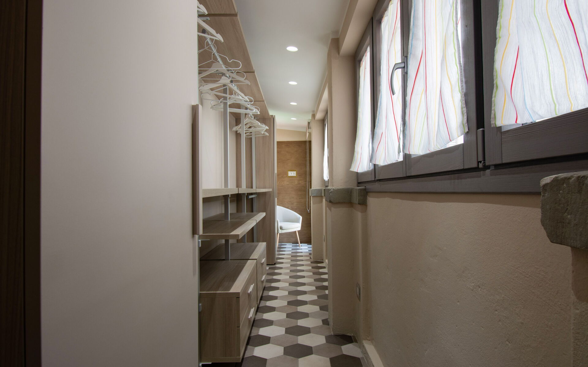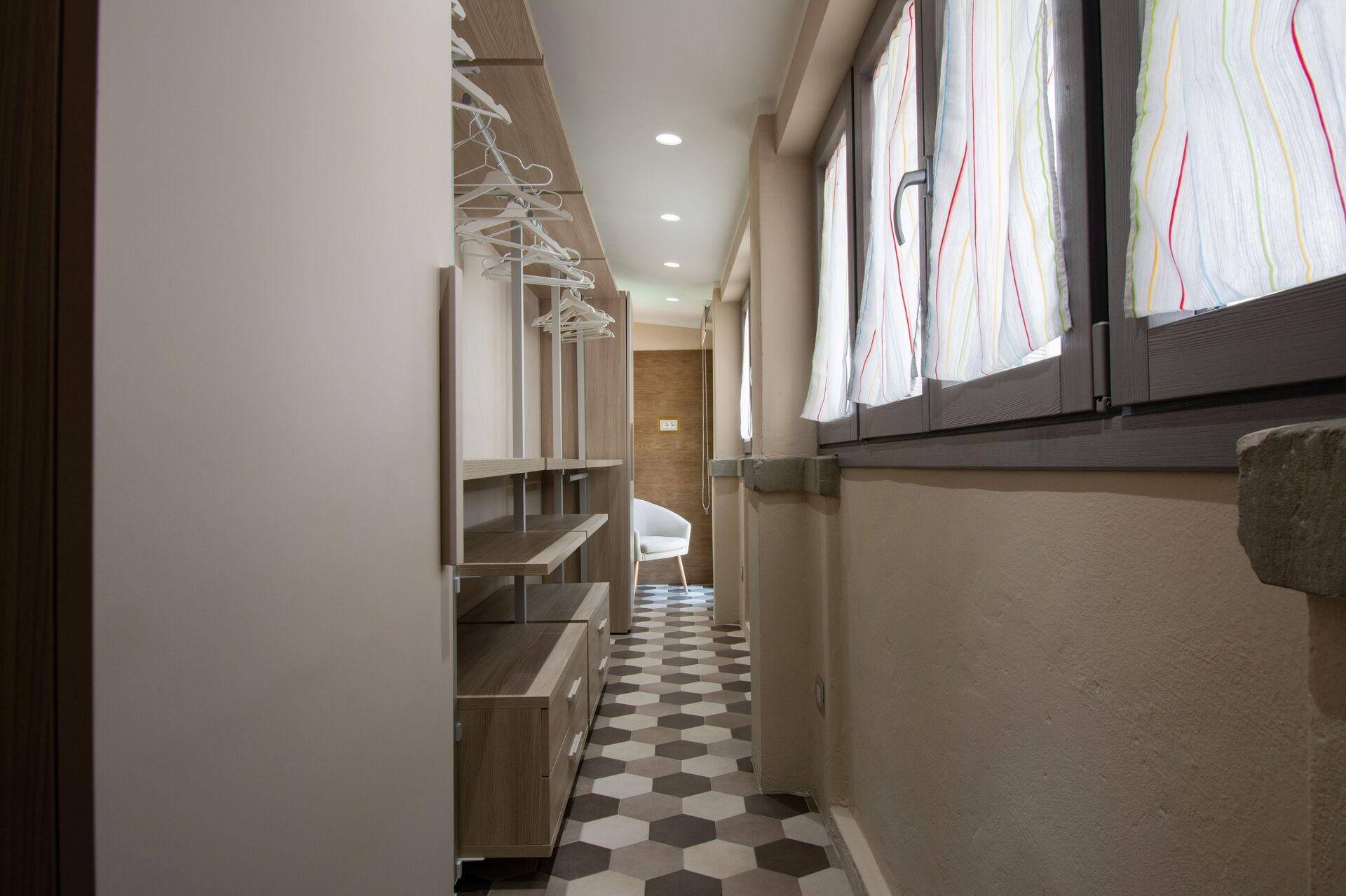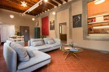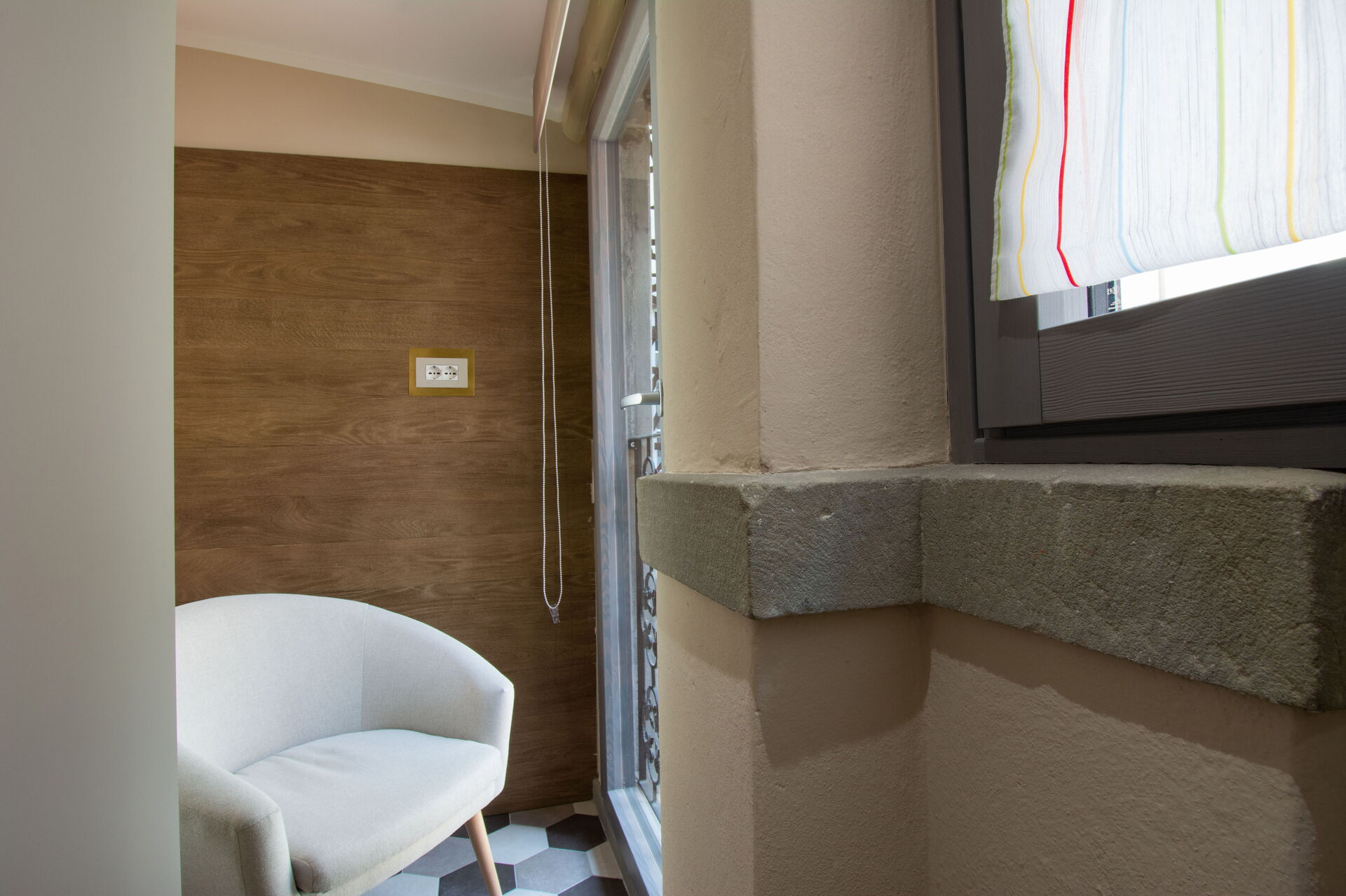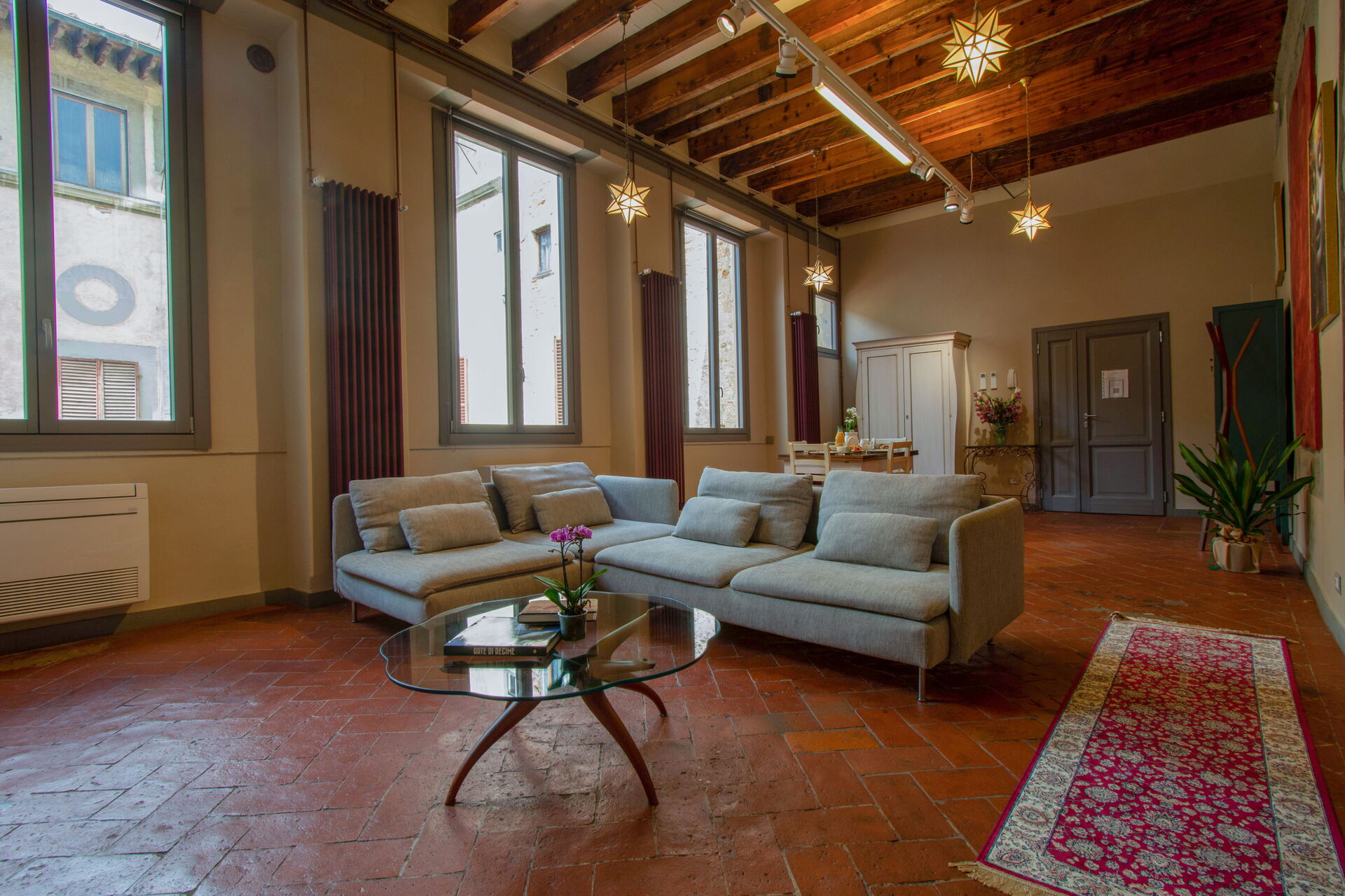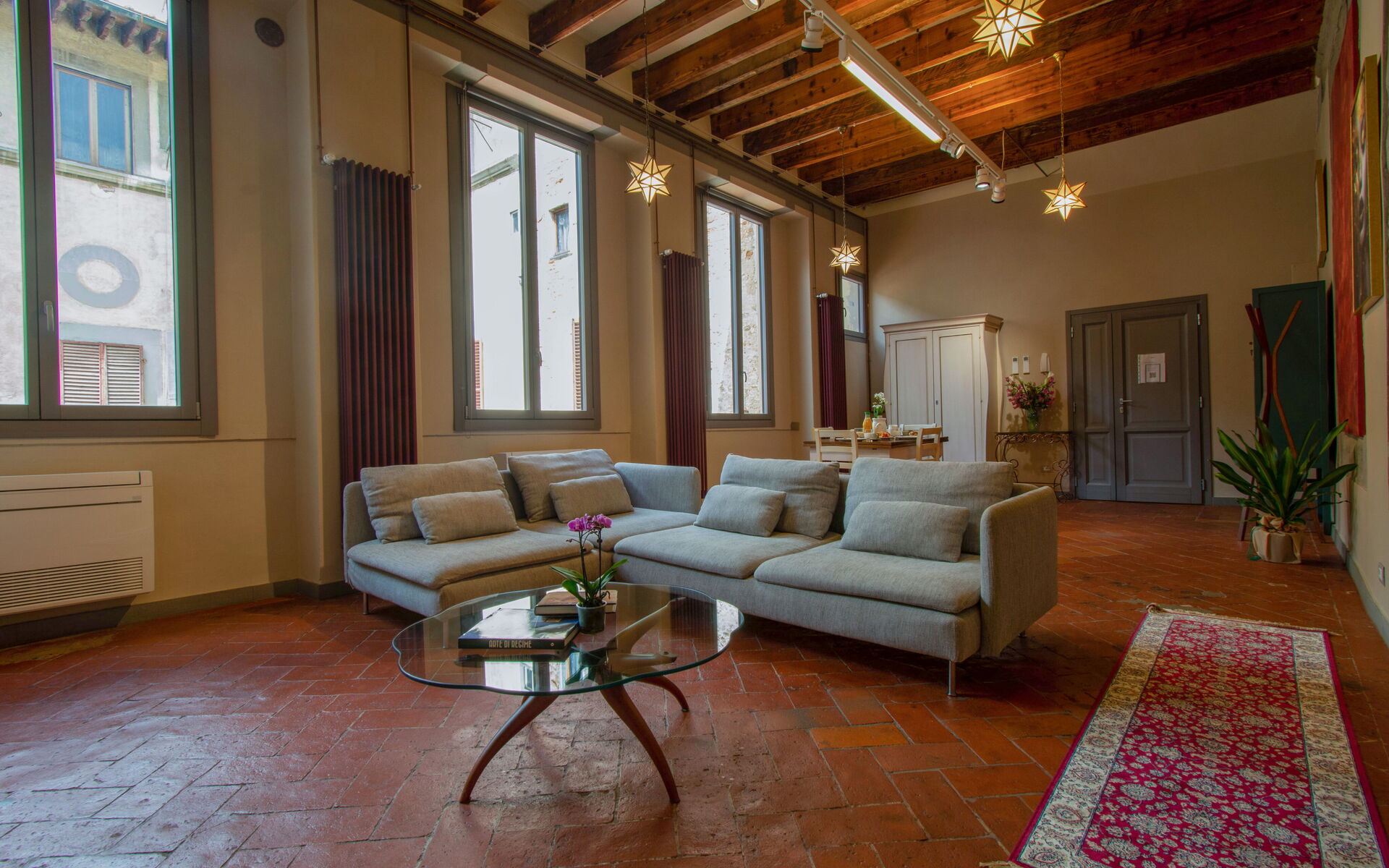 Når man træder ind, bliver gæsterne budt velkommen i en lys stue indrettet med raffinerede, moderne møbler, bløde sofaer og et stort fladskærms-tv – perfekt til at slappe af efter en dag blandt Firenzes tidløse vidundere.
