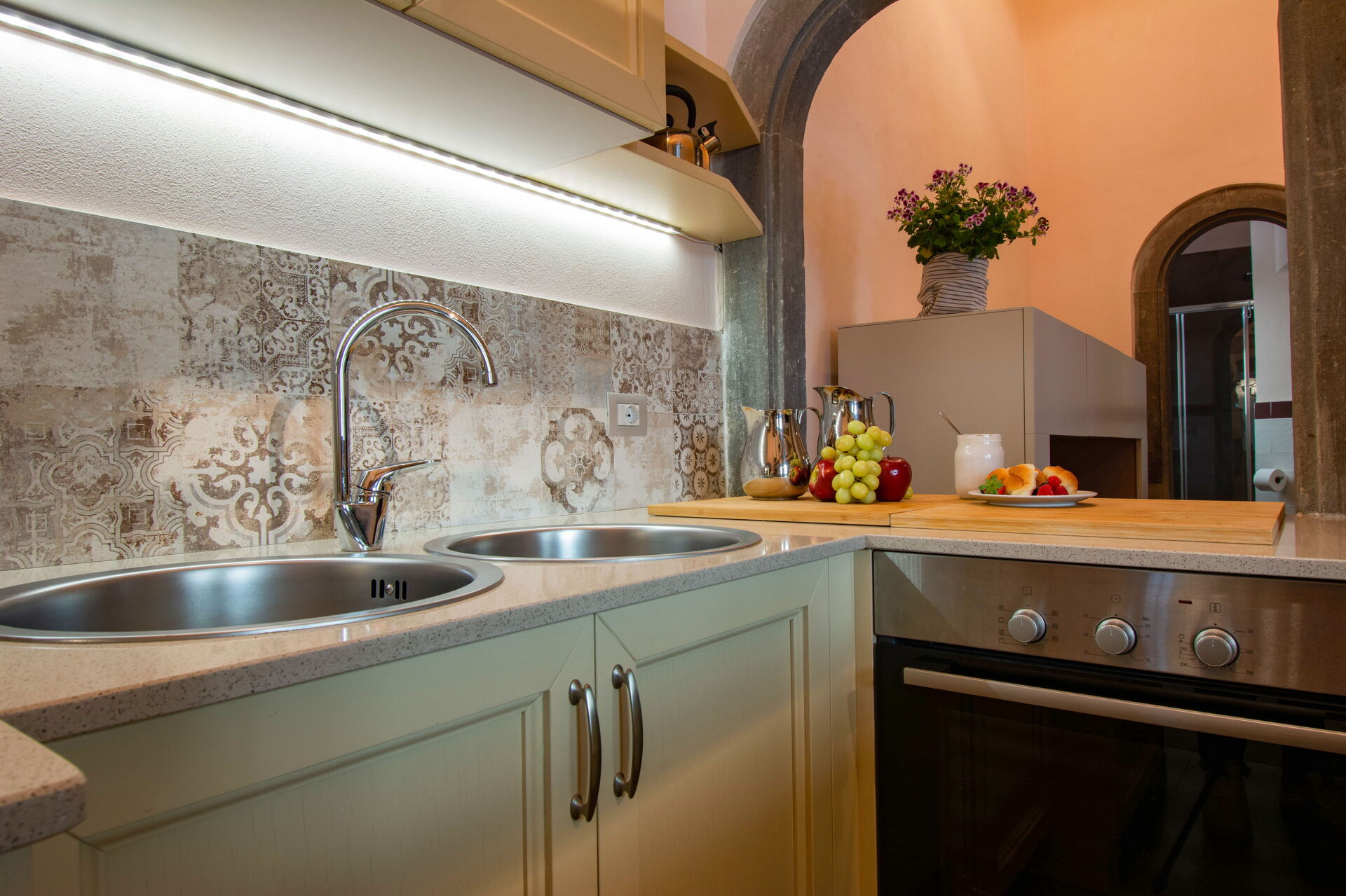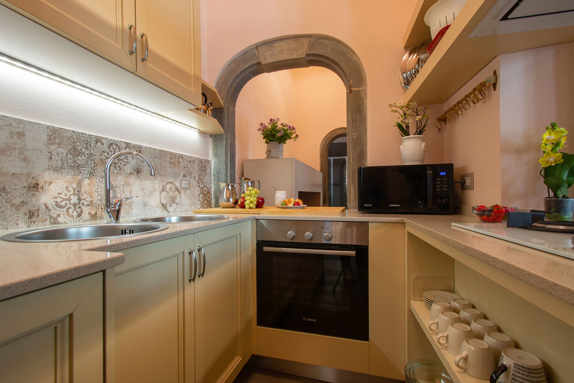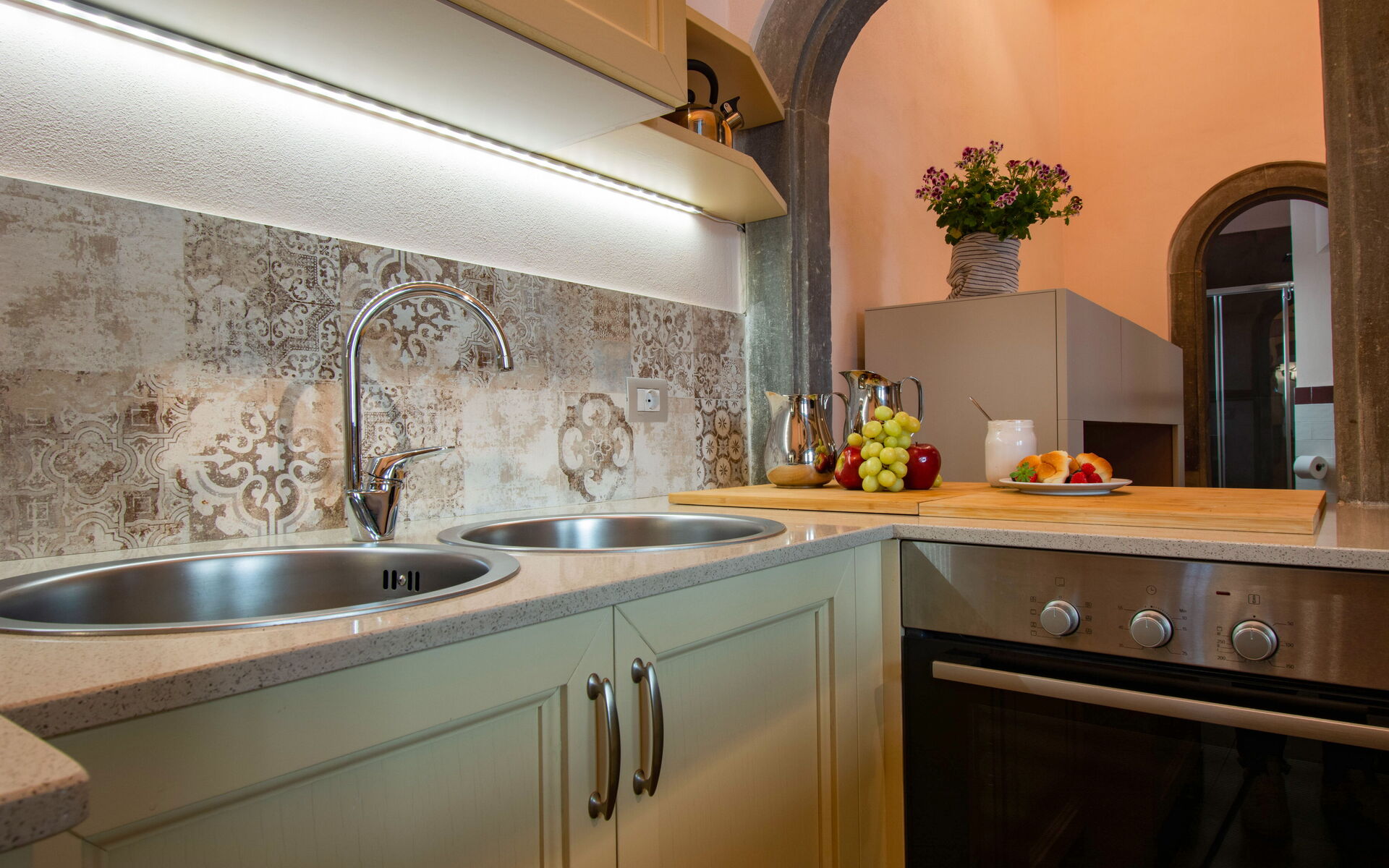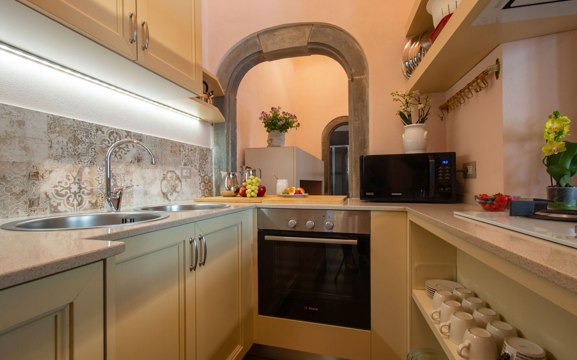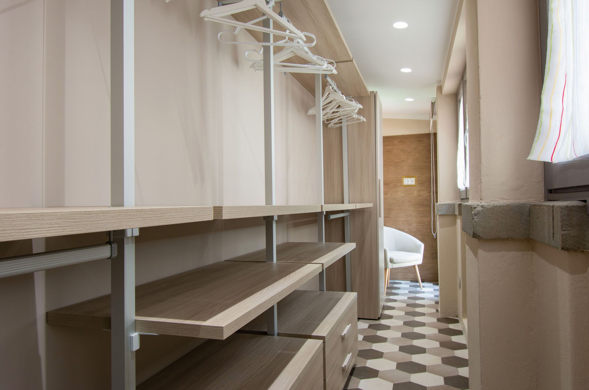 Når man træder ind, bliver gæsterne budt velkommen i en lys stue indrettet med raffinerede, moderne møbler, bløde sofaer og et stort fladskærms-tv – perfekt til at slappe af efter en dag blandt Firenzes tidløse vidundere.