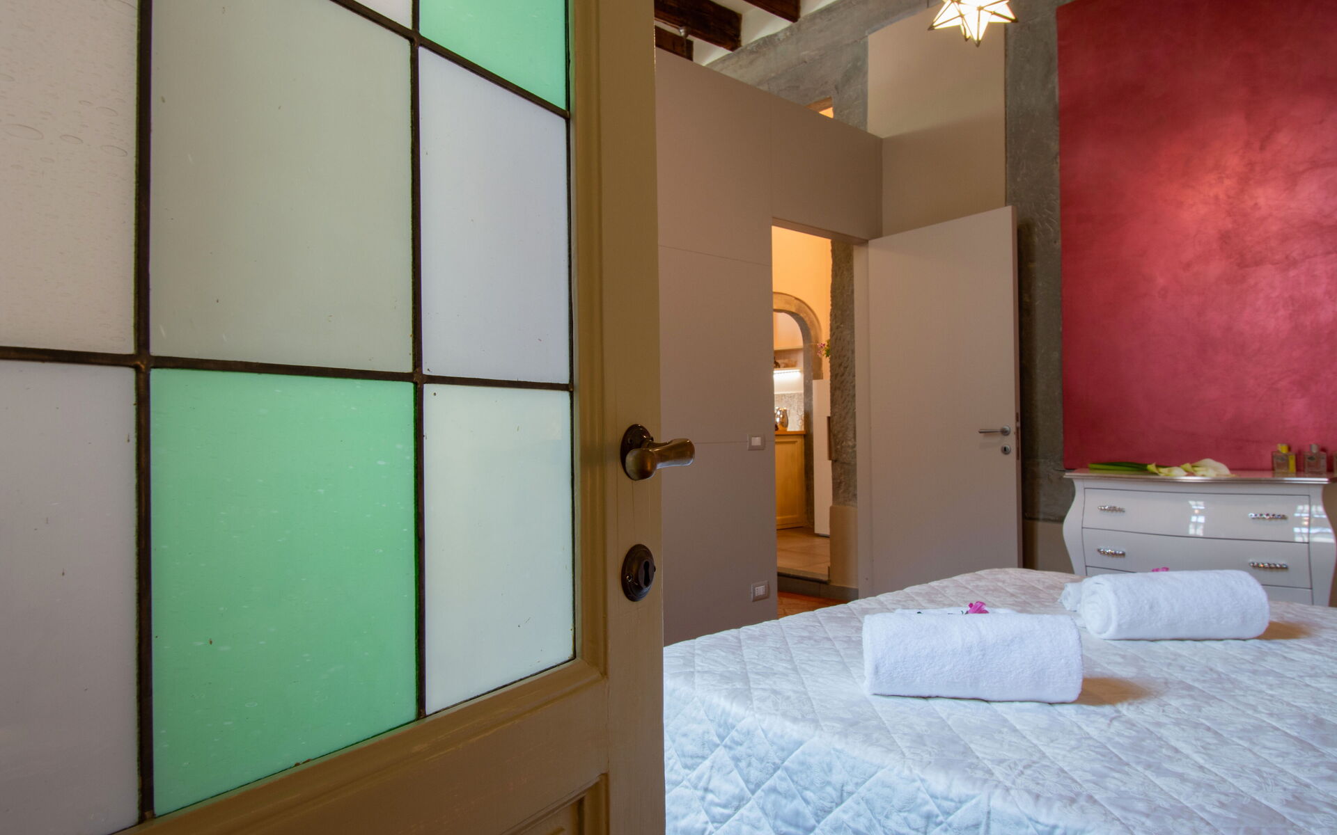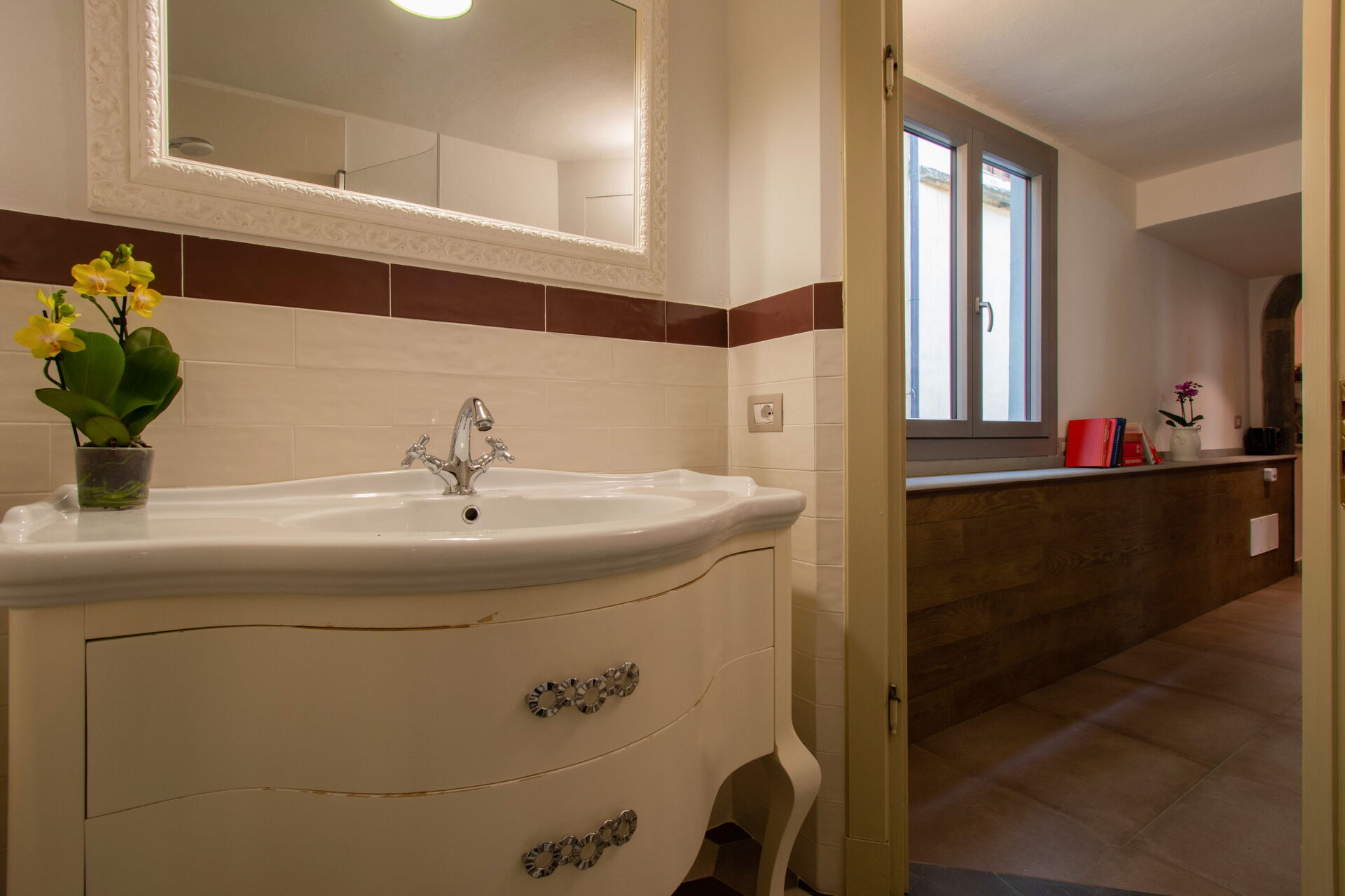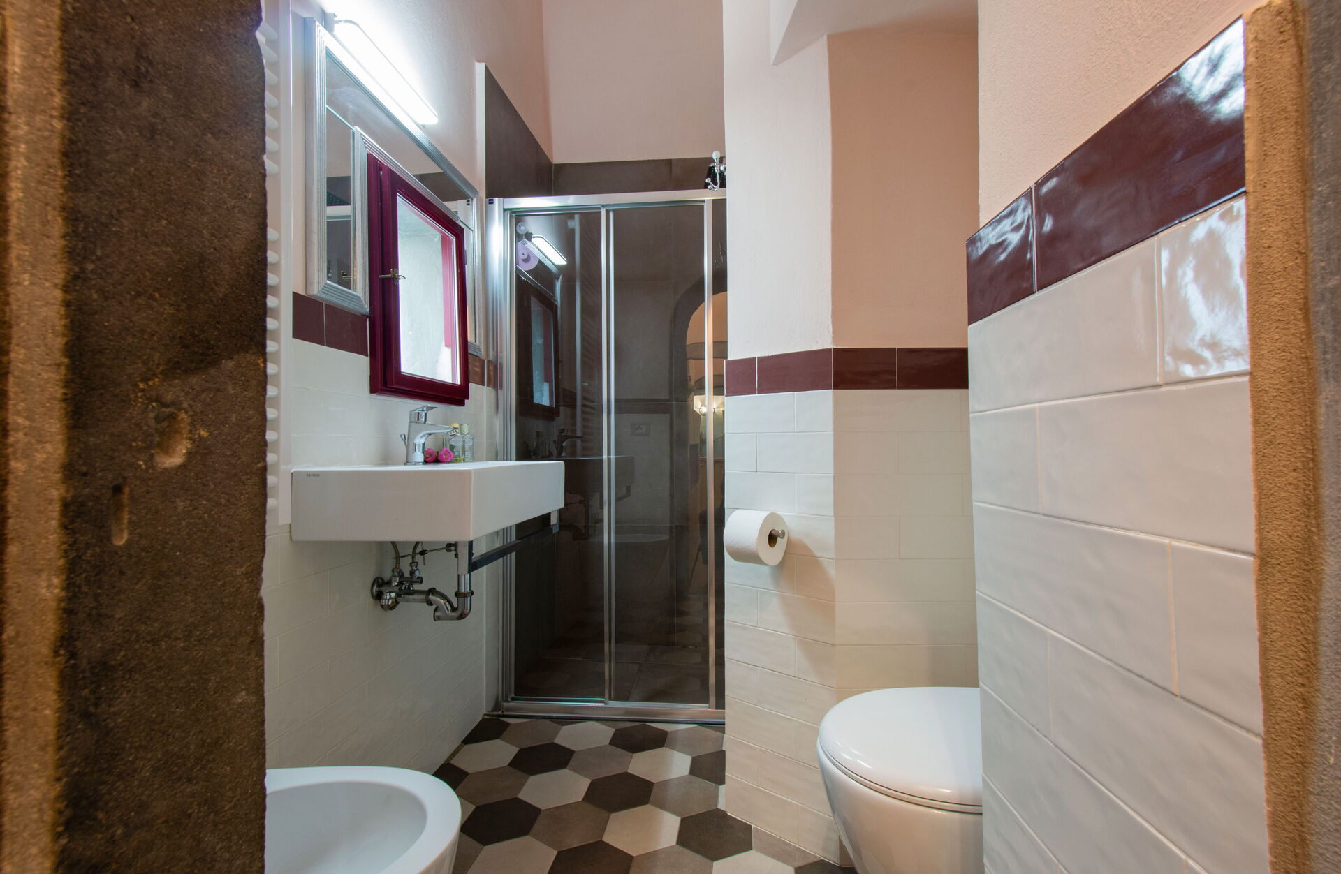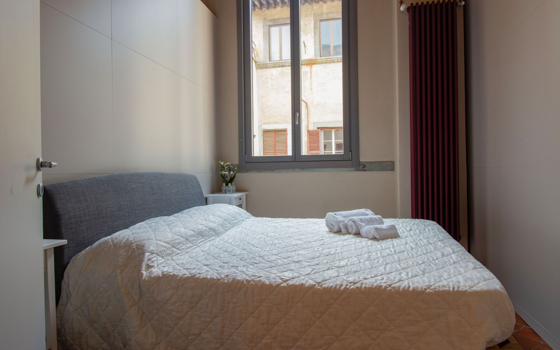 Soveværelse 2: Kingsize-seng (160 cm, kan deles i to enkeltsenge) med udsigt over Firenzes terrakotta-tagrygge. Eget badeværelse med badekar lige overfor i gangen.