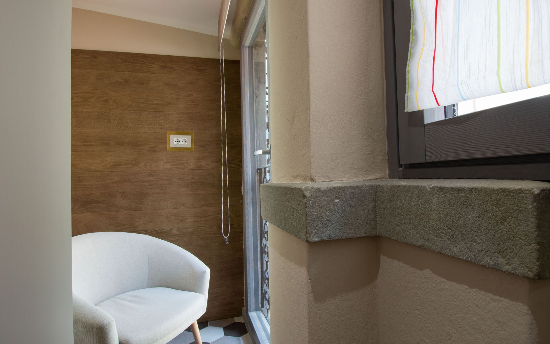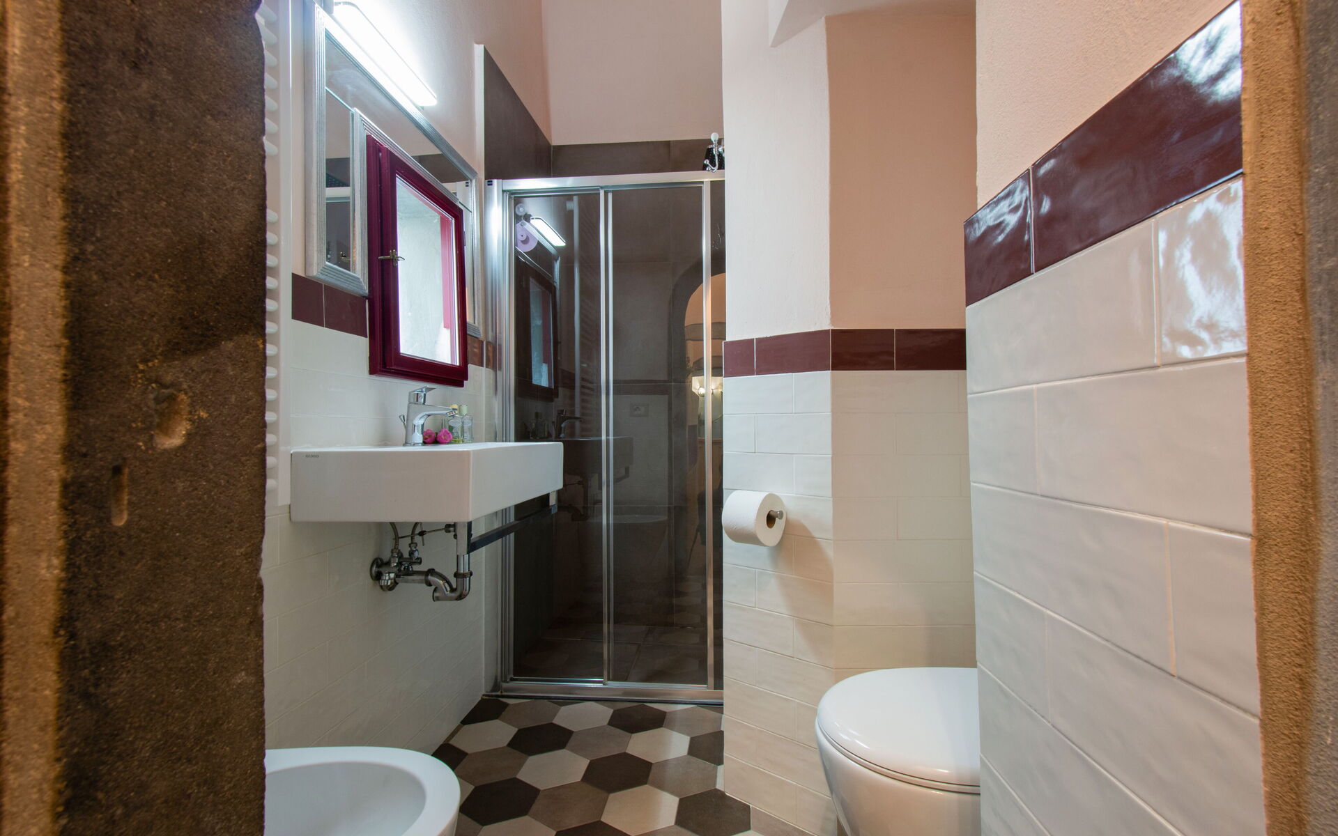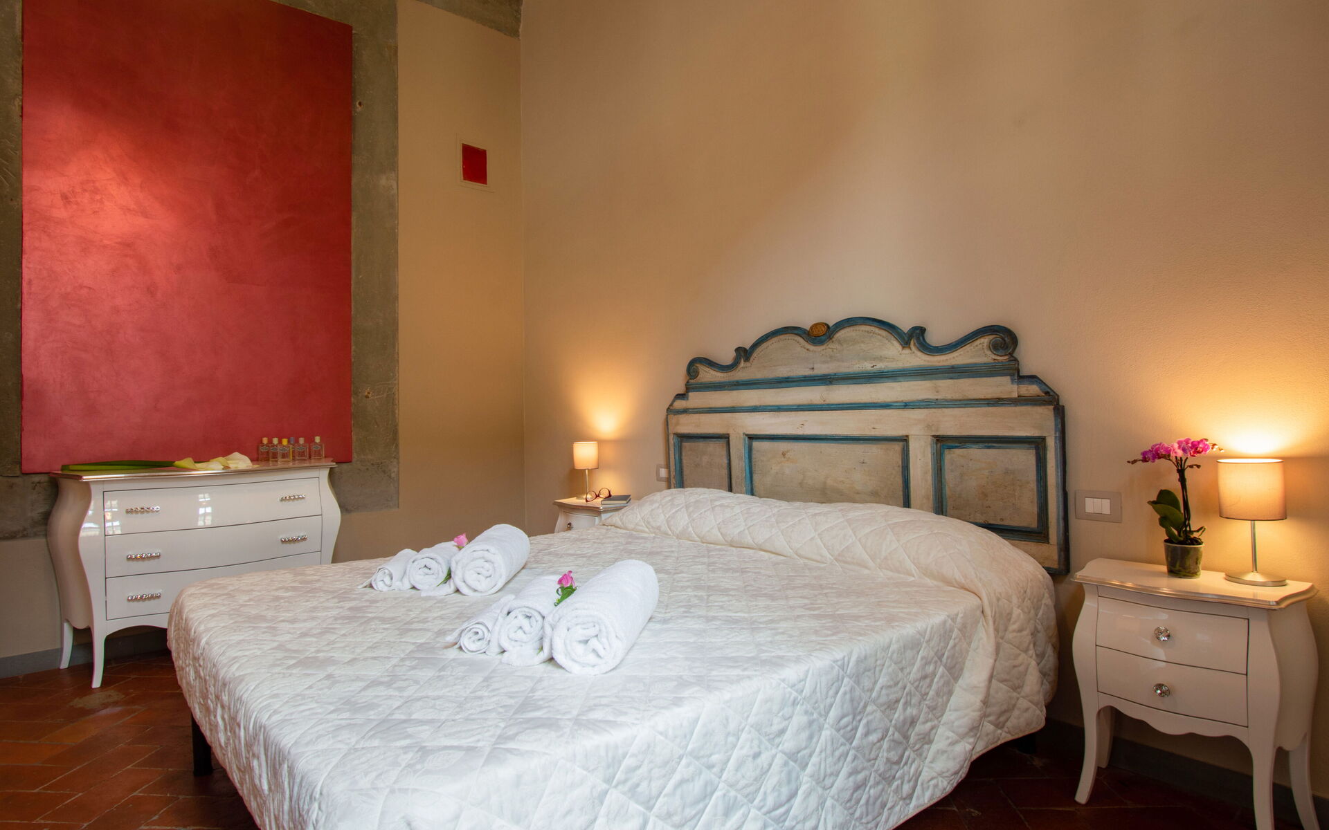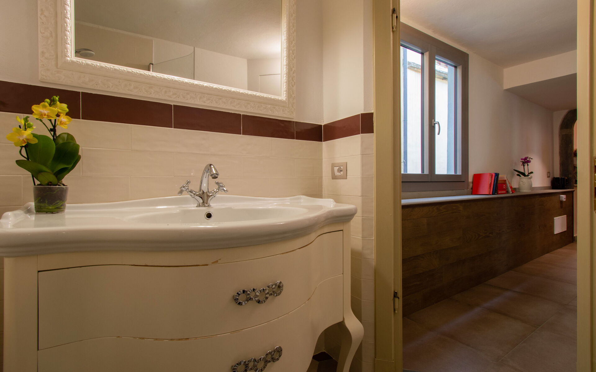 Soveværelse 2: Kingsize-seng (160 cm, kan deles i to enkeltsenge) med udsigt over Firenzes terrakotta-tagrygge. Eget badeværelse med badekar lige overfor i gangen.