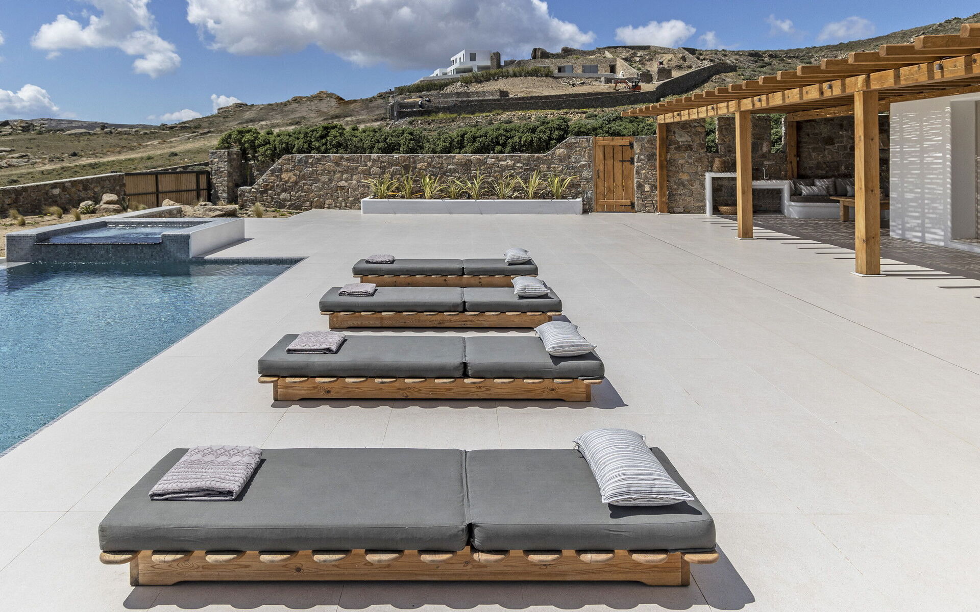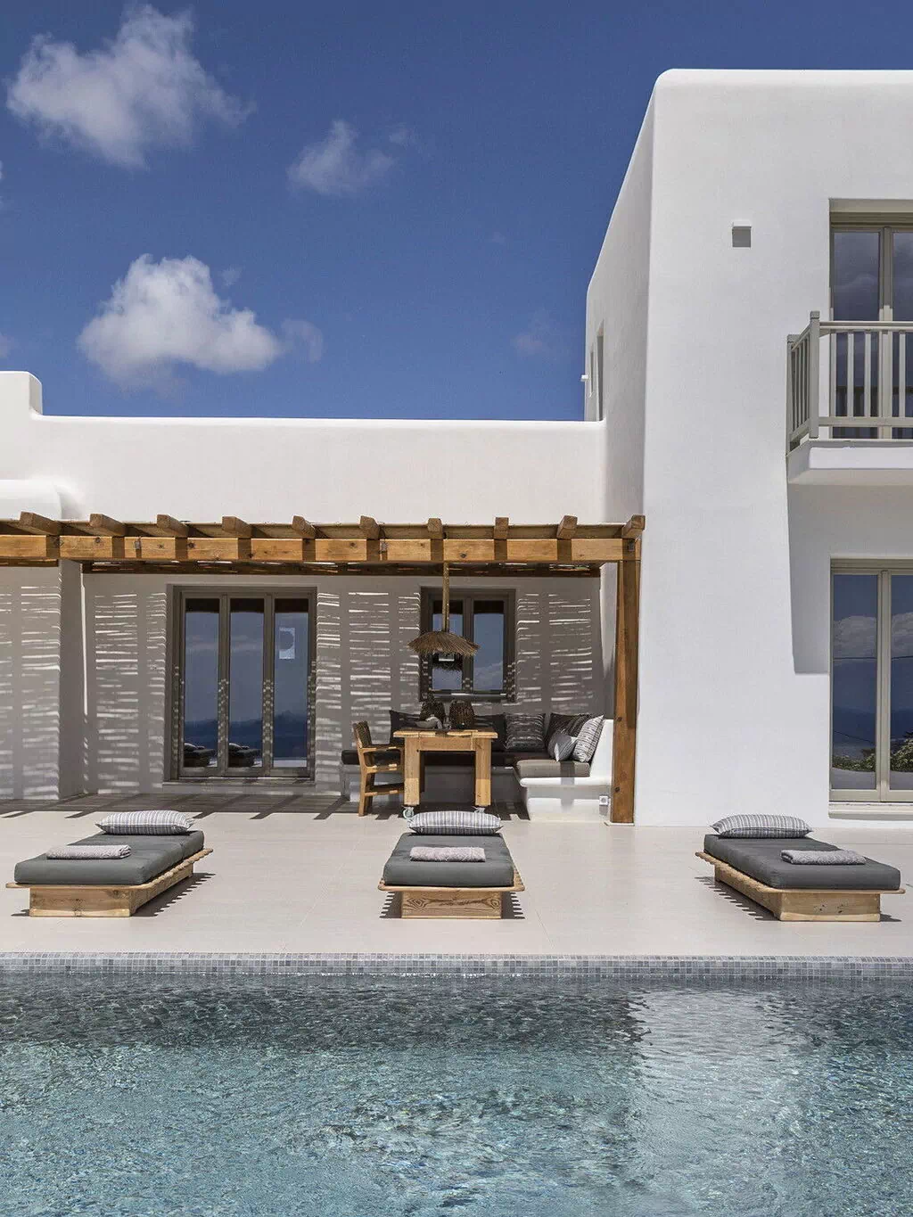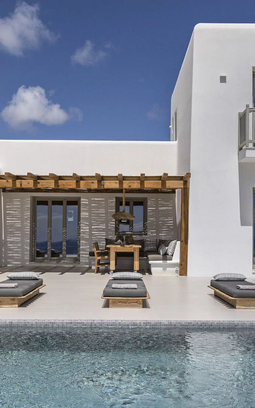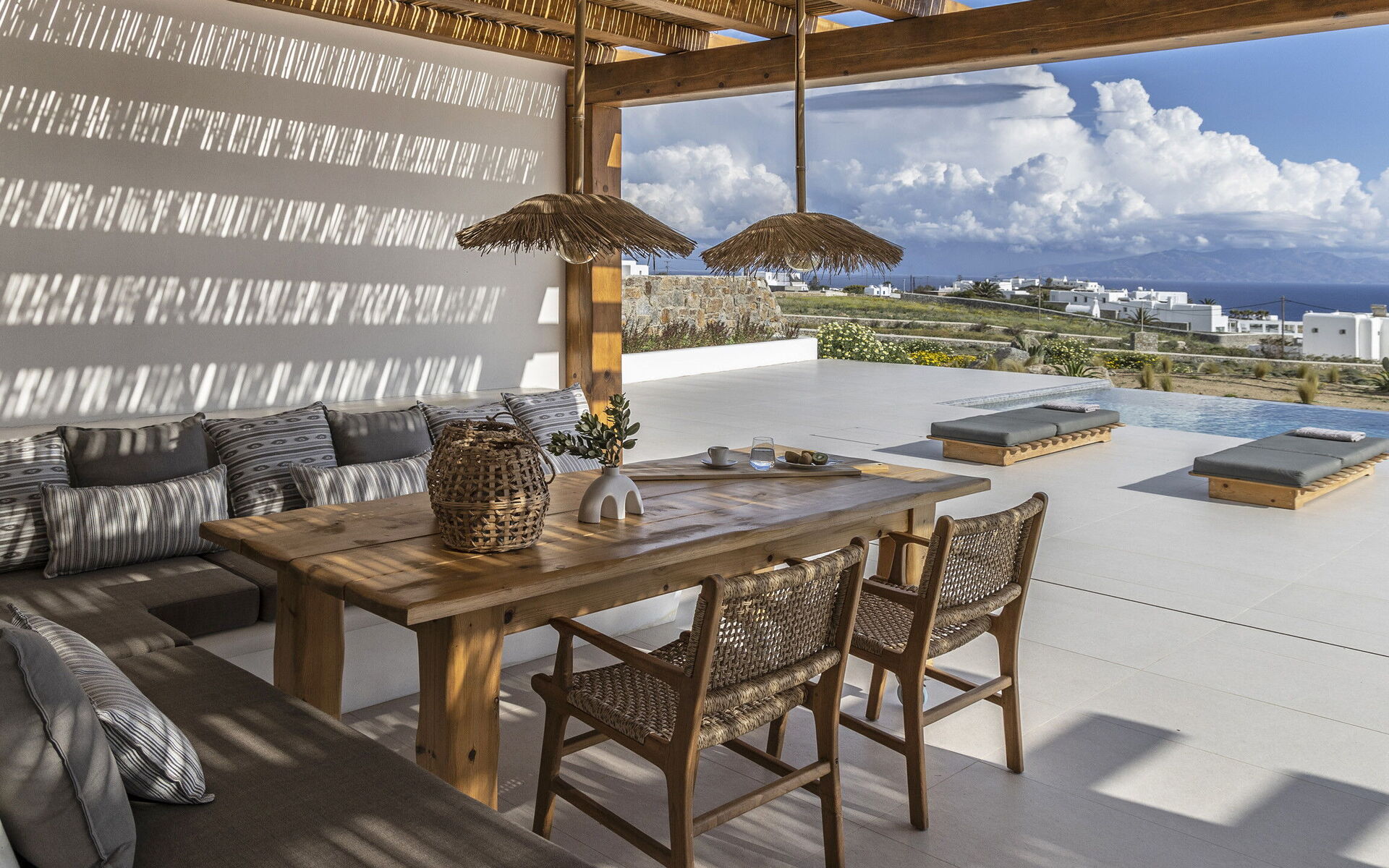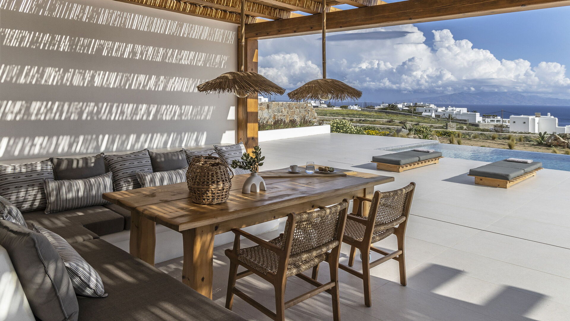 Les extérieurs de la propriété sont simples et essentiels, avec une belle piscine à débordement comme attraction principale sur la terrasse avant, et un agréable espace de détente et une salle à manger derrière elle, ombragée par une pergola, avec une délicieuse vue sur la mer en arrière-plan.