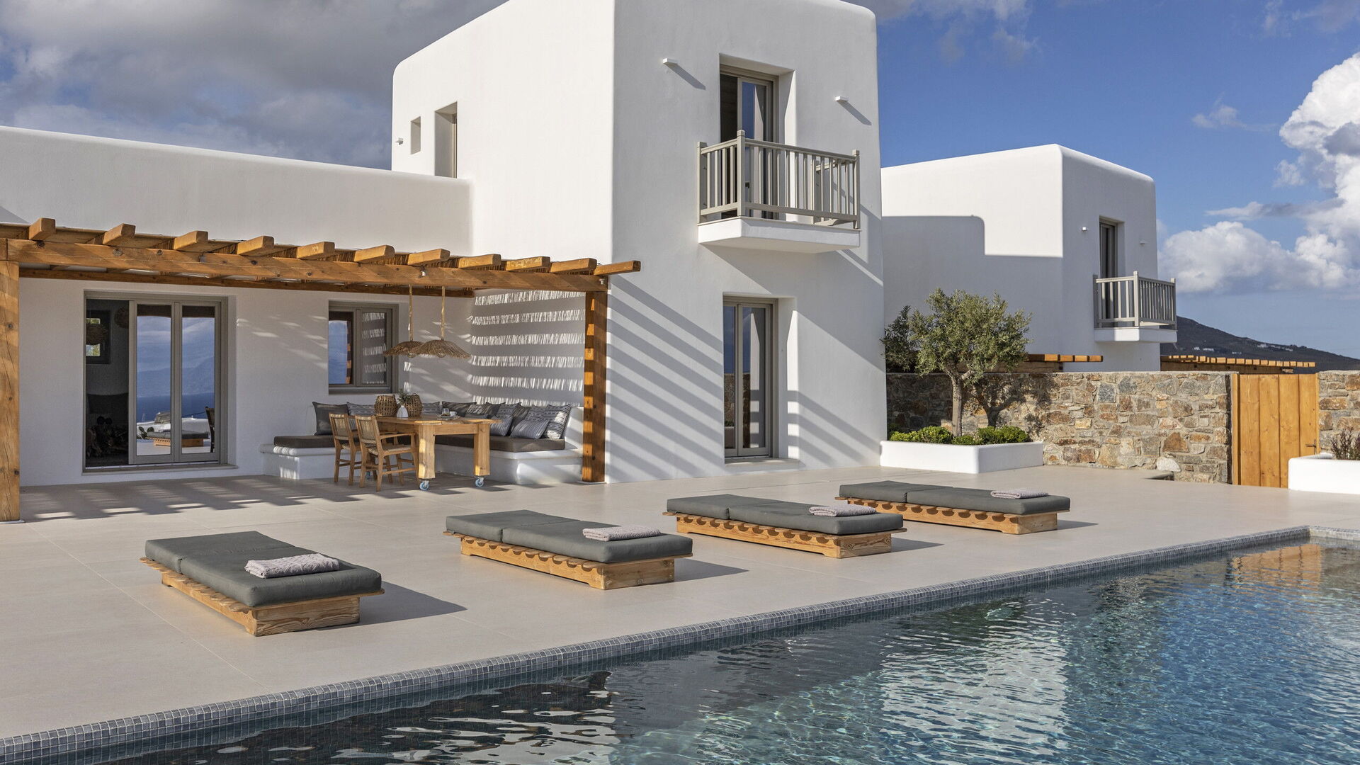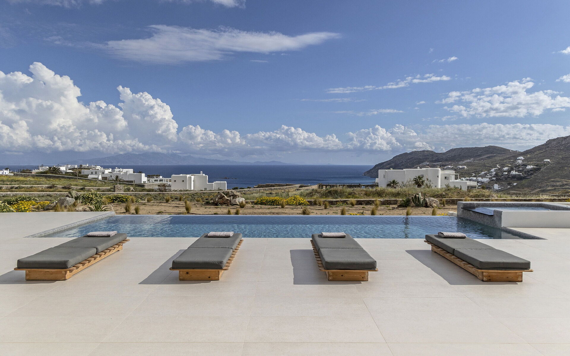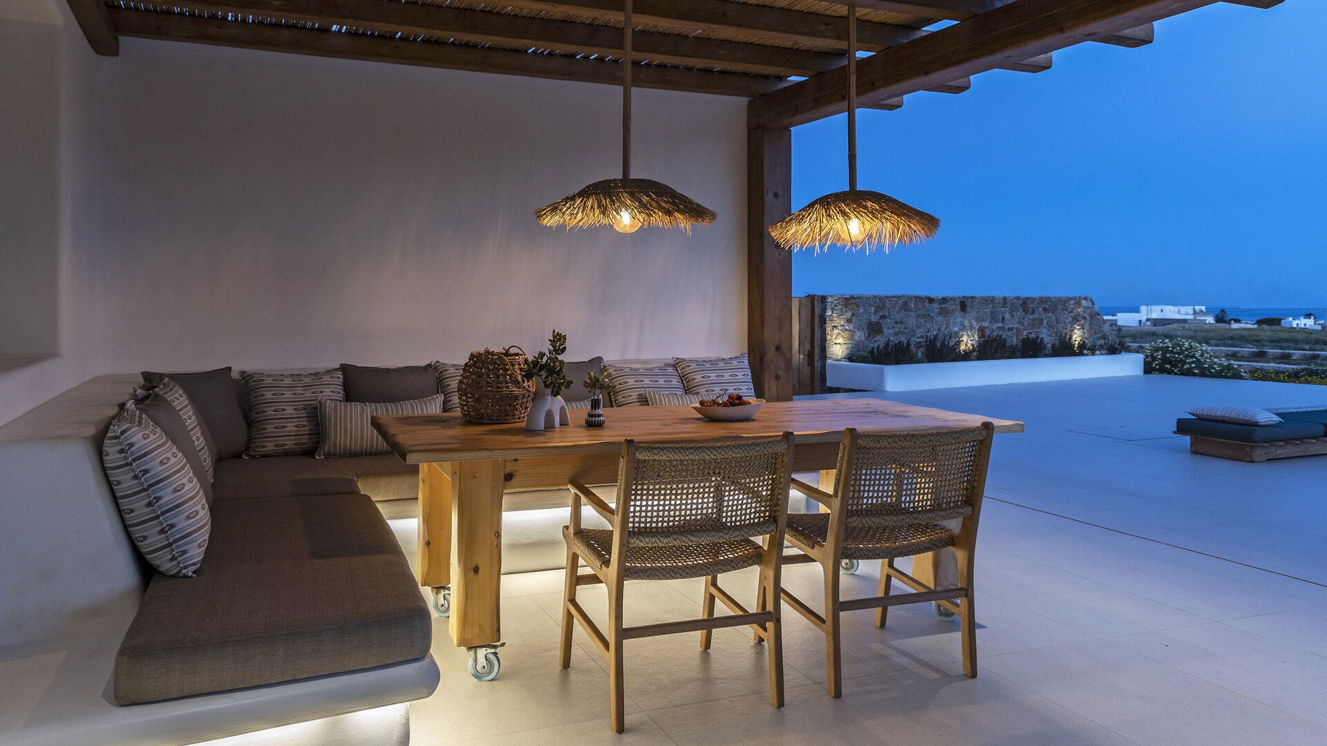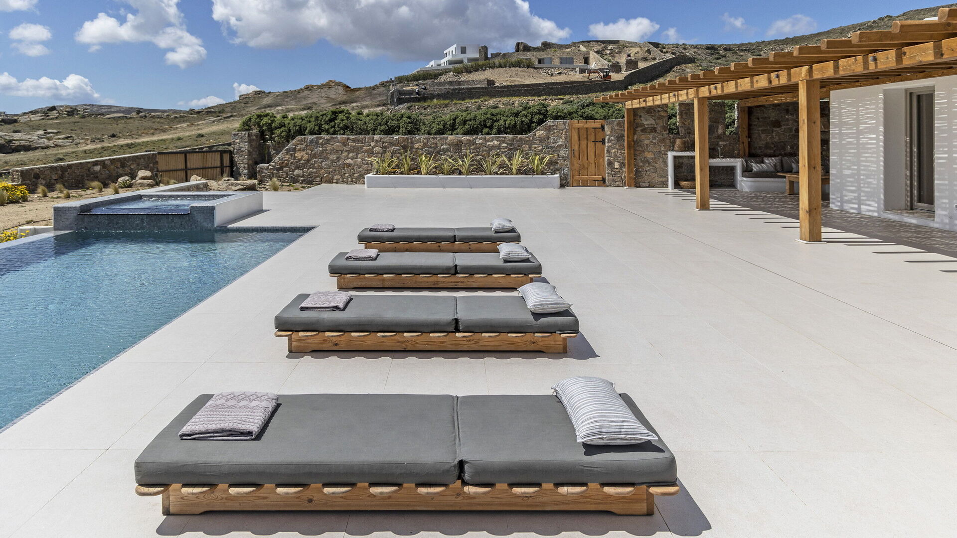 Les extérieurs de la propriété sont simples et essentiels, avec une belle piscine à débordement comme attraction principale sur la terrasse avant, et un agréable espace de détente et une salle à manger derrière elle, ombragée par une pergola, avec une délicieuse vue sur la mer en arrière-plan.