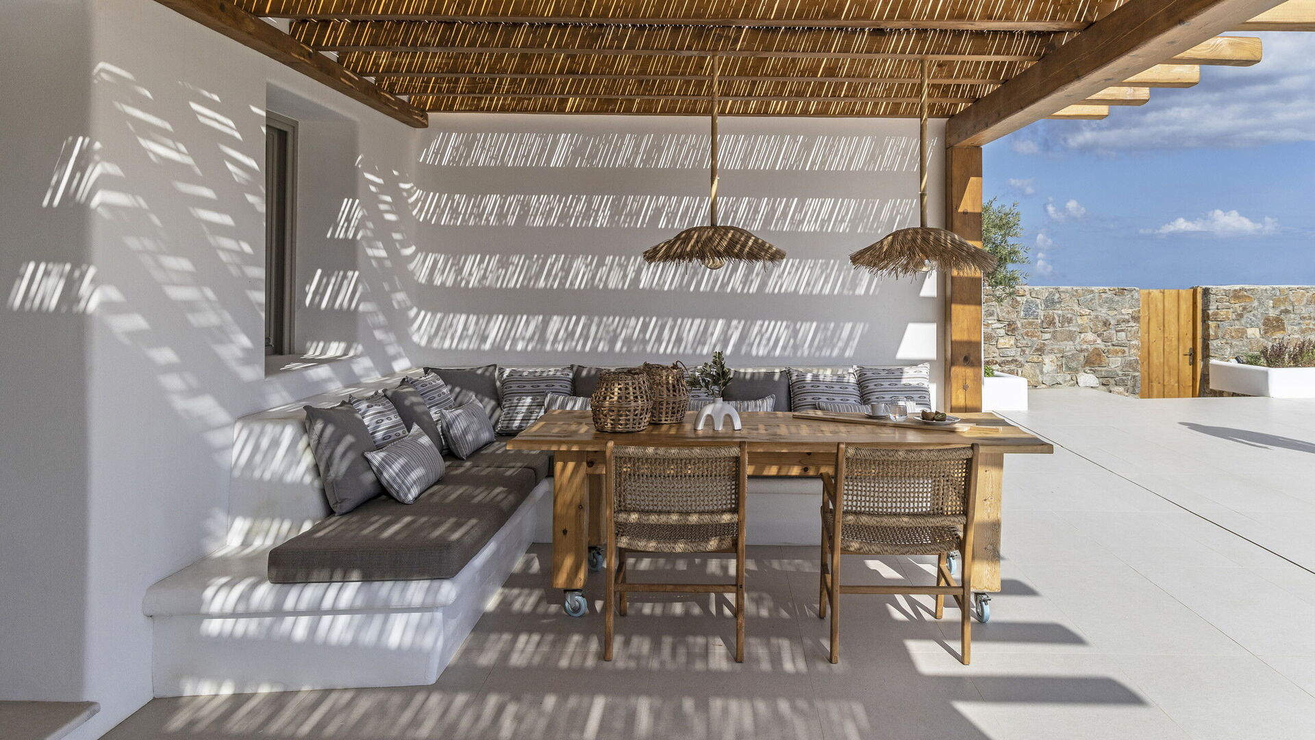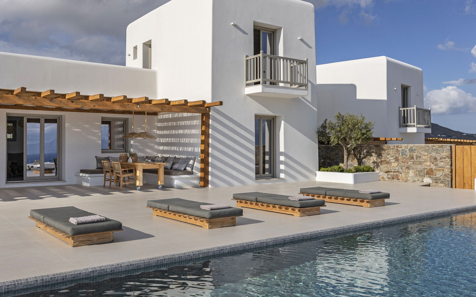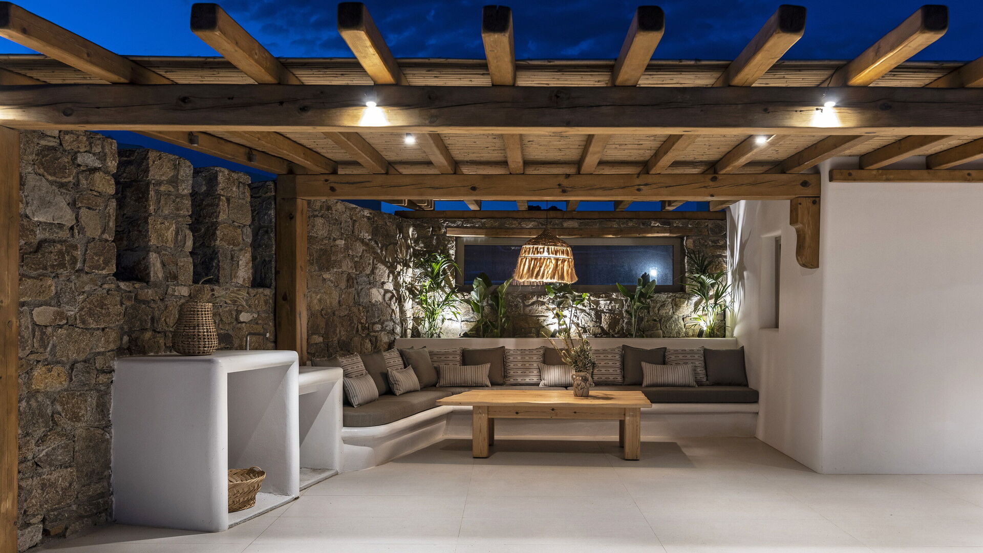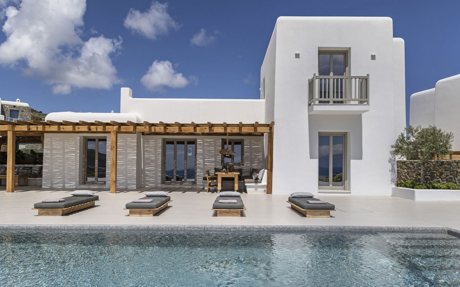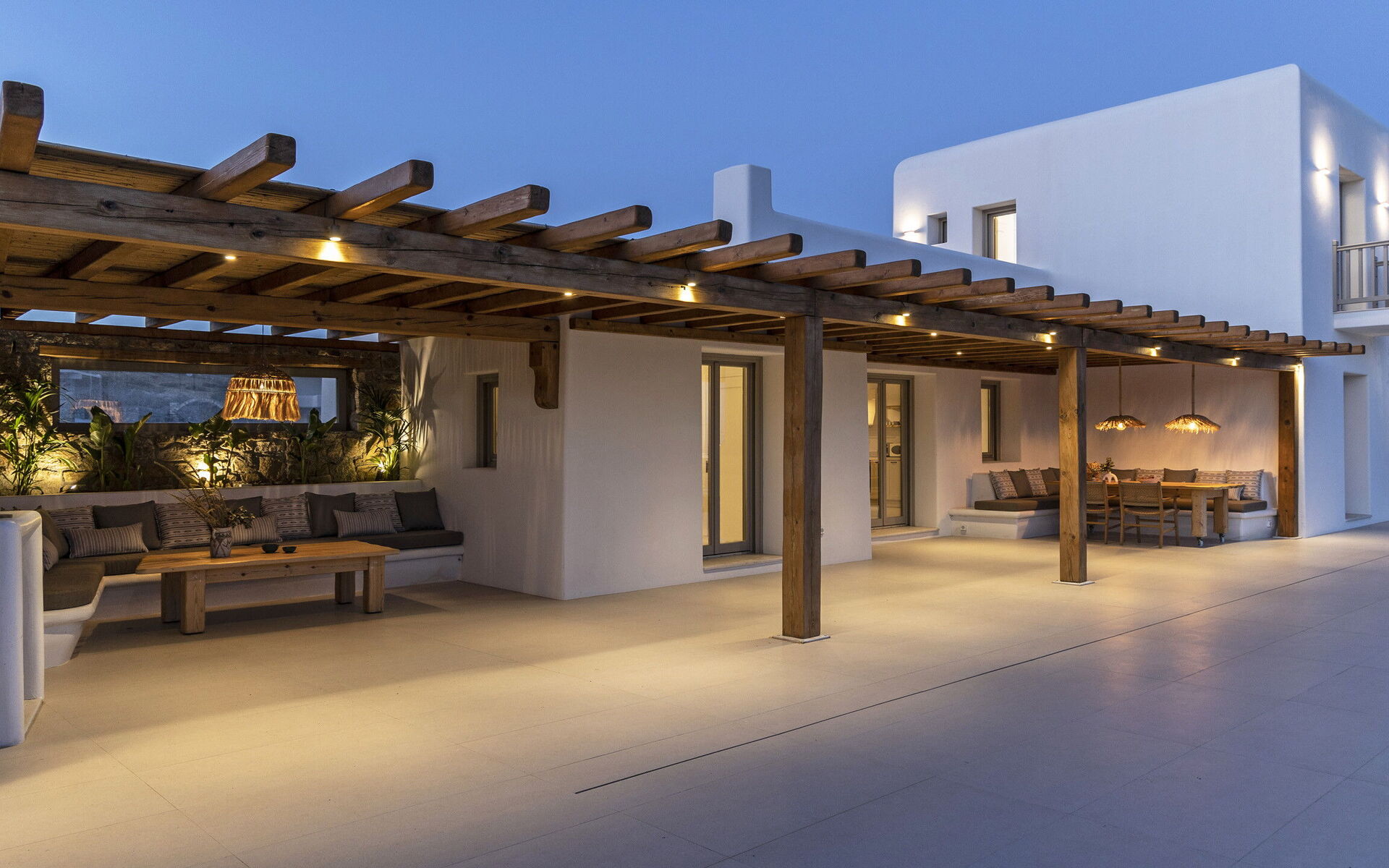 Les extérieurs de la propriété sont simples et essentiels, avec une belle piscine à débordement comme attraction principale sur la terrasse avant, et un agréable espace de détente et une salle à manger derrière elle, ombragée par une pergola, avec une délicieuse vue sur la mer en arrière-plan.