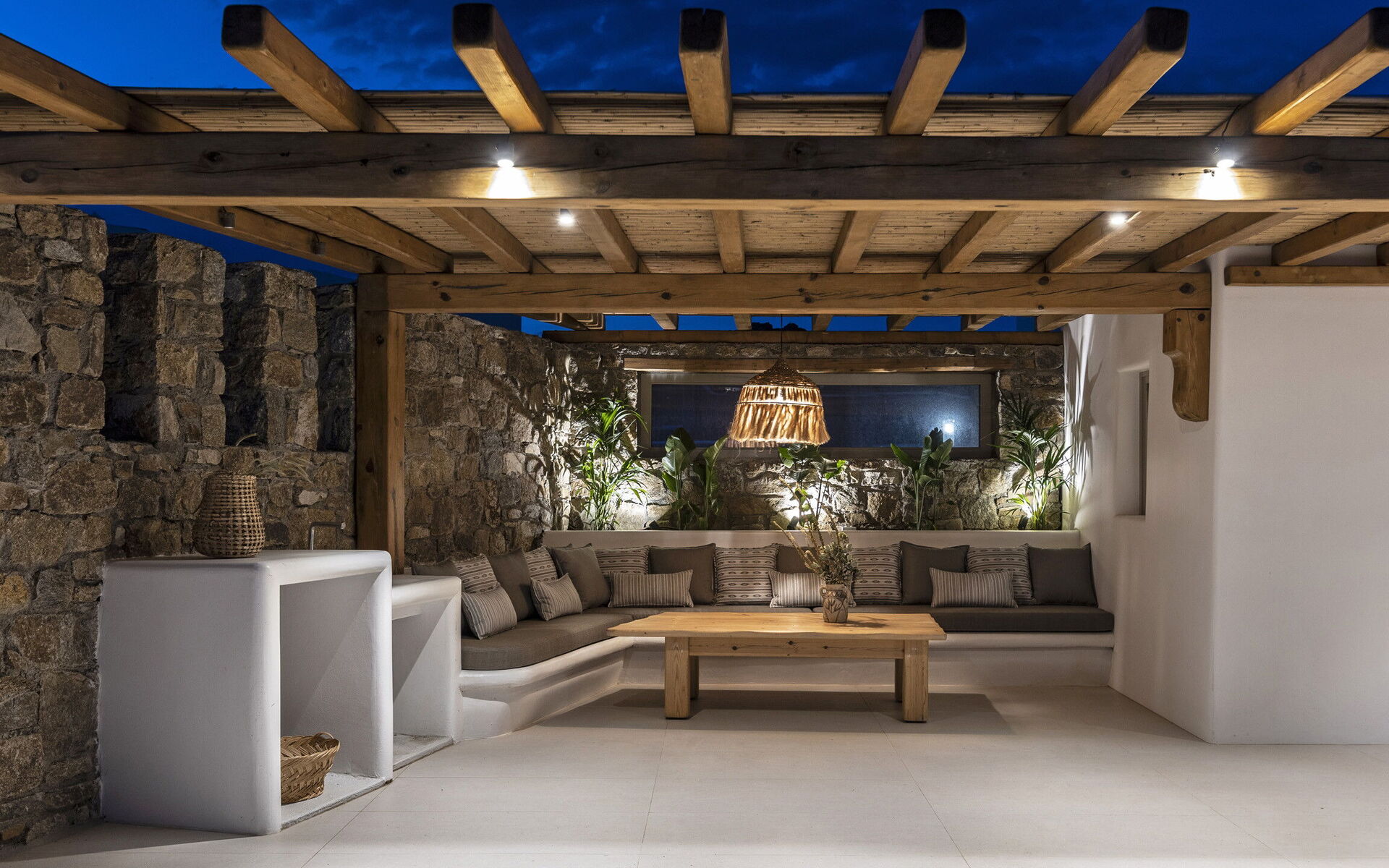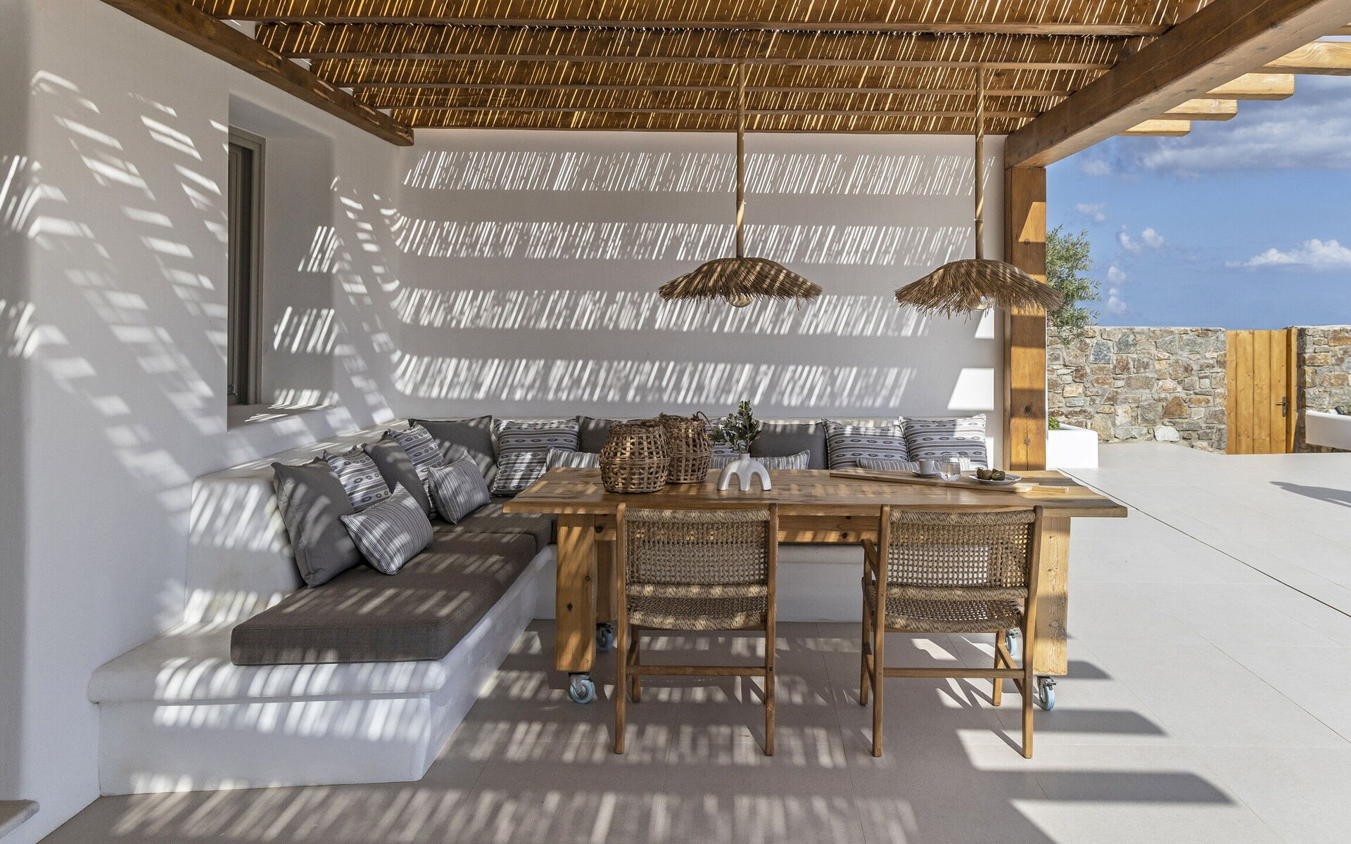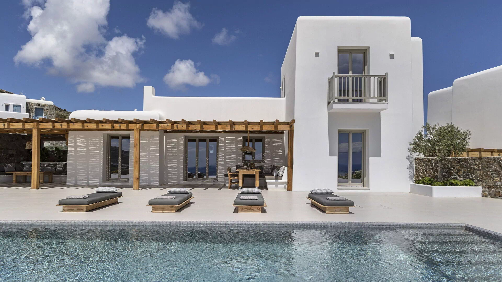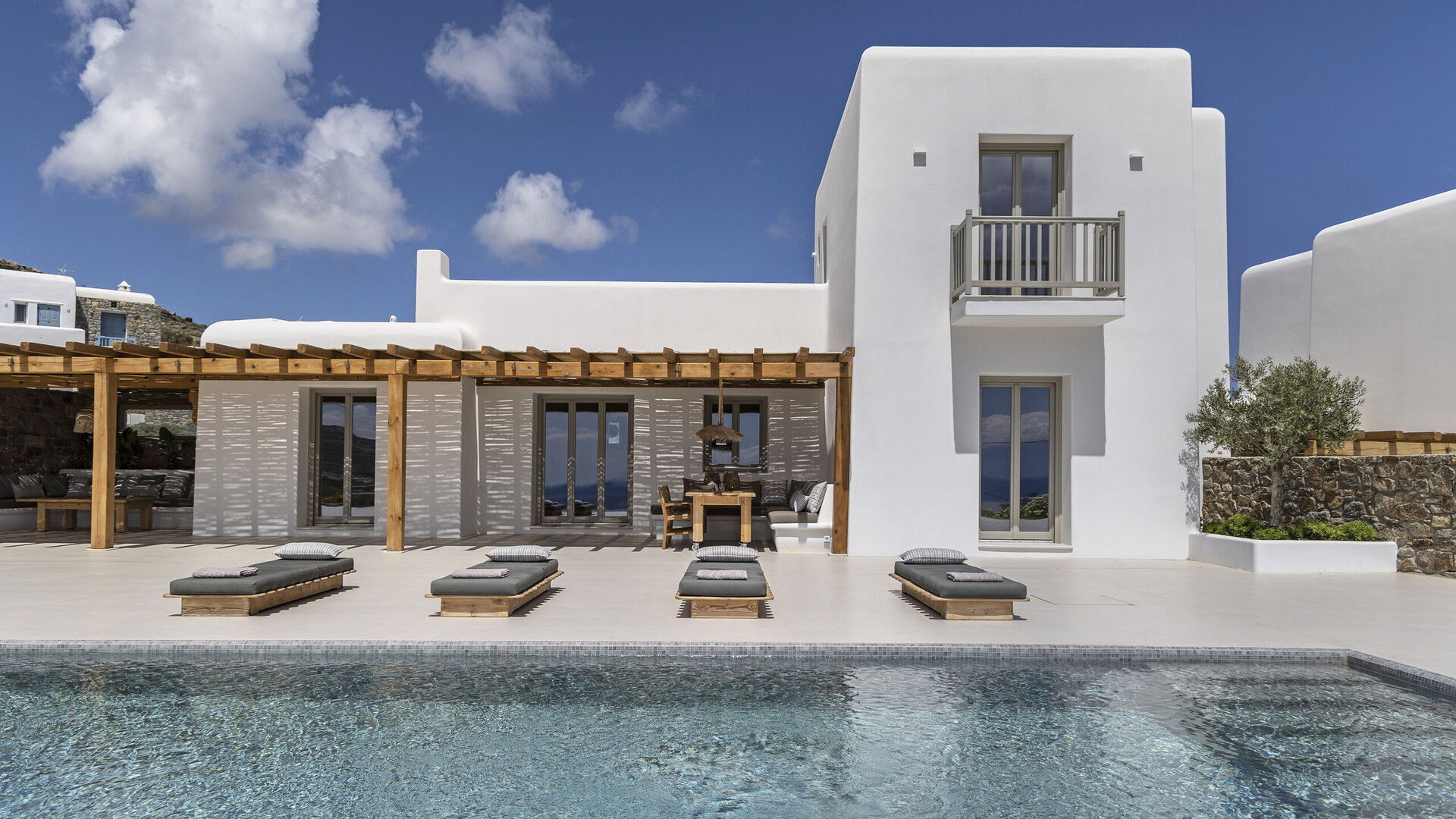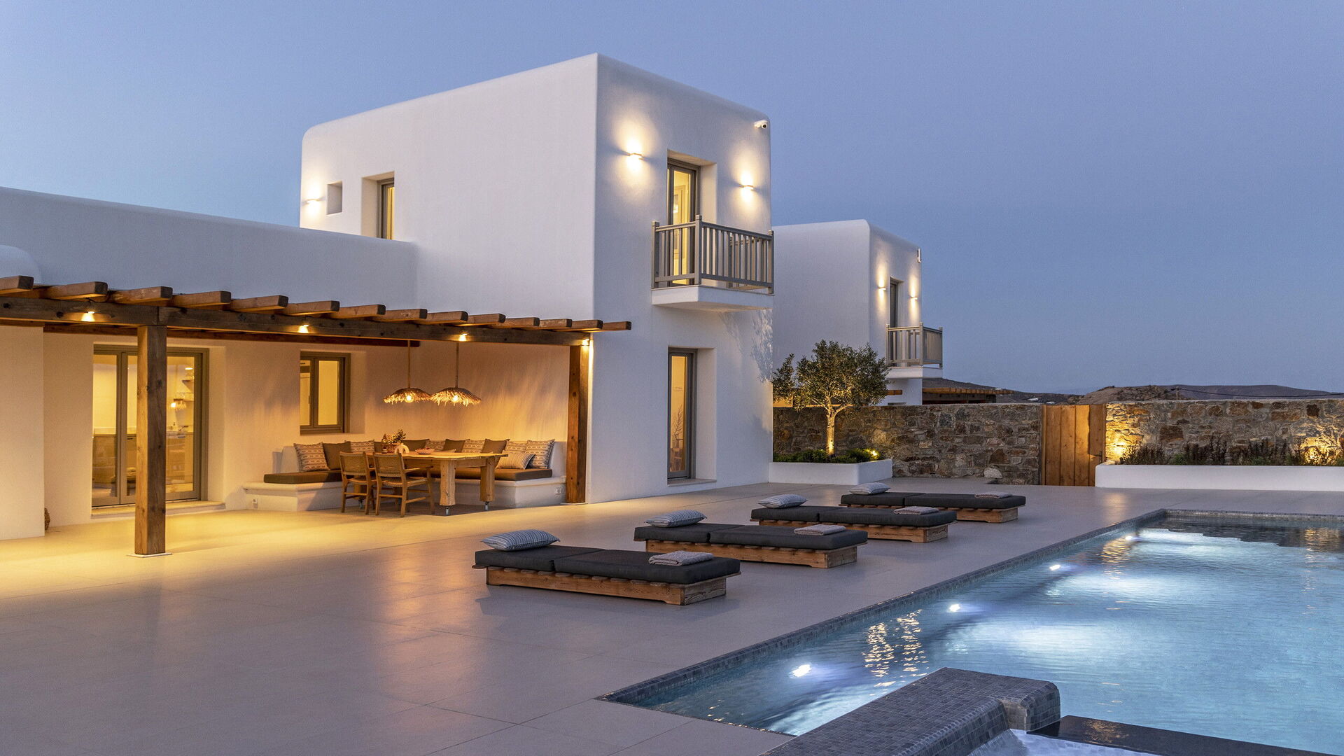 Les extérieurs de la propriété sont simples et essentiels, avec une belle piscine à débordement comme attraction principale sur la terrasse avant, et un agréable espace de détente et une salle à manger derrière elle, ombragée par une pergola, avec une délicieuse vue sur la mer en arrière-plan.