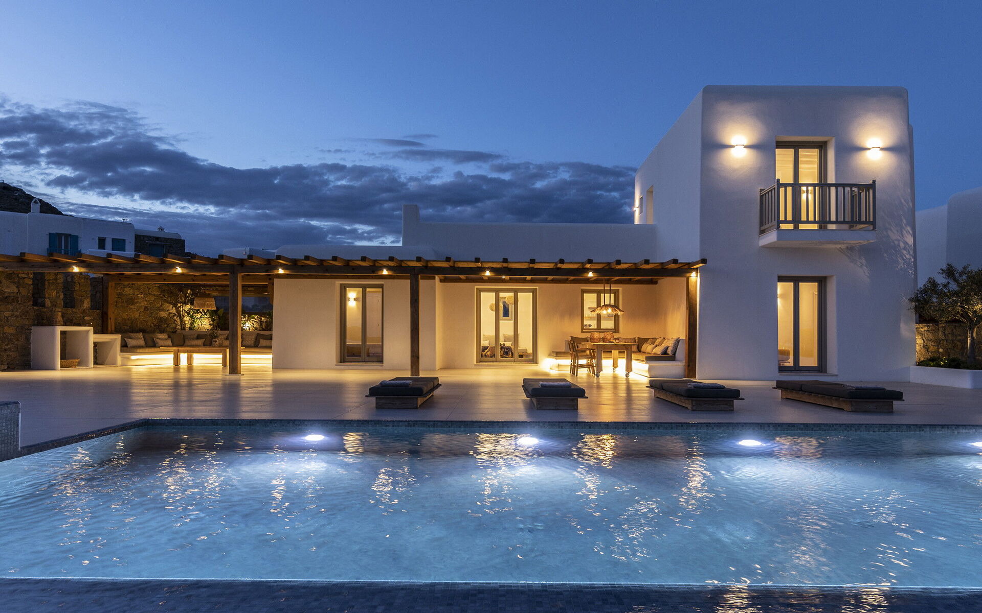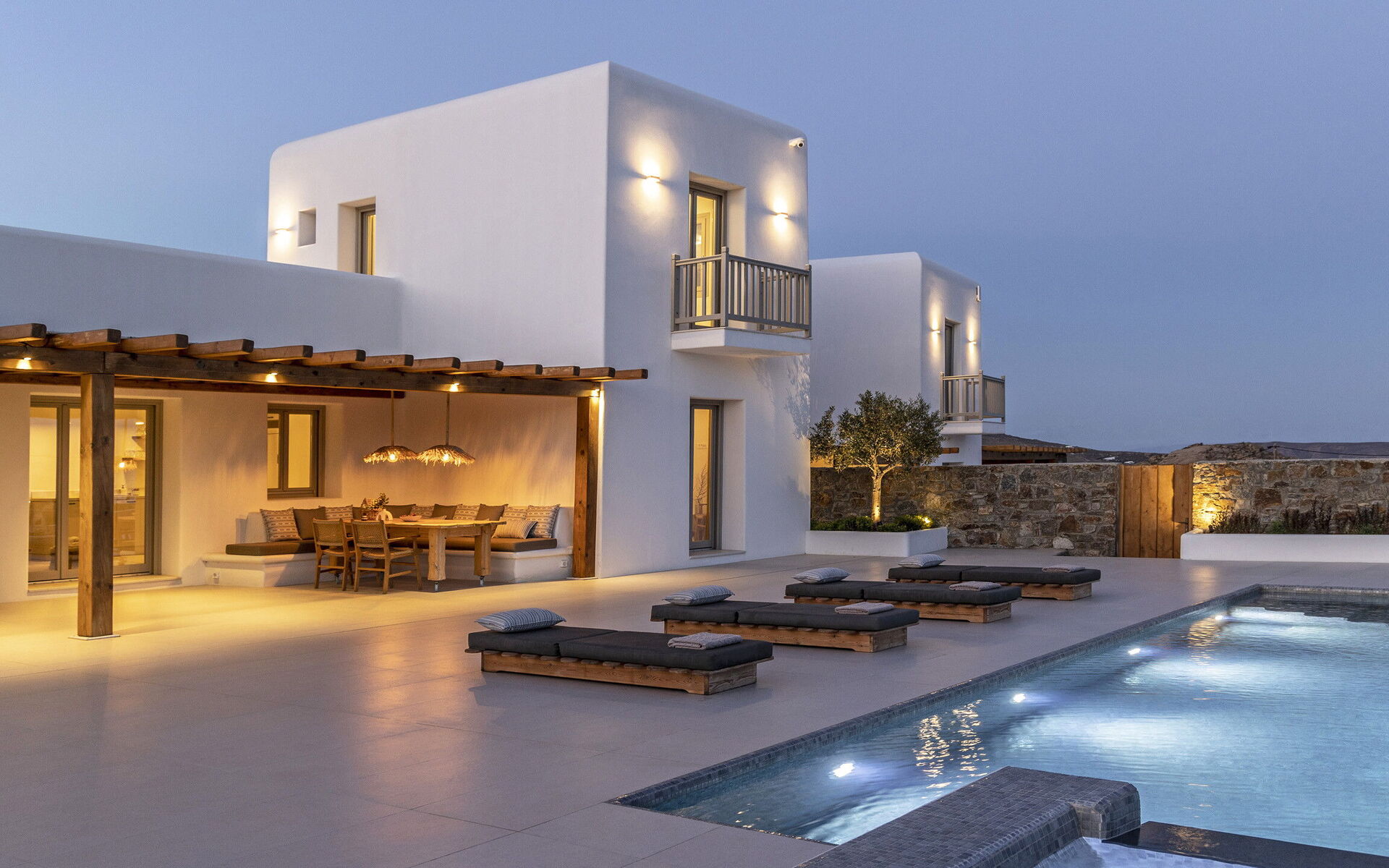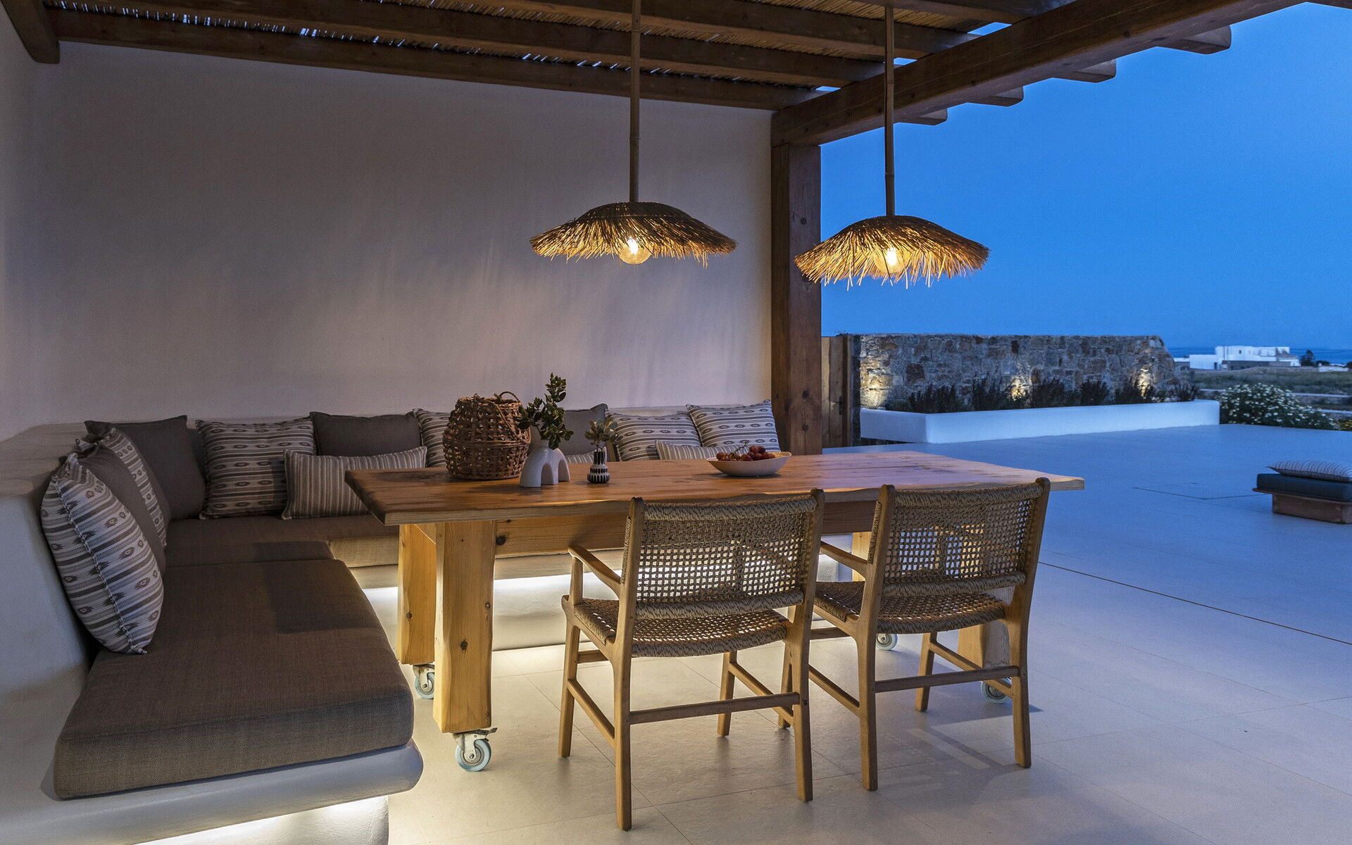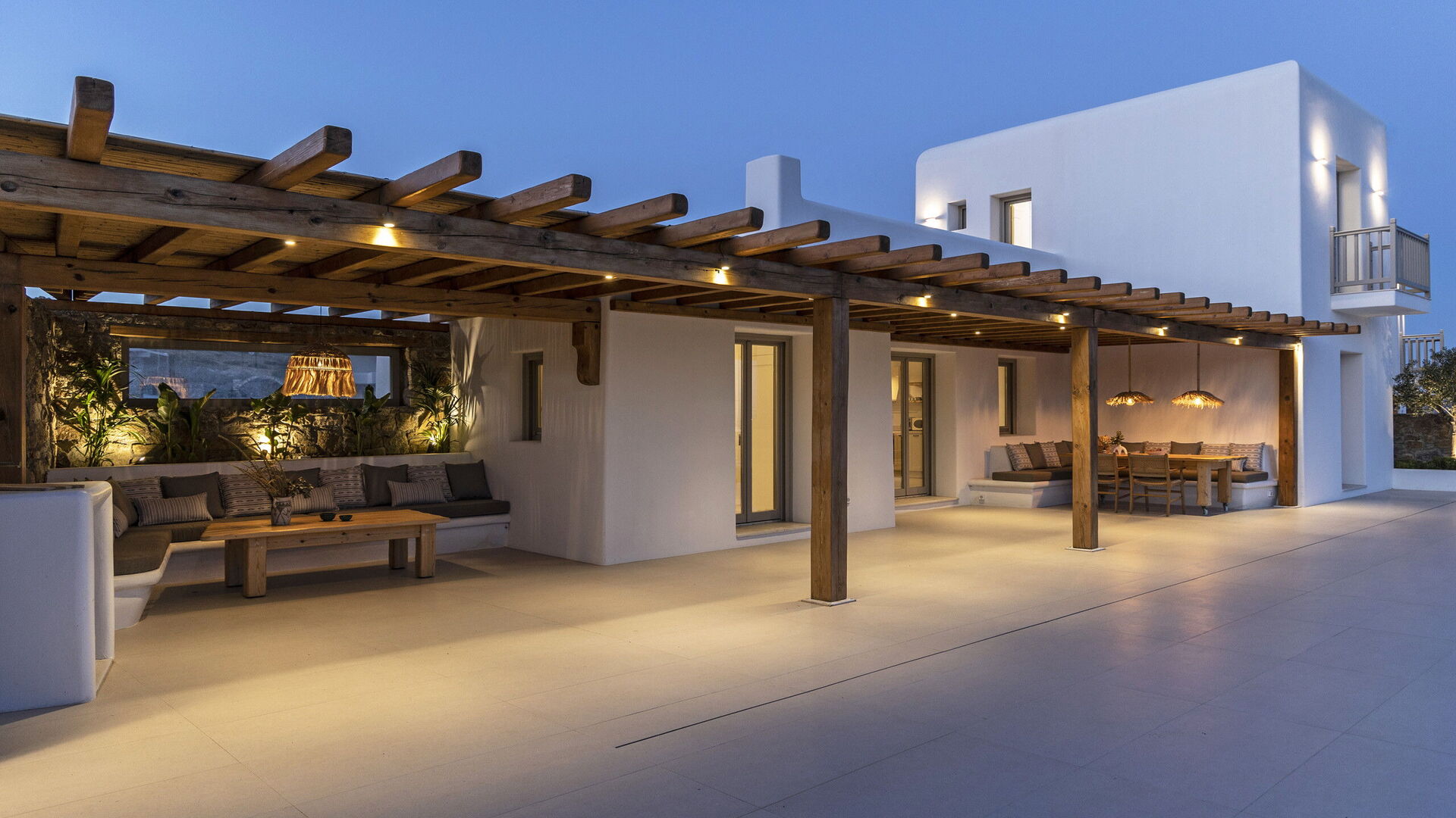 Les extérieurs de la propriété sont simples et essentiels, avec une belle piscine à débordement comme attraction principale sur la terrasse avant, et un agréable espace de détente et une salle à manger derrière elle, ombragée par une pergola, avec une délicieuse vue sur la mer en arrière-plan.