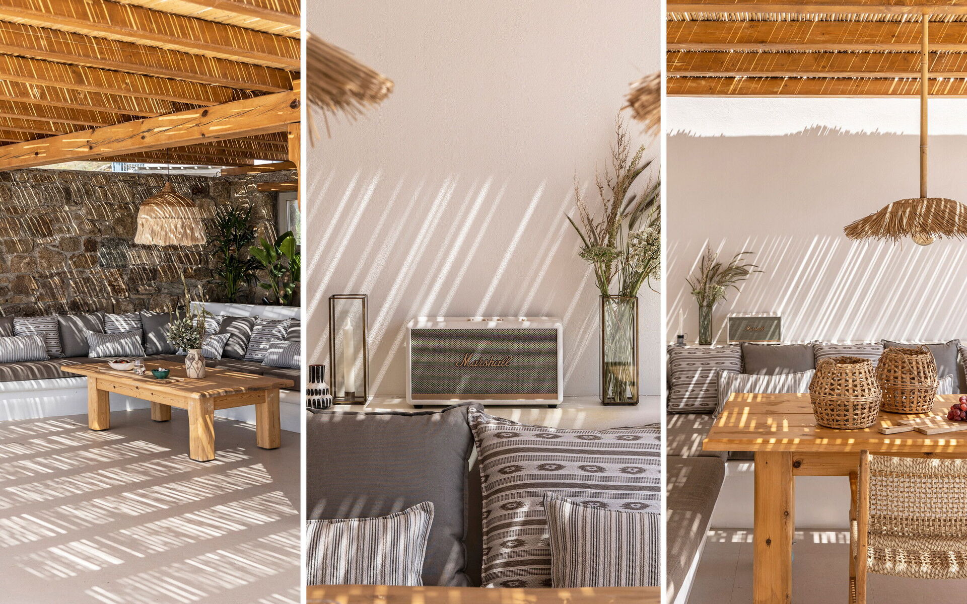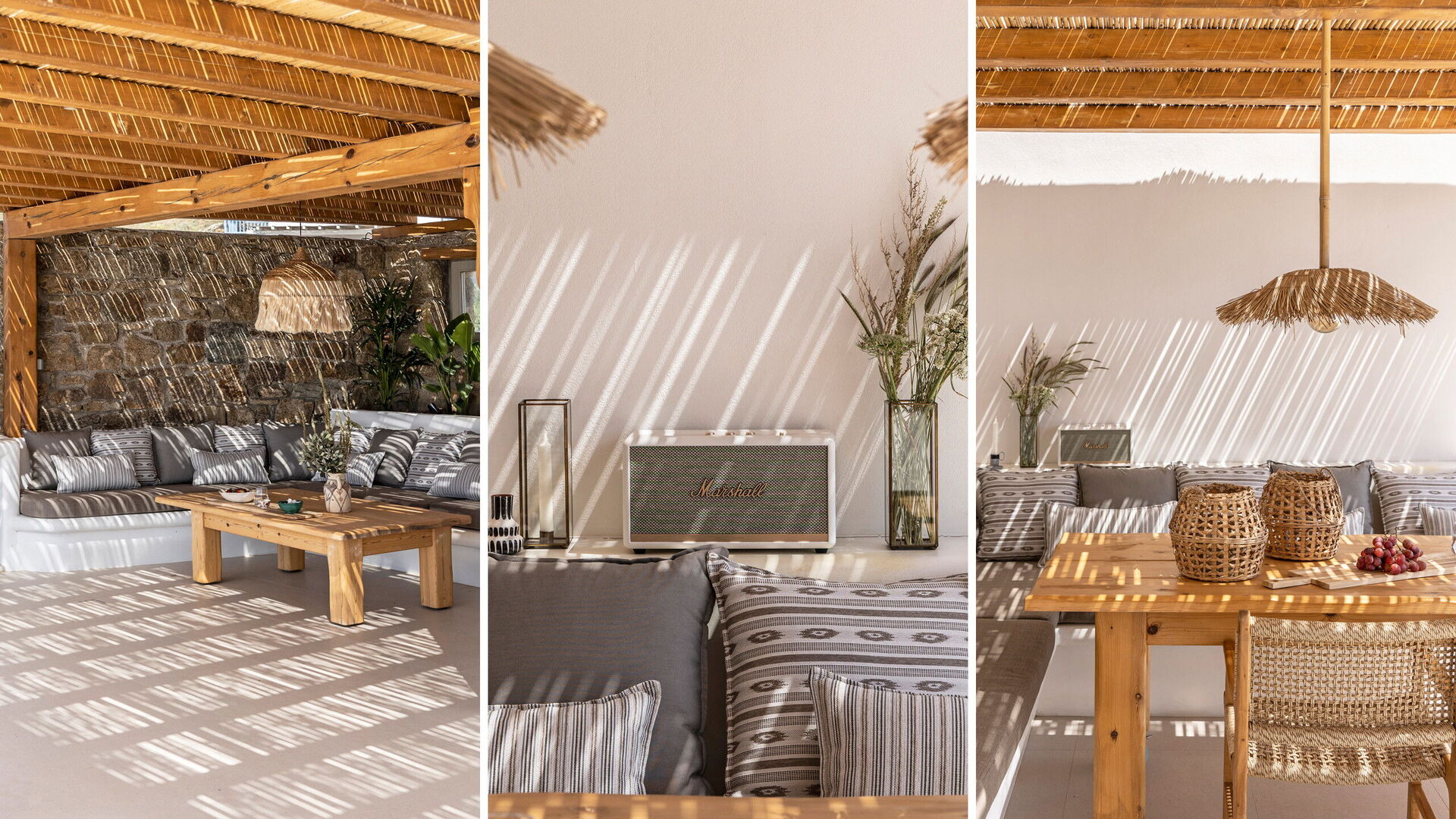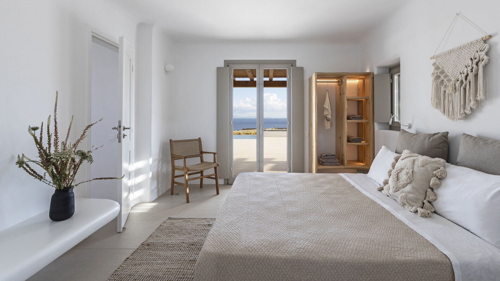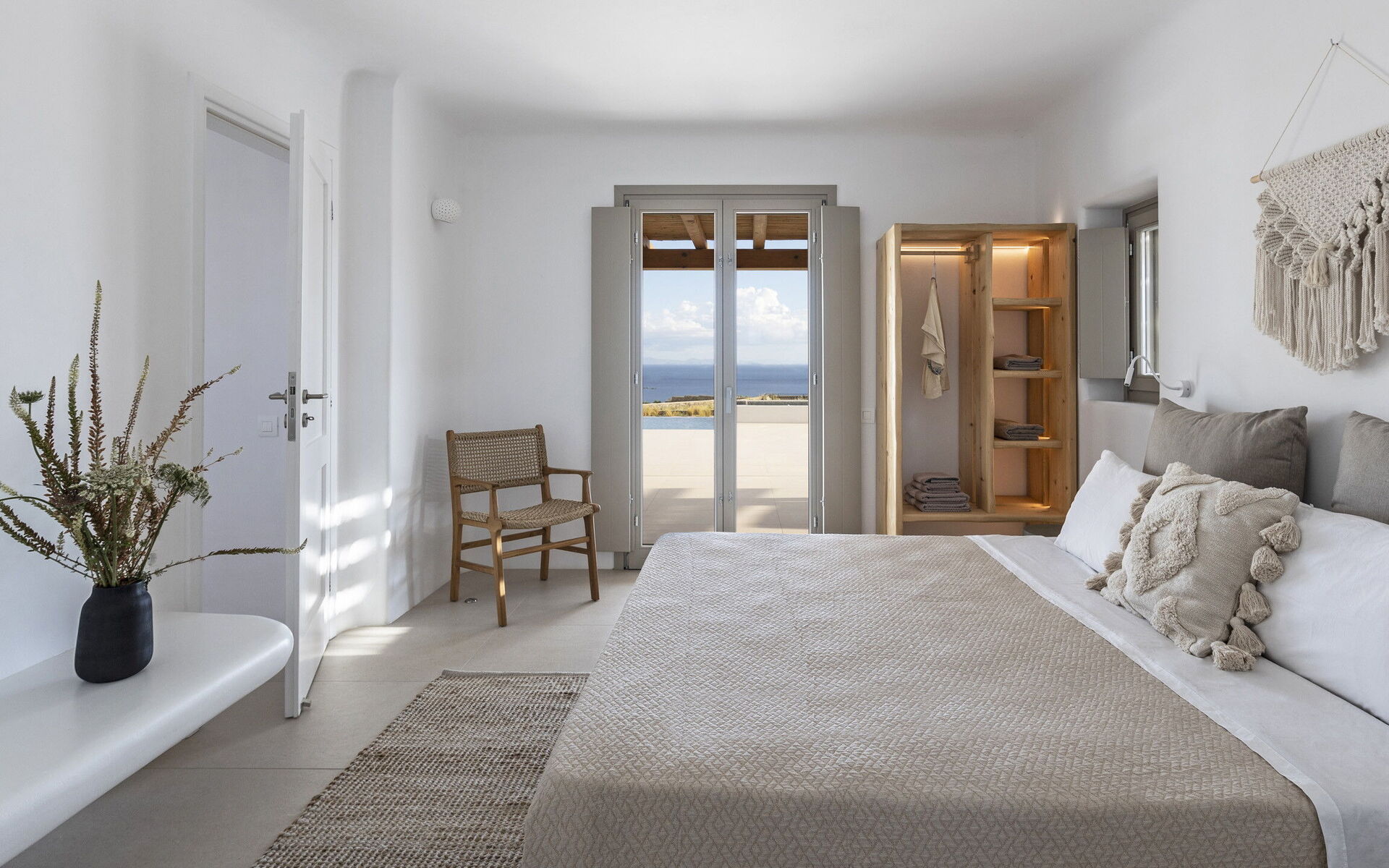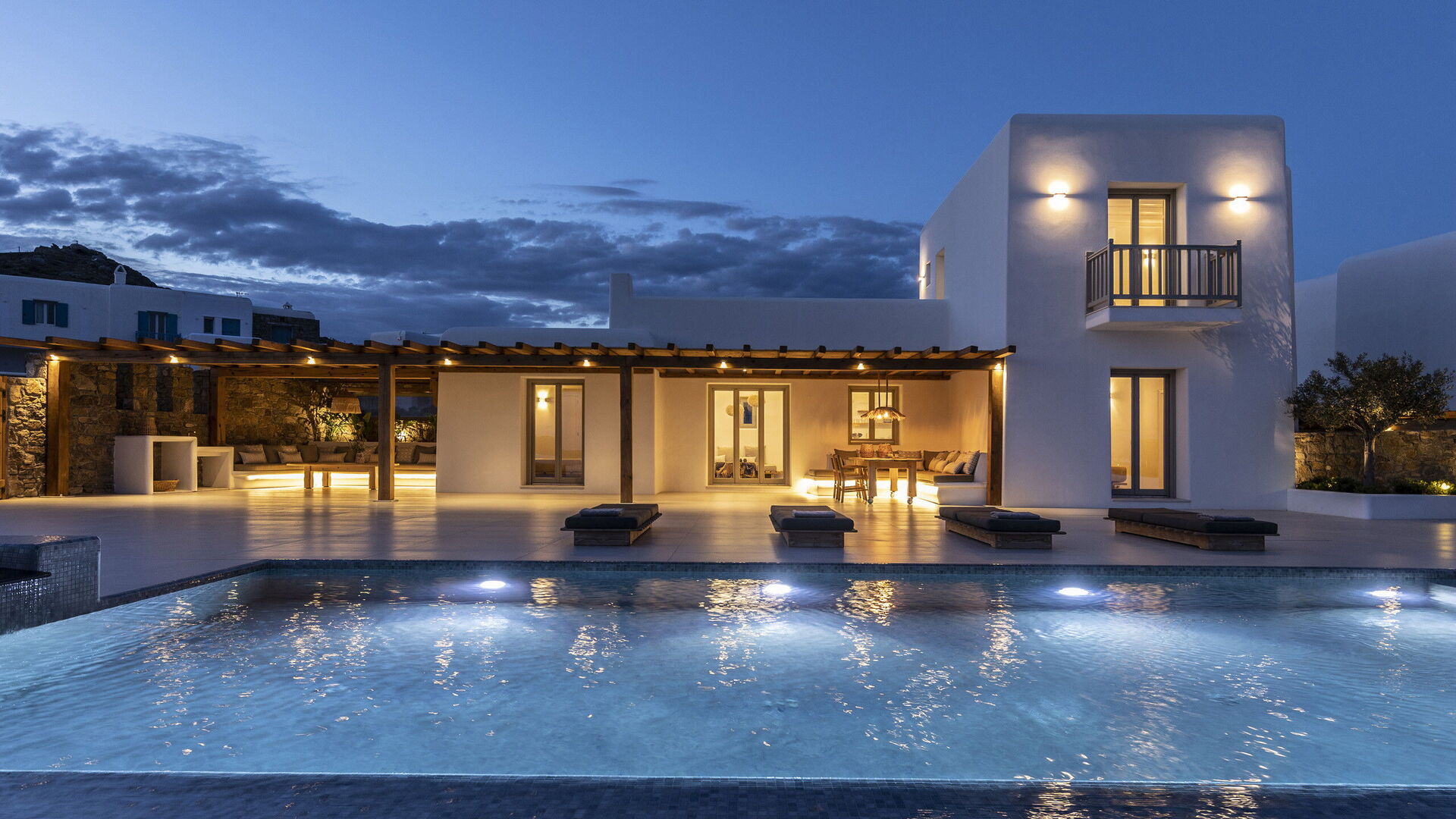 Les extérieurs de la propriété sont simples et essentiels, avec une belle piscine à débordement comme attraction principale sur la terrasse avant, et un agréable espace de détente et une salle à manger derrière elle, ombragée par une pergola, avec une délicieuse vue sur la mer en arrière-plan.