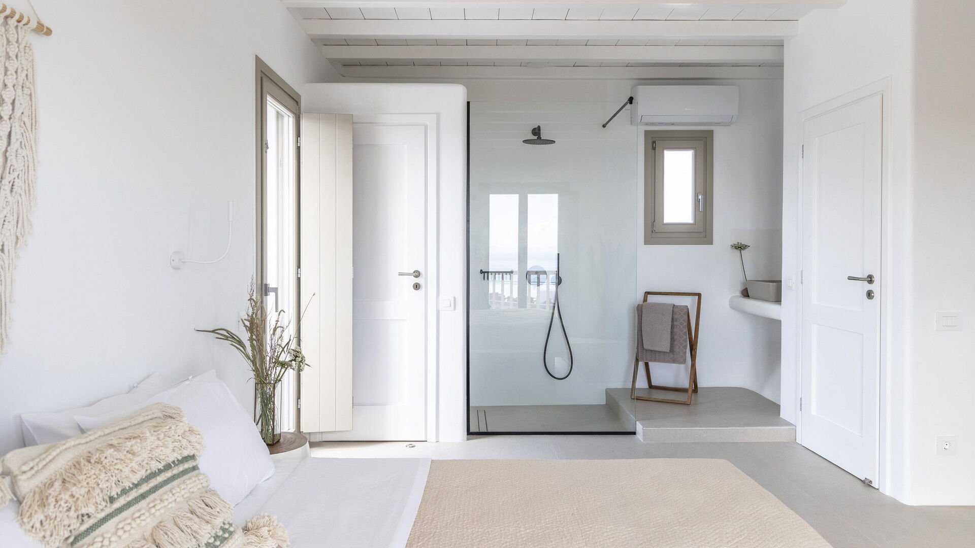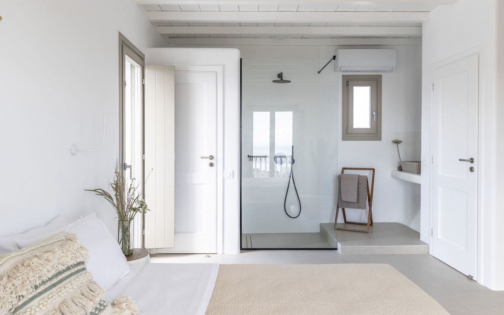 1 Chambre à coucher avec lit double, climatisation, salle de bain attenante avec douche, petit balcon avec vue sur la mer au loin.