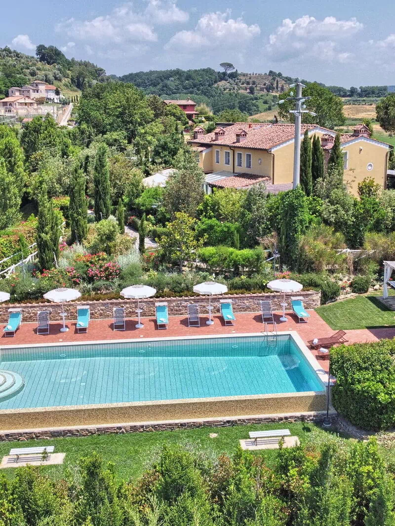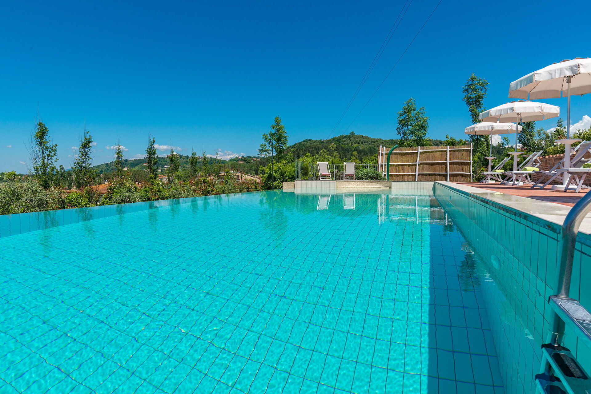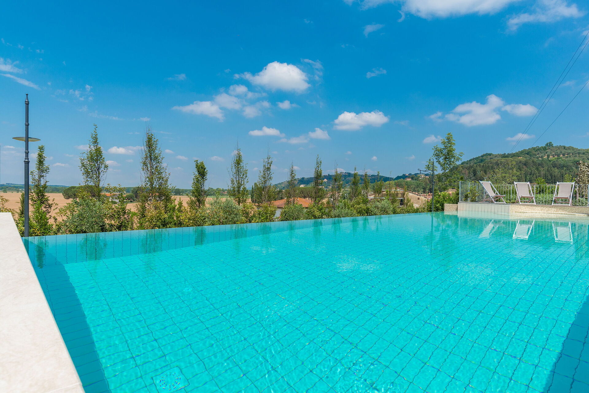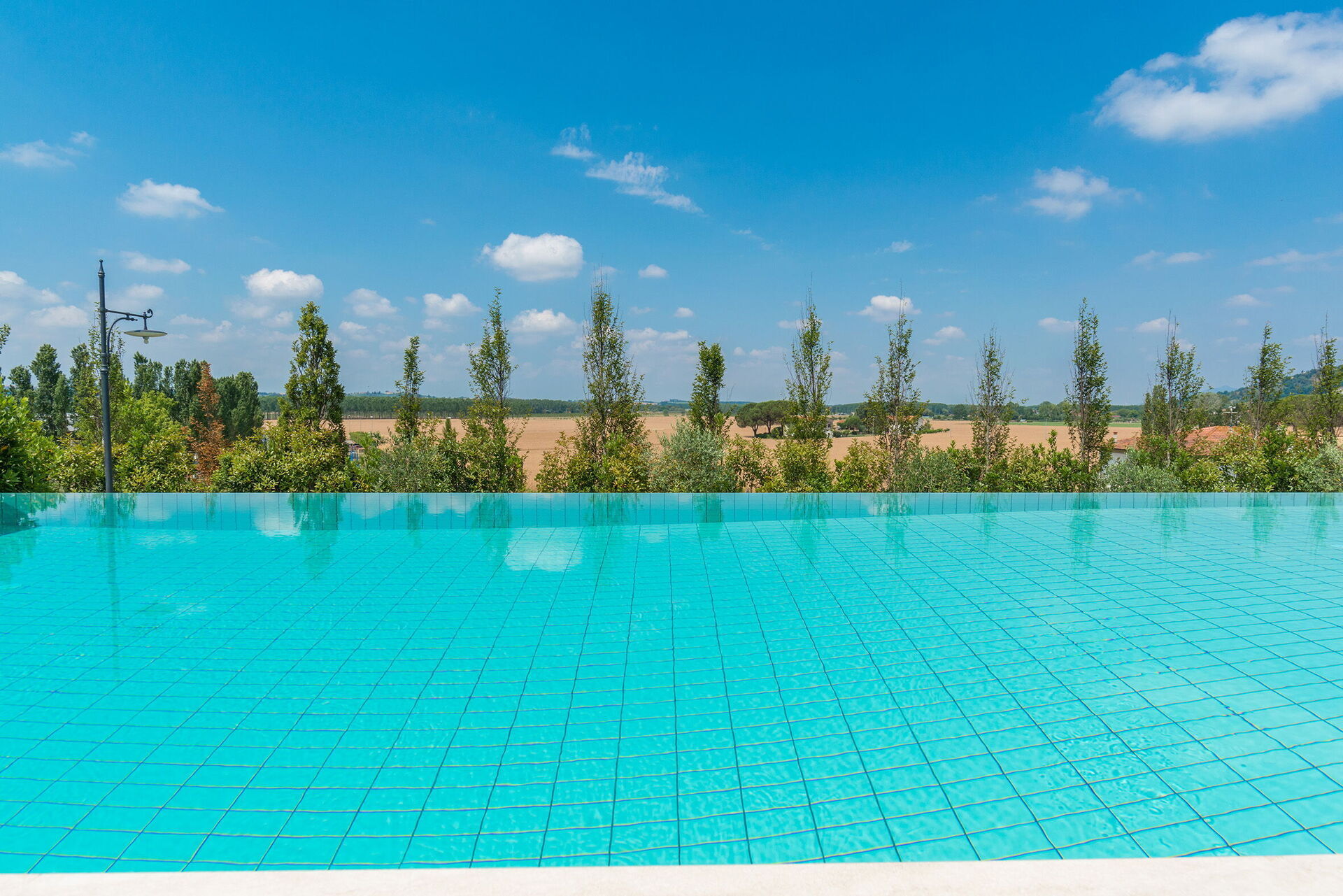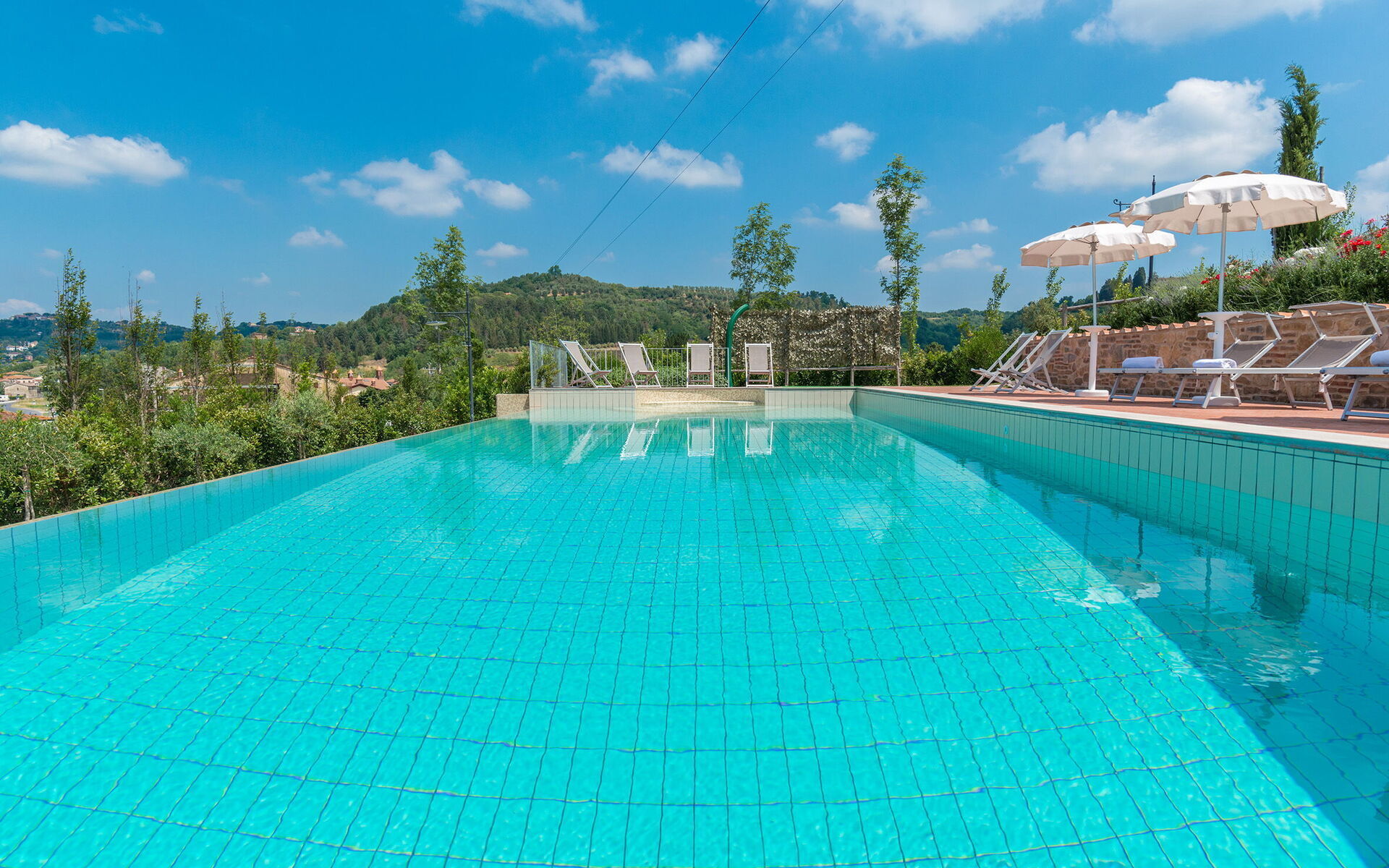 Au centre de la propriété se trouve une spectaculaire piscine à débordement dans un cadre panoramique privé. Ici, tu peux profiter du soleil toscan, admirer les vignobles en contrebas et respirer le parfum de la lavande et du romarin qui embaume la brise chaude.
