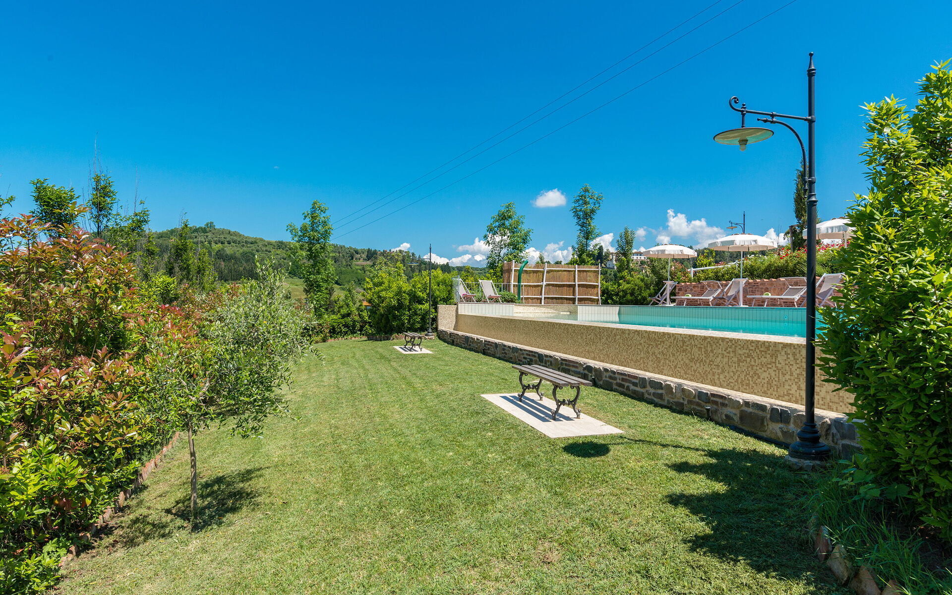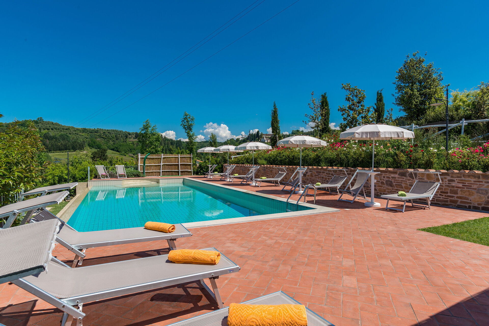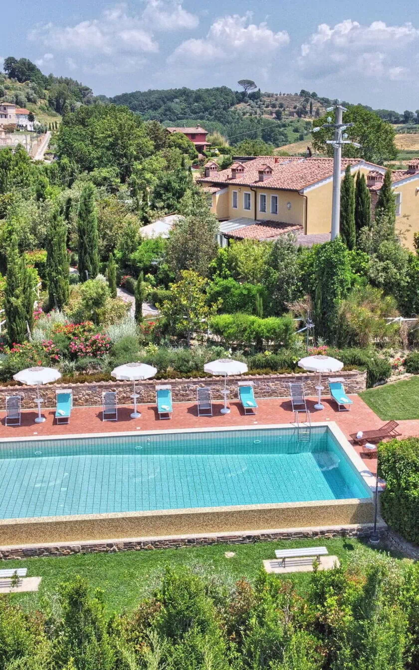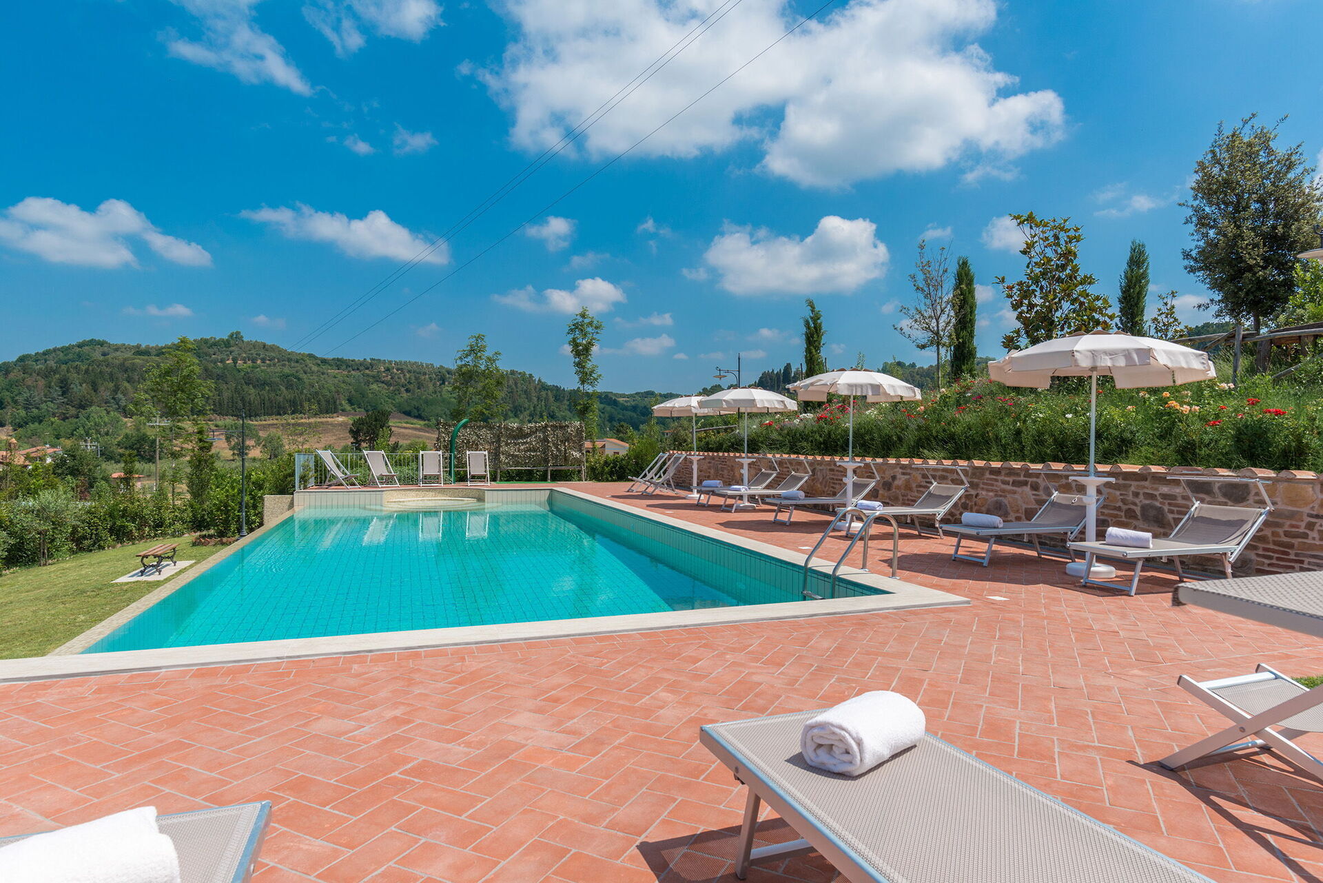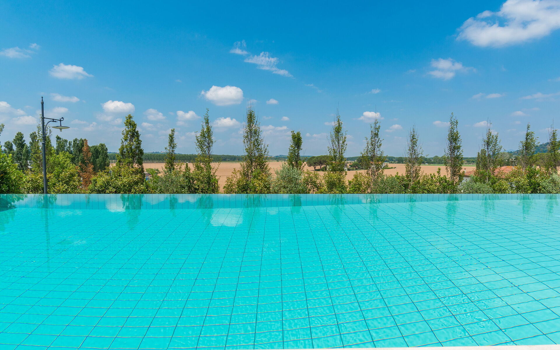 Au centre de la propriété se trouve une spectaculaire piscine à débordement dans un cadre panoramique privé. Ici, tu peux profiter du soleil toscan, admirer les vignobles en contrebas et respirer le parfum de la lavande et du romarin qui embaume la brise chaude.