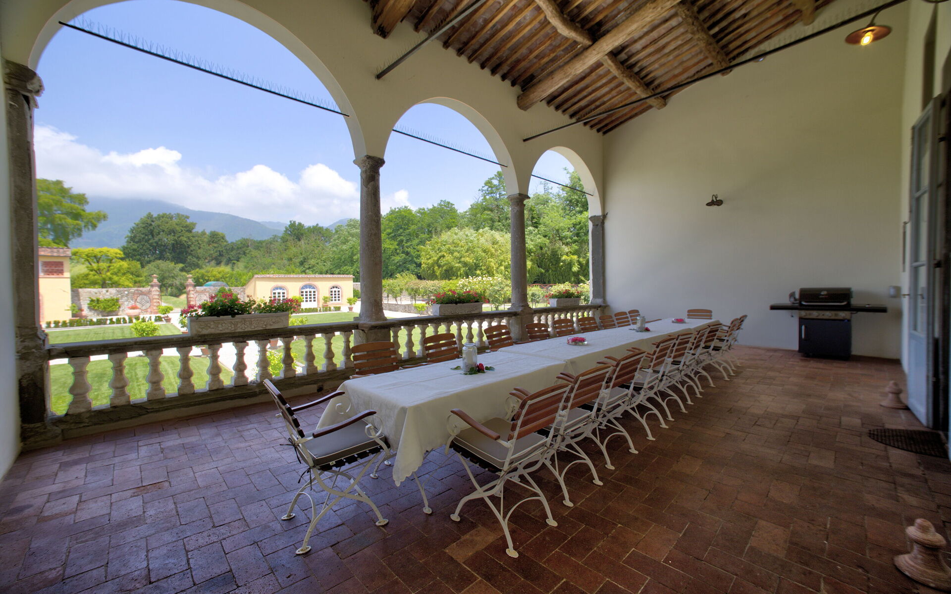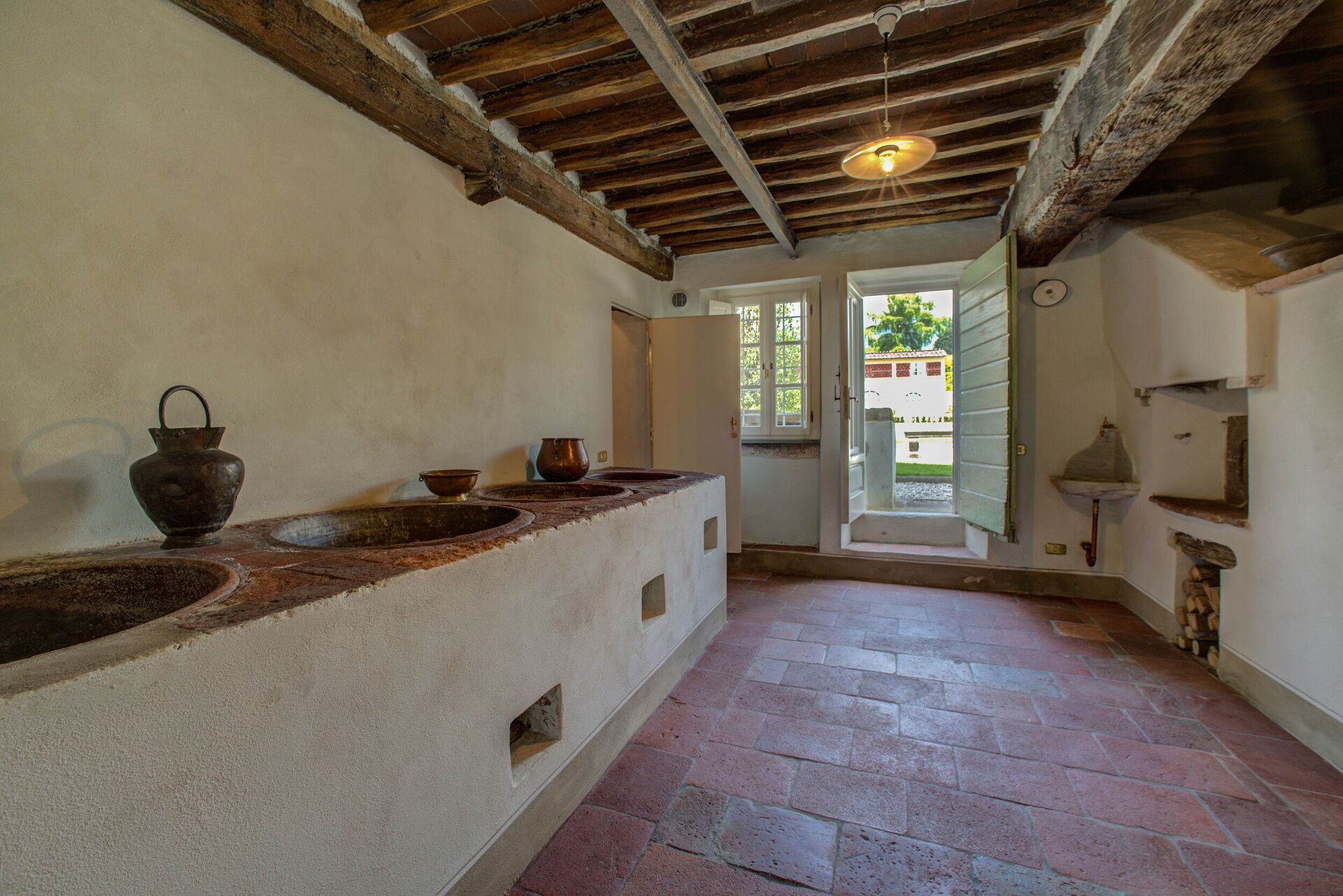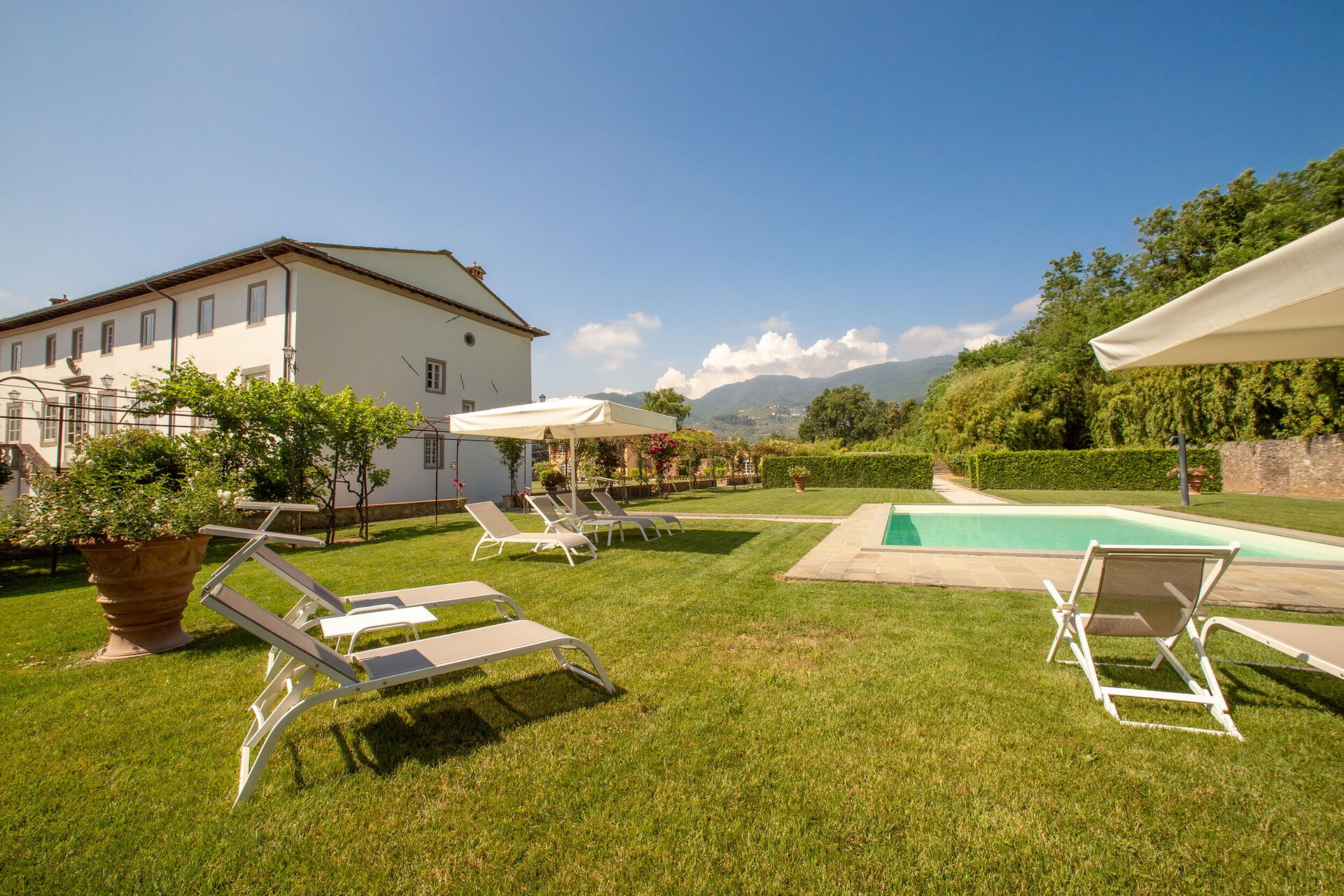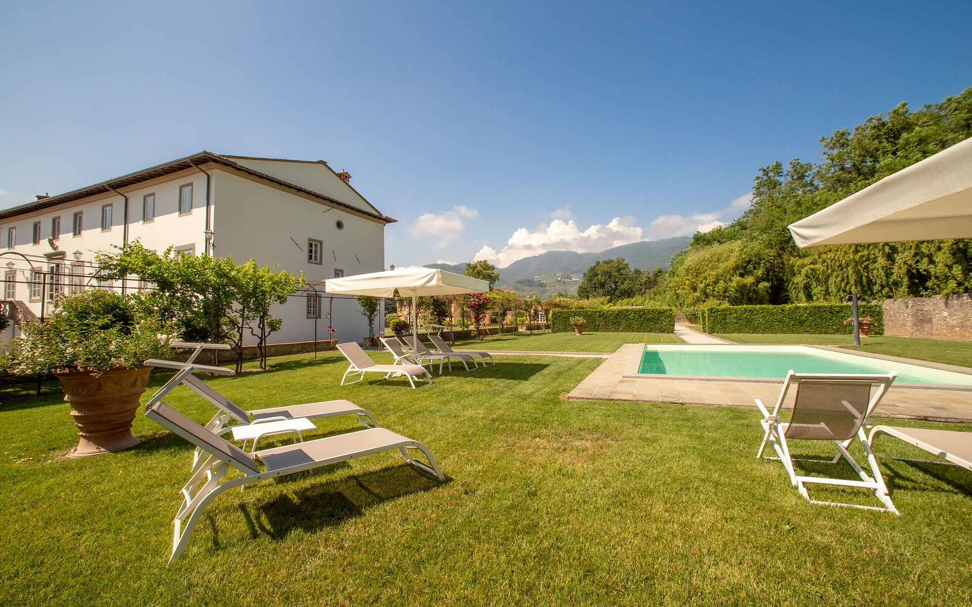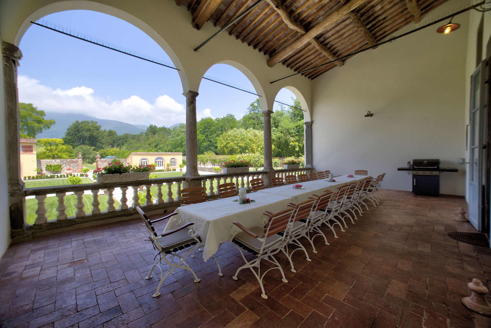 lavori di ricostruzione e consolidamento, i giardini e gli orti sono stati riprodotti secondo le informazioni orti sono riprodotti secondo le informazioni disponibili sul tipico stile lucchese delle ville. Stile lucchese delle ville fuori dalle mura. L'architettura richiama lo stile del stile quattrocentesco con la scala d'ingresso a due livelli sulla facciata principale, con balaustra e colonne in pietra e la loggia a tre archi di tipico ordine toscano che si affaccia sulla facciata posteriore. Ordine toscano che si affaccia sulla facciata posteriore. La proprietà dispone di un parco con alberi secolari, splendide piante mediterranee e un giardino di frutta. E un giardino di frutta. Una galleria di rose attraversa un lato del giardino, dalla piscina (13/6 metri e un'altezza di circa 2,5 metri) e dal giardino. Piscina (13/6 metri e profonda da 1,10 a 1,60) alle limonaie, una delle quali è dotata di ping pong e biliardo. Una delle quali ha un tavolo da ping pong e da biliardo, mentre l'altra ha una cucina per le lezioni di cucina e le pizze. Lezioni di cucina e pizza party. Forno per pizza (per feste su richiesta). Queste strutture possono essere utilizzate anche per occasioni speciali o semplicemente per leggere e rilassarsi.
