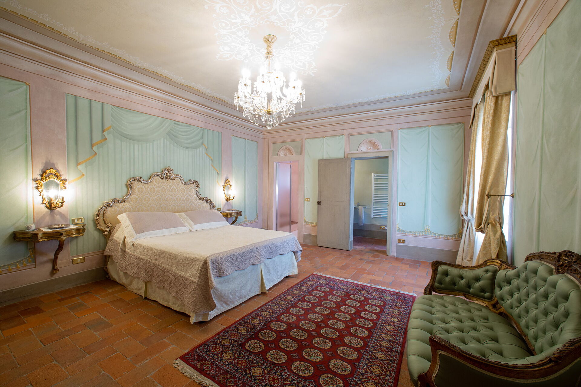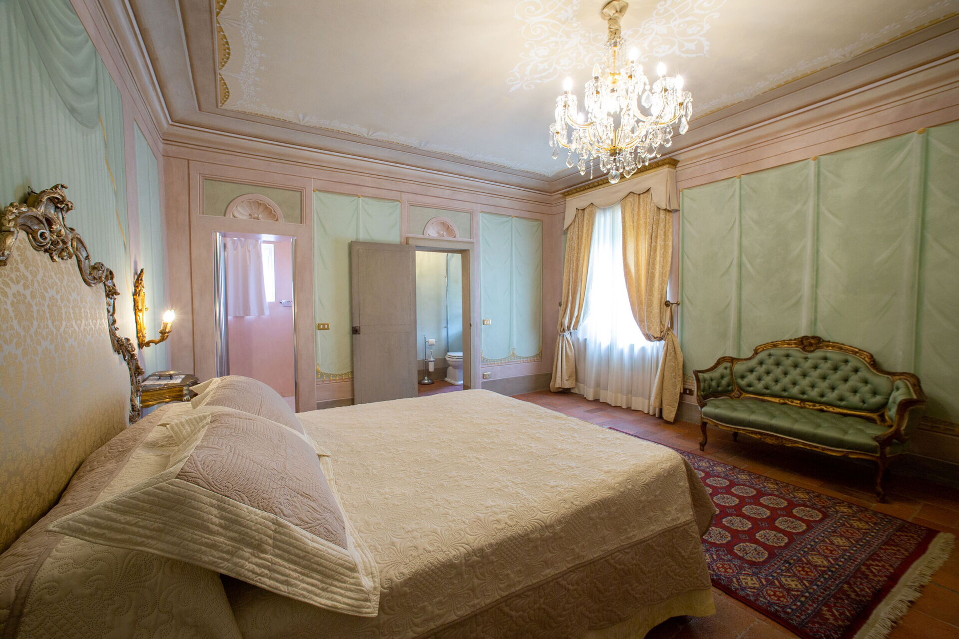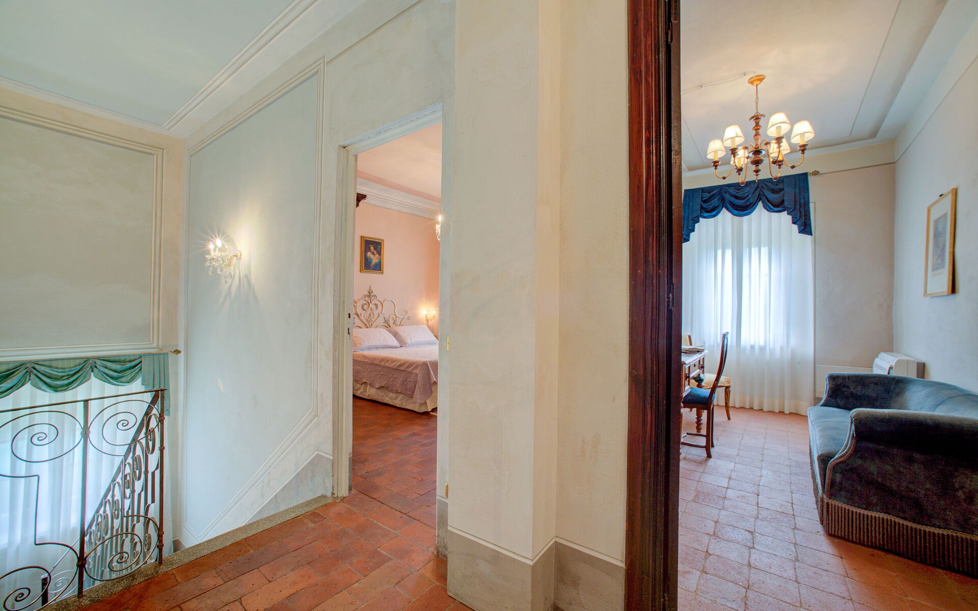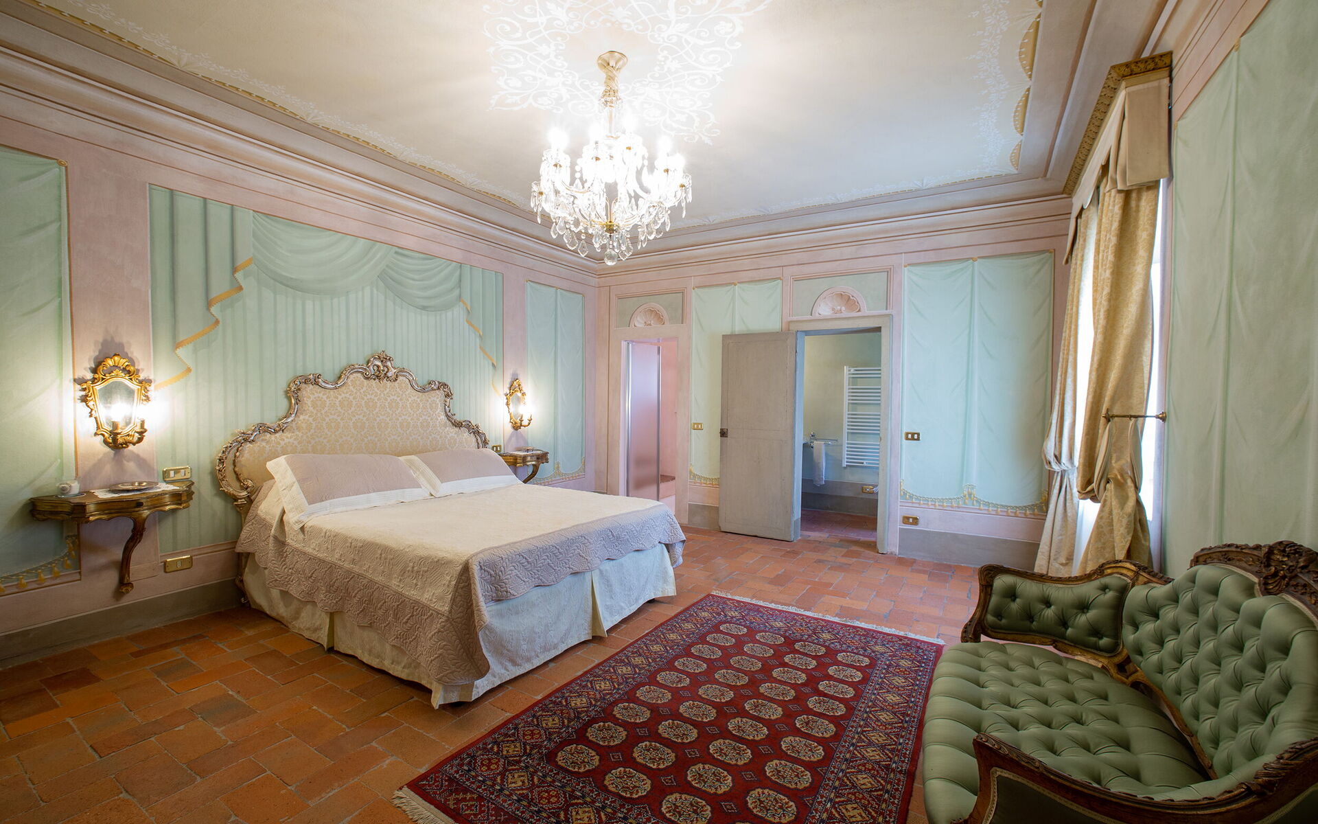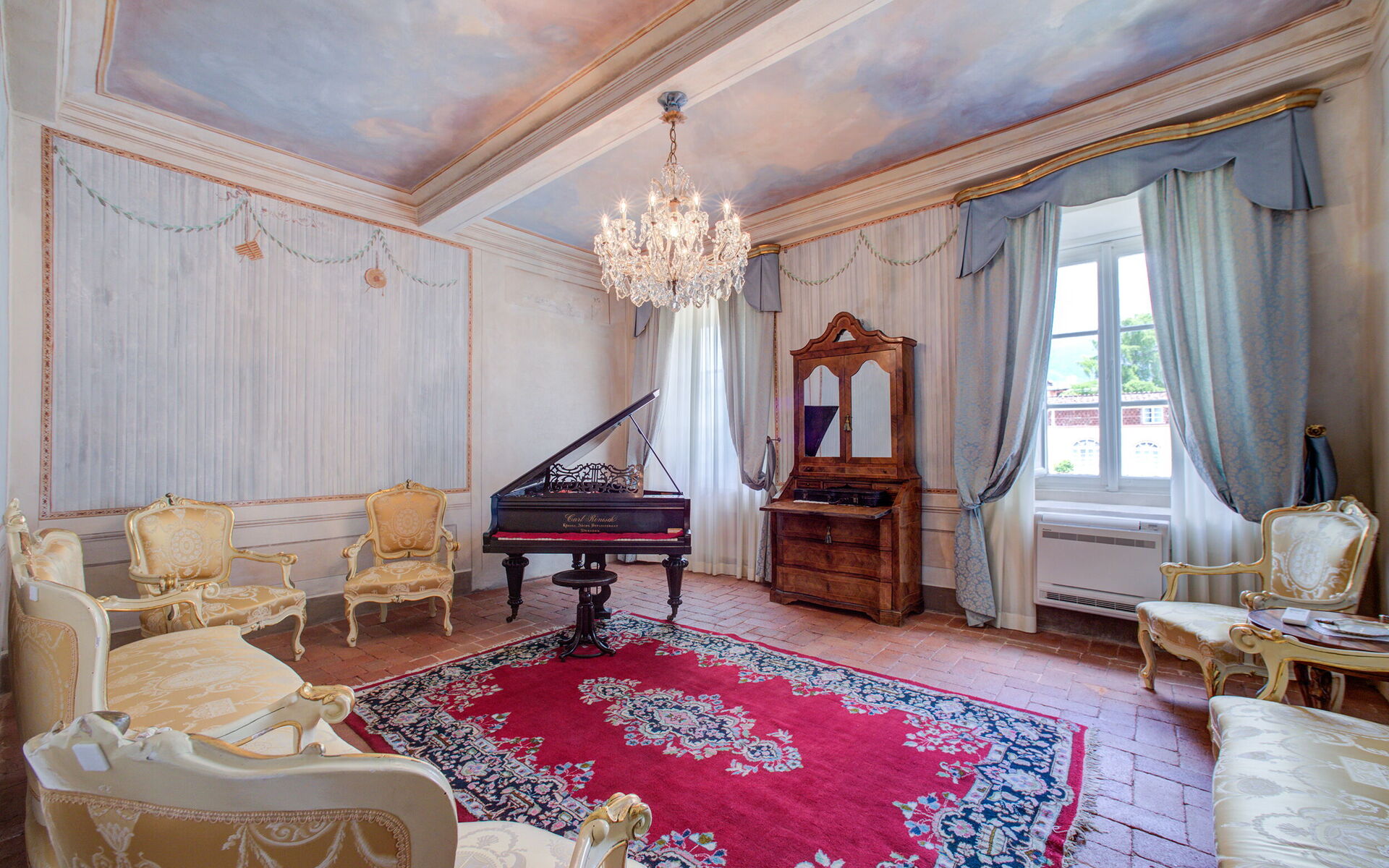 un bagno in comune, un'altra camera matrimoniale con bagno separato, una sala della musica affrescata con pianoforte, uno studio, un salotto e un bagno con doccia.