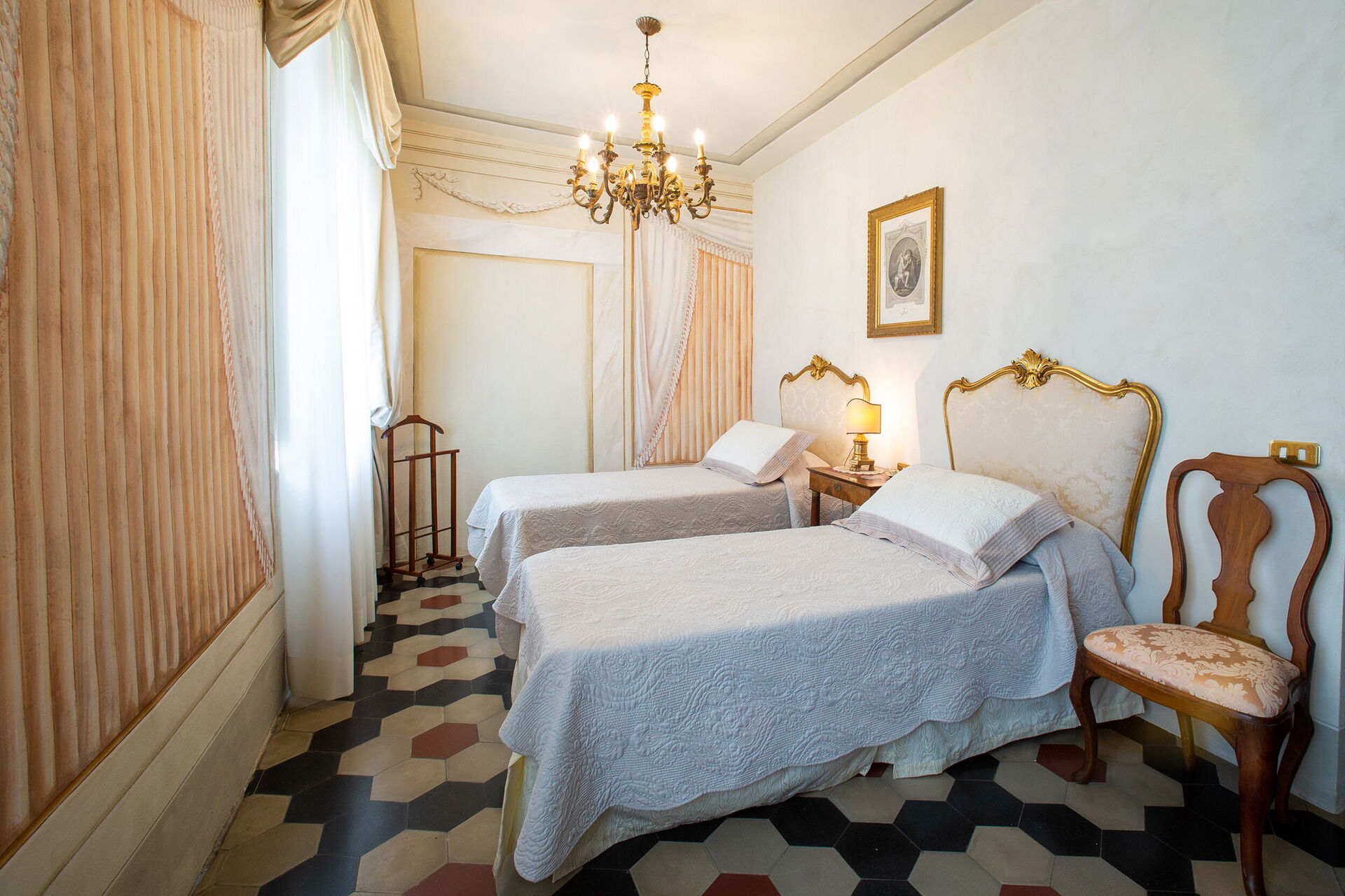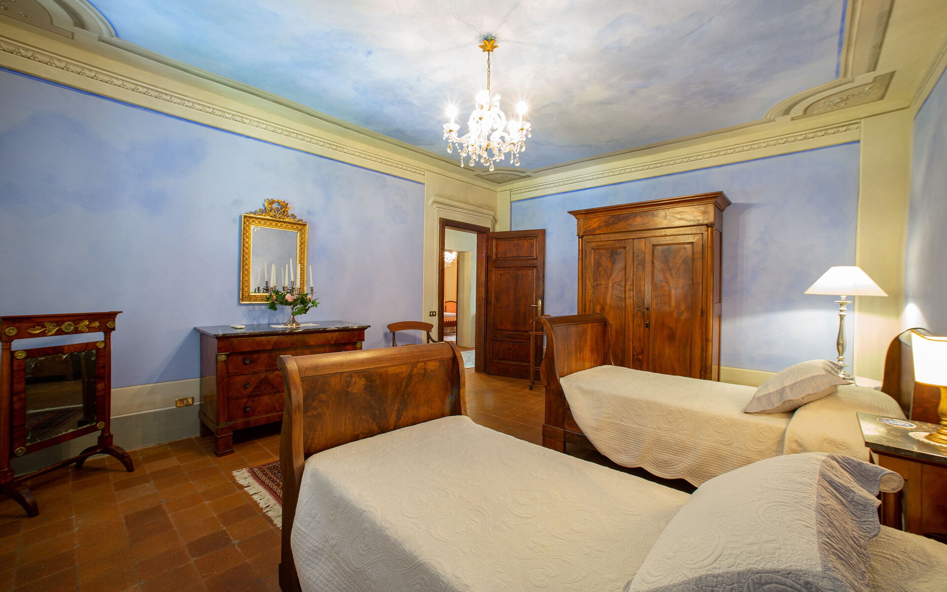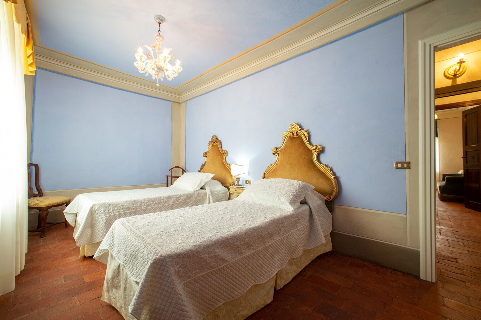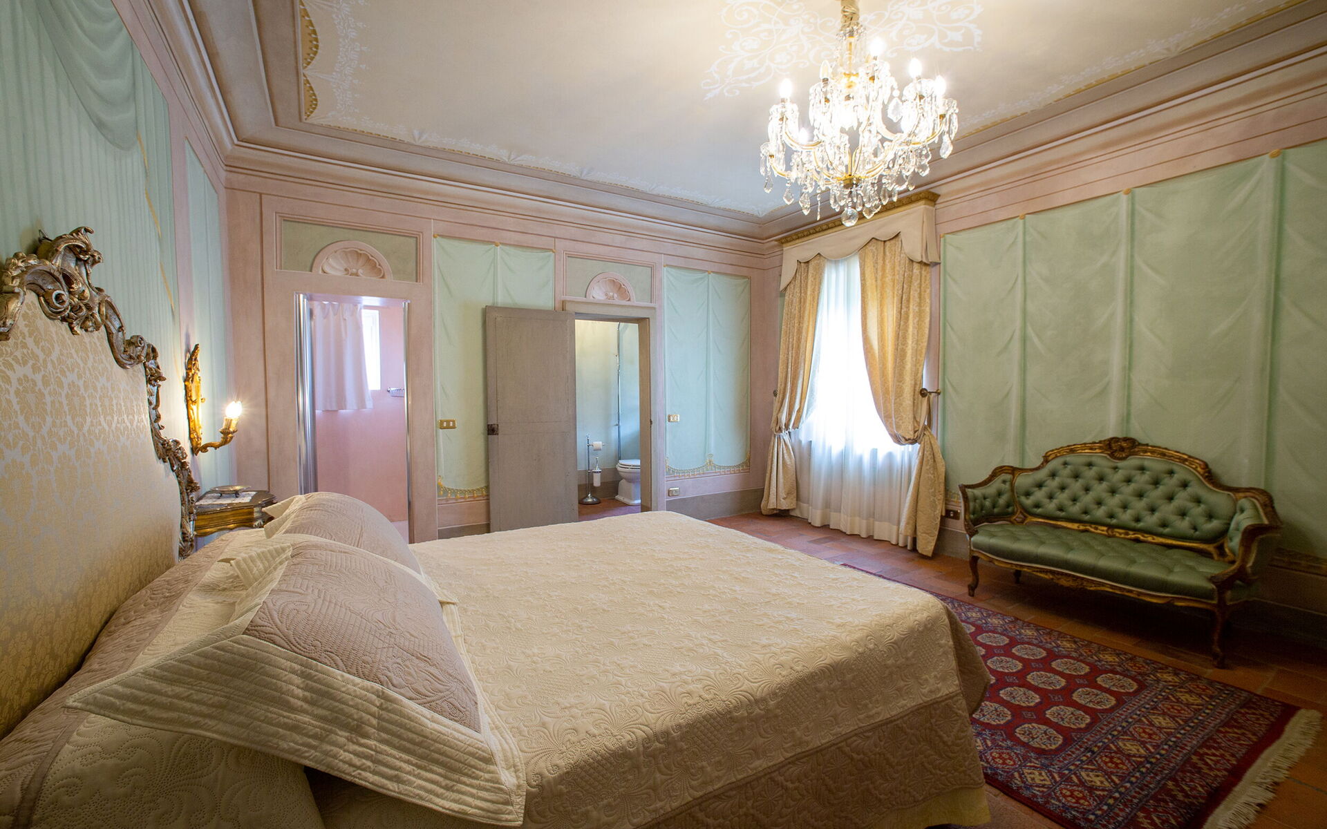 un bagno in comune, un'altra camera matrimoniale con bagno separato, una sala della musica affrescata con pianoforte, uno studio, un salotto e un bagno con doccia.