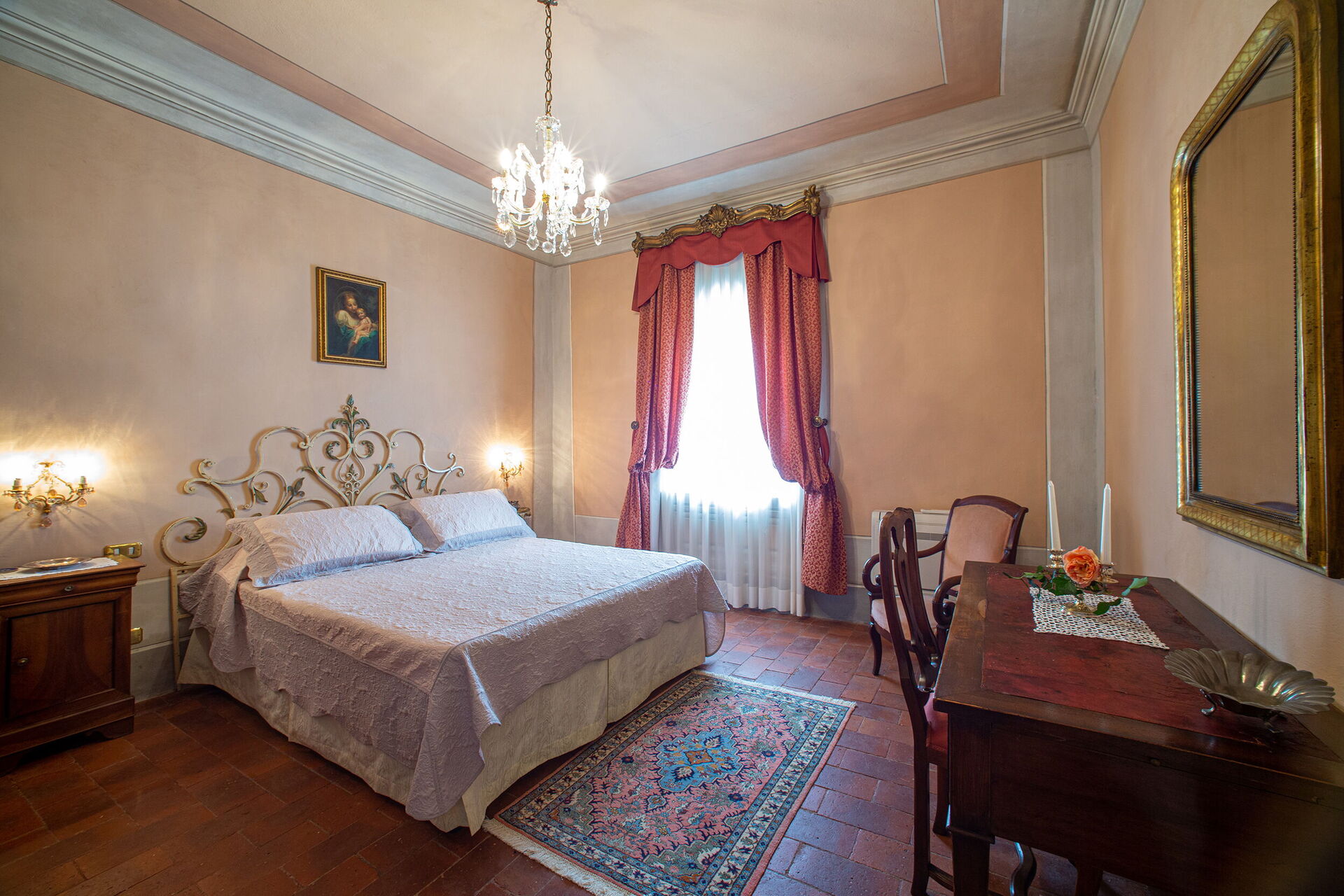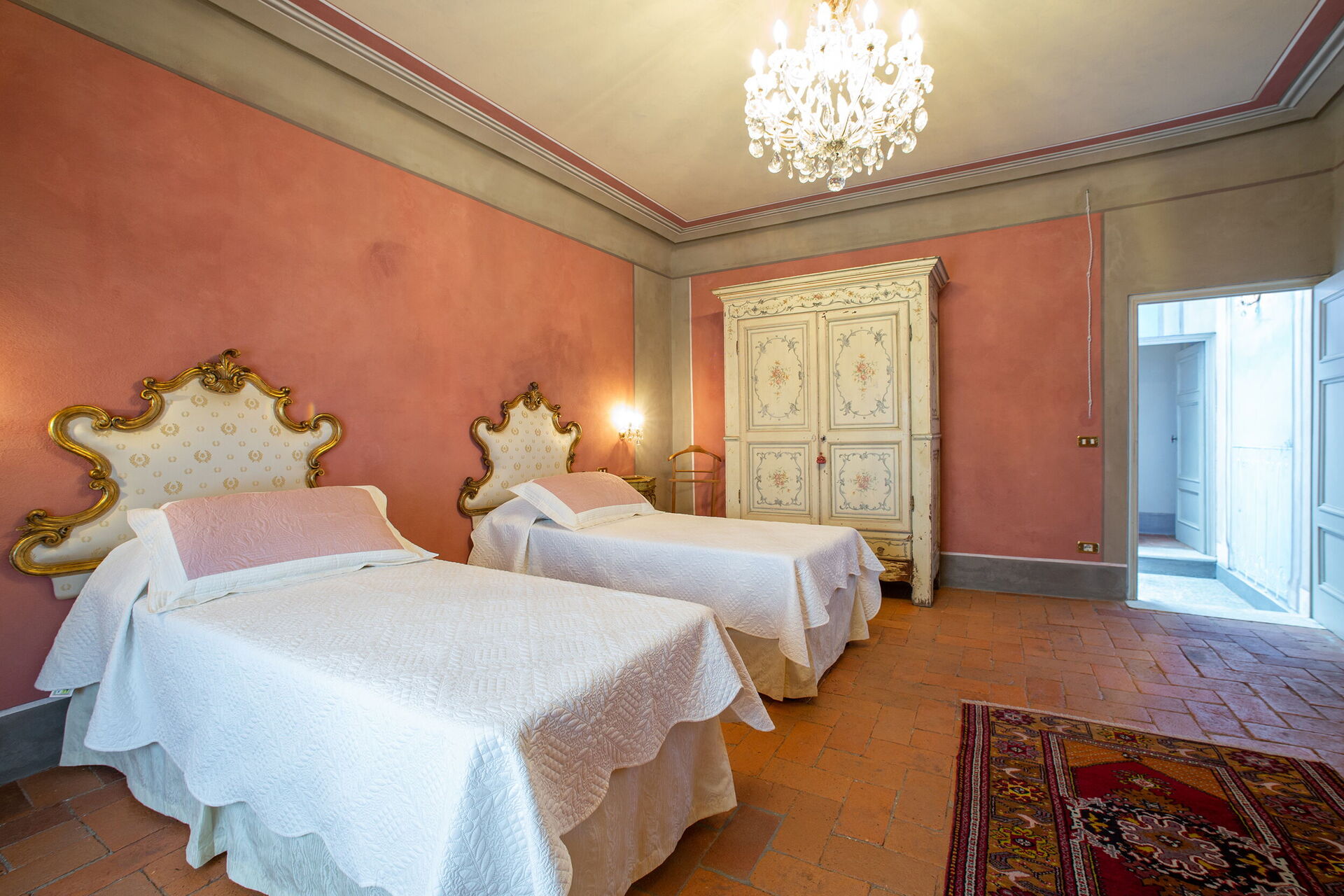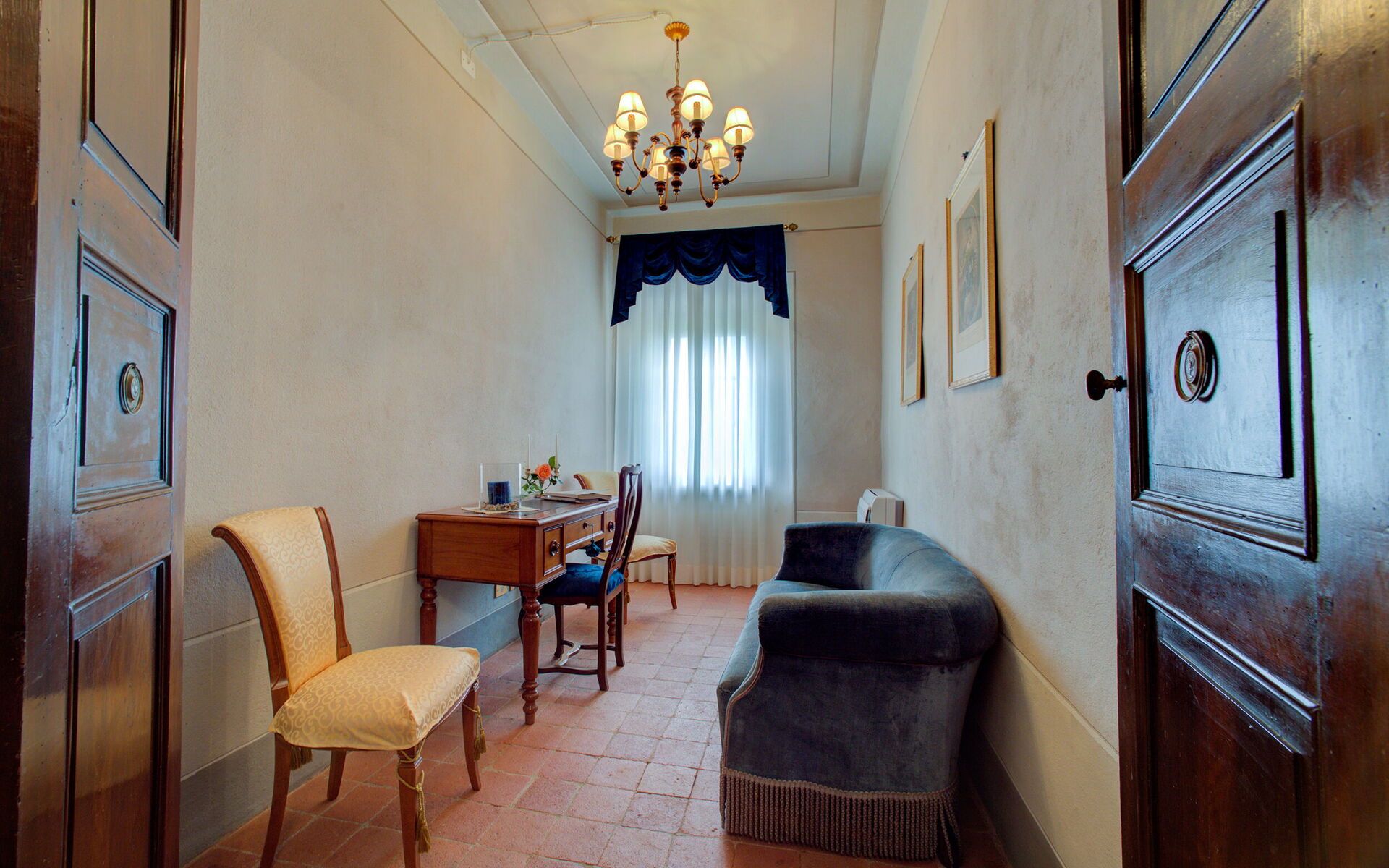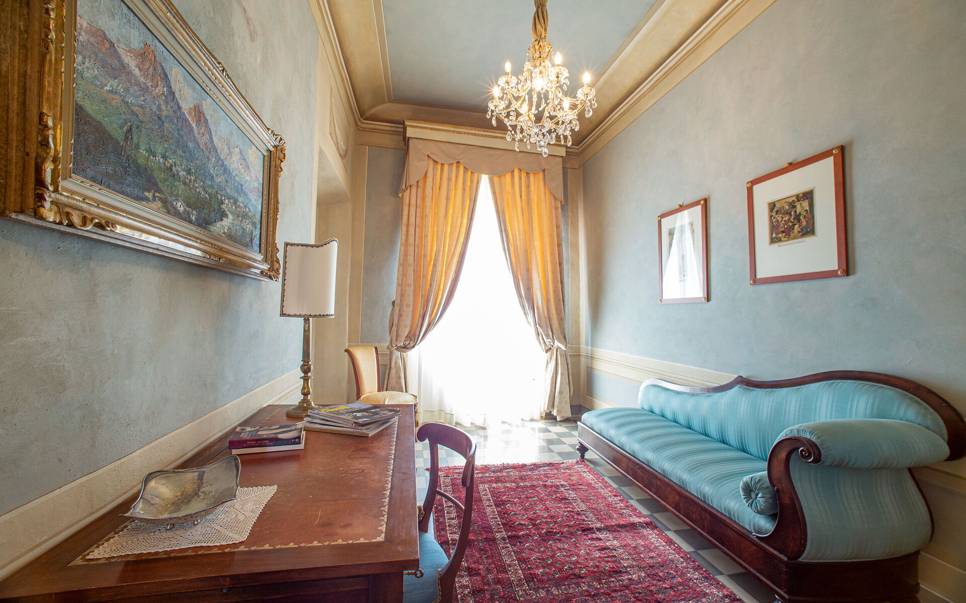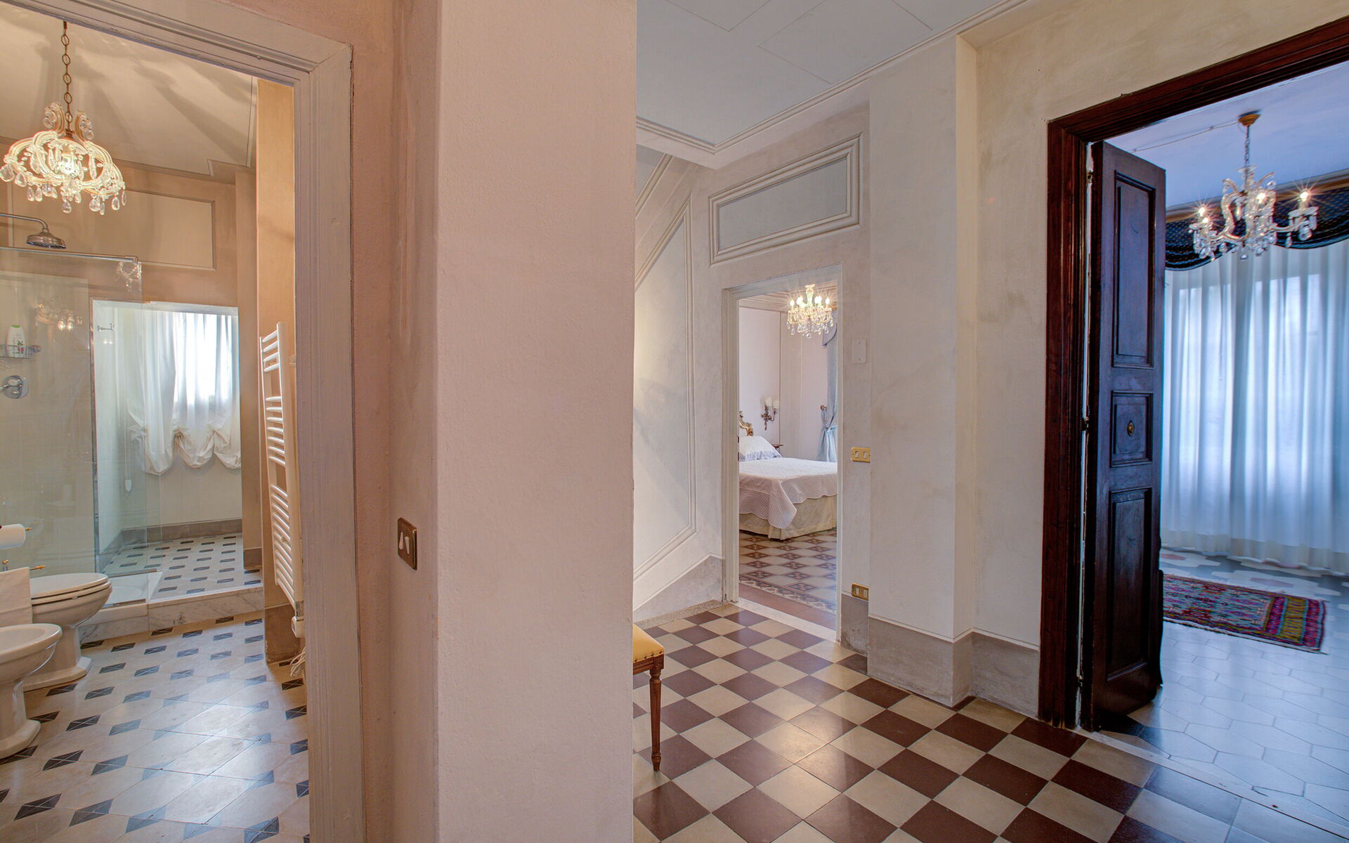 un bagno in comune, un'altra camera matrimoniale con bagno separato, una sala della musica affrescata con pianoforte, uno studio, un salotto e un bagno con doccia.