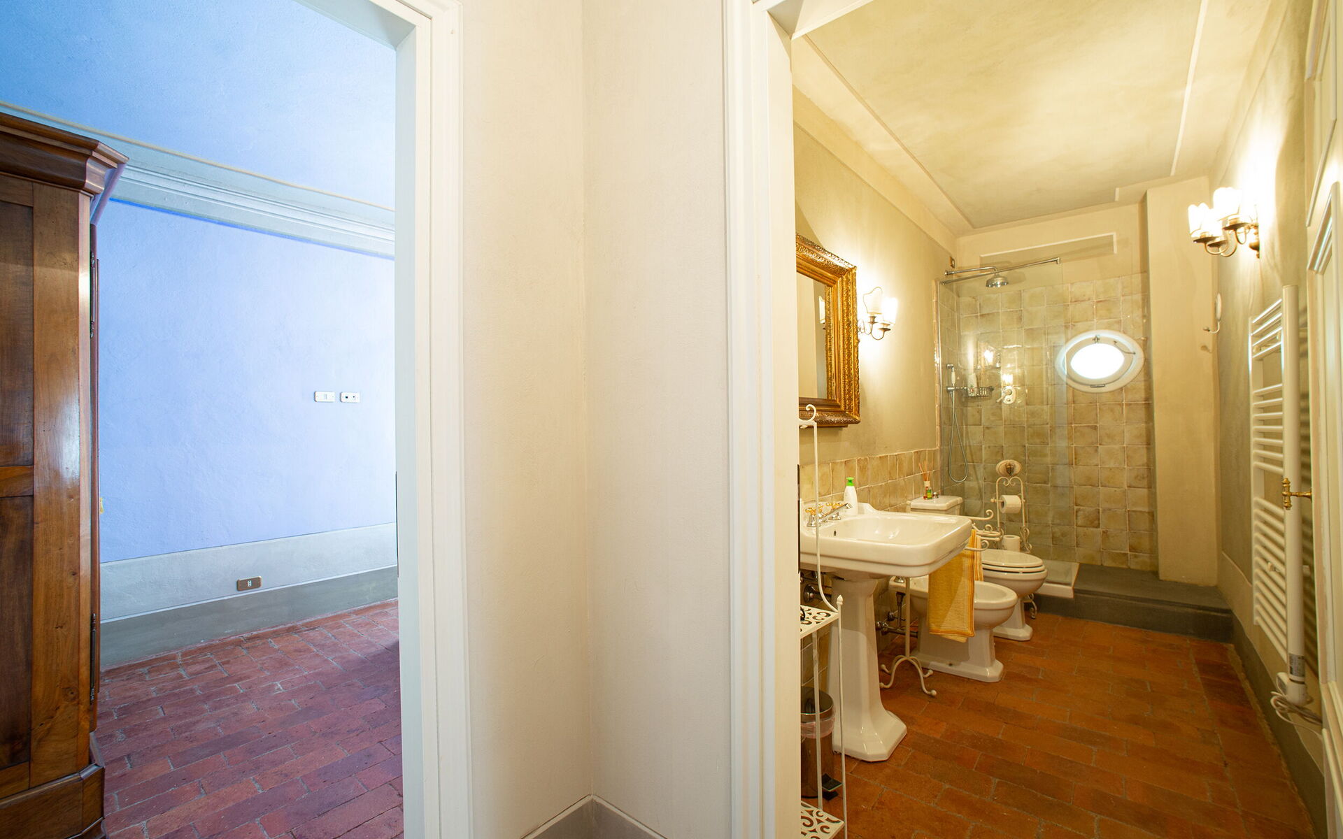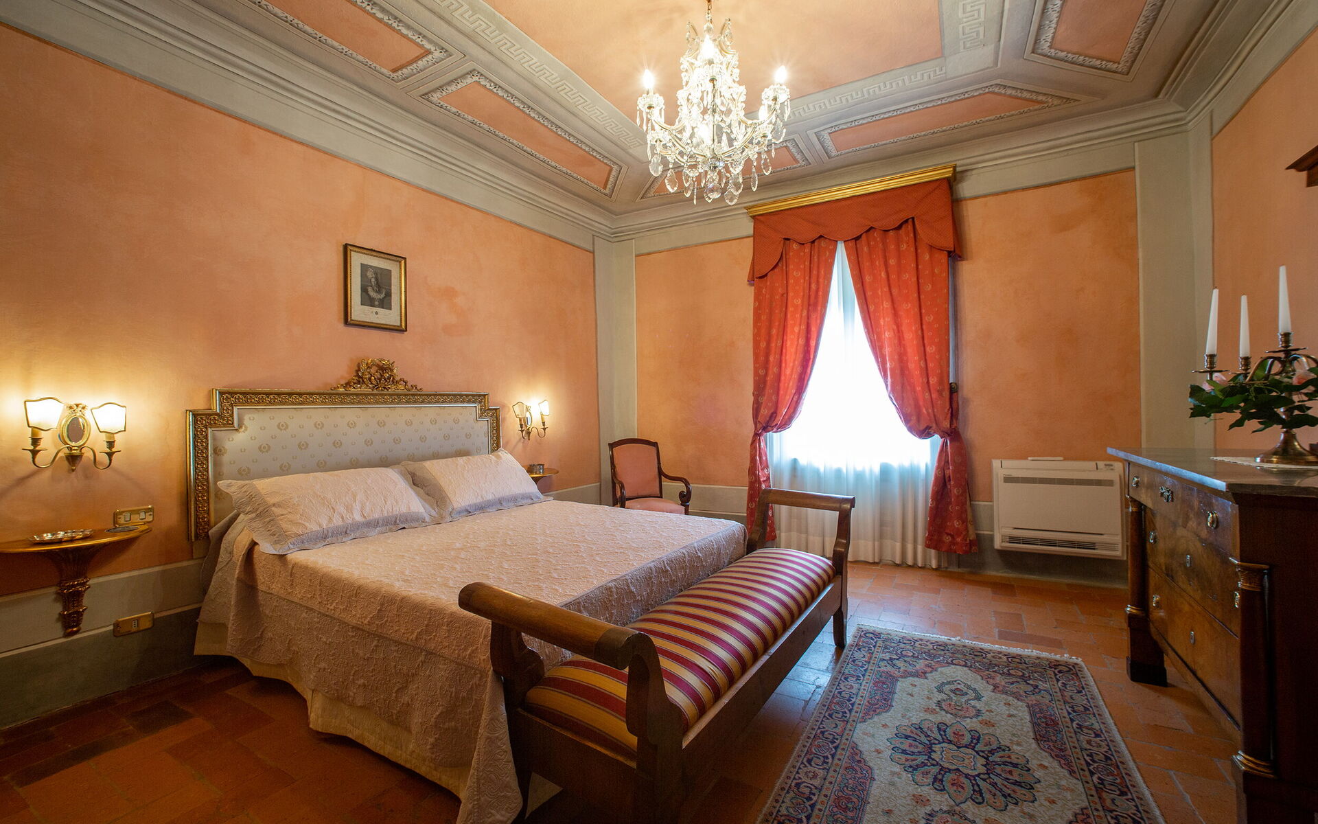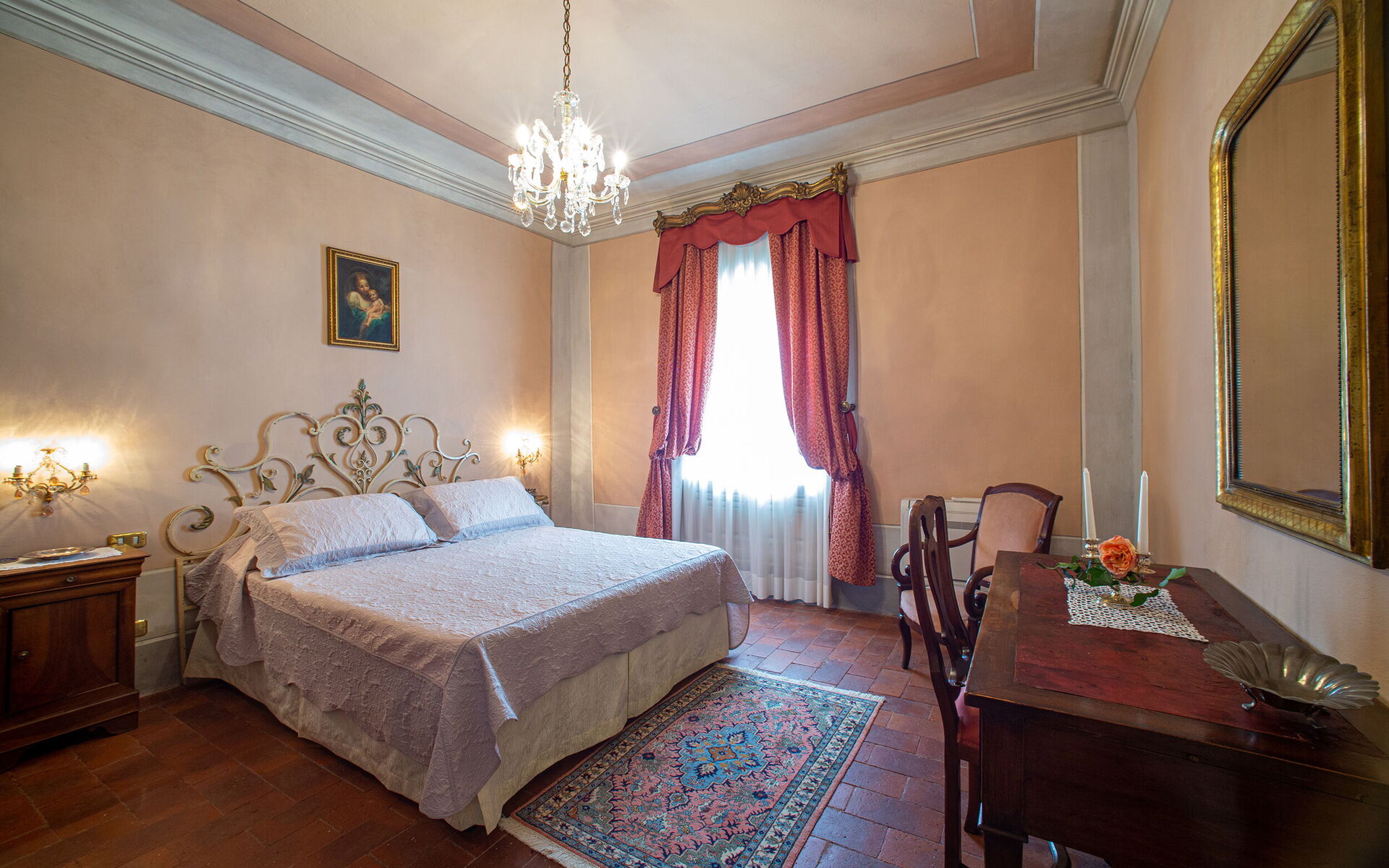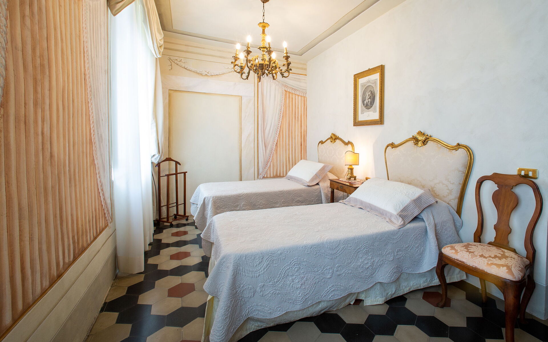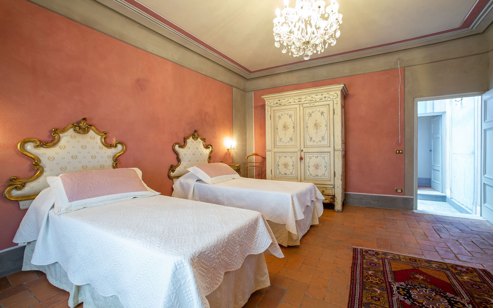 un bagno in comune, un'altra camera matrimoniale con bagno separato, una sala della musica affrescata con pianoforte, uno studio, un salotto e un bagno con doccia.