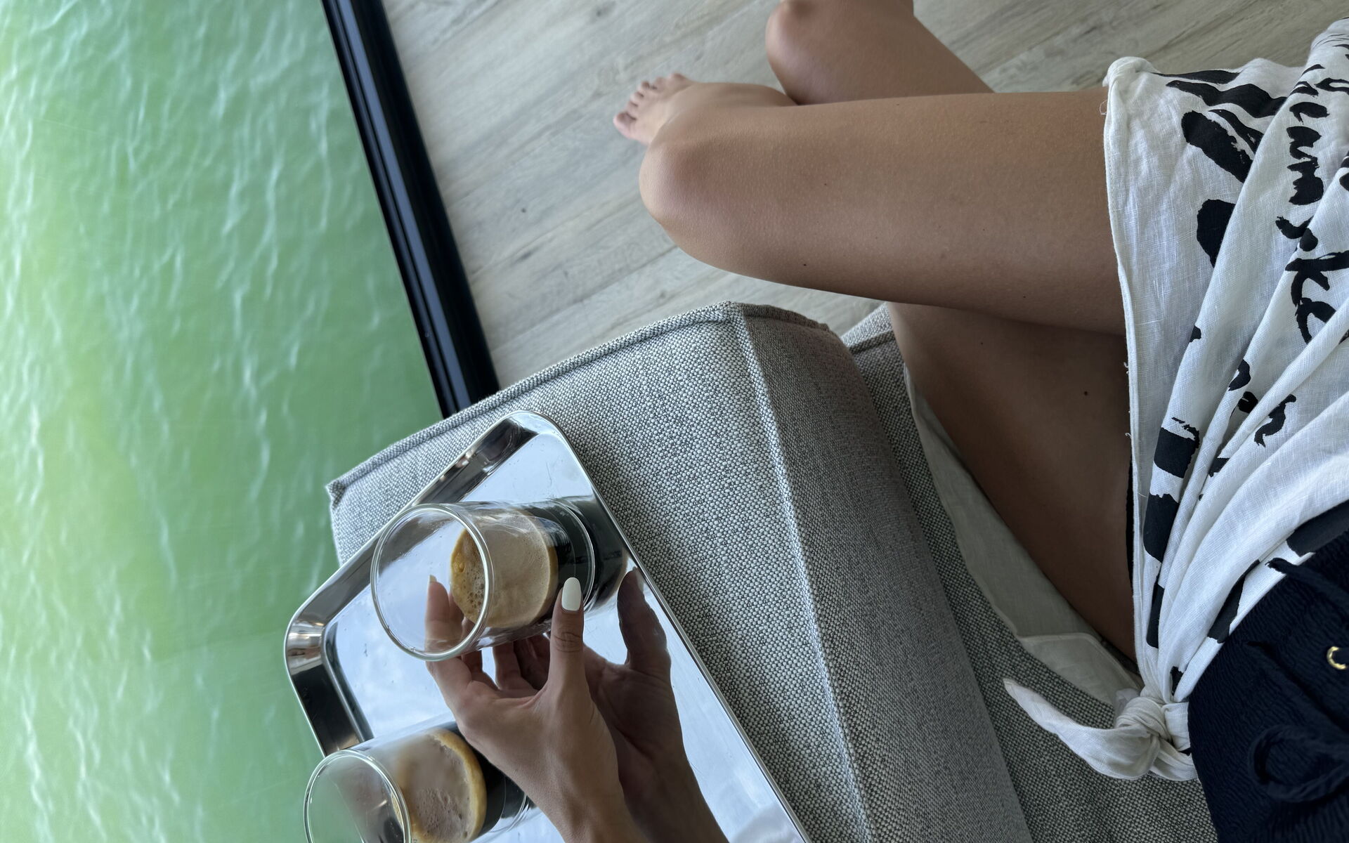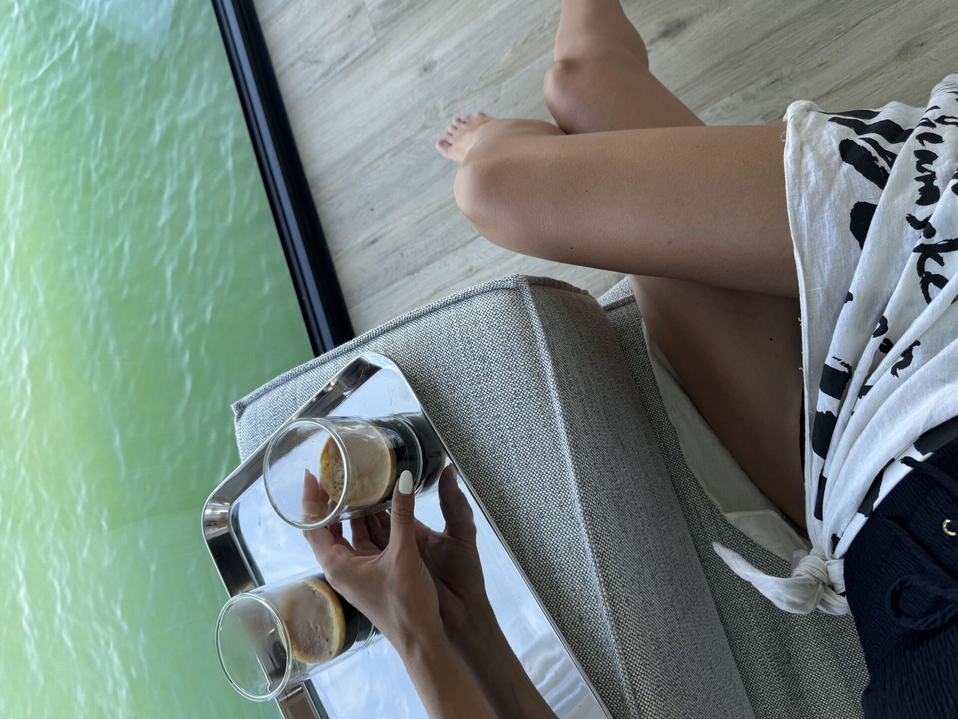 La zona giorno a pianta aperta è ampia e accogliente, con un divano di lusso perfettamente posizionato per ammirare le ampie vedute della laguna. Sia che tu voglia rilassarti che ospitare, lo spazio è stato progettato per garantire comfort e versatilità. Una cucina moderna e completamente attrezzata invita all'esplorazione culinaria, oppure puoi goderti un'esperienza gastronomica personalizzata con uno chef privato.
