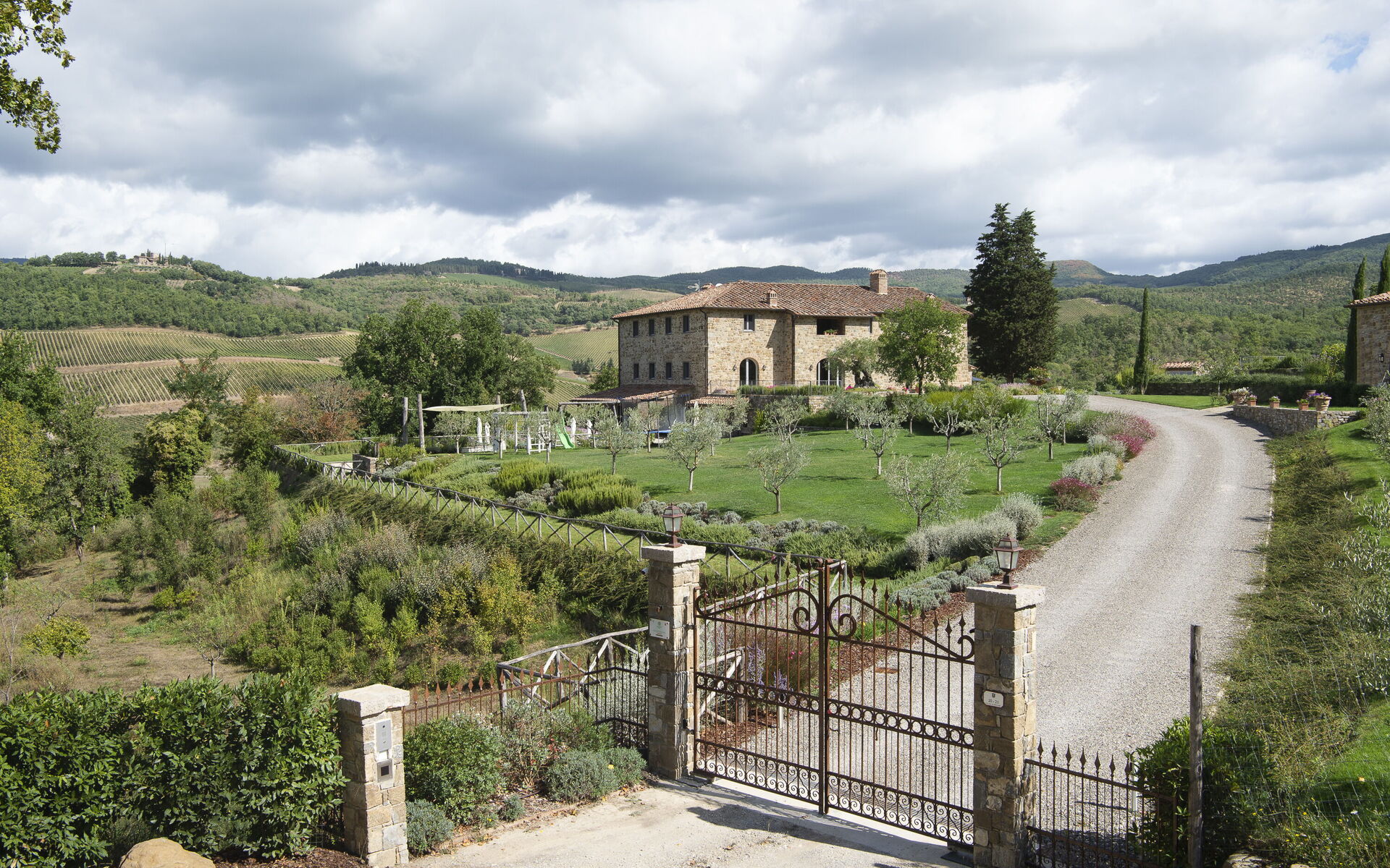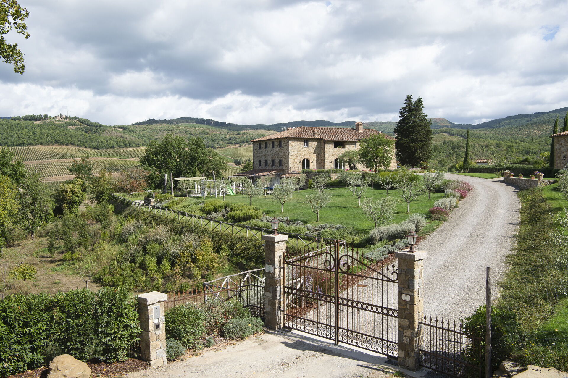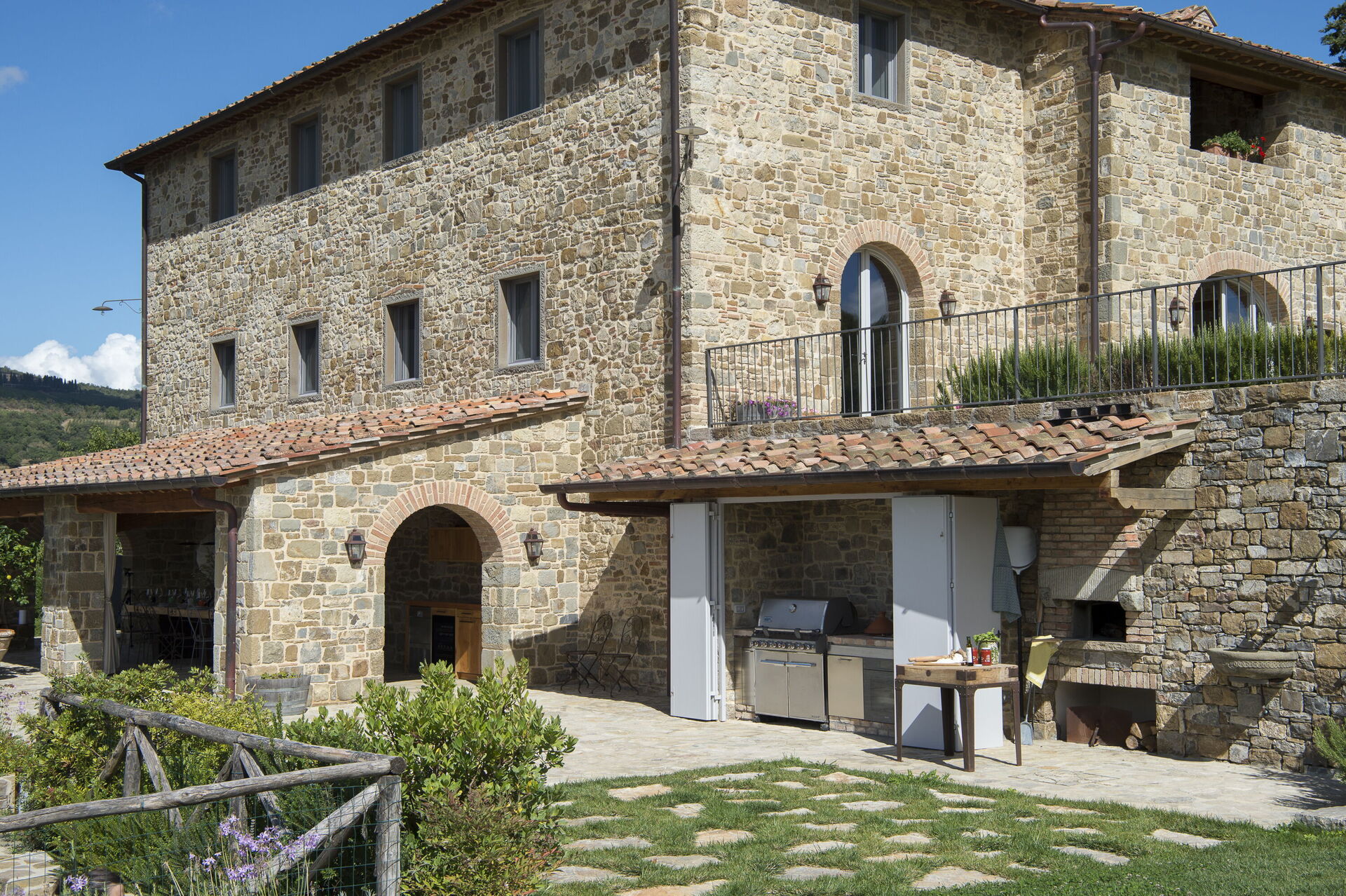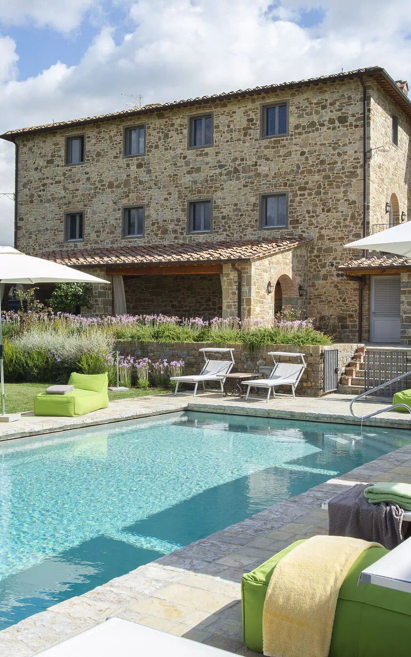 Every season is perfect for a trip to Chianti, that hilly area of Tuscany world famous for its picturesque landscapes and excellent wines. The scene is worthy of a postcard: vineyards, flowering trees, green fields and cypress trees shading the antique stone farmhouses. We must also remember that these hills in Chianti are hosts to medieval villages, antique villas and abbeys. Pianvecchio is a charming, panoramic wine estate in the rolling hills of Radda in Chianti which looks out over vineyards and olive groves. The property has been reconstructed and brought up to date with all modern technology and comforts. The centuries old stone villa was originally a defence lookout point looking out over the valley. In the immediate area of the town of Radda, guests can easily explore the unique regions of Florence, Siena, San Gimignano and Chianti or relax at the villa enjoying wine tastings, the gym and wellness area around the pool. The reconstruction offers modern comforts whilst retaining the historic characteristics and the original materials. There are archways, vaulted ceilings, irregular stone walls and large windows which give light and views onto the surrounding hills and give witness to the the century old development aim an atmosphere of peace and tranquillity. To the left of the villa there is the kitchen leading onto a patio with bbq, pizza oven and an “al fresco” dining area. On this side there is the garden area with pool, umbrellas, deck chairs, and children’s games. On the other side if the villa there is a delightful gazebo with tables and chairs, ideal for breakfast or dinner in peace and quiet. The Carleone wines of the vineyard have received many prizes and the olive oil is delicious. The property is completely enclosed.