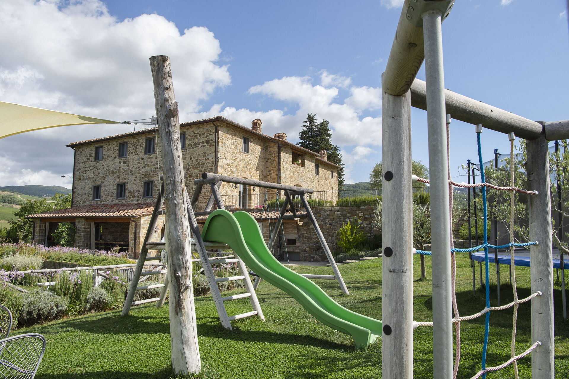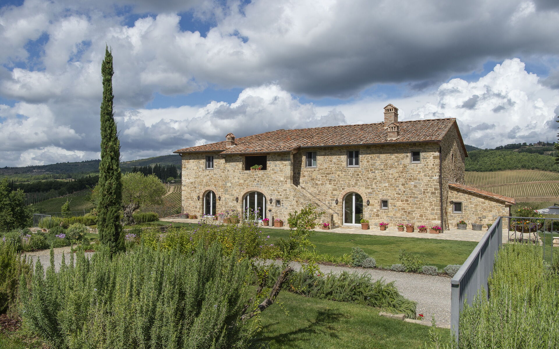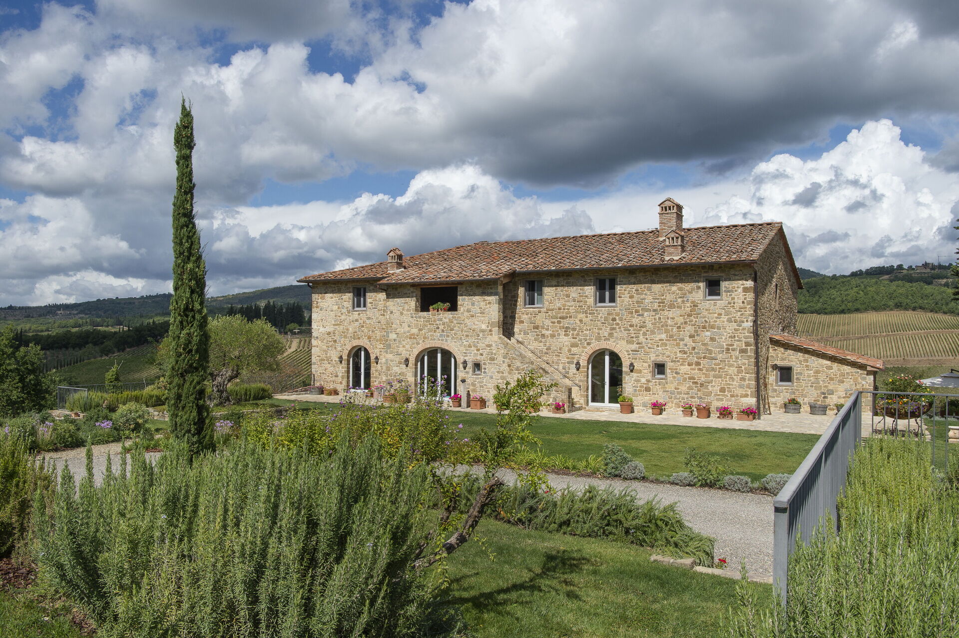 Every season is perfect for a trip to Chianti, that hilly area of Tuscany world famous for its picturesque landscapes and excellent wines. The scene is worthy of a postcard: vineyards, flowering trees, green fields and cypress trees shading the antique stone farmhouses. We must also remember that these hills in Chianti are hosts to medieval villages, antique villas and abbeys. Pianvecchio is a charming, panoramic wine estate in the rolling hills of Radda in Chianti which looks out over vineyards and olive groves. The property has been reconstructed and brought up to date with all modern technology and comforts. The centuries old stone villa was originally a defence lookout point looking out over the valley. In the immediate area of the town of Radda, guests can easily explore the unique regions of Florence, Siena, San Gimignano and Chianti or relax at the villa enjoying wine tastings, the gym and wellness area around the pool. The reconstruction offers modern comforts whilst retaining the historic characteristics and the original materials. There are archways, vaulted ceilings, irregular stone walls and large windows which give light and views onto the surrounding hills and give witness to the the century old development aim an atmosphere of peace and tranquillity. To the left of the villa there is the kitchen leading onto a patio with bbq, pizza oven and an “al fresco” dining area. On this side there is the garden area with pool, umbrellas, deck chairs, and children’s games. On the other side if the villa there is a delightful gazebo with tables and chairs, ideal for breakfast or dinner in peace and quiet. The Carleone wines of the vineyard have received many prizes and the olive oil is delicious. The property is completely enclosed.
