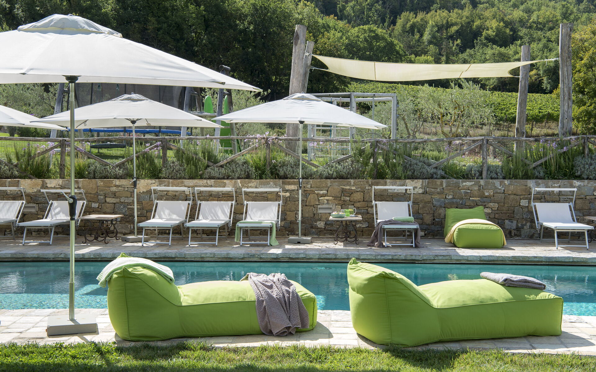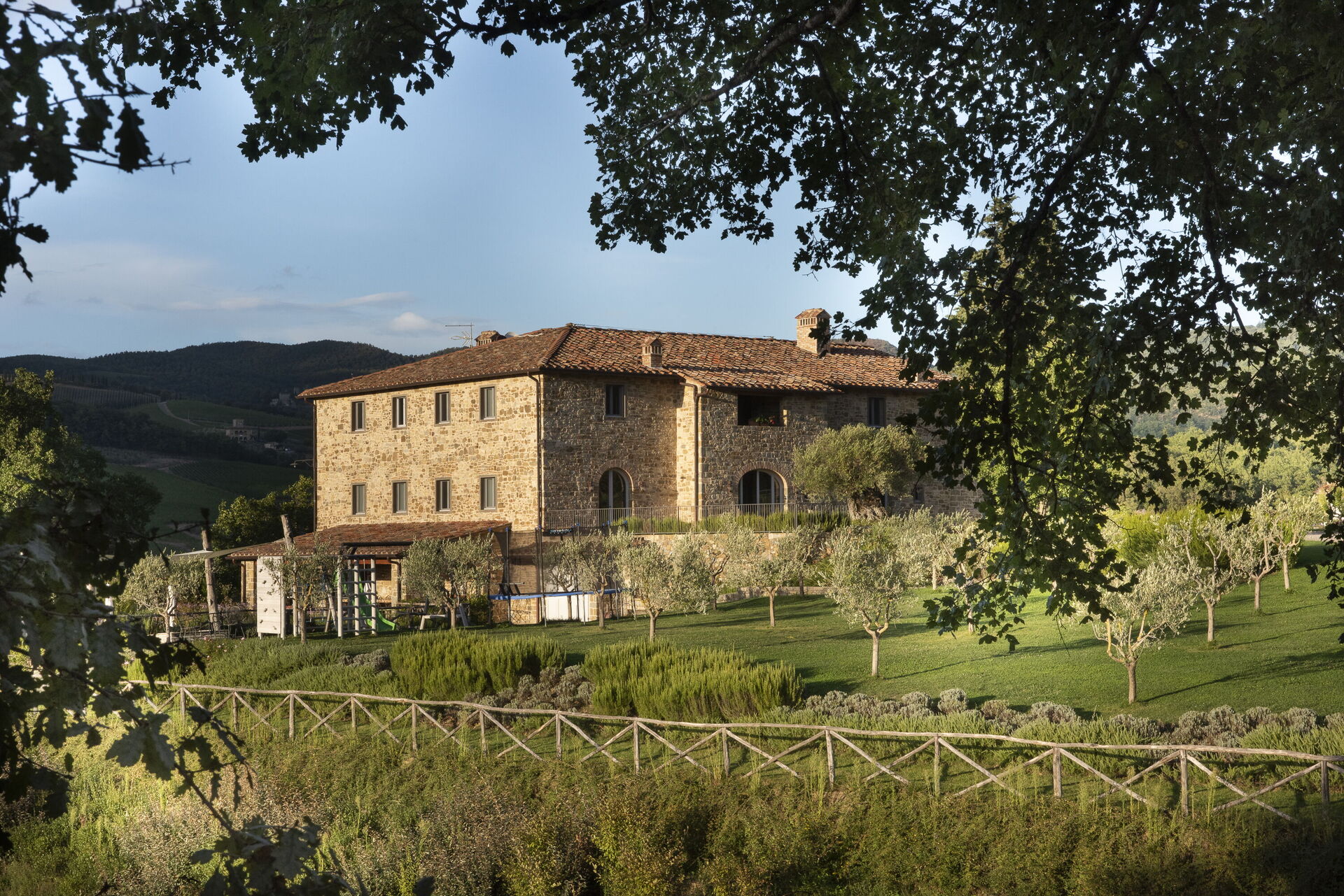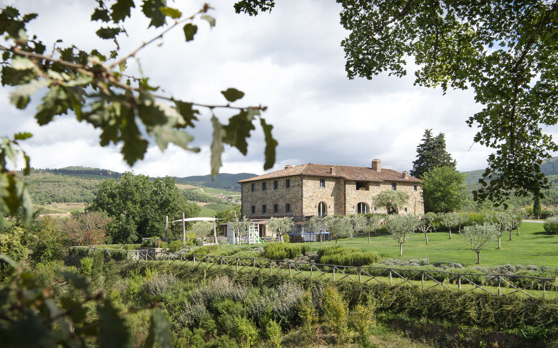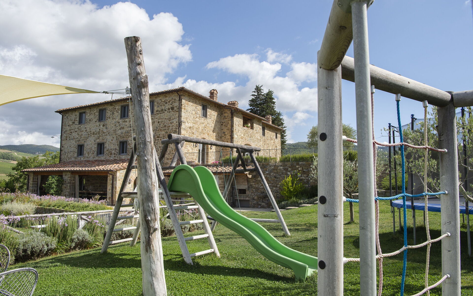 Every season is perfect for a trip to Chianti, that hilly area of Tuscany world famous for its picturesque landscapes and excellent wines. The scene is worthy of a postcard: vineyards, flowering trees, green fields and cypress trees shading the antique stone farmhouses. We must also remember that these hills in Chianti are hosts to medieval villages, antique villas and abbeys. Pianvecchio is a charming, panoramic wine estate in the rolling hills of Radda in Chianti which looks out over vineyards and olive groves. The property has been reconstructed and brought up to date with all modern technology and comforts. The centuries old stone villa was originally a defence lookout point looking out over the valley. In the immediate area of the town of Radda, guests can easily explore the unique regions of Florence, Siena, San Gimignano and Chianti or relax at the villa enjoying wine tastings, the gym and wellness area around the pool. The reconstruction offers modern comforts whilst retaining the historic characteristics and the original materials. There are archways, vaulted ceilings, irregular stone walls and large windows which give light and views onto the surrounding hills and give witness to the the century old development aim an atmosphere of peace and tranquillity. To the left of the villa there is the kitchen leading onto a patio with bbq, pizza oven and an “al fresco” dining area. On this side there is the garden area with pool, umbrellas, deck chairs, and children’s games. On the other side if the villa there is a delightful gazebo with tables and chairs, ideal for breakfast or dinner in peace and quiet. The Carleone wines of the vineyard have received many prizes and the olive oil is delicious. The property is completely enclosed.