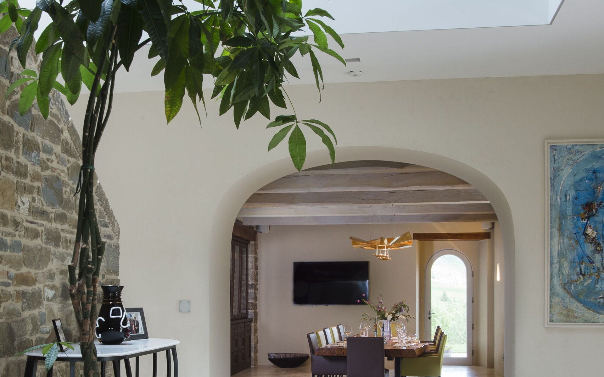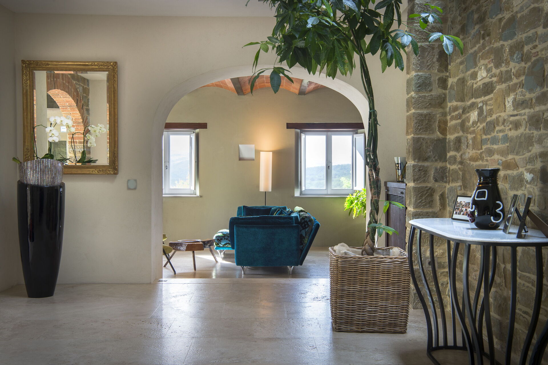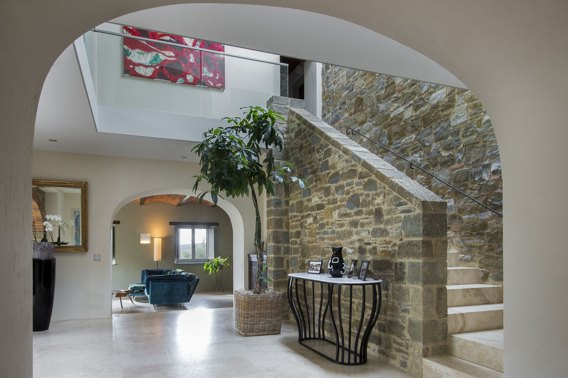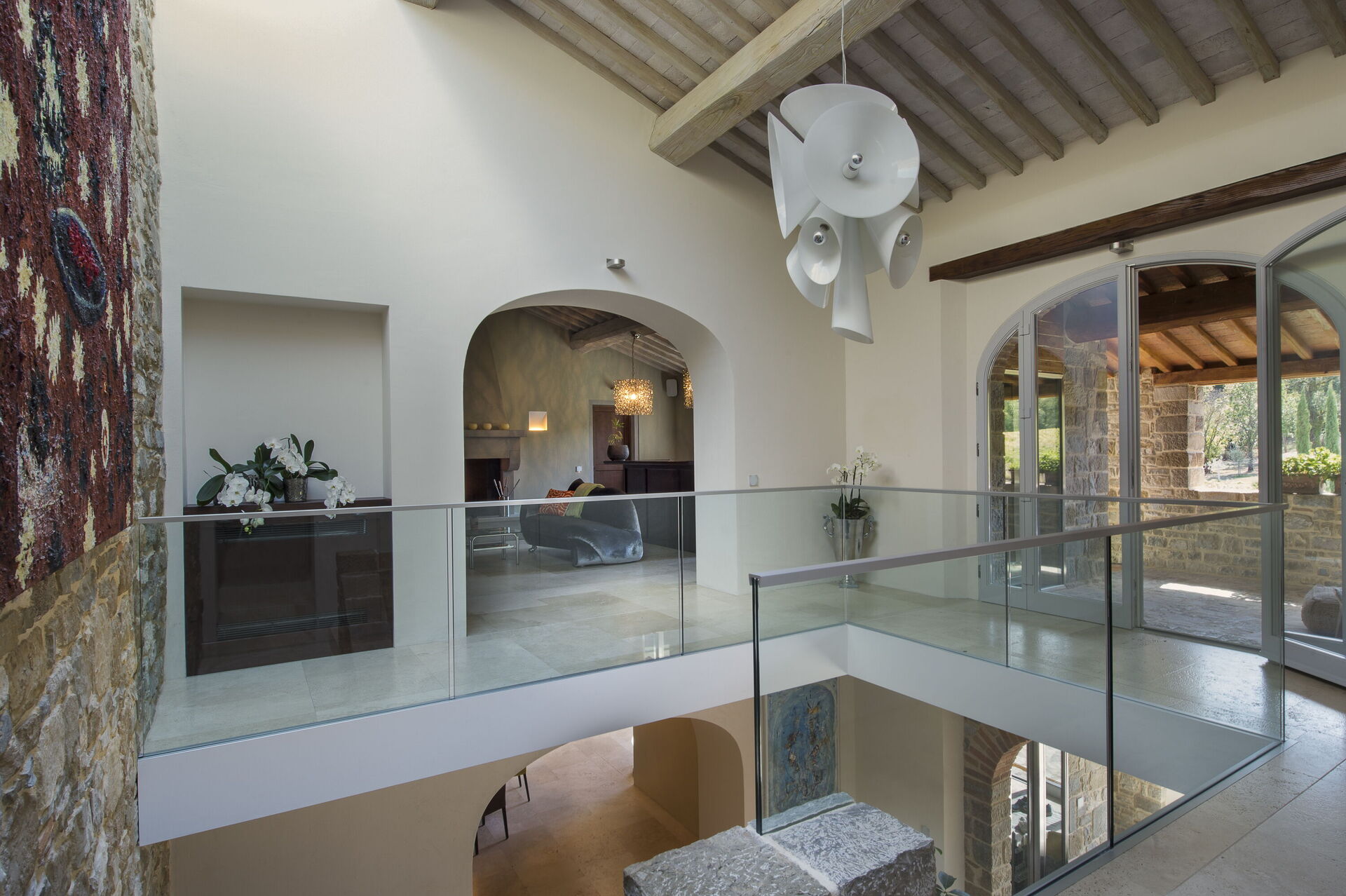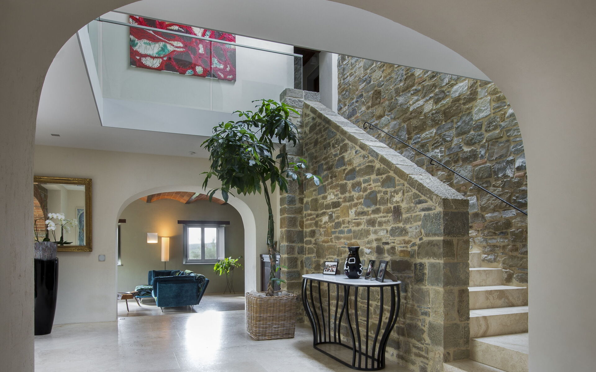 The interior of the villa offers the fascination of stone walls, “cotto” vaulted ceilings, wooden beams and the spaciousness typical of this kind of architecture. This is united to a fresh, modern, creative design in the furnishings. An eclectic mix of rustic and modern styles.