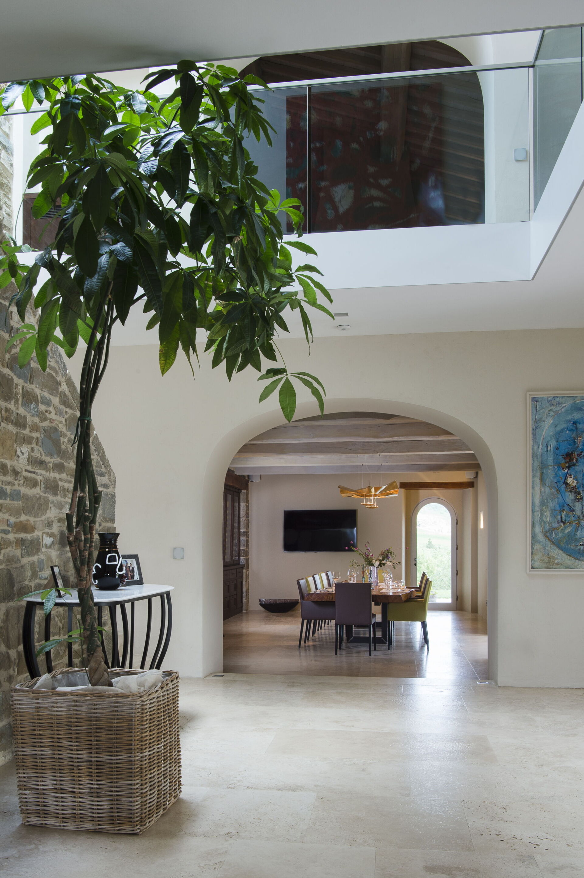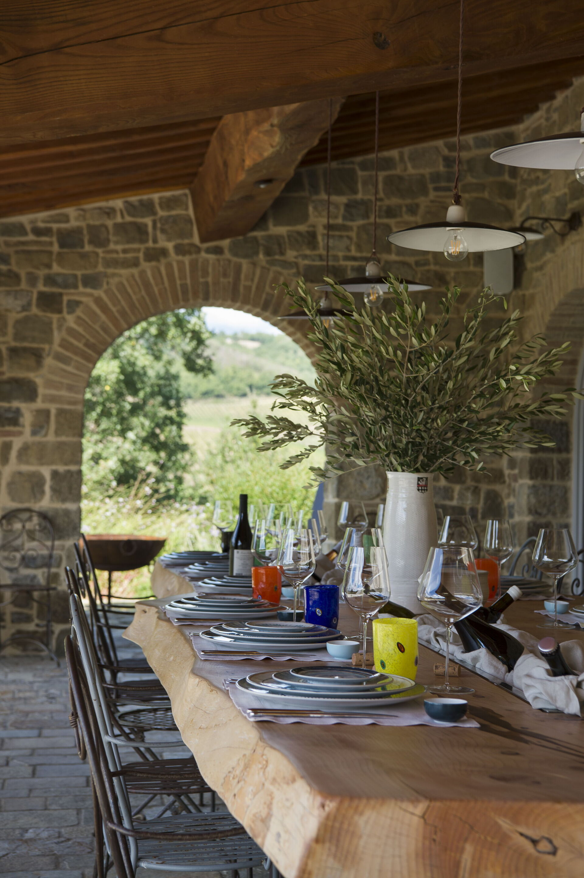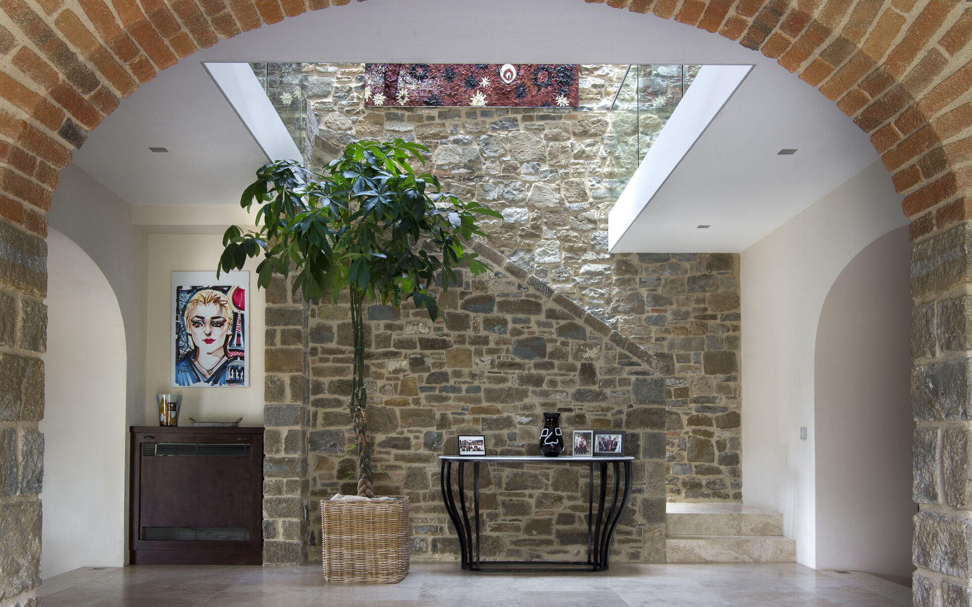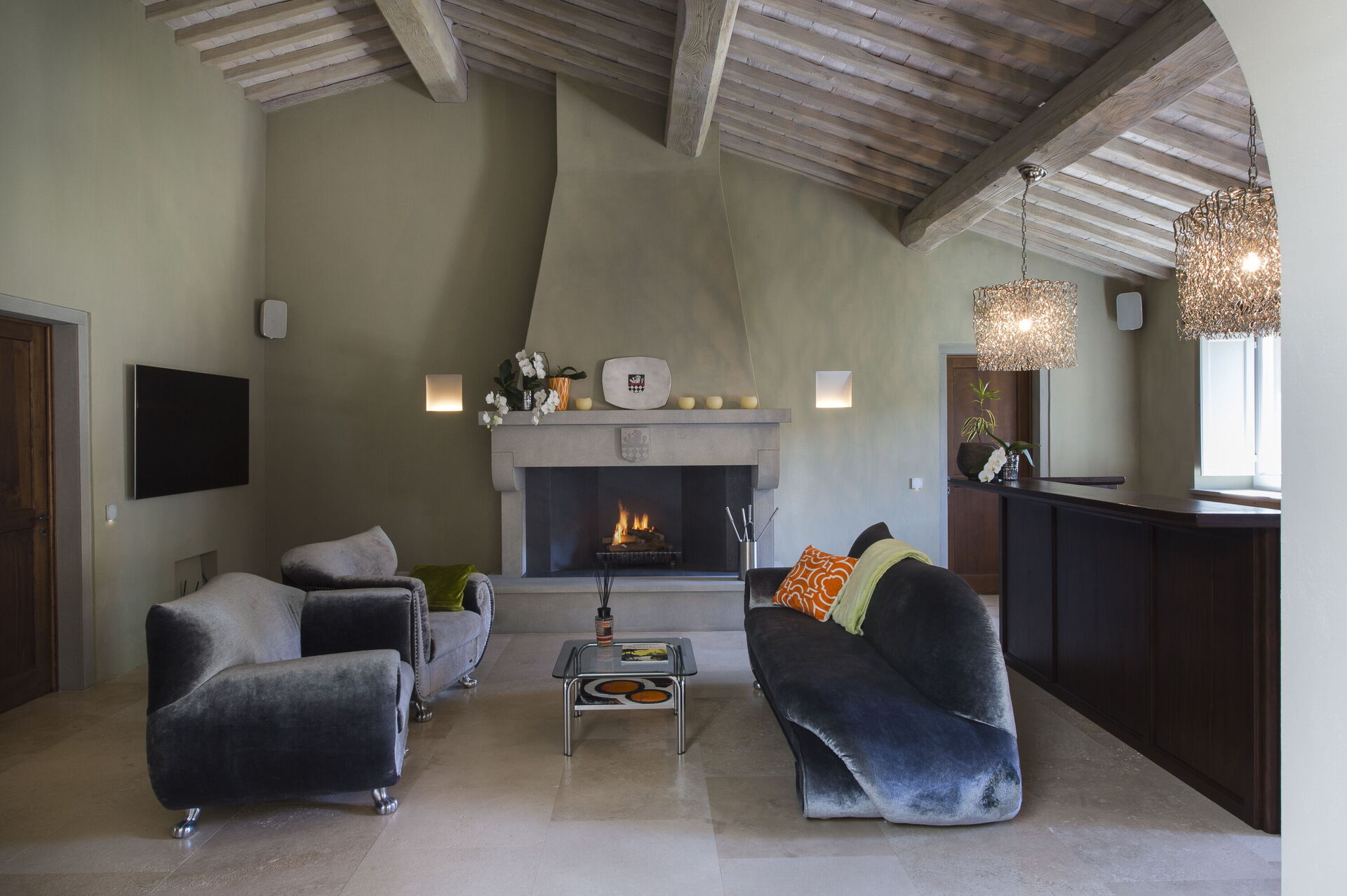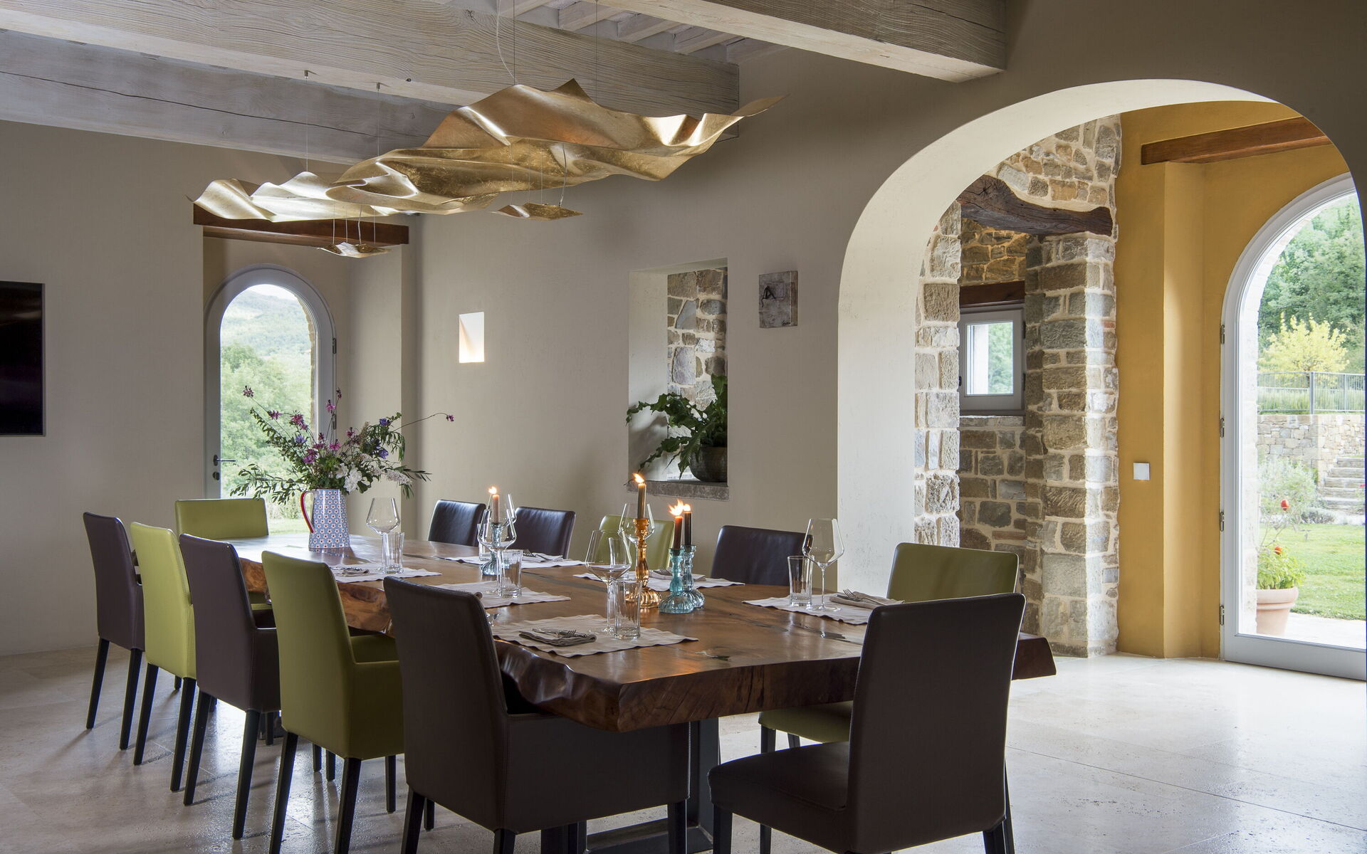 The interior of the villa offers the fascination of stone walls, “cotto” vaulted ceilings, wooden beams and the spaciousness typical of this kind of architecture. This is united to a fresh, modern, creative design in the furnishings. An eclectic mix of rustic and modern styles.