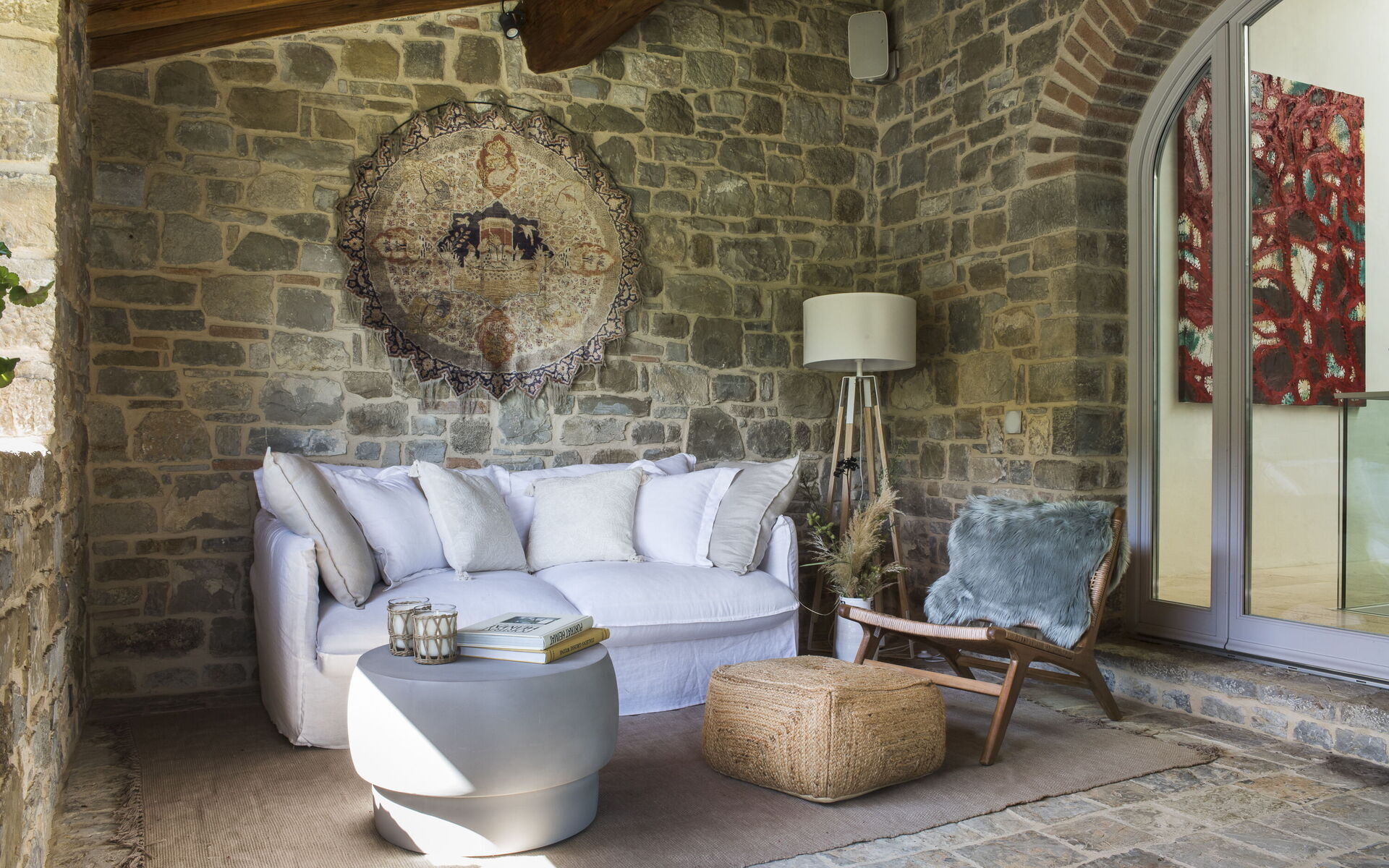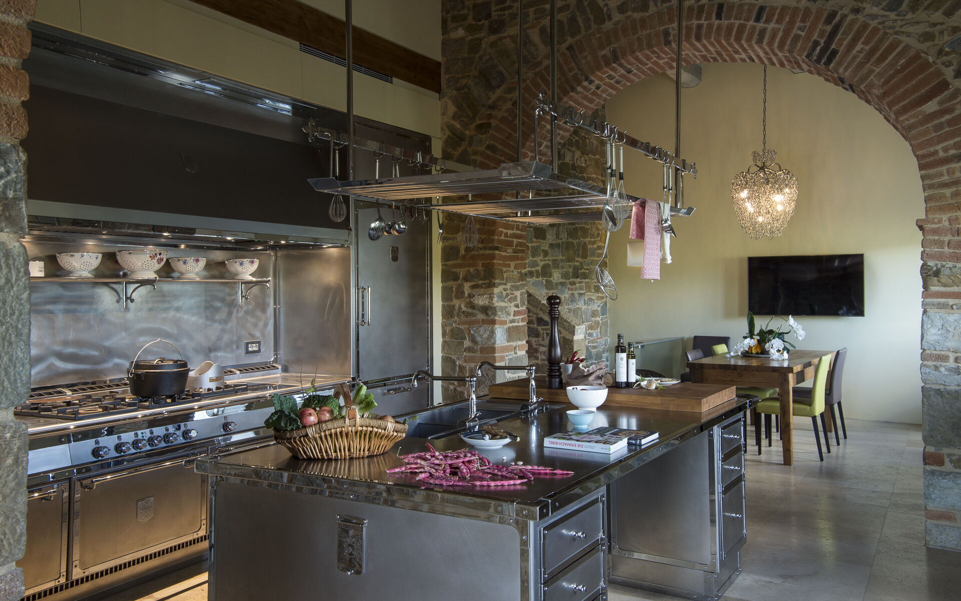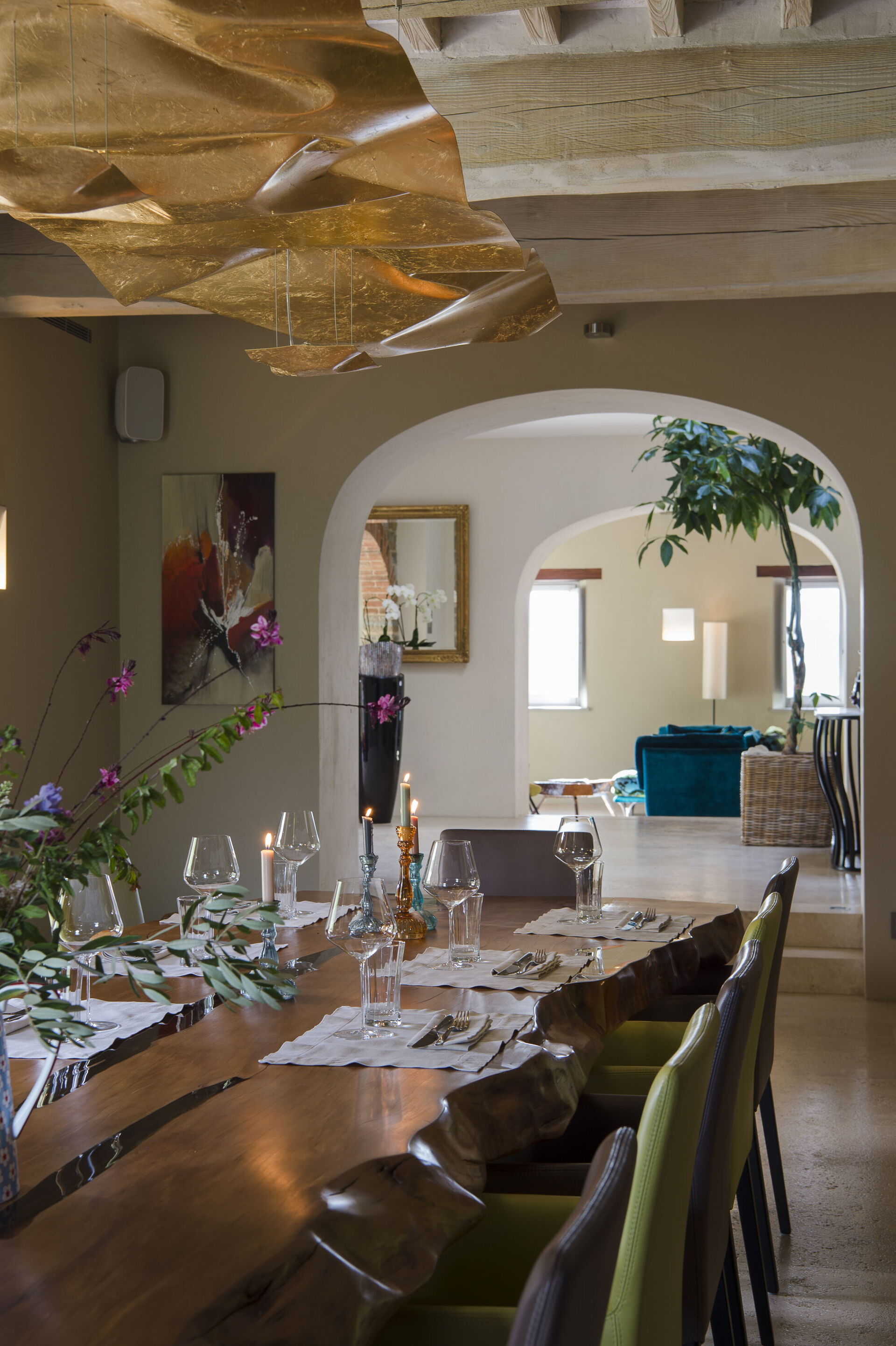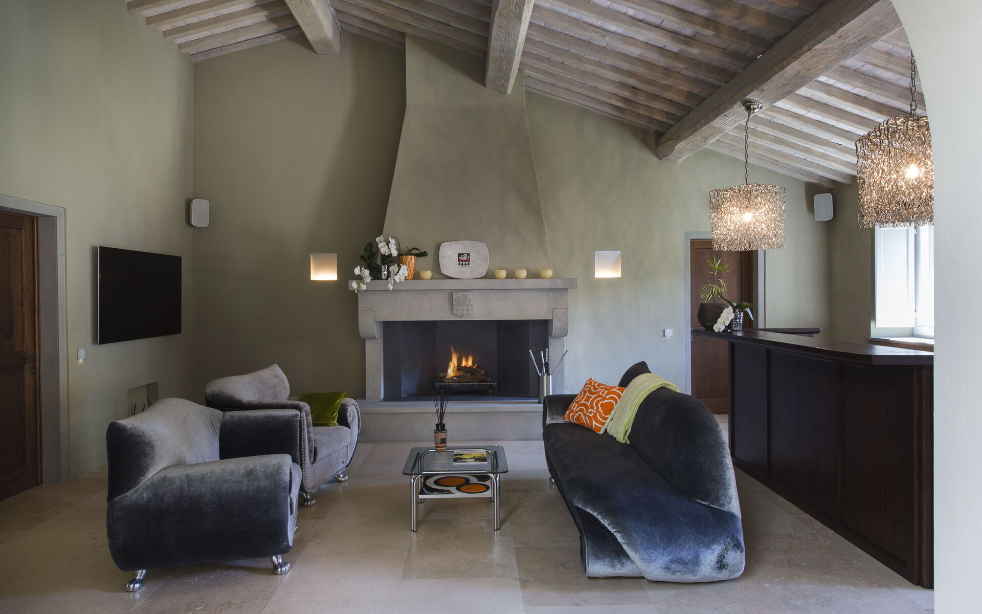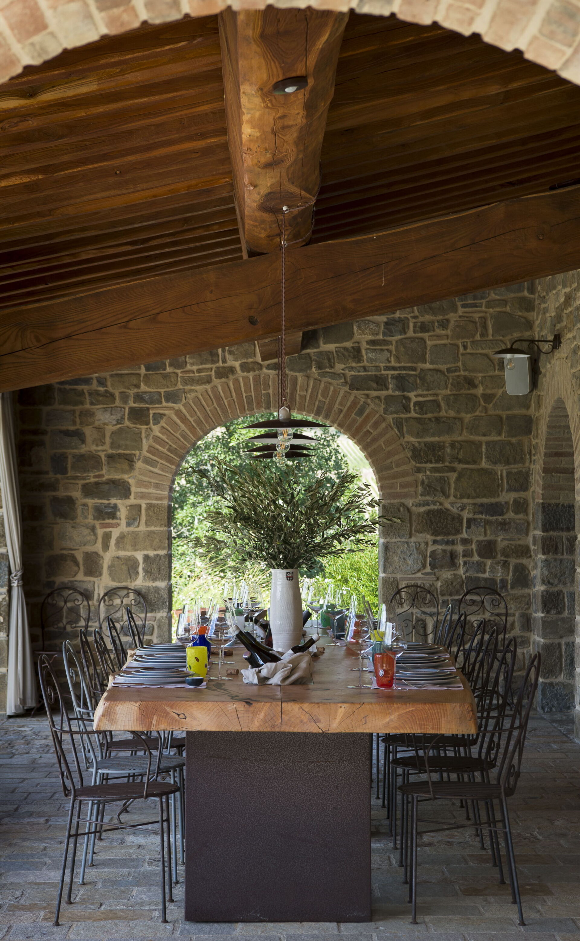 The interior of the villa offers the fascination of stone walls, “cotto” vaulted ceilings, wooden beams and the spaciousness typical of this kind of architecture. This is united to a fresh, modern, creative design in the furnishings. An eclectic mix of rustic and modern styles.