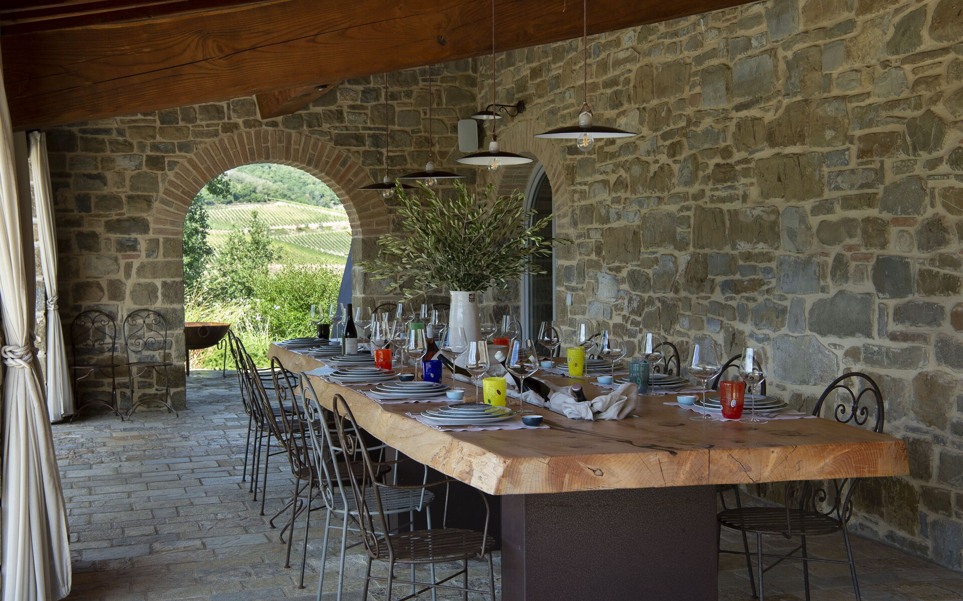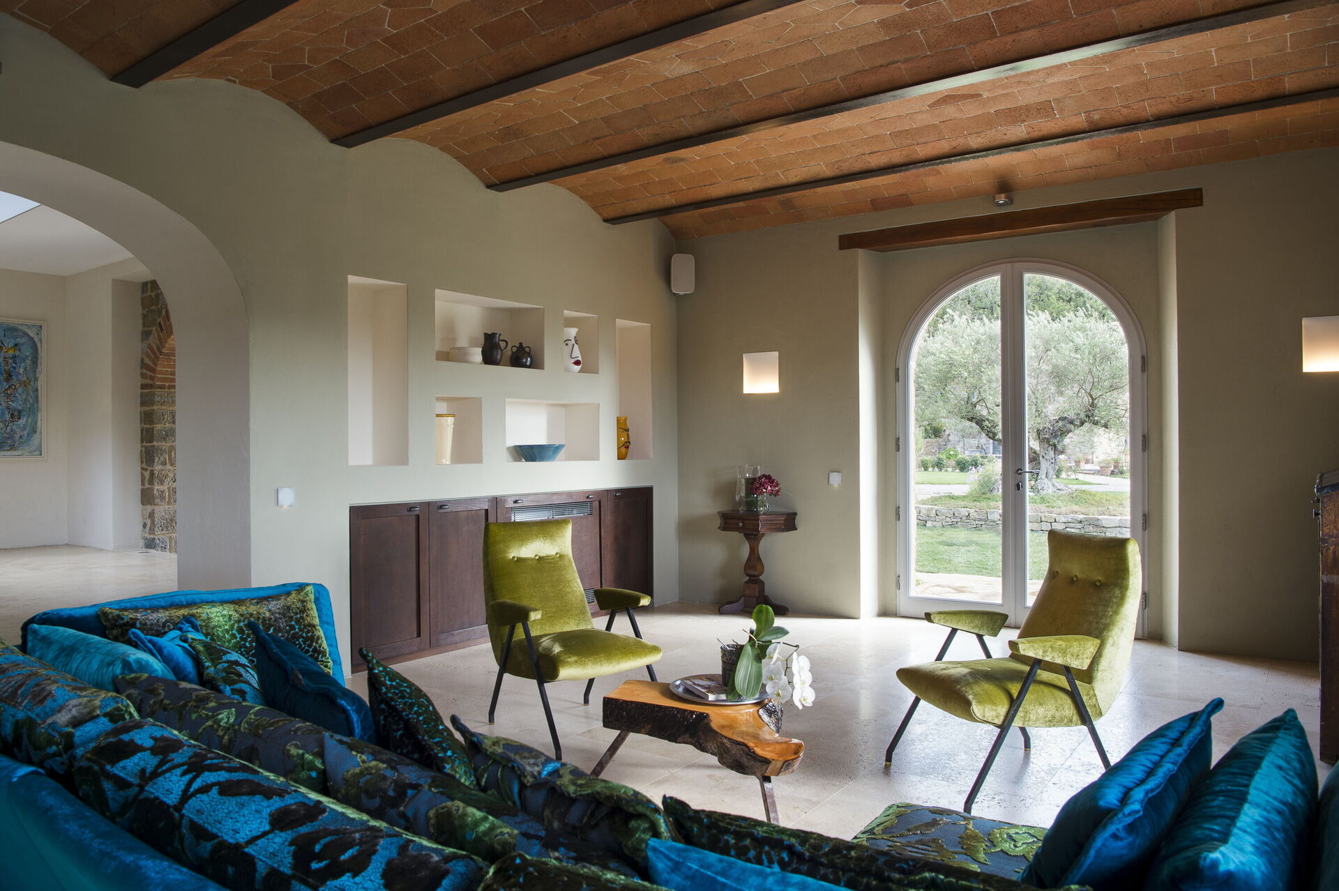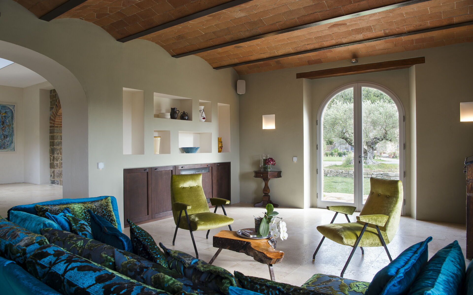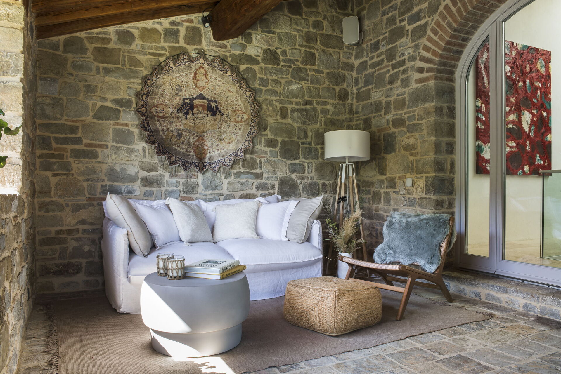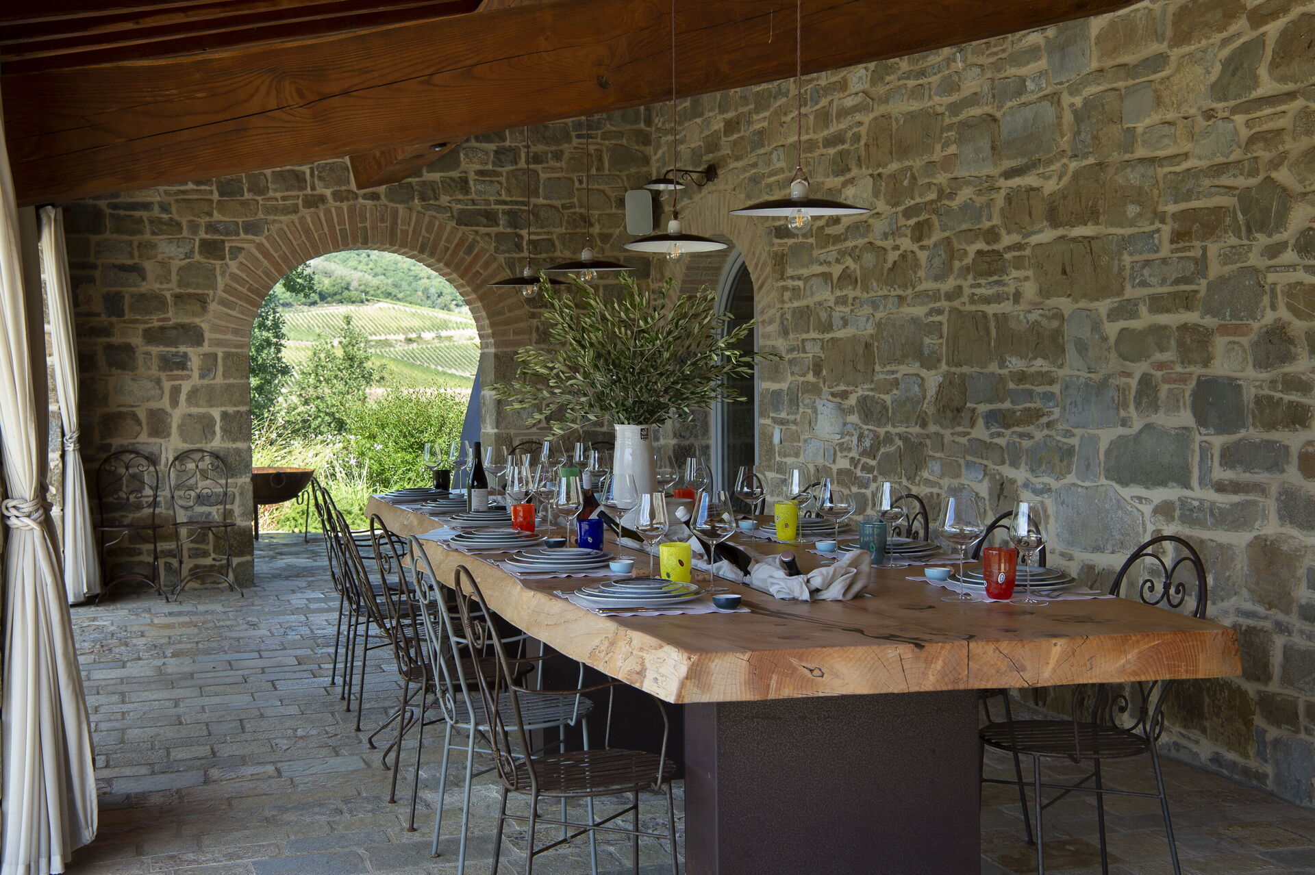 The interior of the villa offers the fascination of stone walls, “cotto” vaulted ceilings, wooden beams and the spaciousness typical of this kind of architecture. This is united to a fresh, modern, creative design in the furnishings. An eclectic mix of rustic and modern styles.